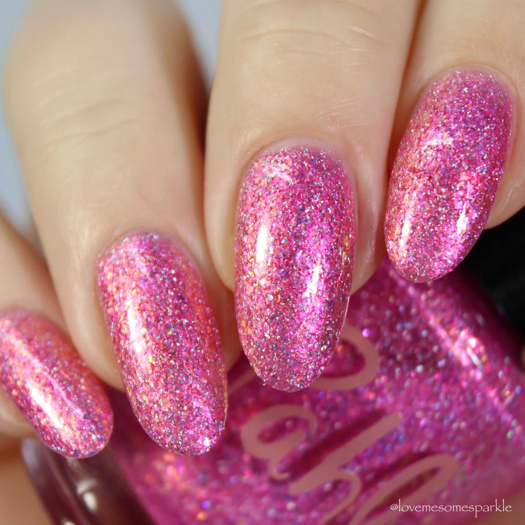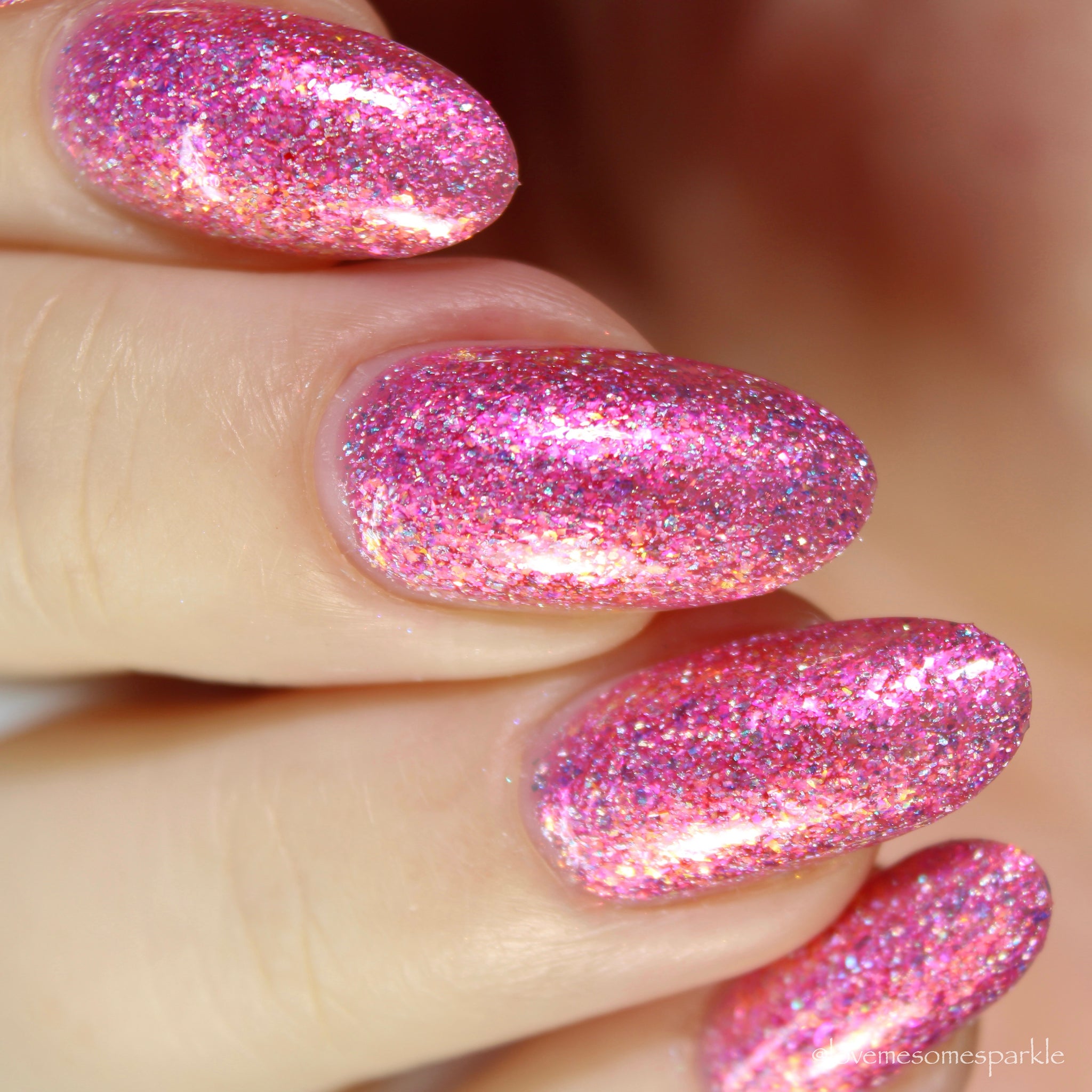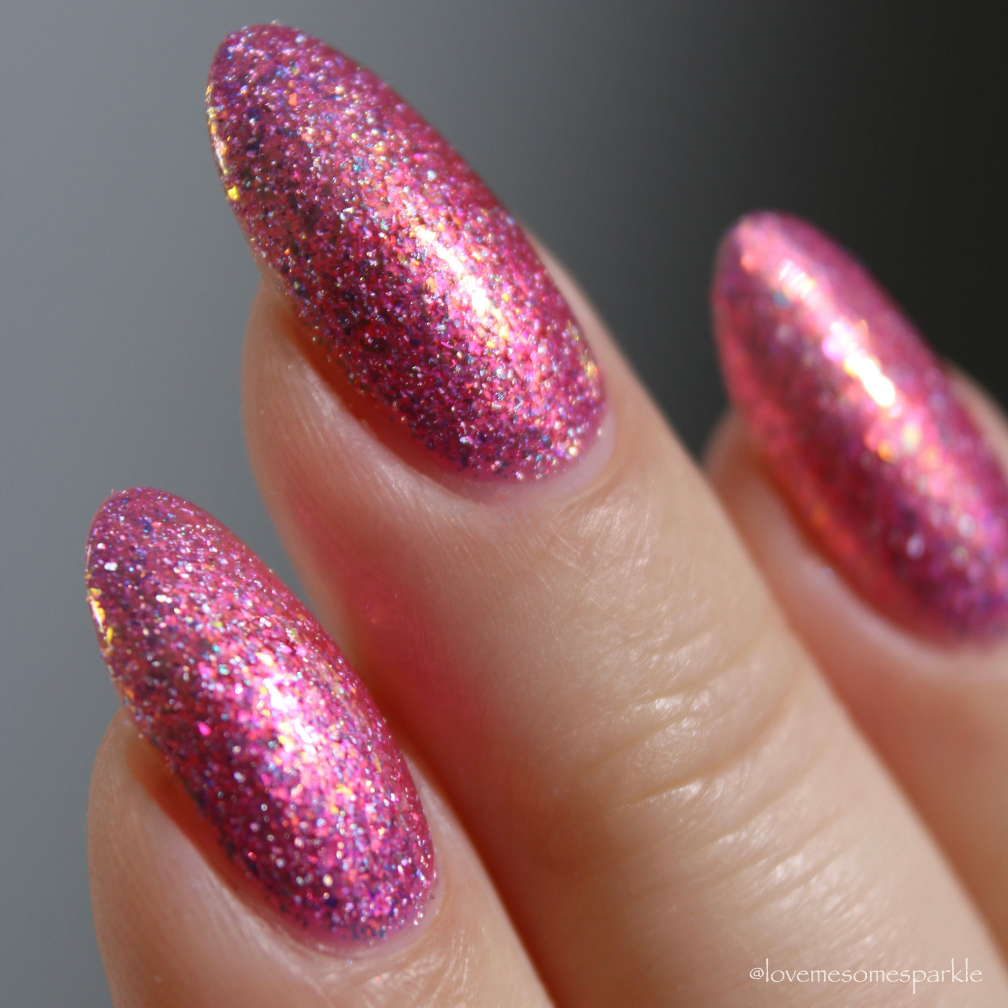sweet barbie pink base with a mix of iridescent pink flakes and holographic flakes