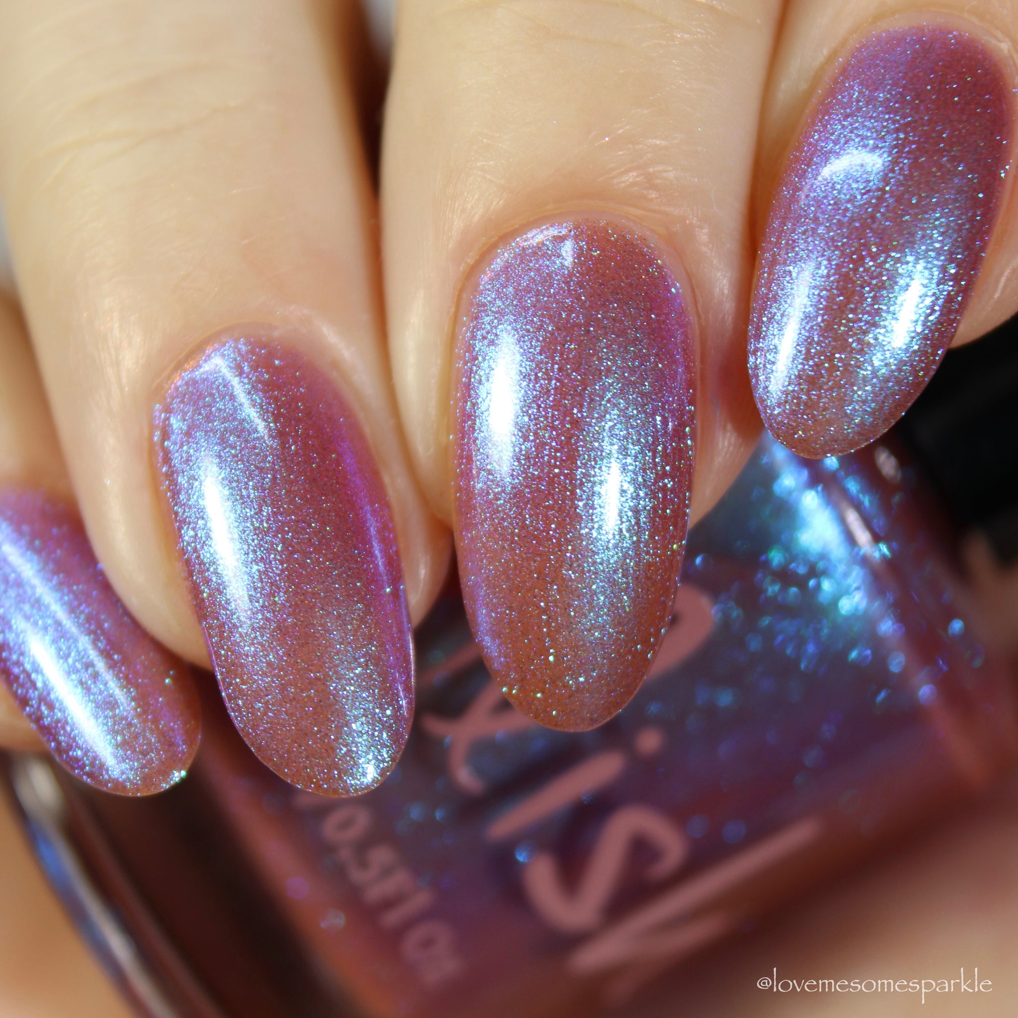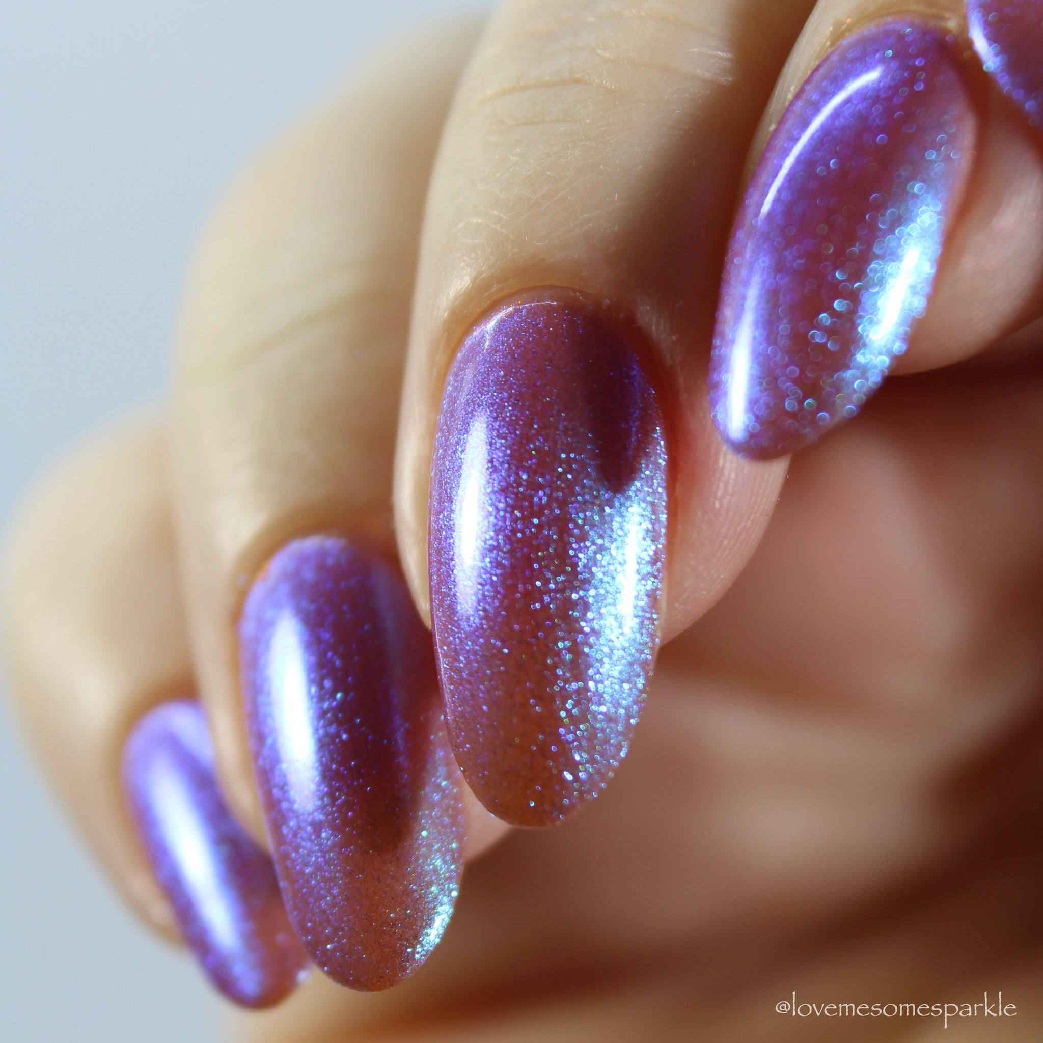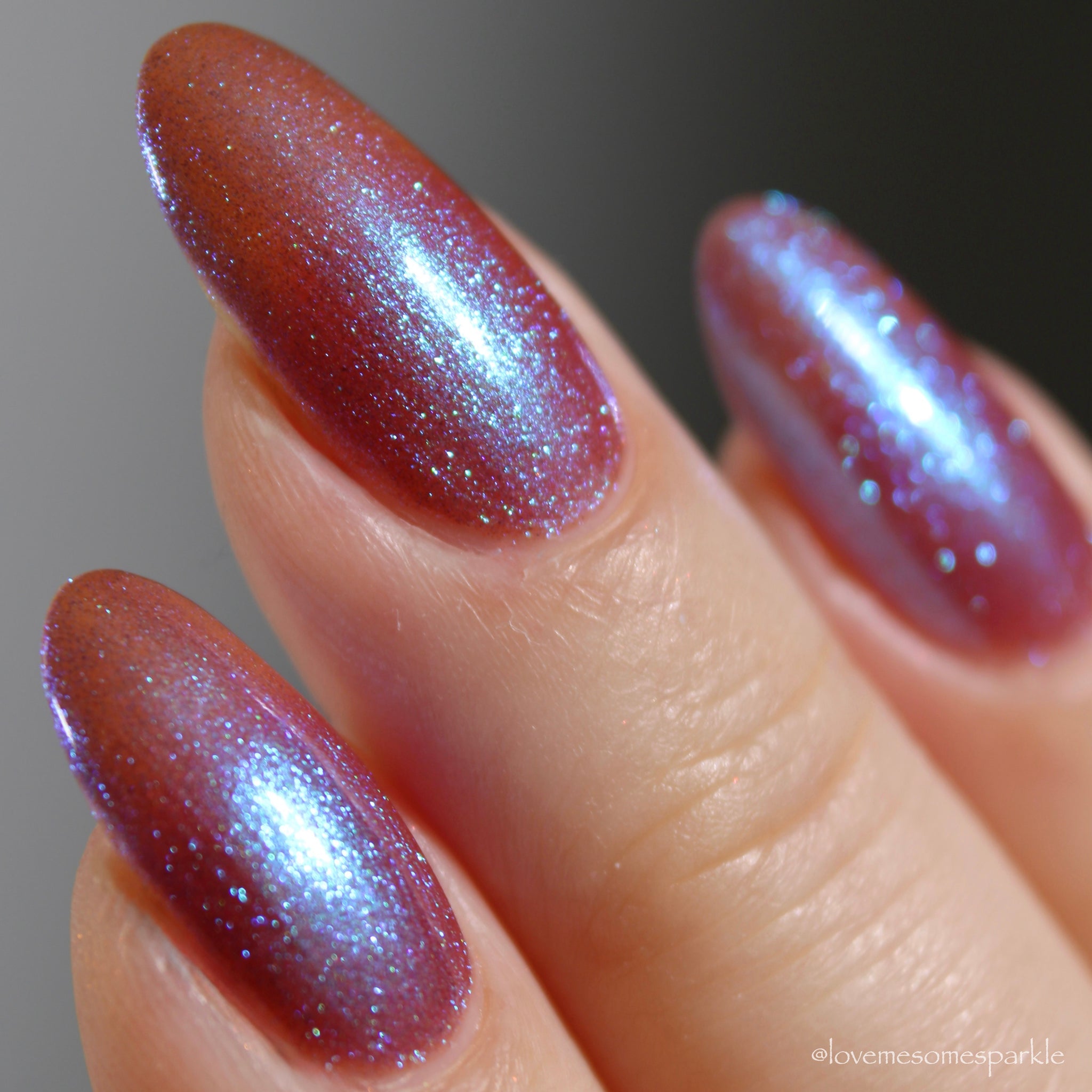 sheer gingerbread base packed with glowing blue/violet microfine shimmer
