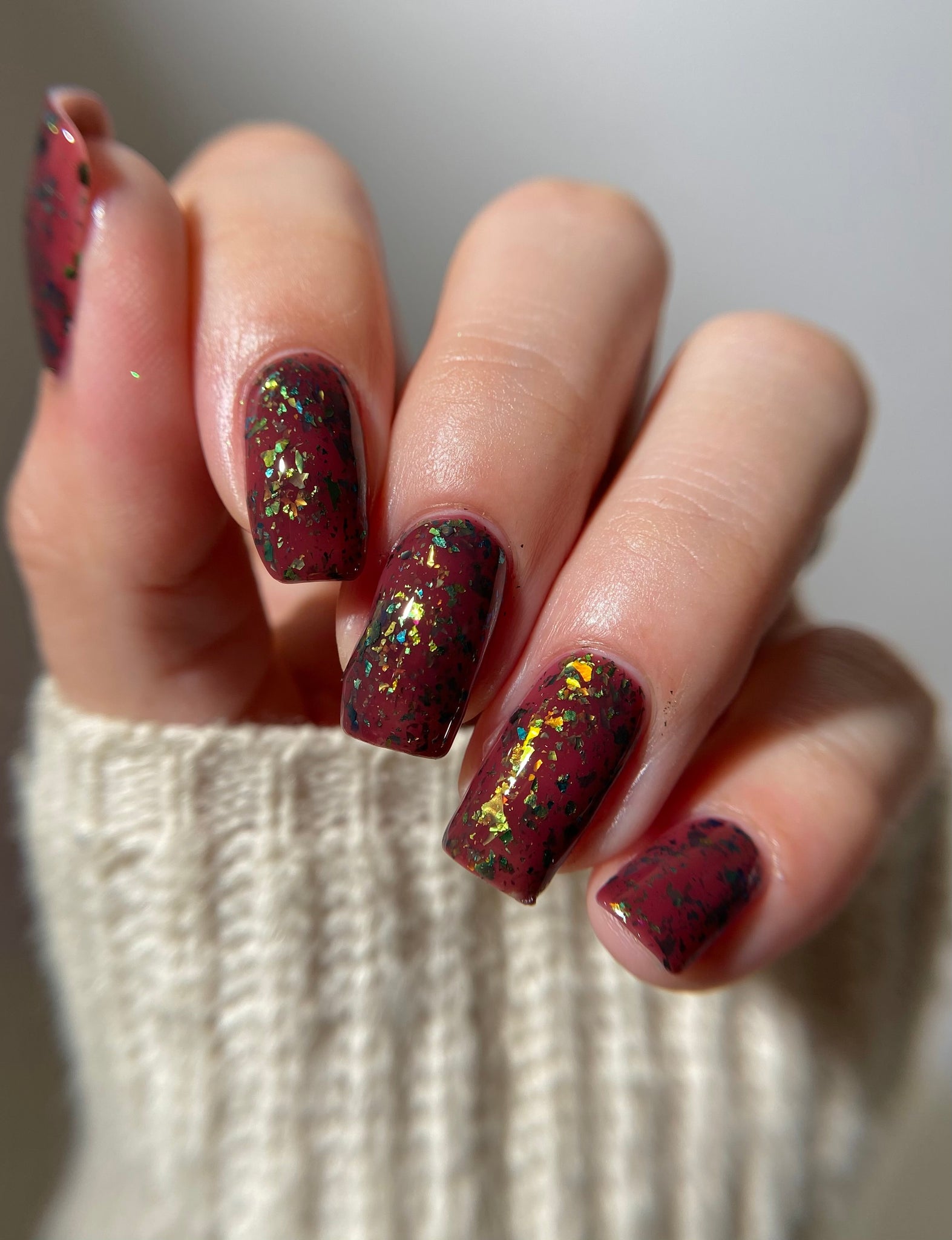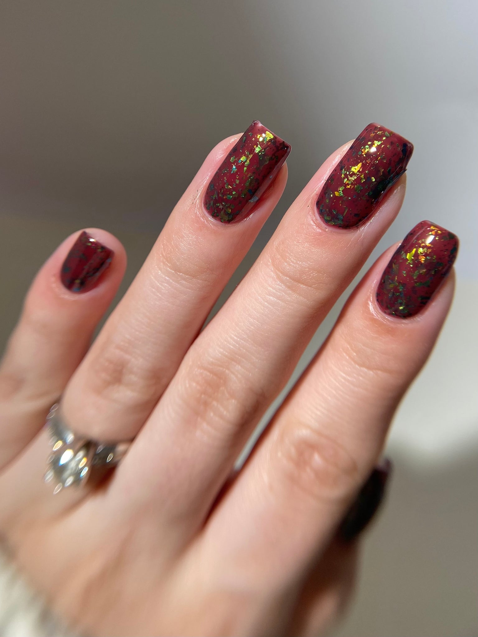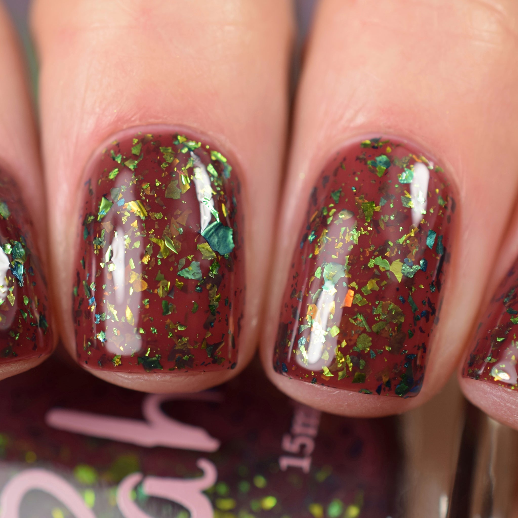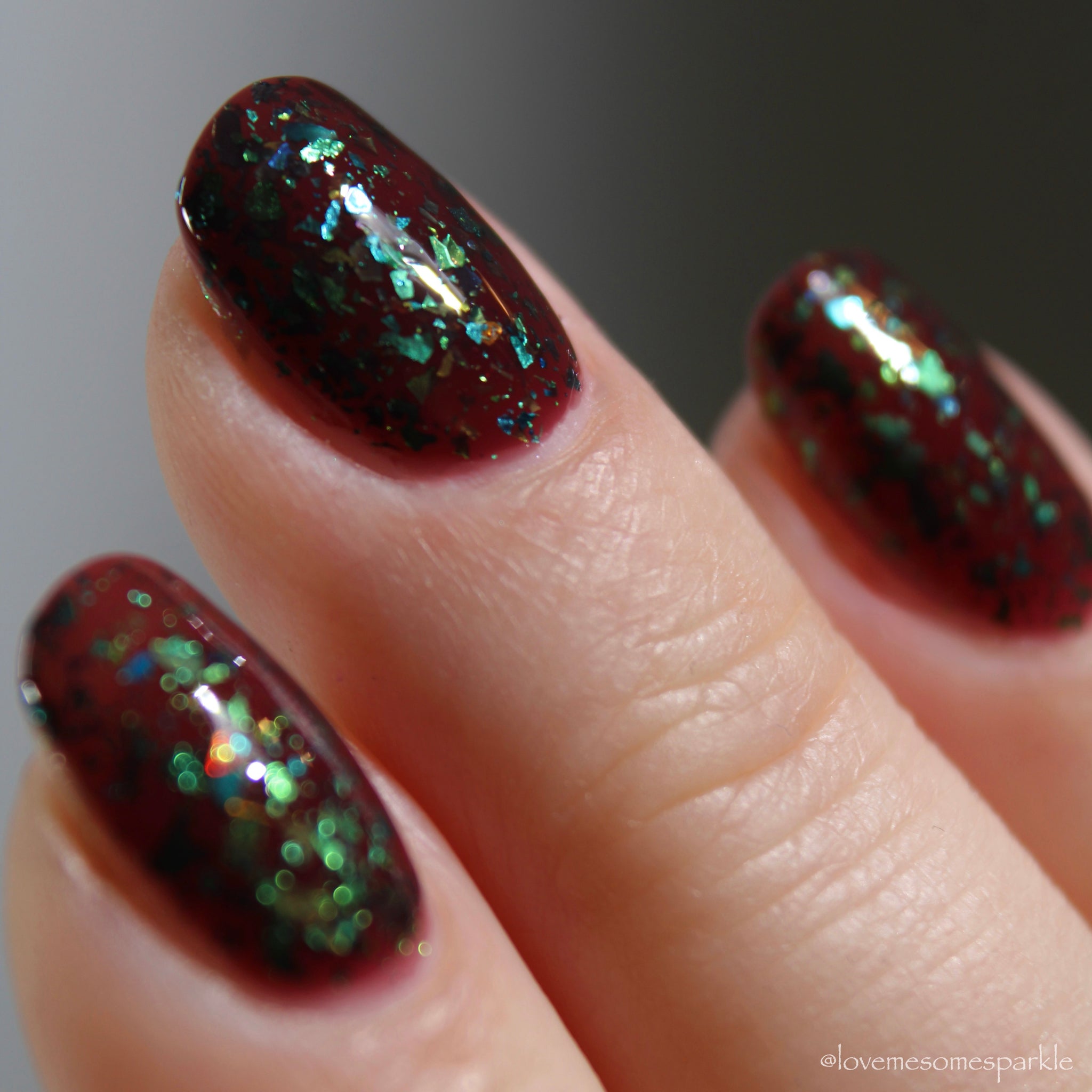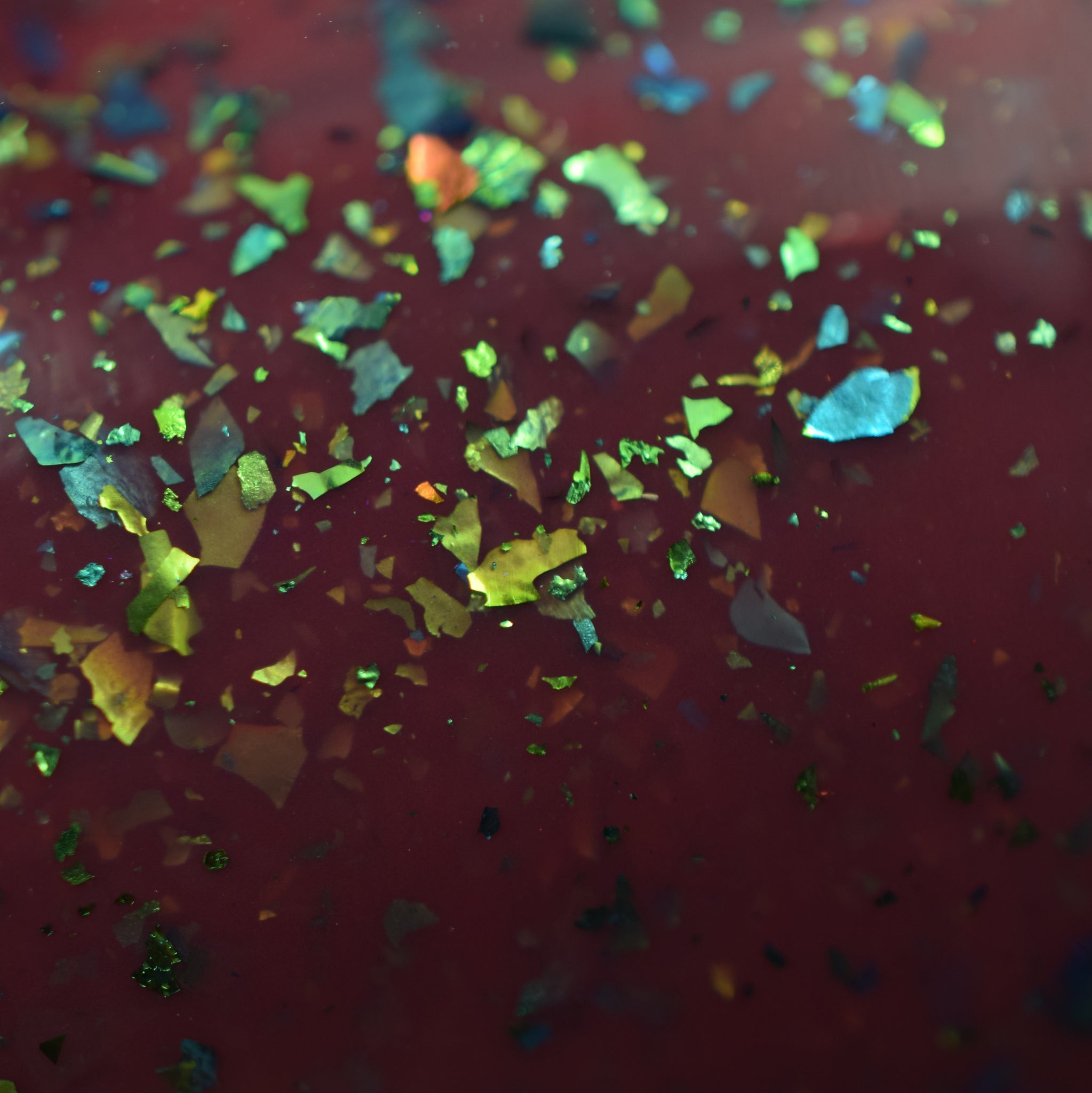 deep raisin cream with metallic multichrome flakes that shift green/gold/blue
