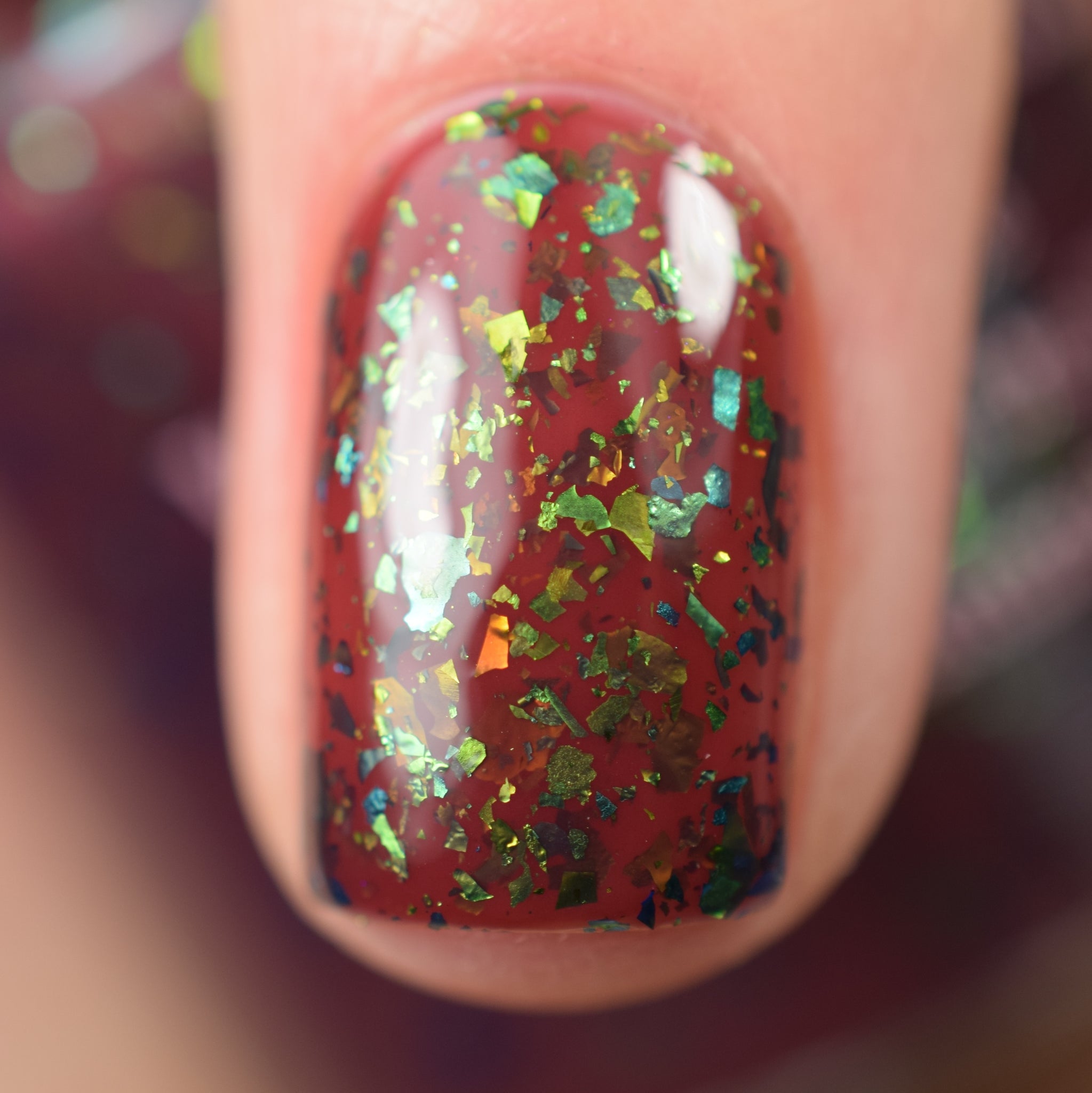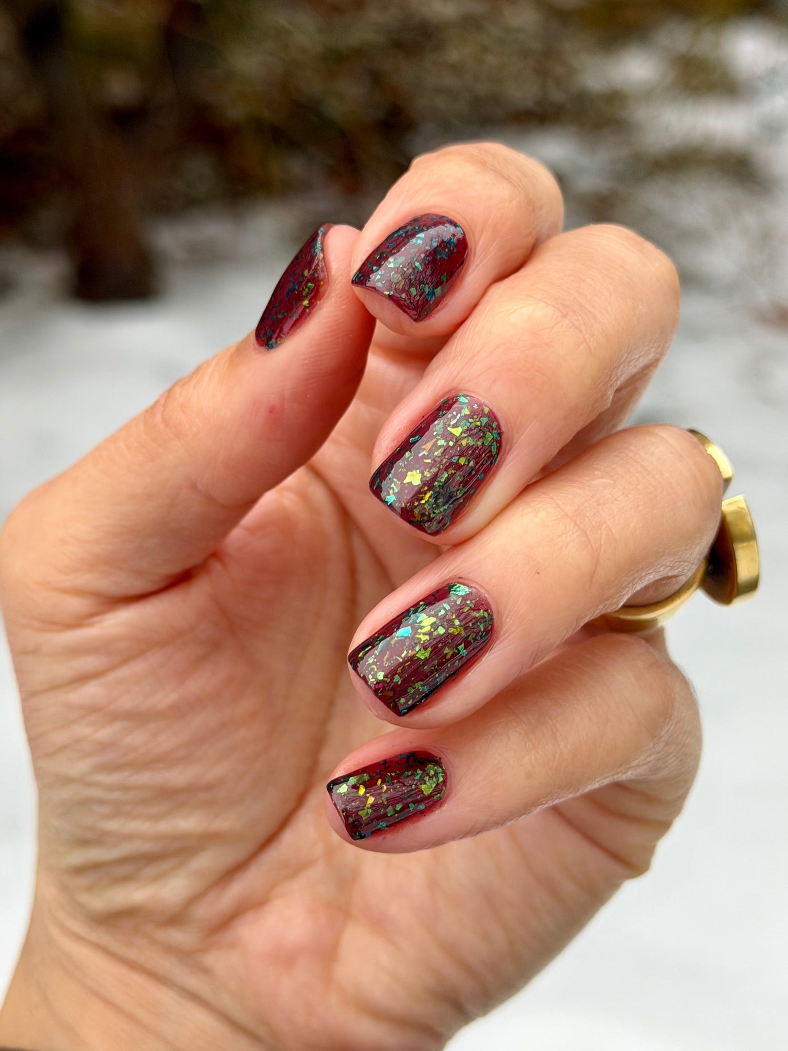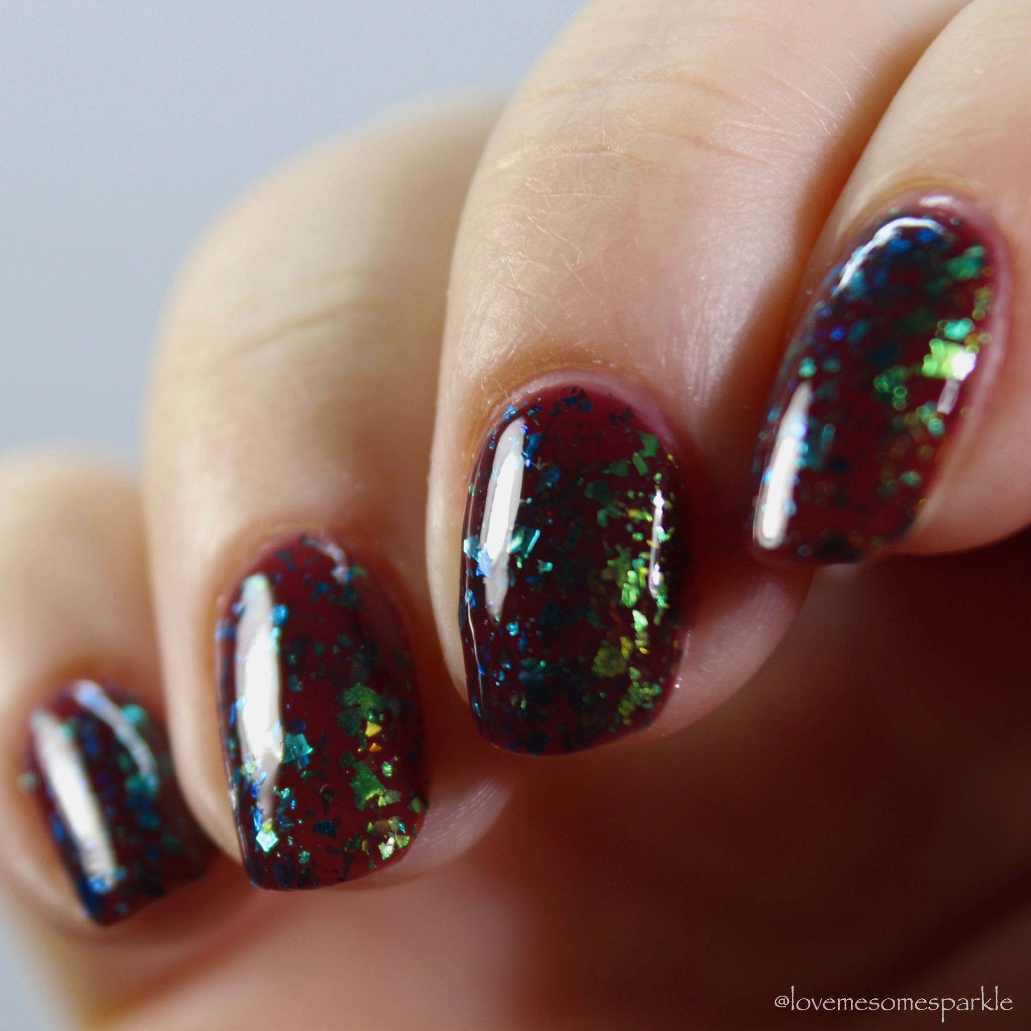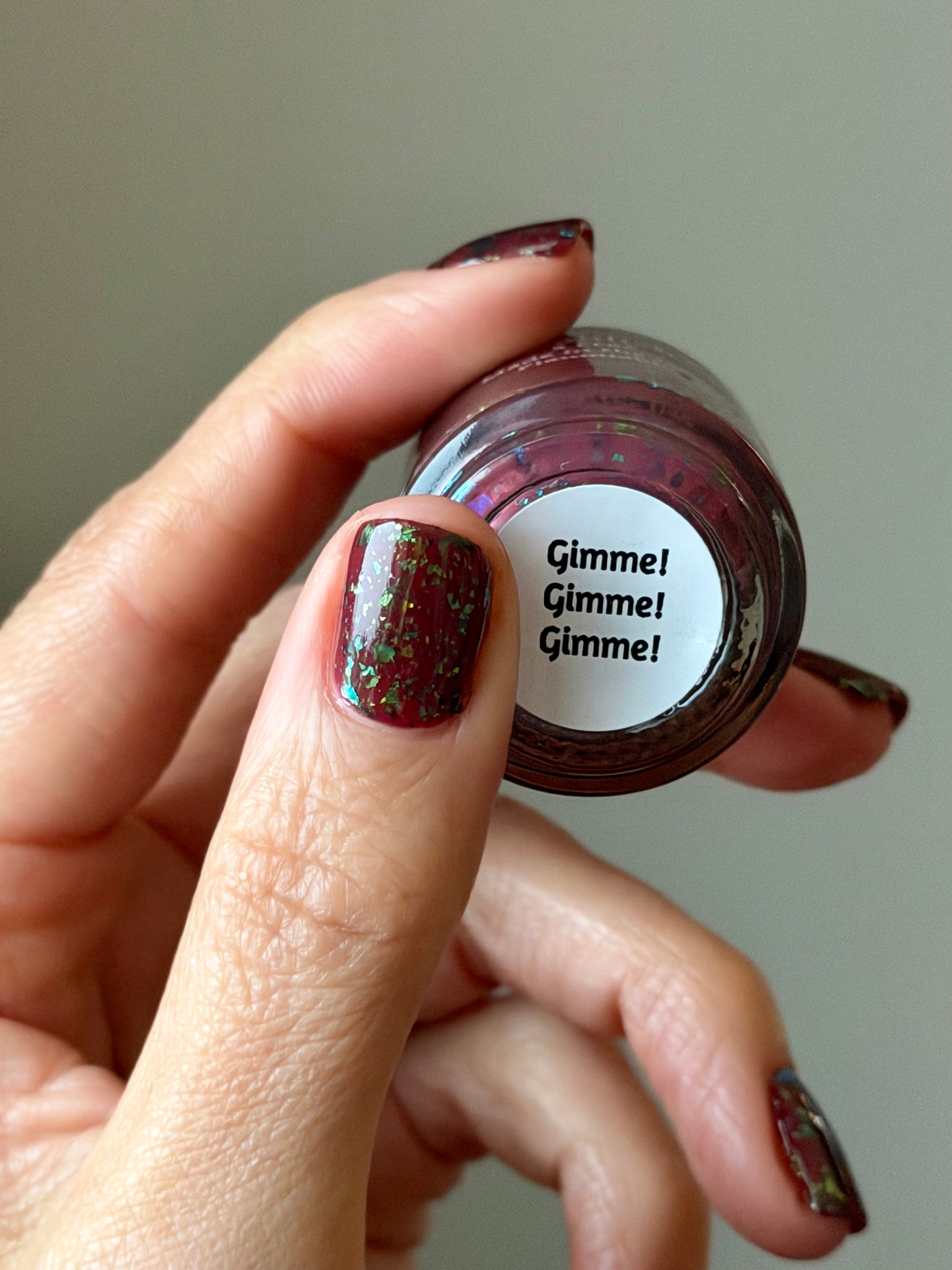 deep raisin cream with metallic multichrome flakes that shift green/gold/blue
