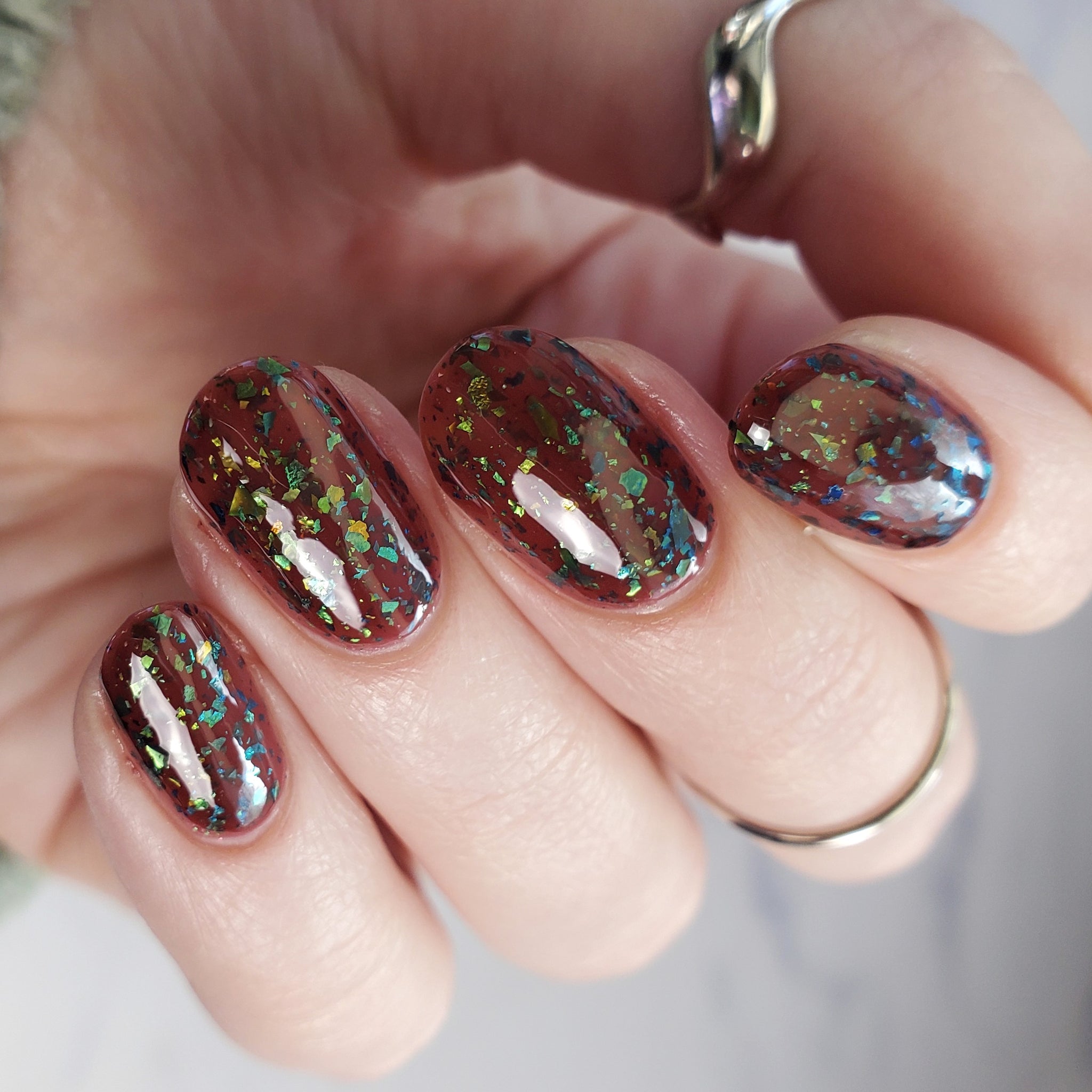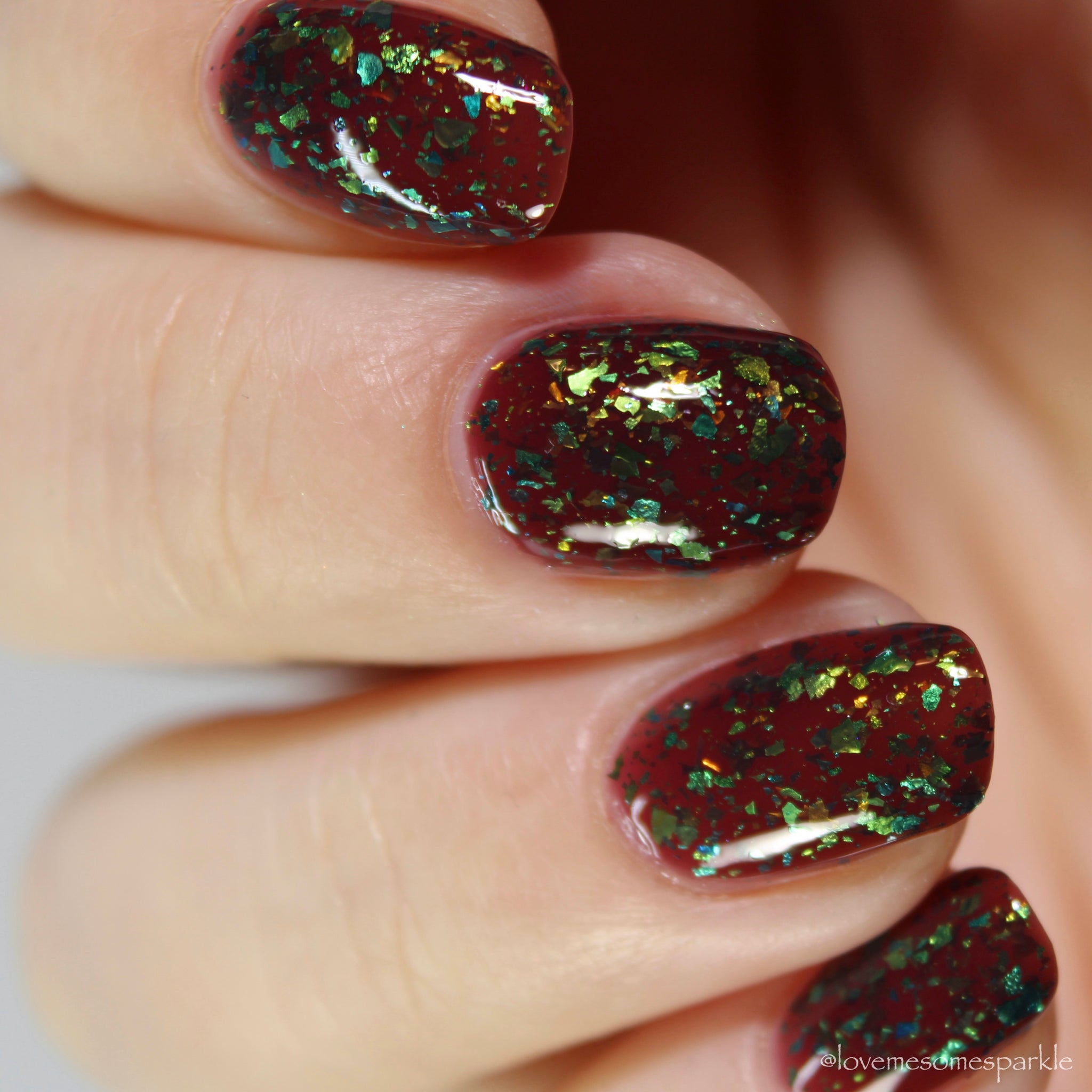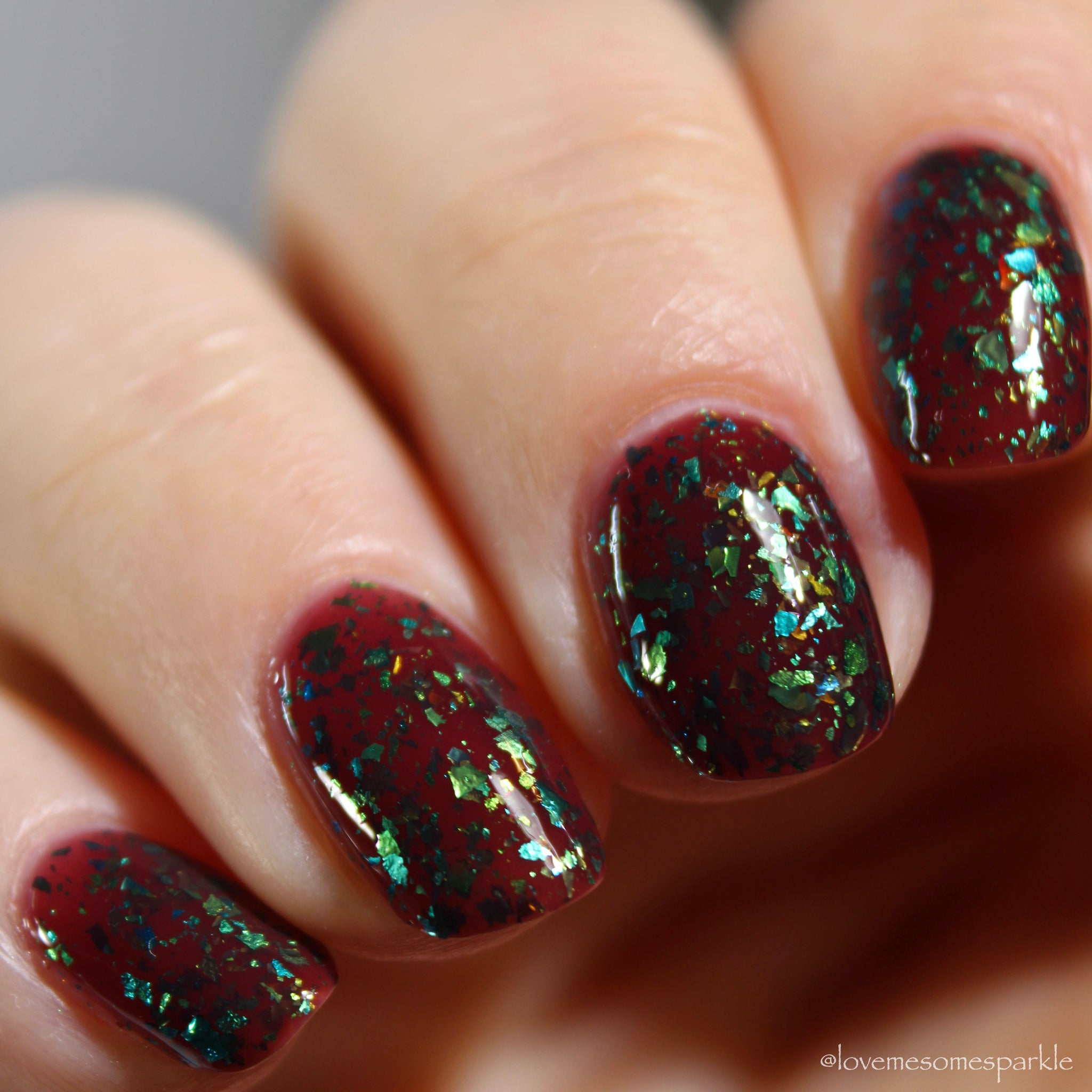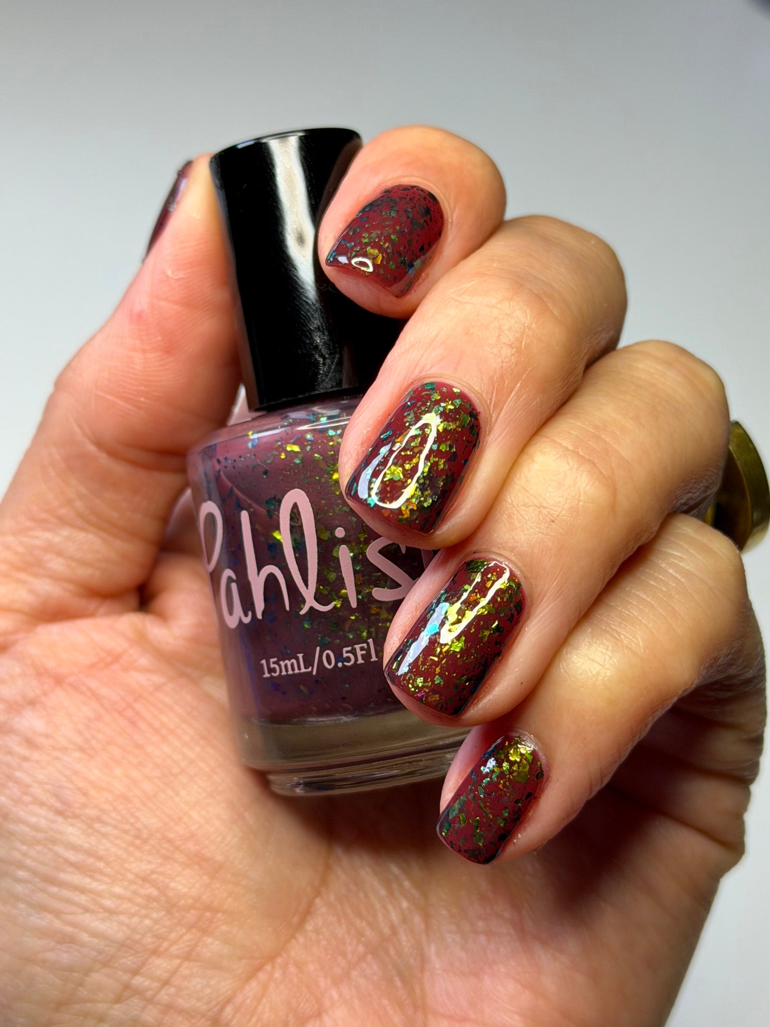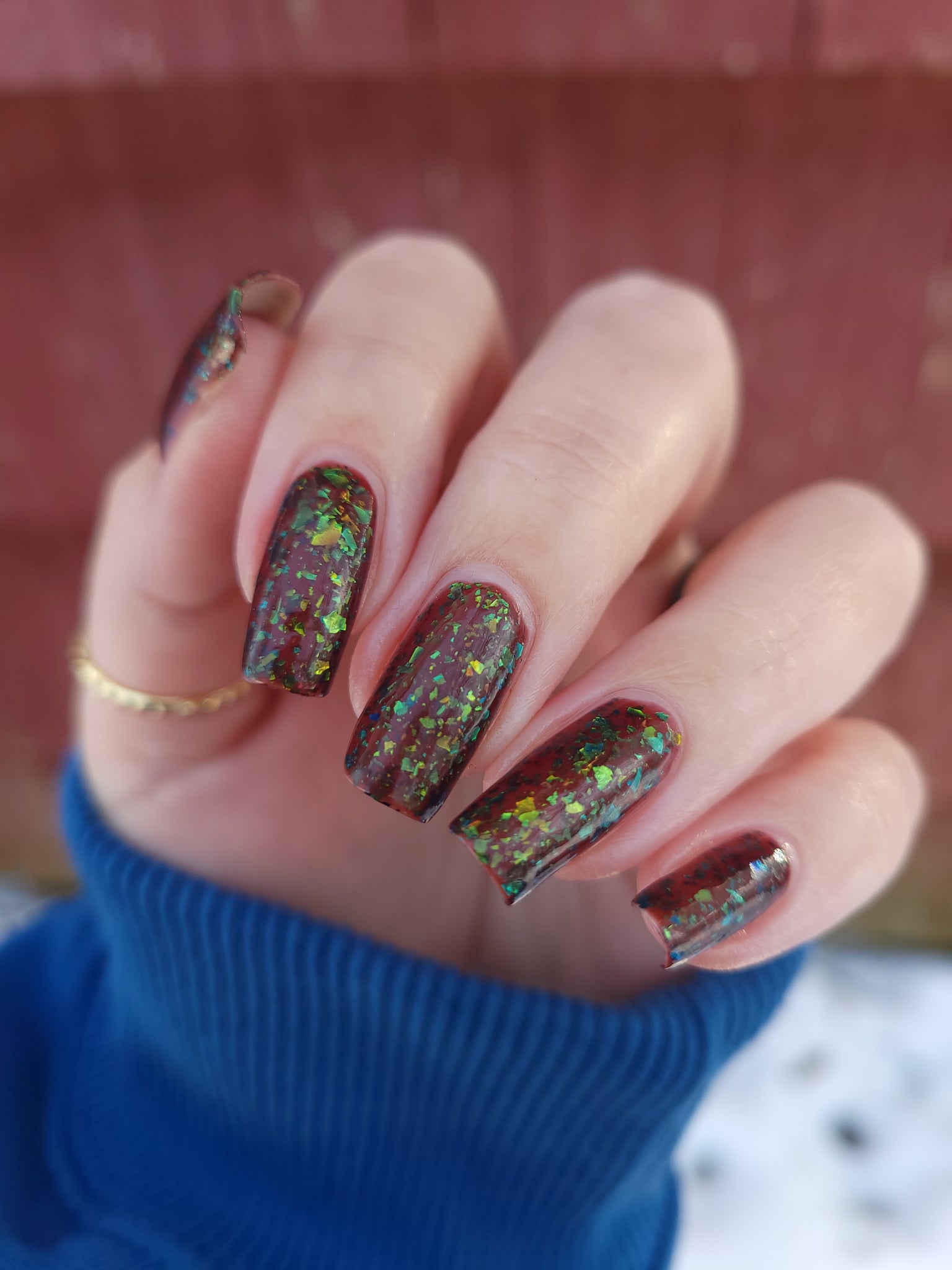 deep raisin cream with metallic multichrome flakes that shift green/gold/blue