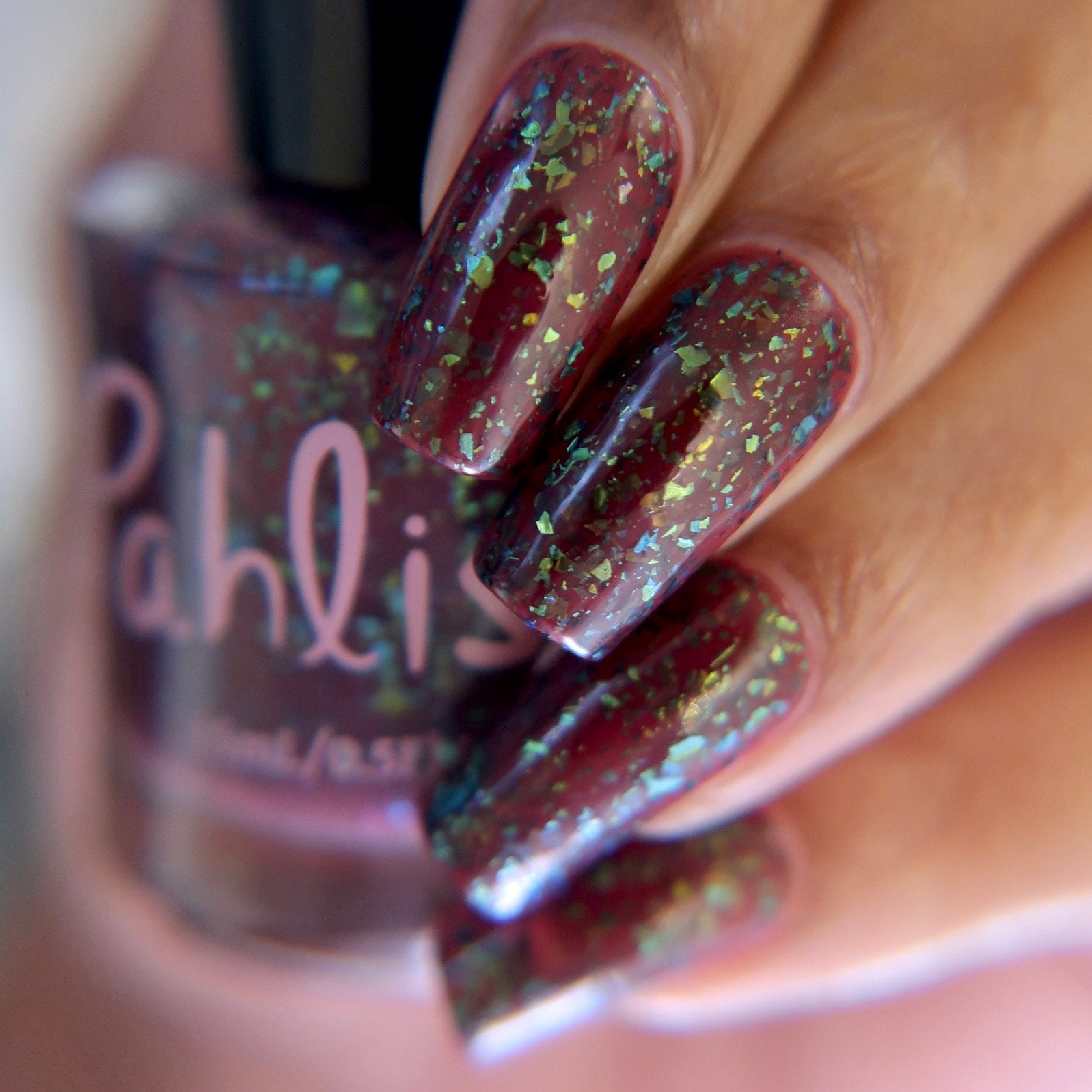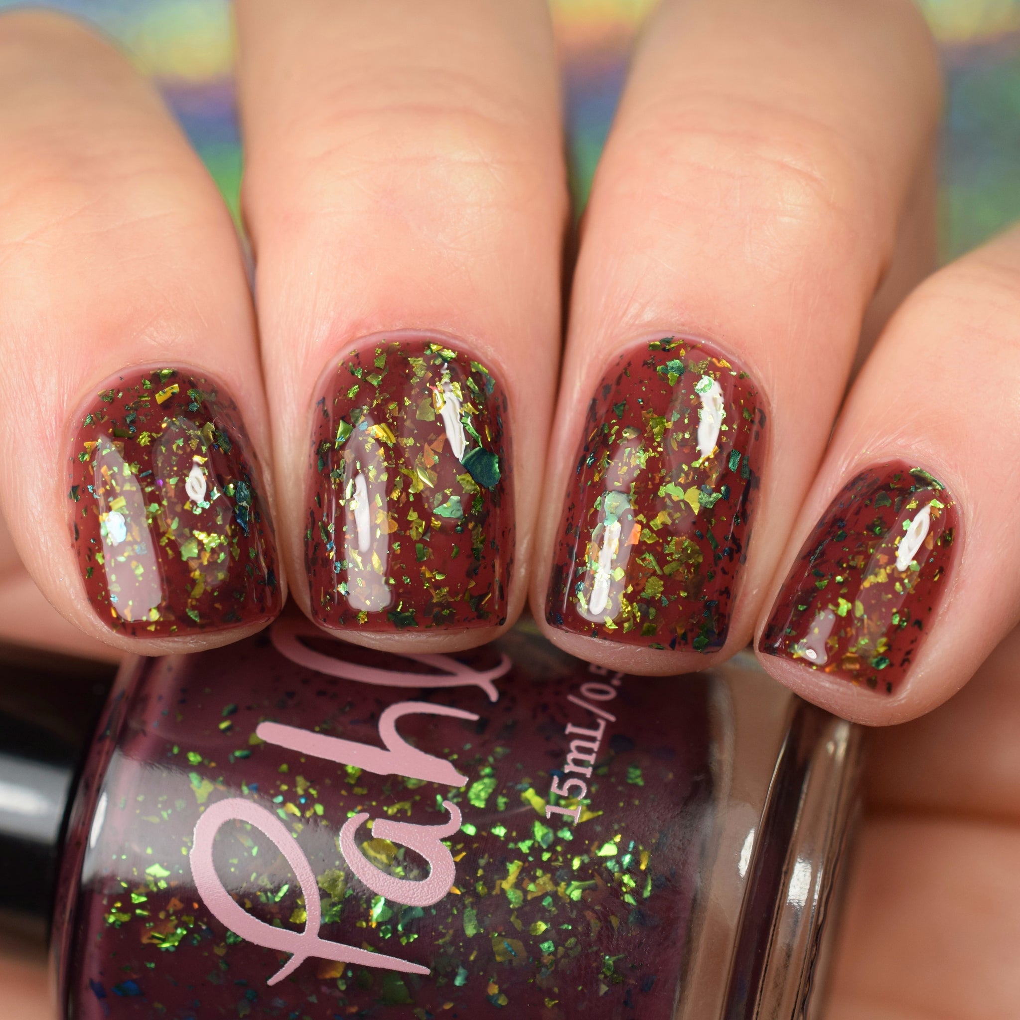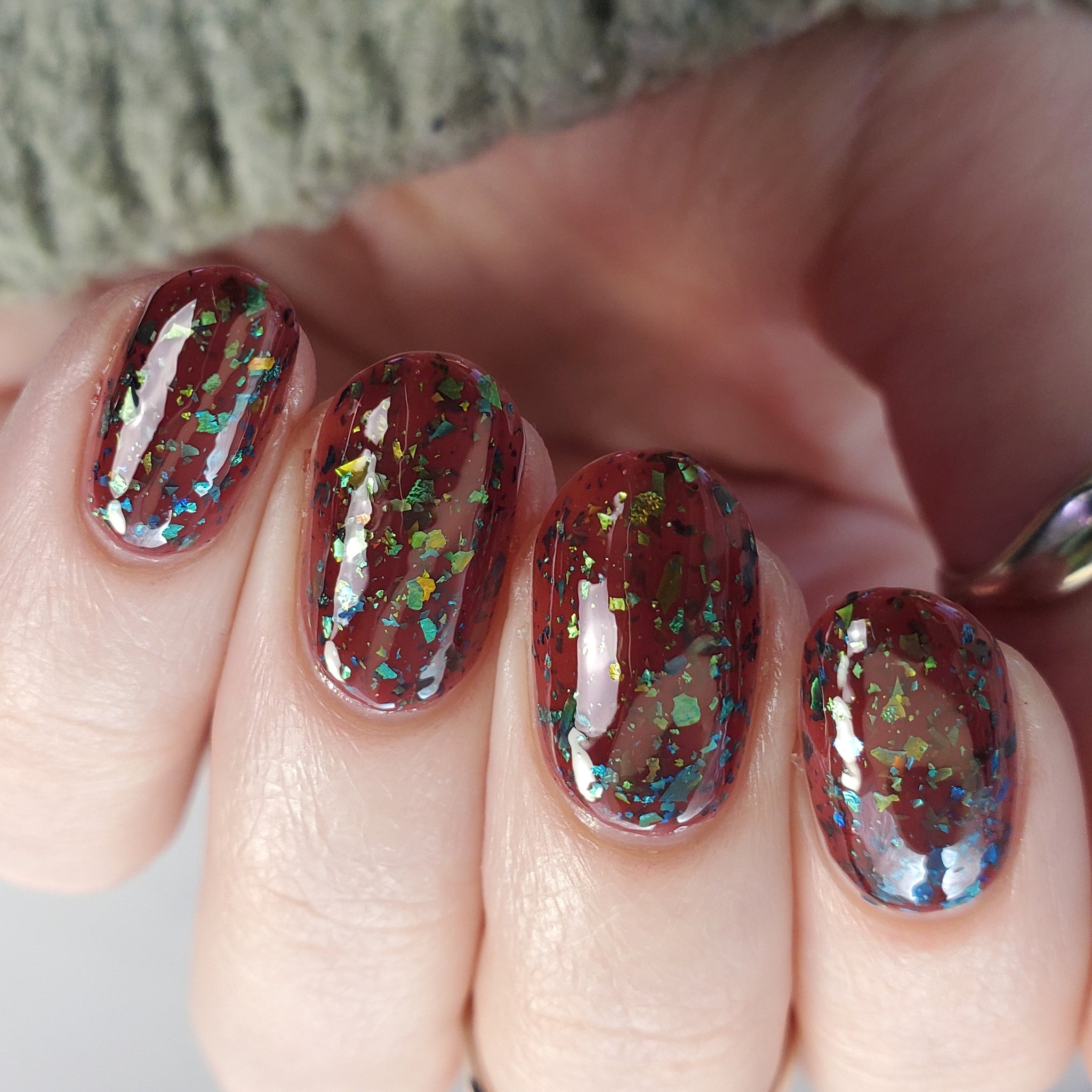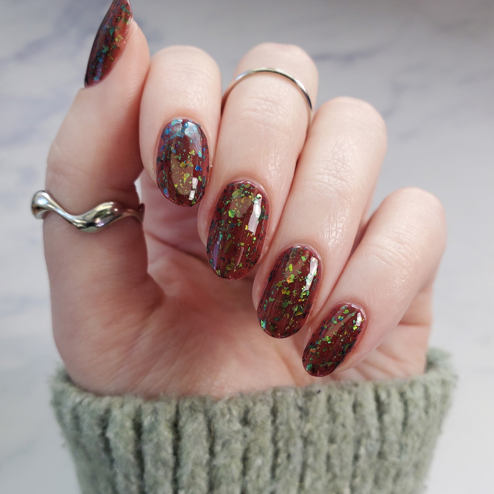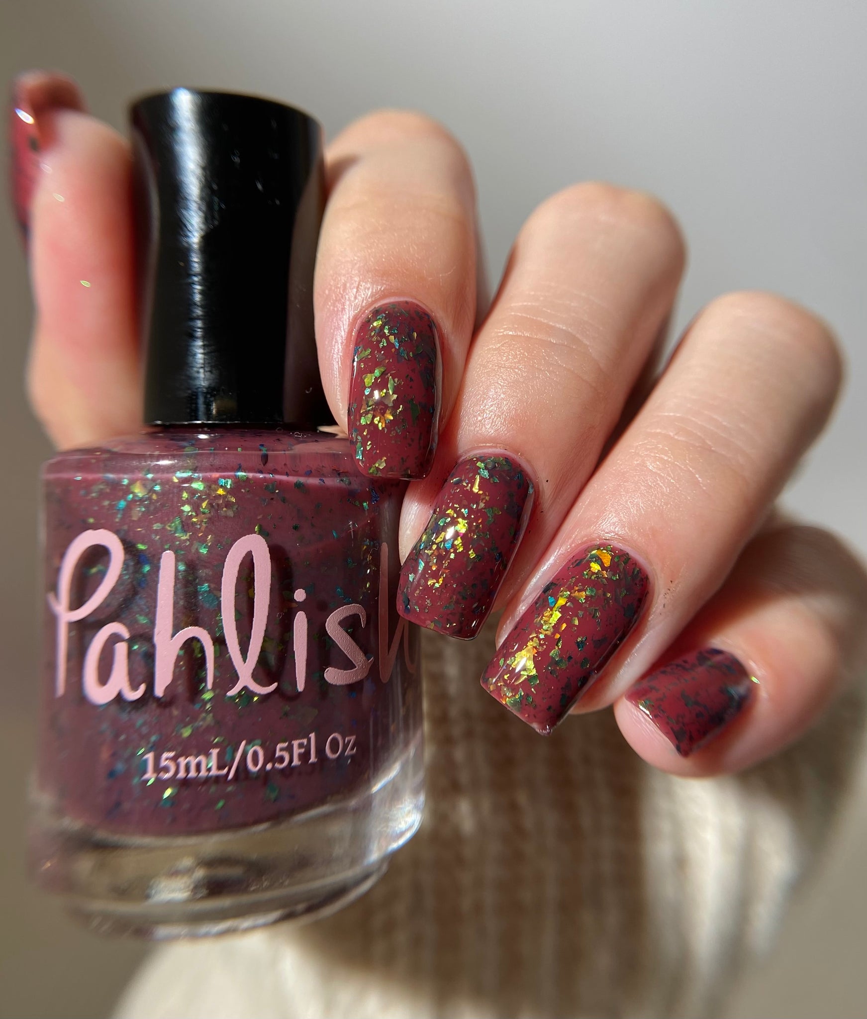 deep raisin cream with metallic multichrome flakes that shift green/gold/blue