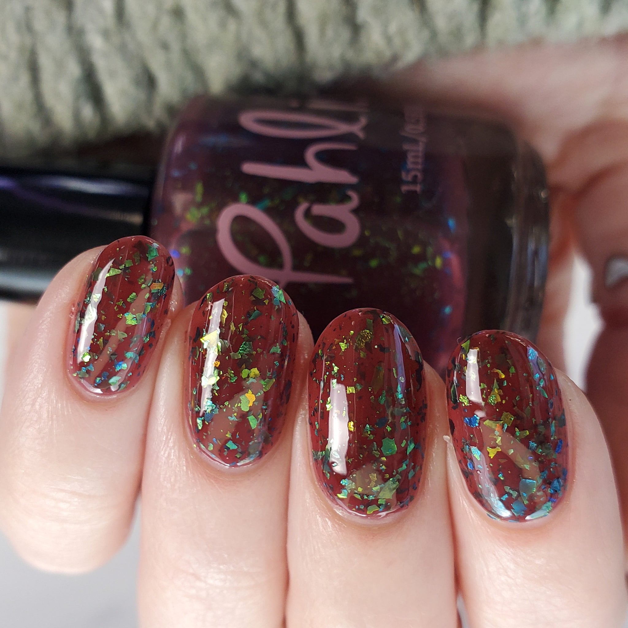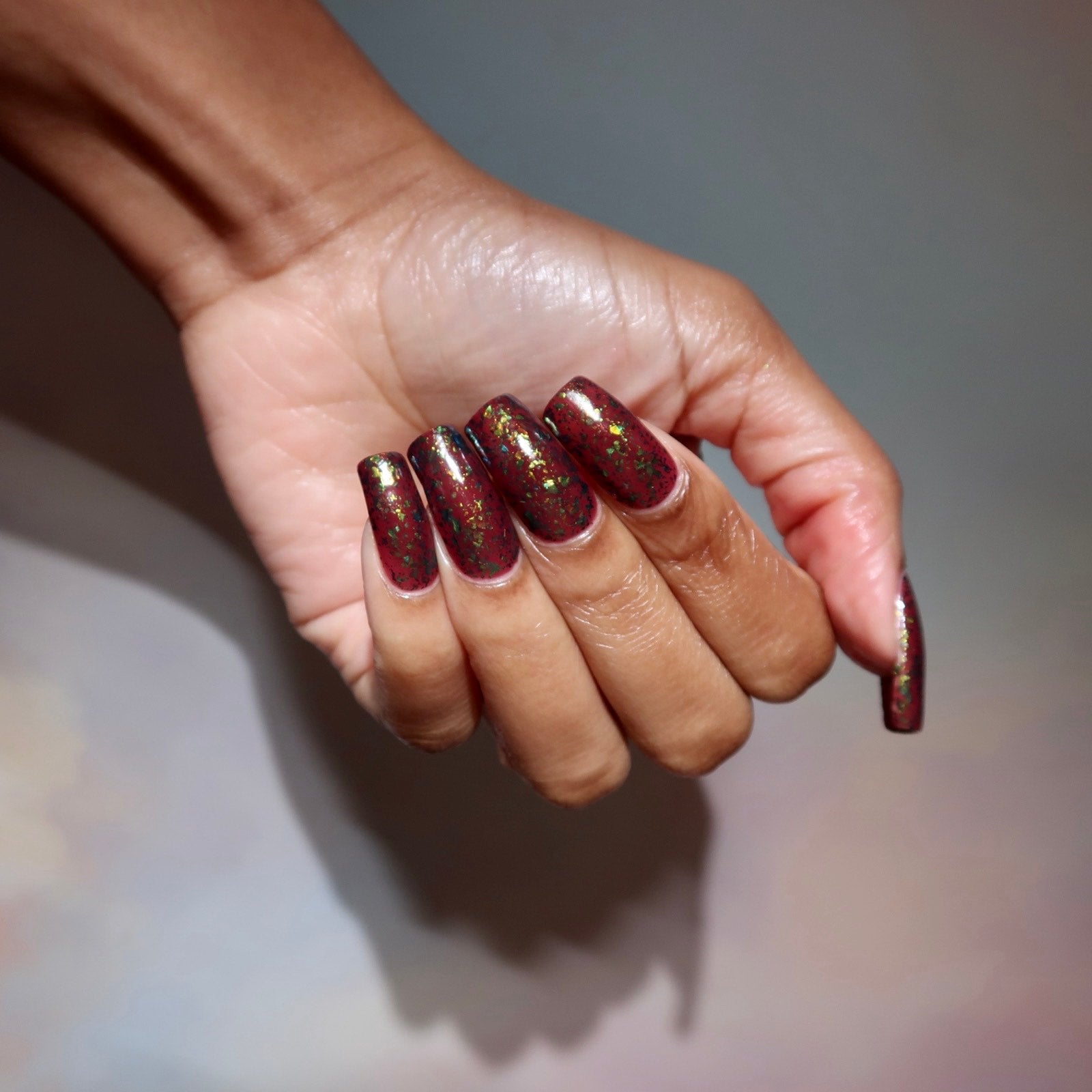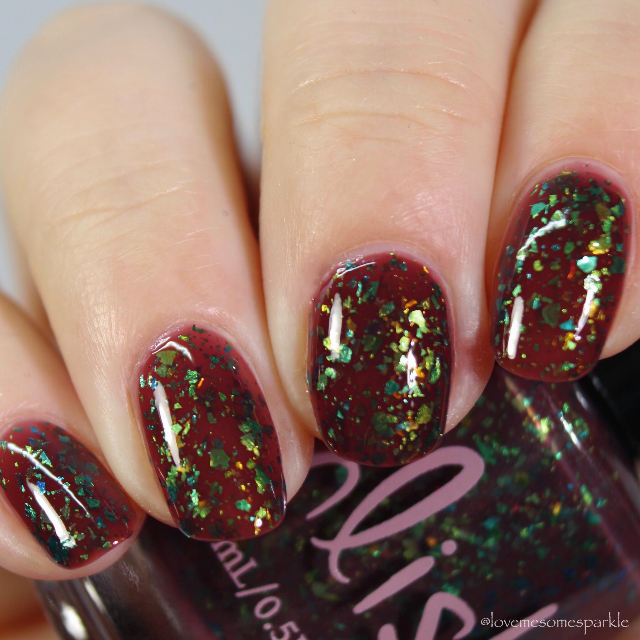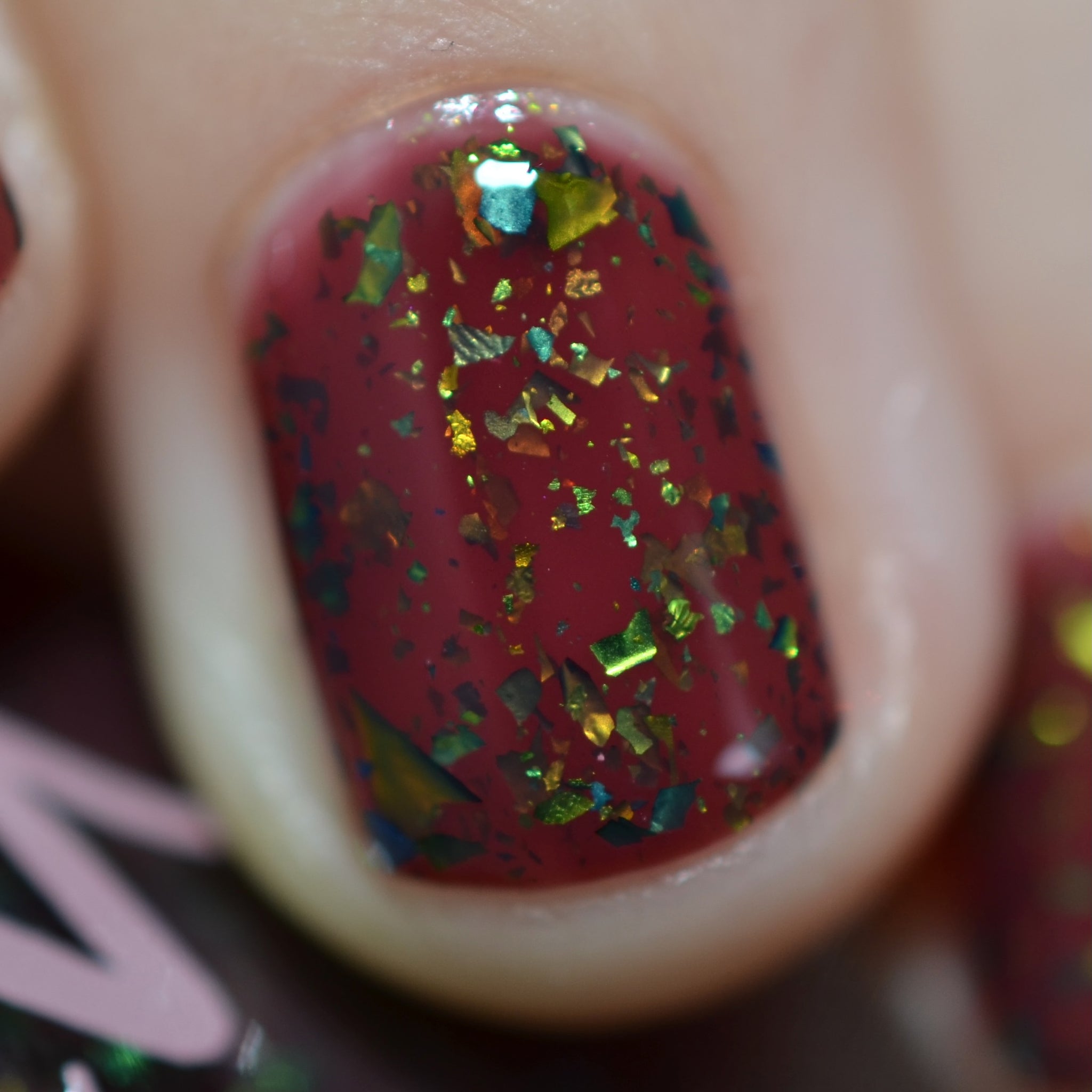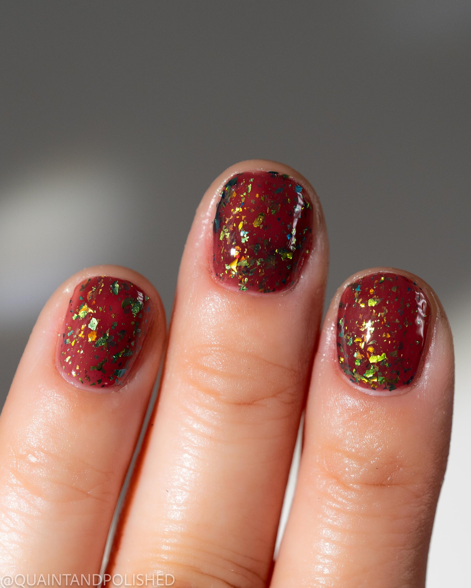 deep raisin cream with metallic multichrome flakes that shift green/gold/blue