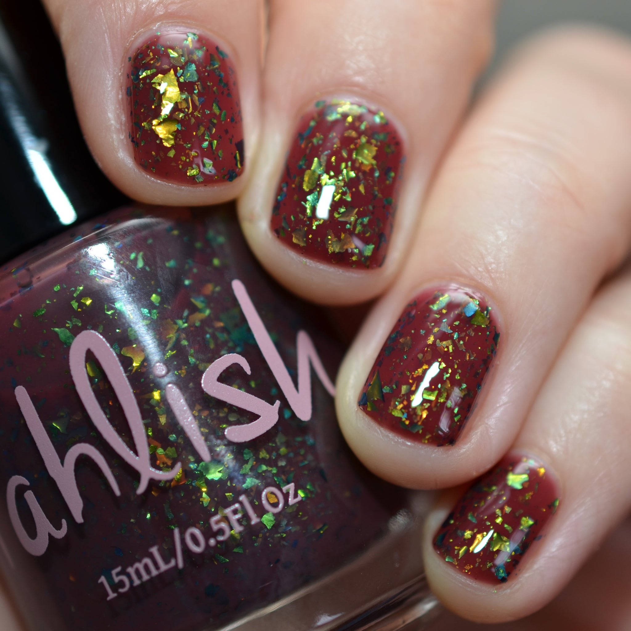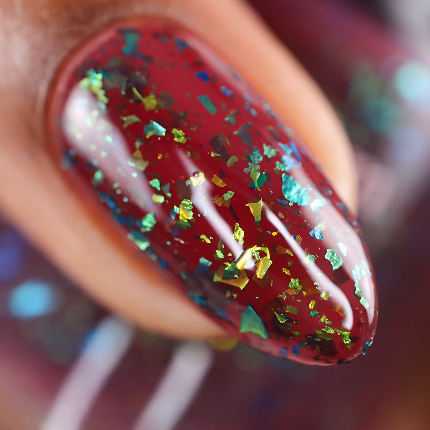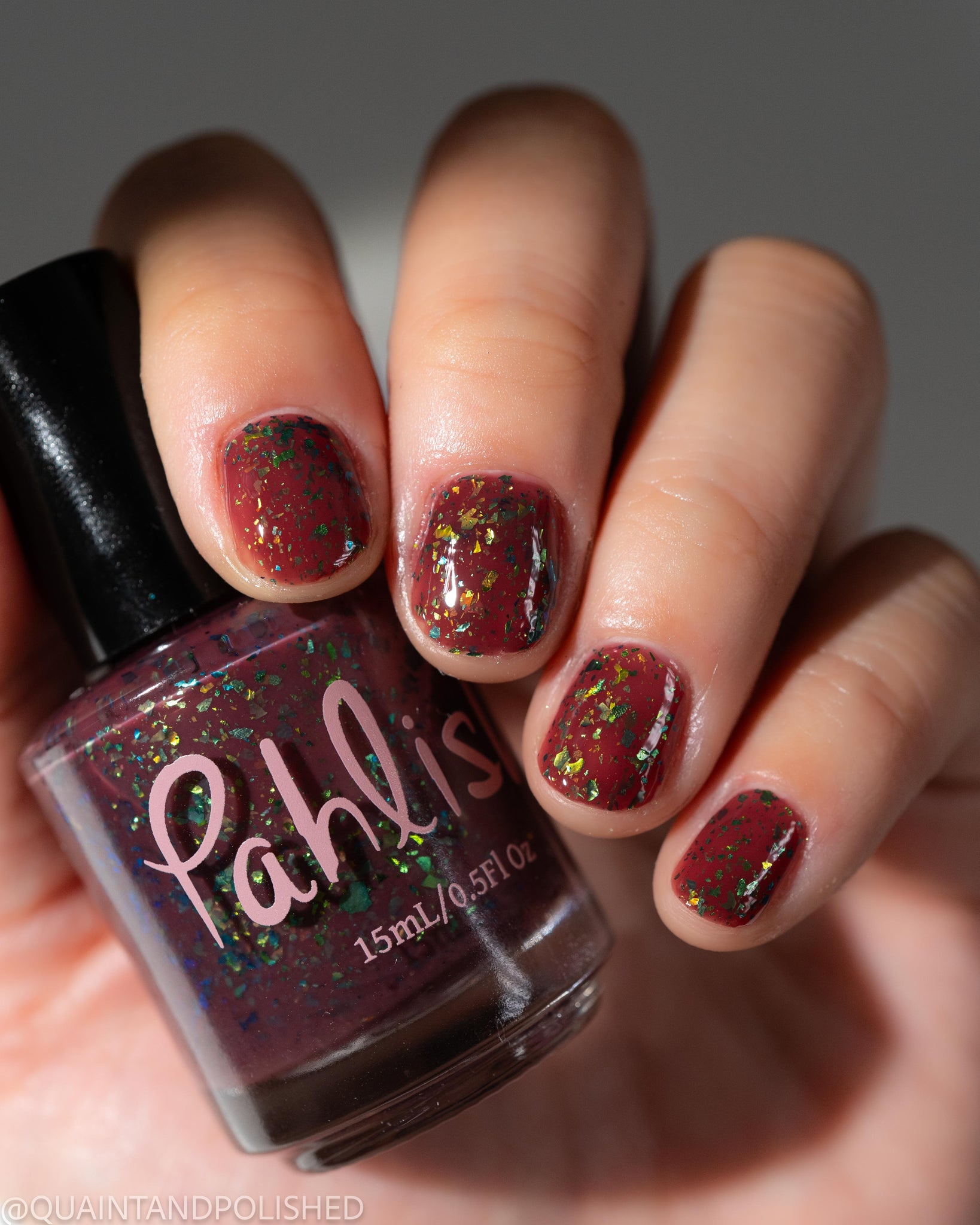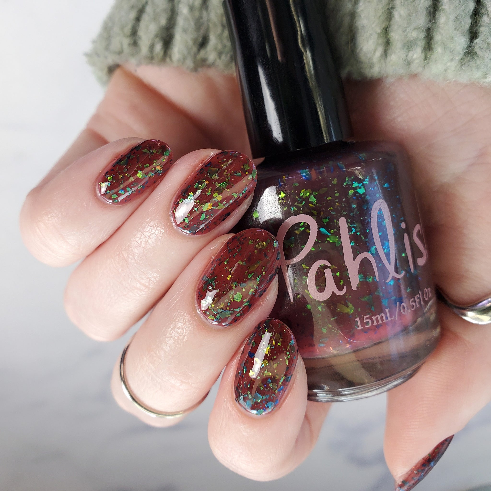 deep raisin cream with metallic multichrome flakes that shift green/gold/blue