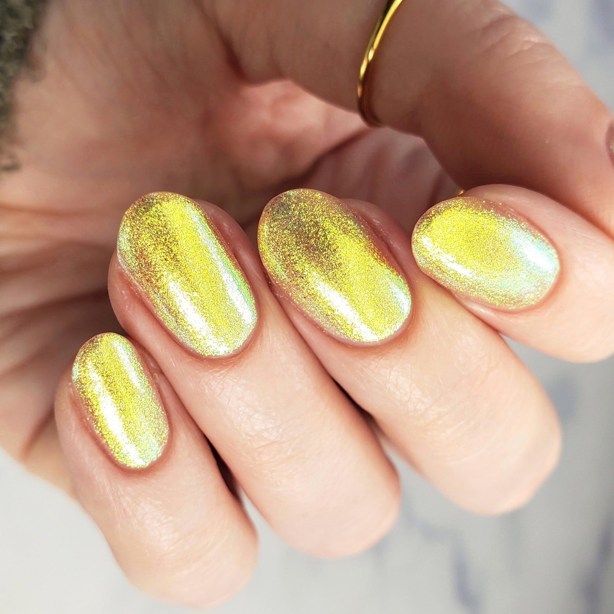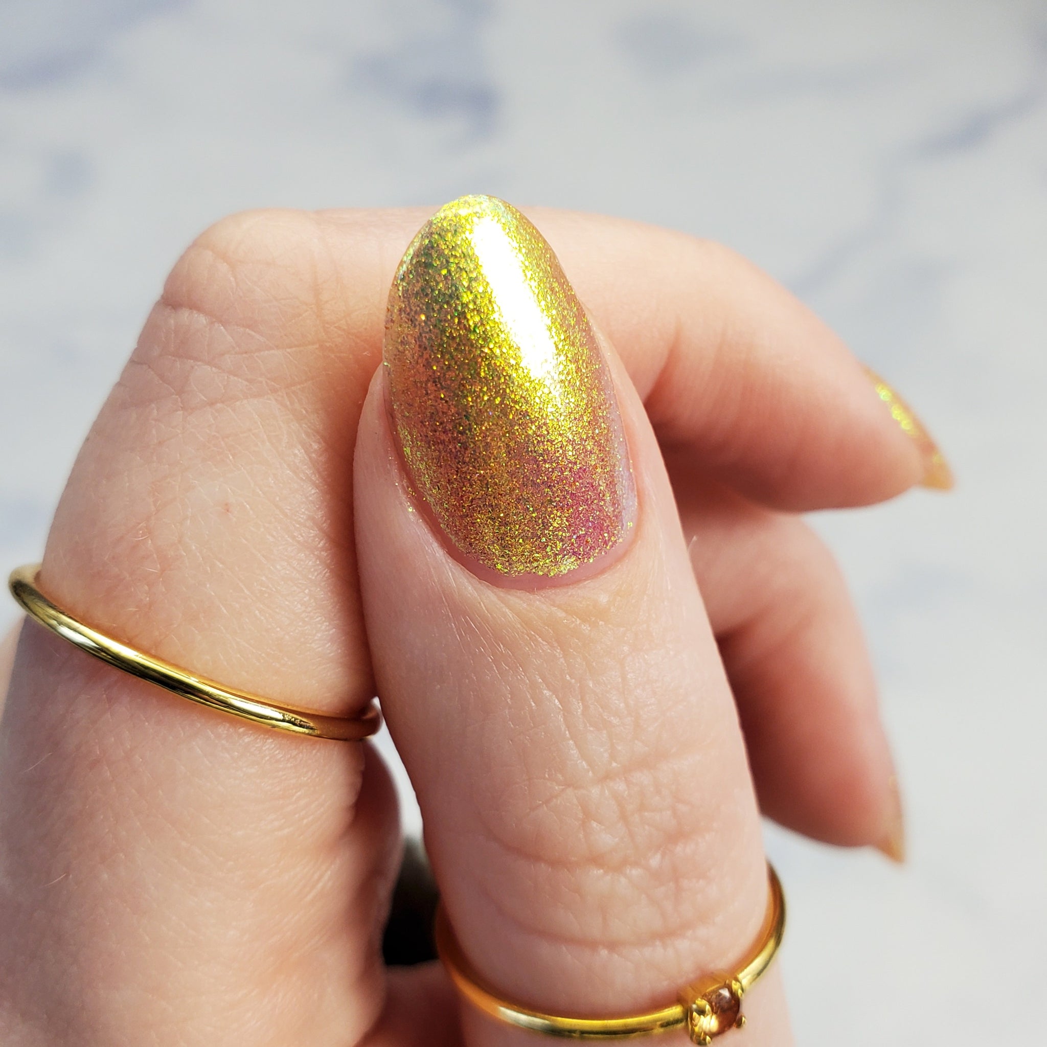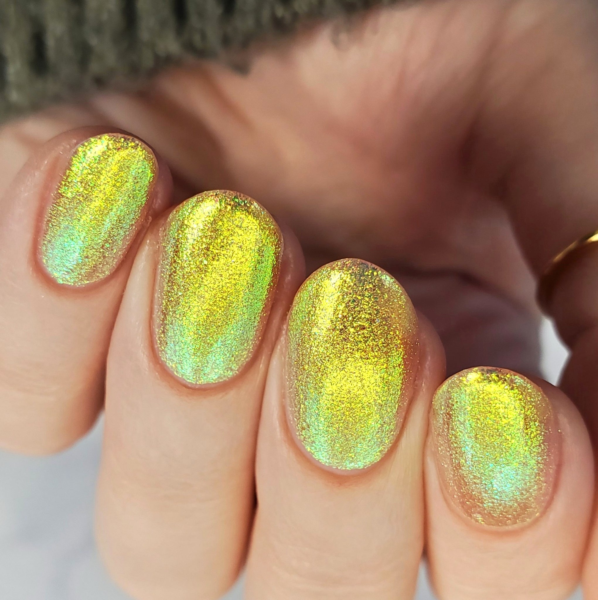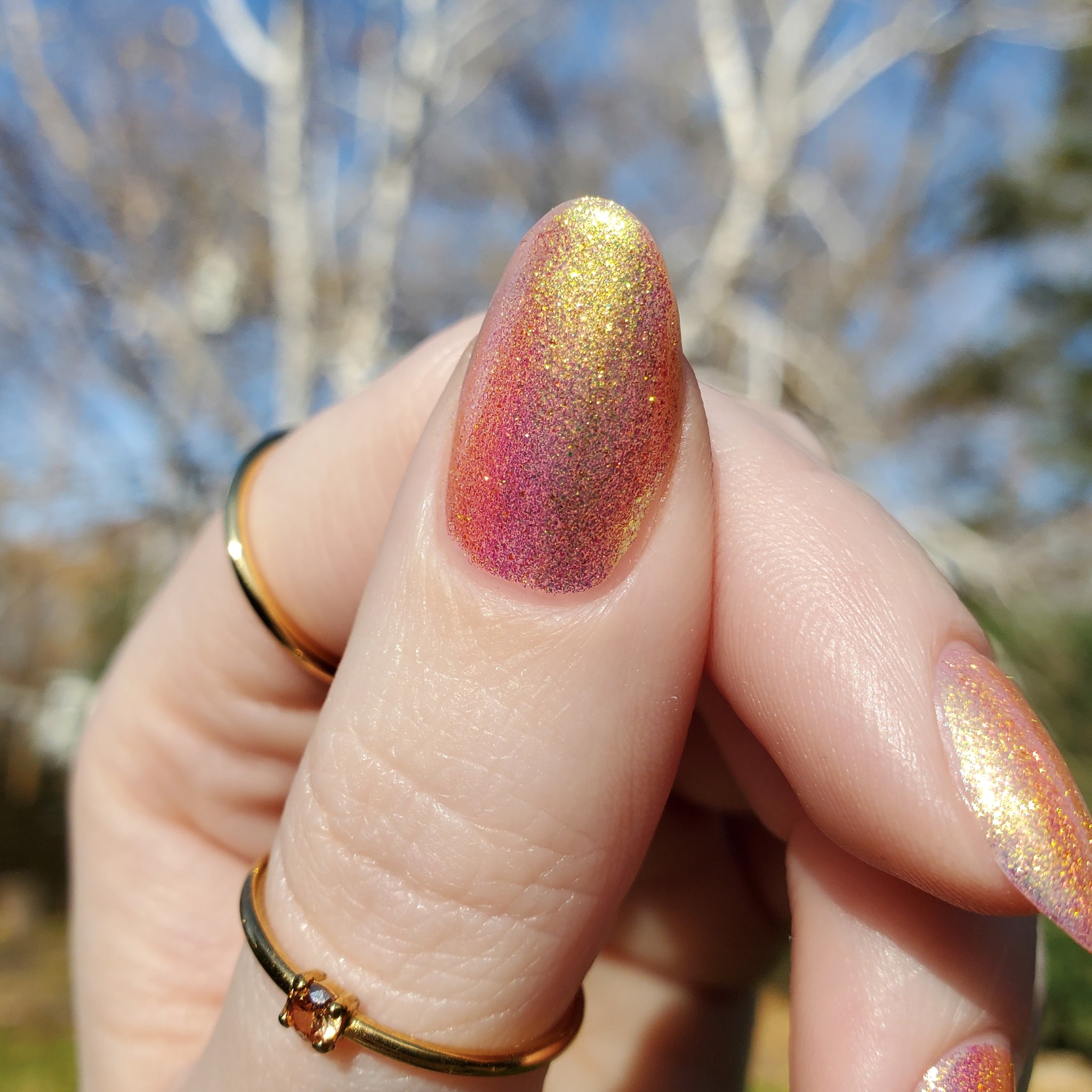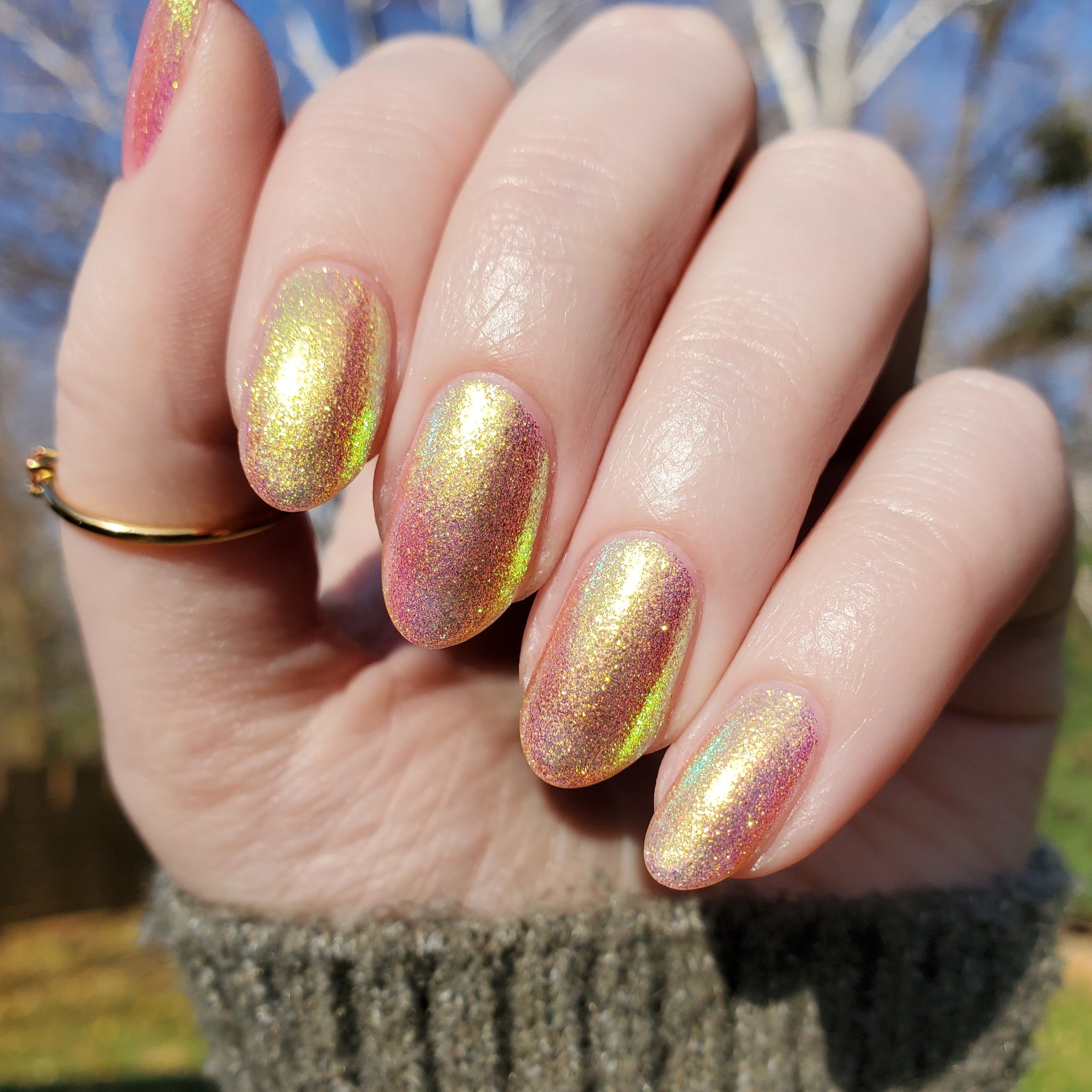 honey blonde packed with golden/copper/green shifting shimmer