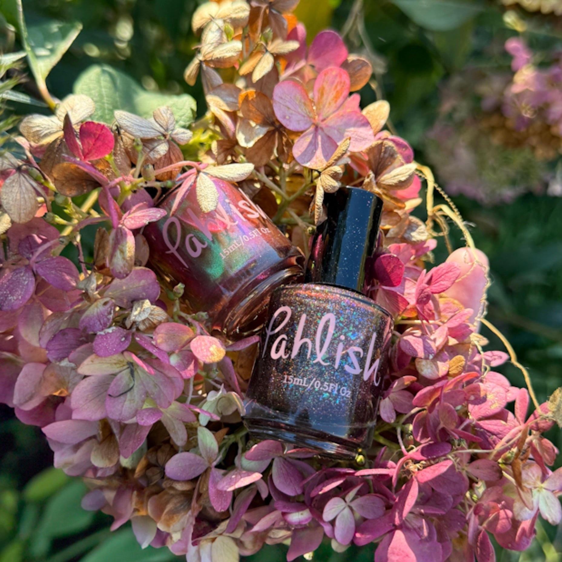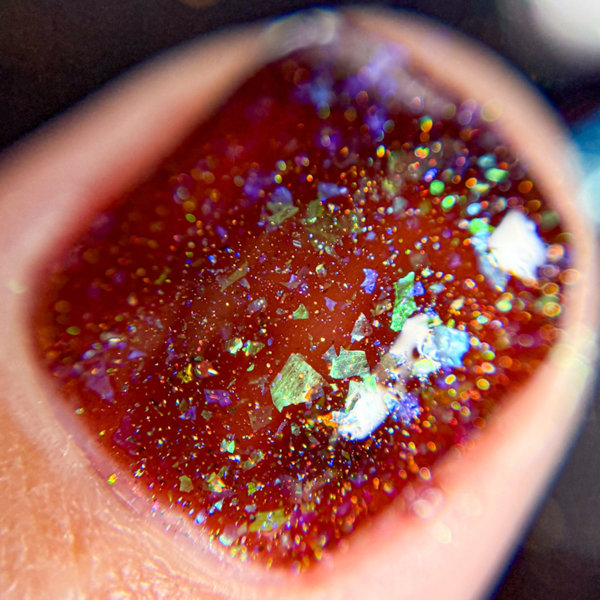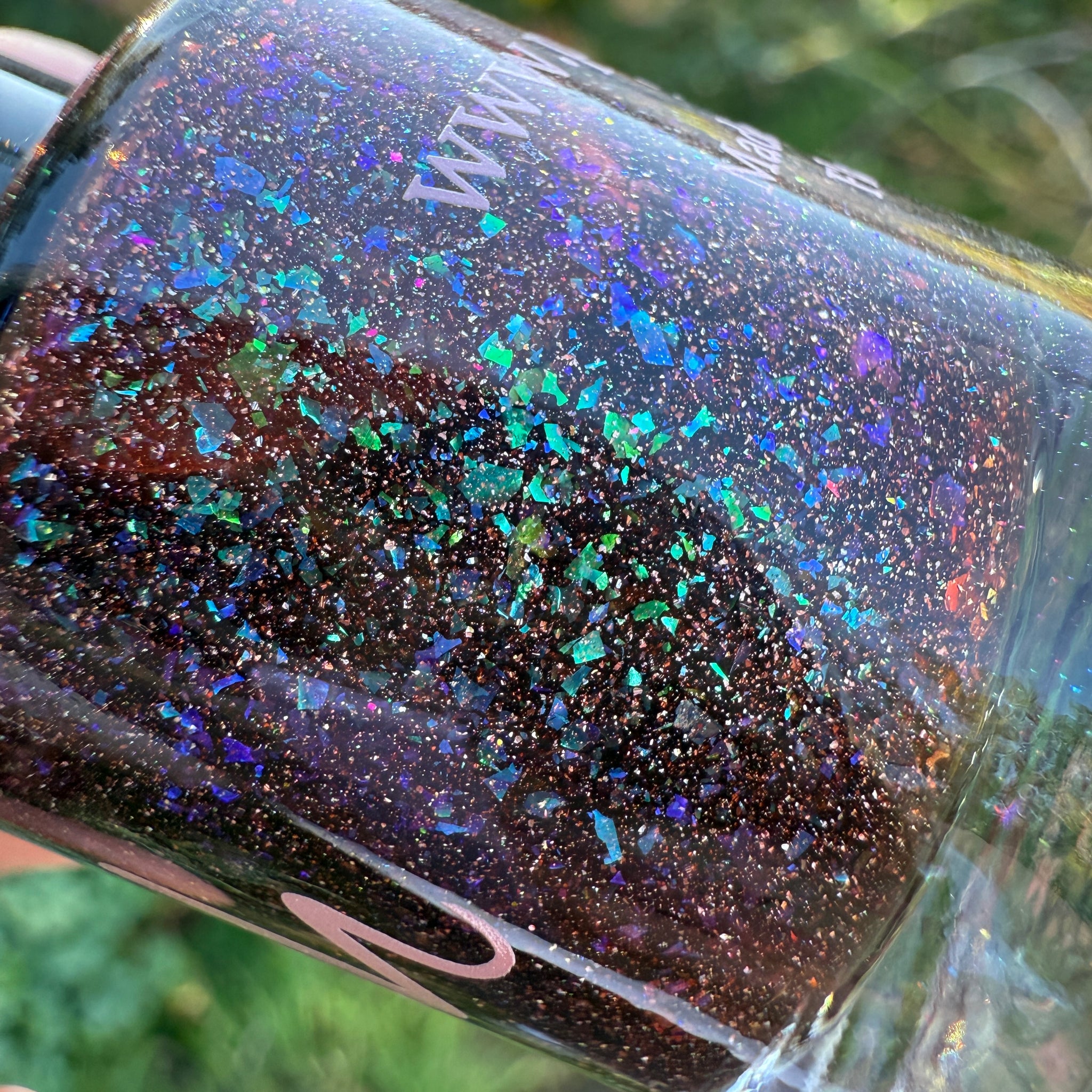 warm brown jelly with iridescent aqua/purple shifting flakes and scattered holographic pigment