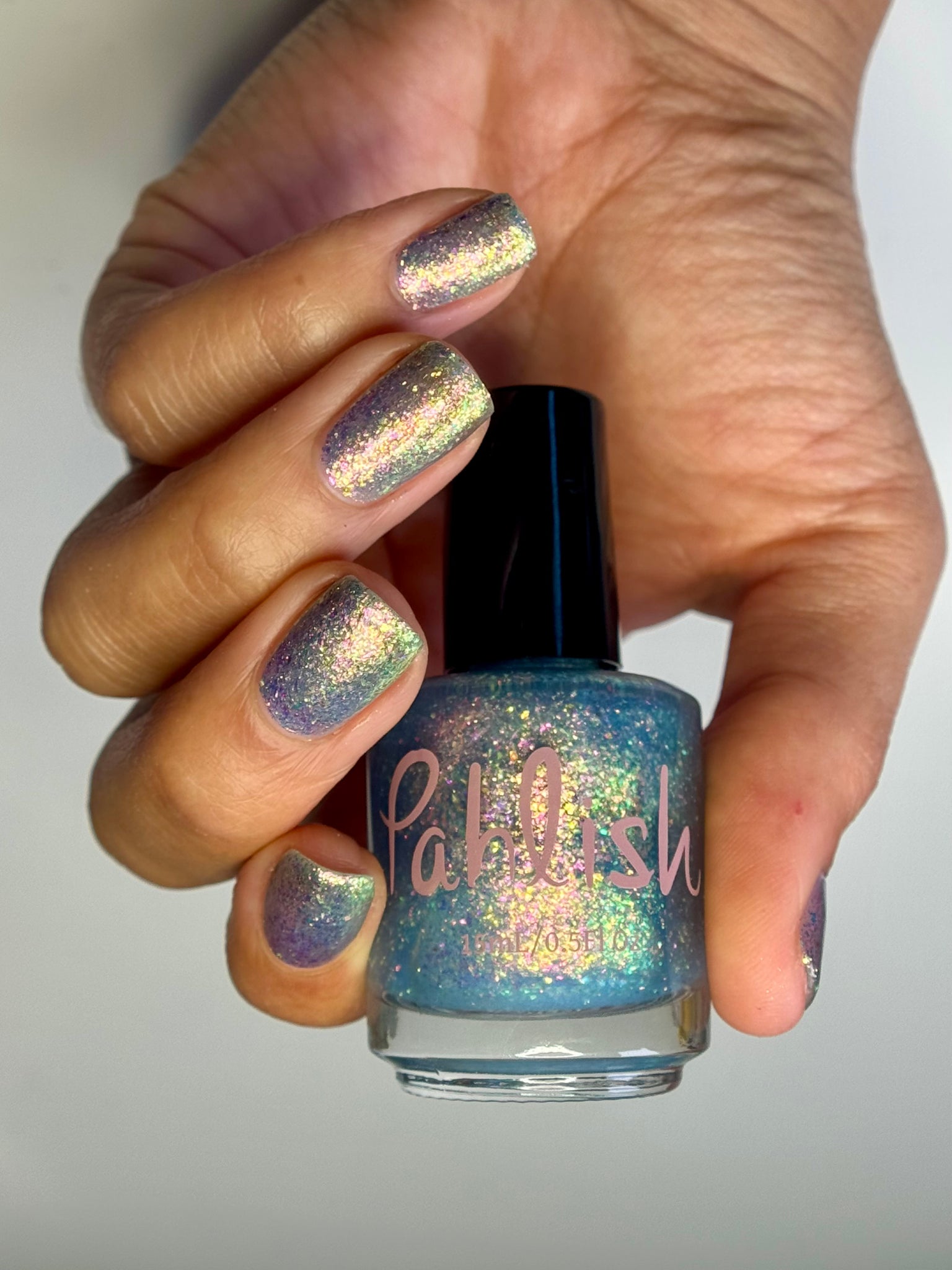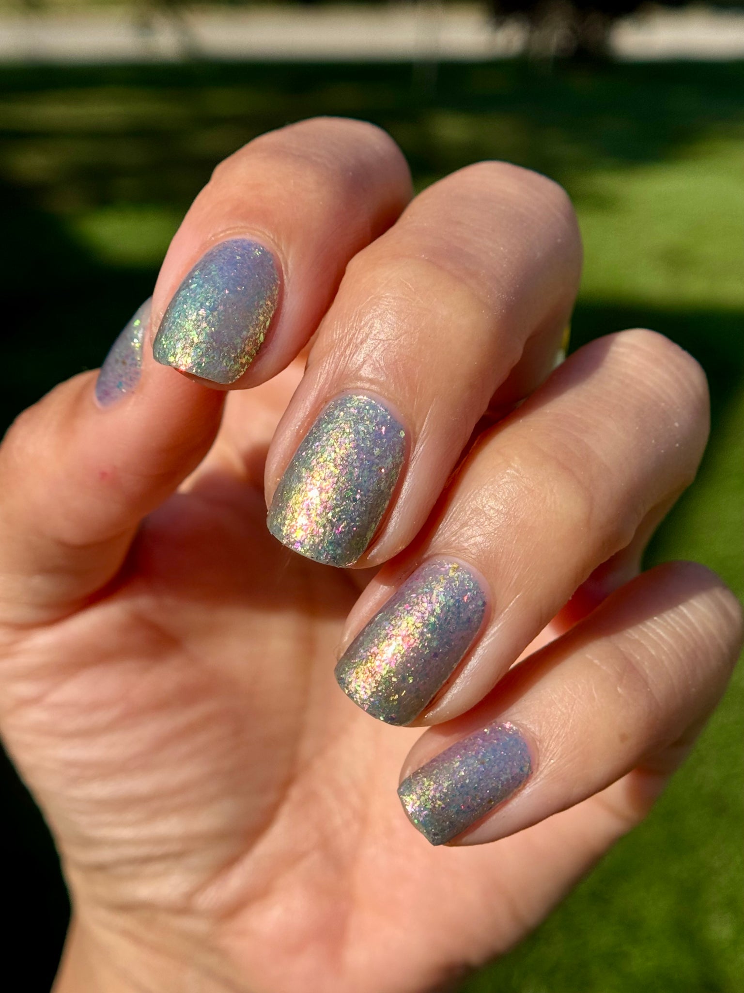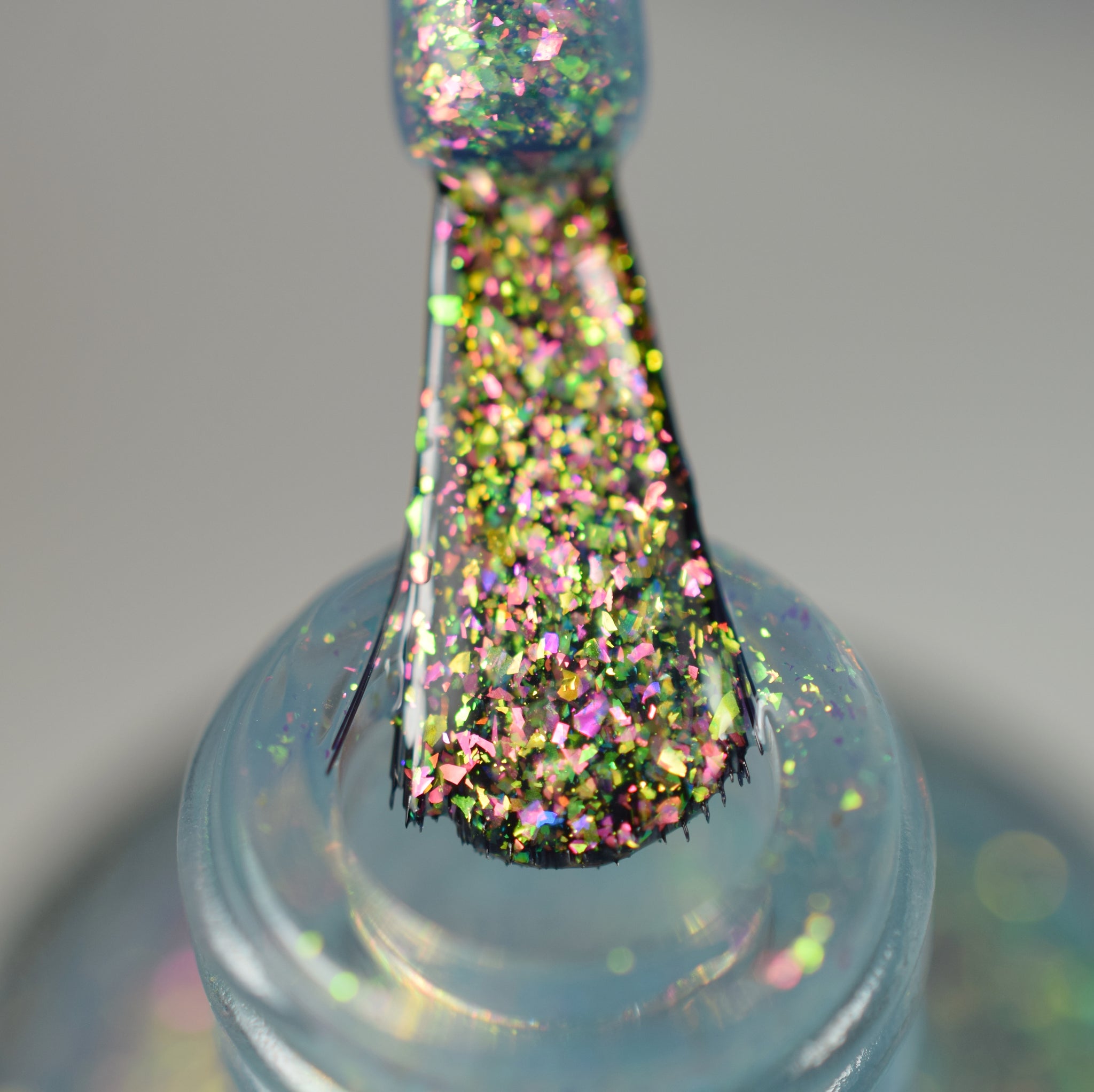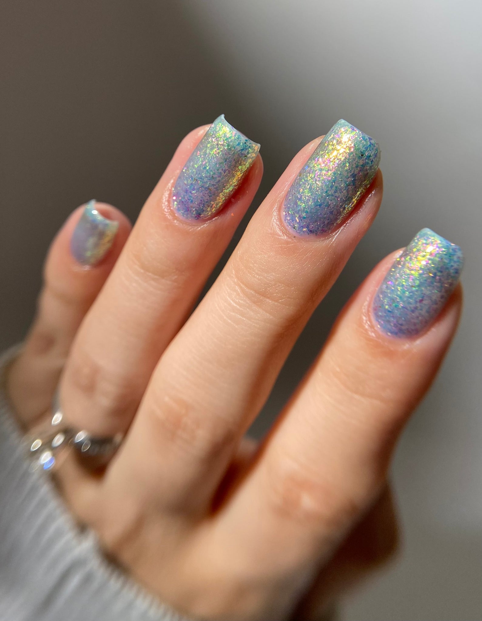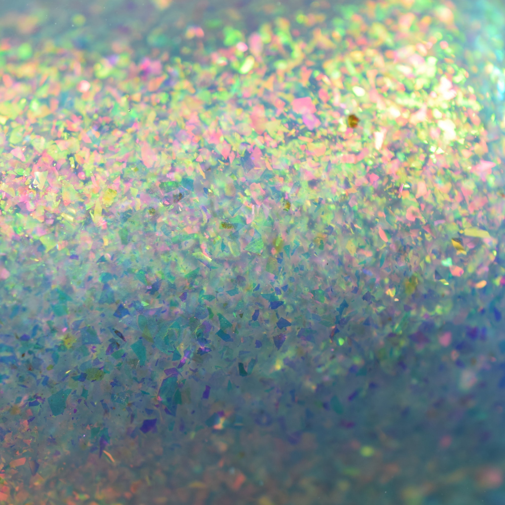 soft cornflower blue with a mix of gold and pink iridescent flakes