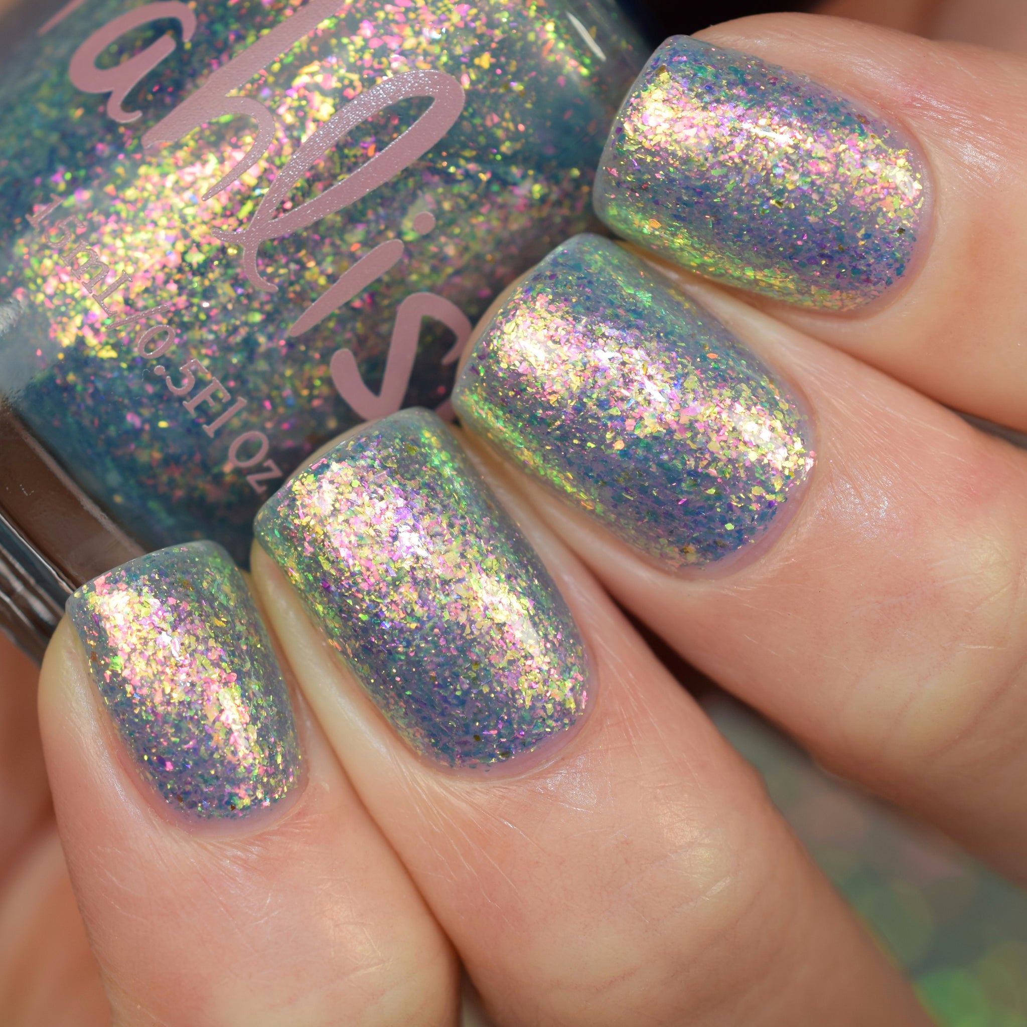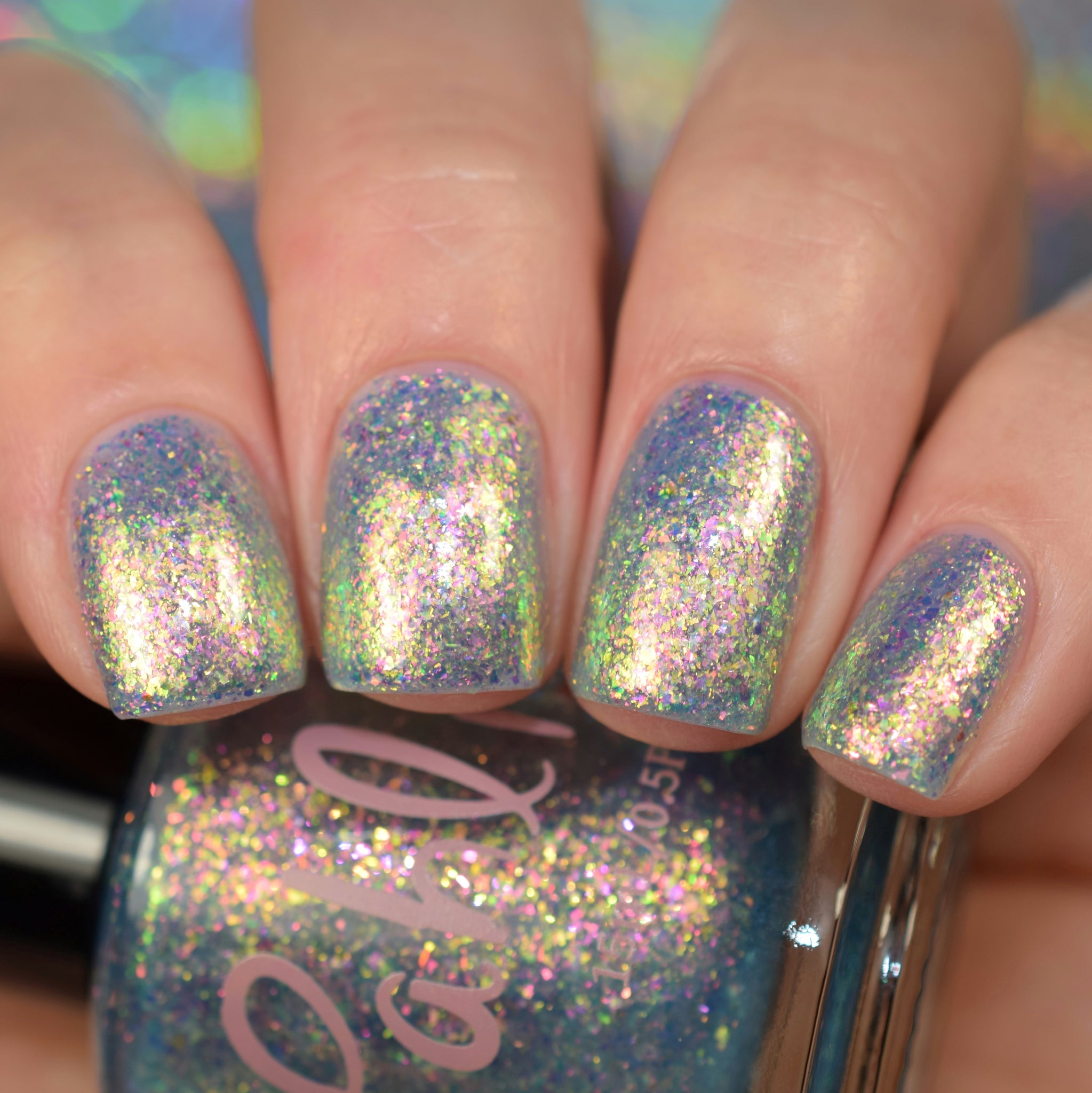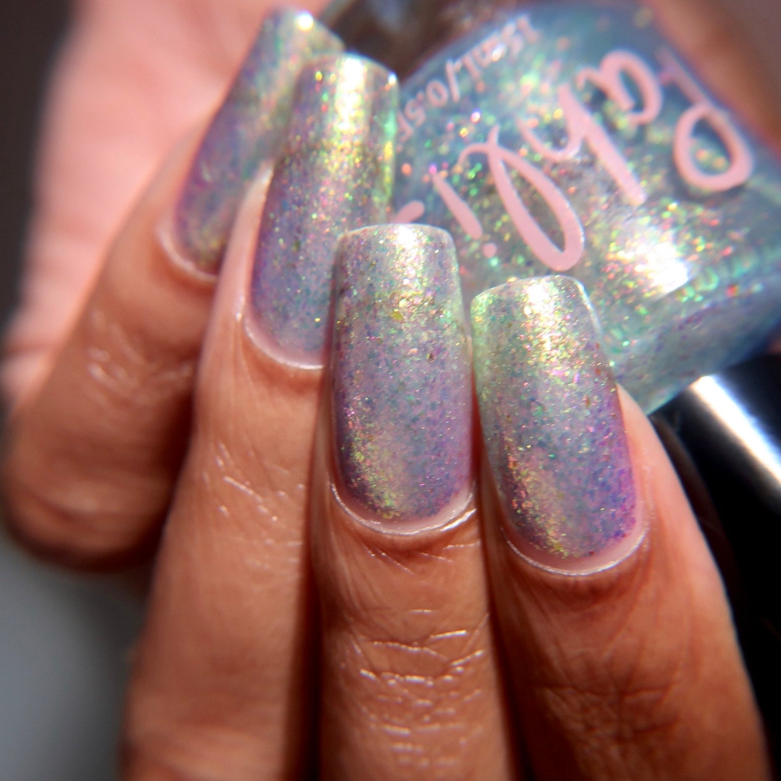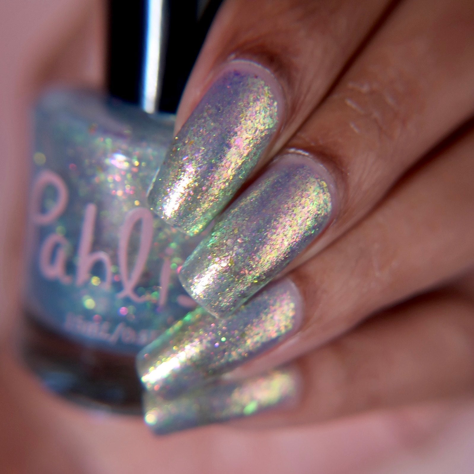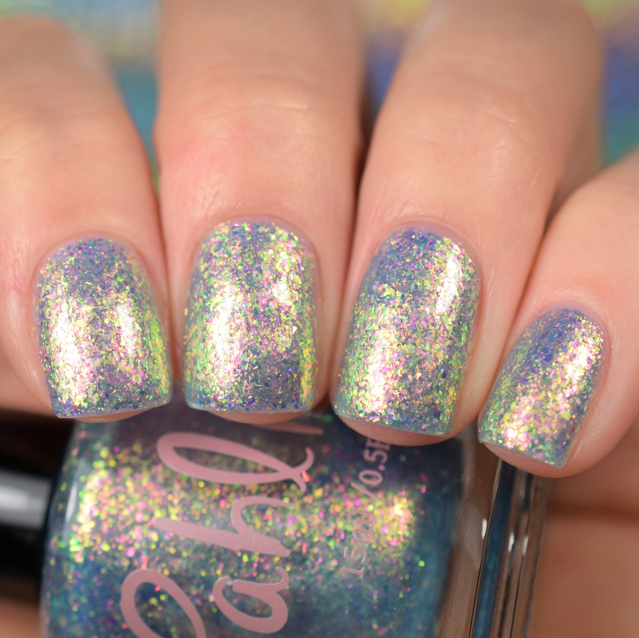 soft cornflower blue with a mix of gold and pink iridescent flakes