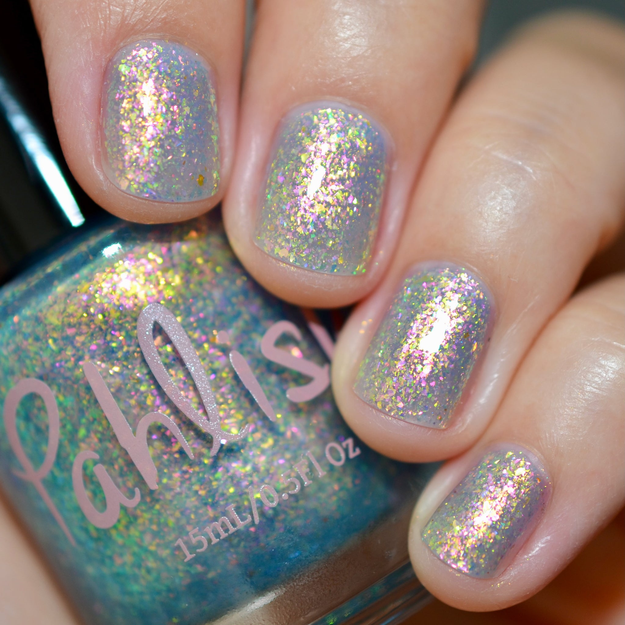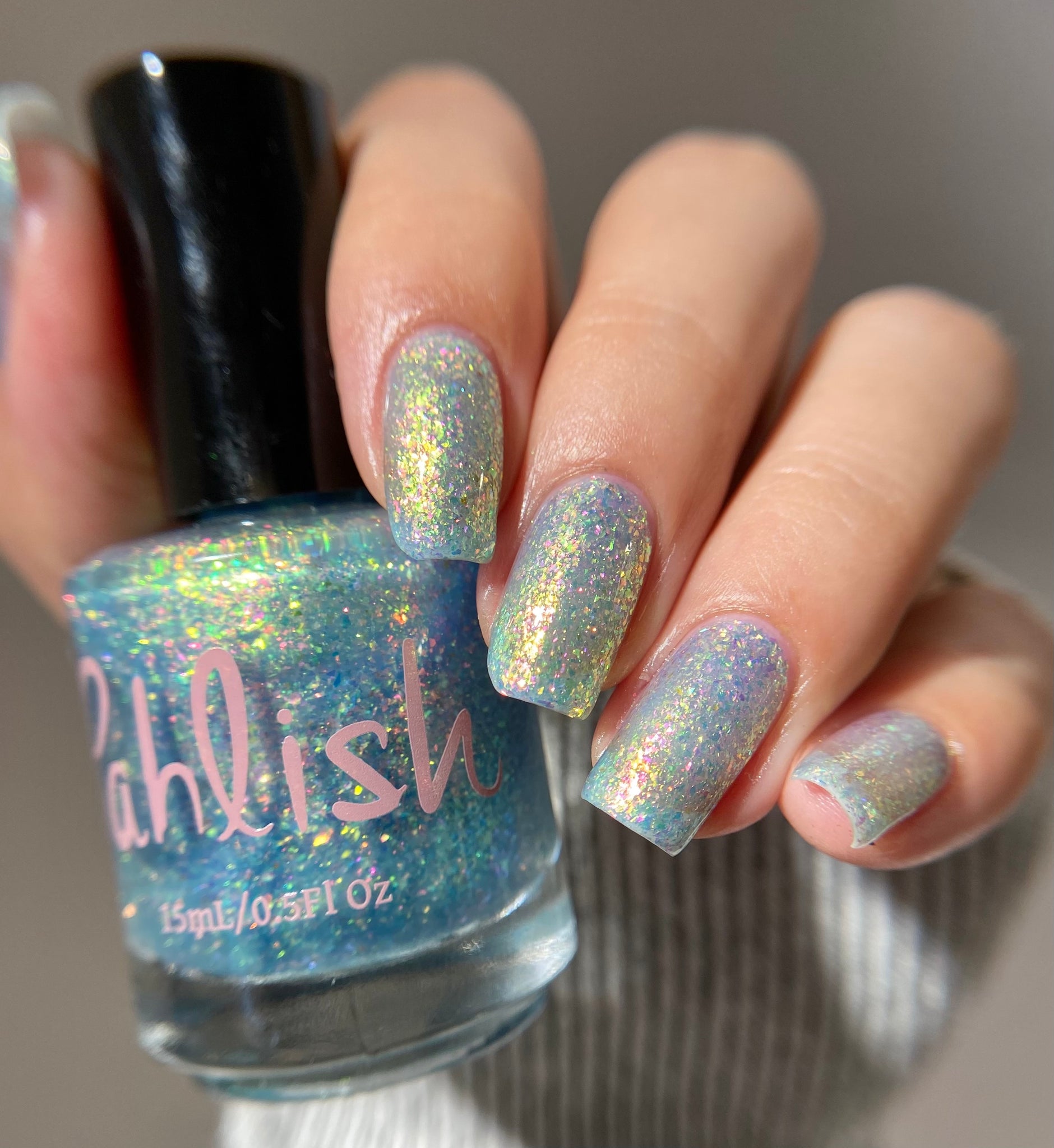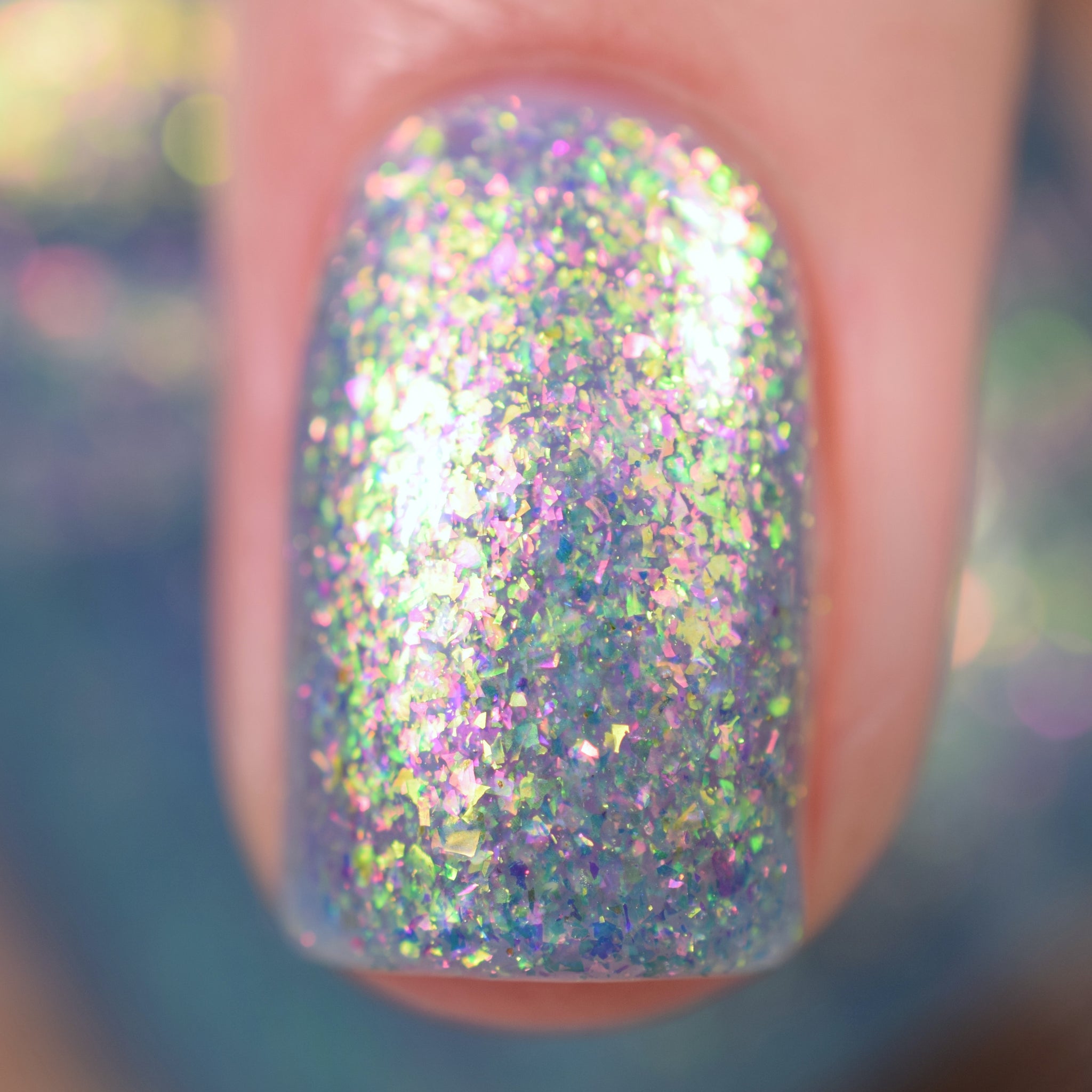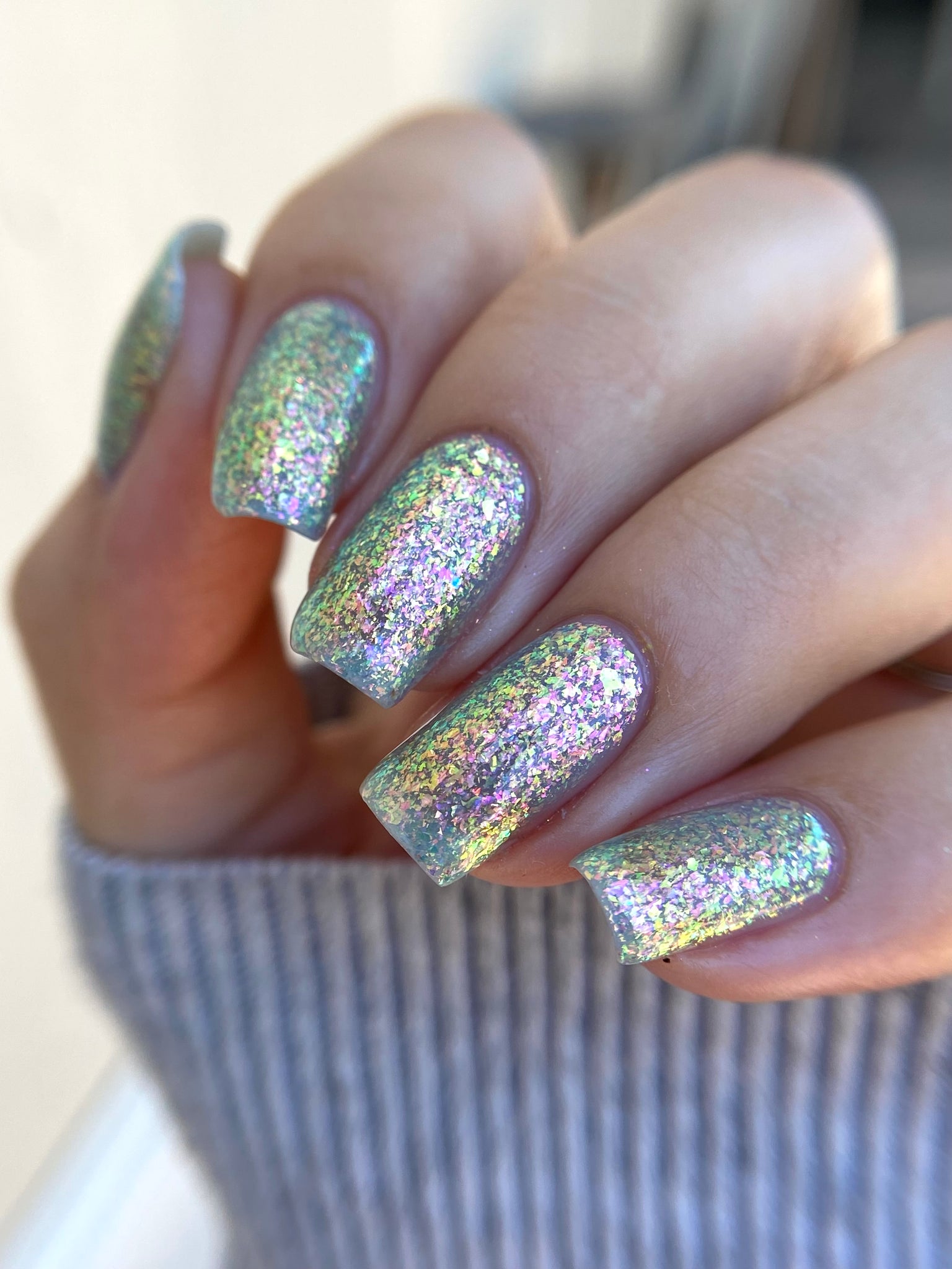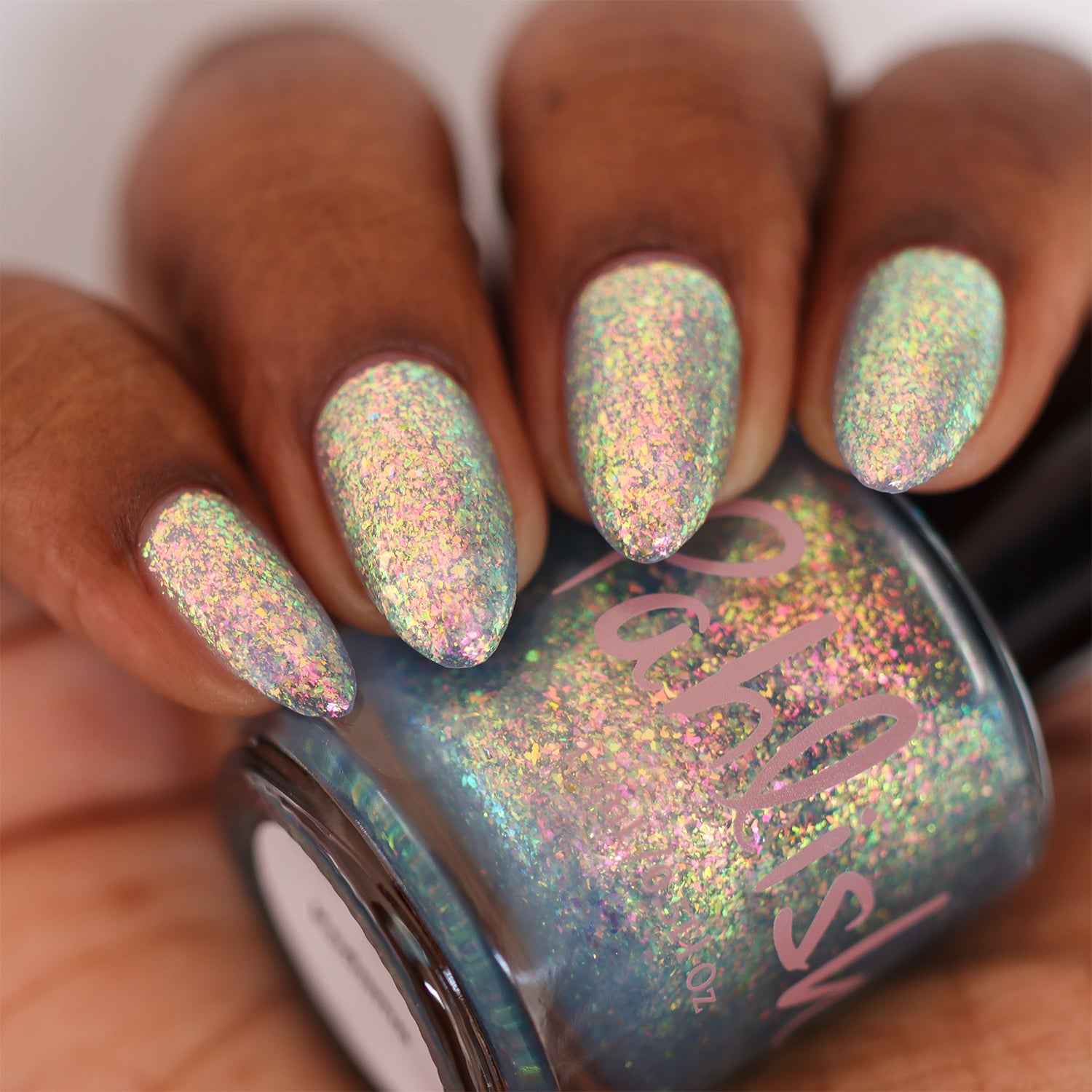 soft cornflower blue with a mix of gold and pink iridescent flakes