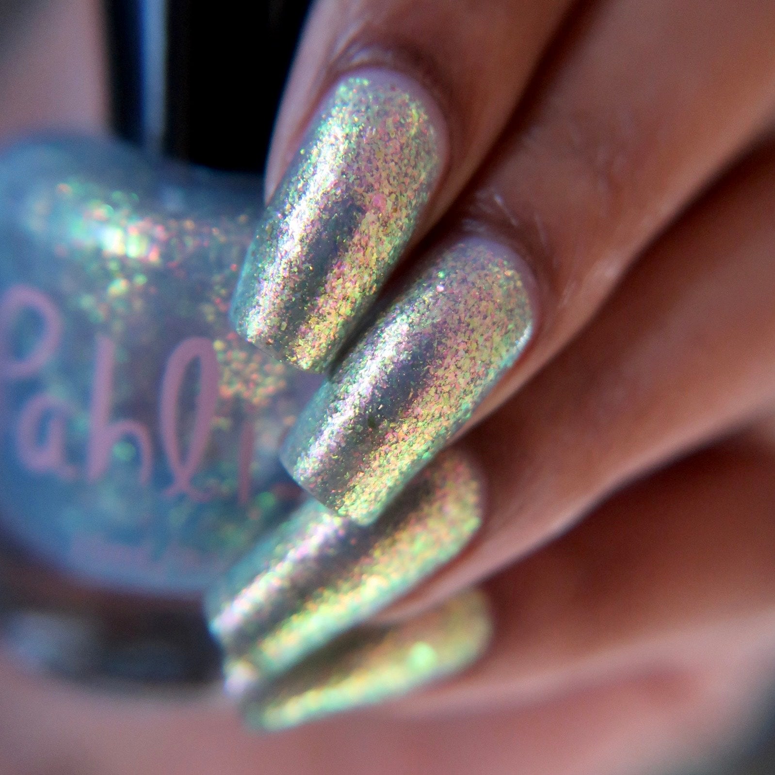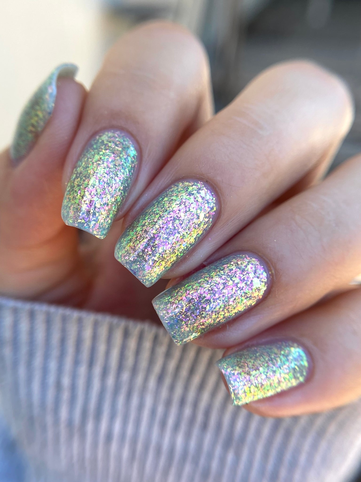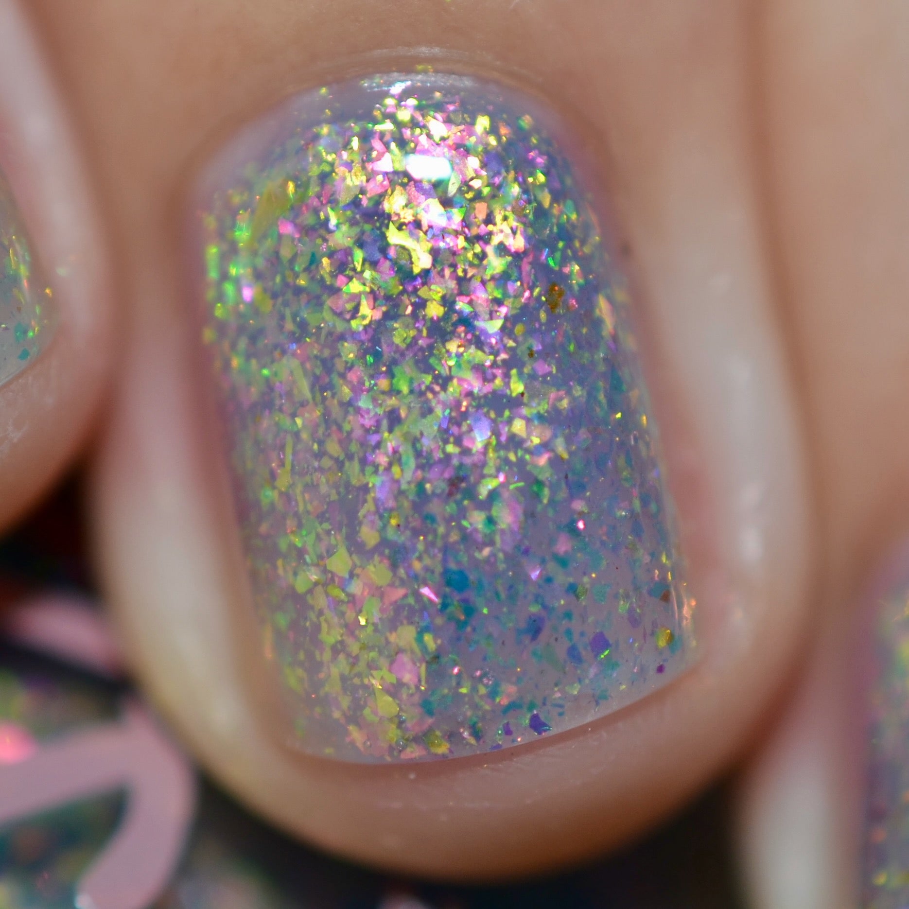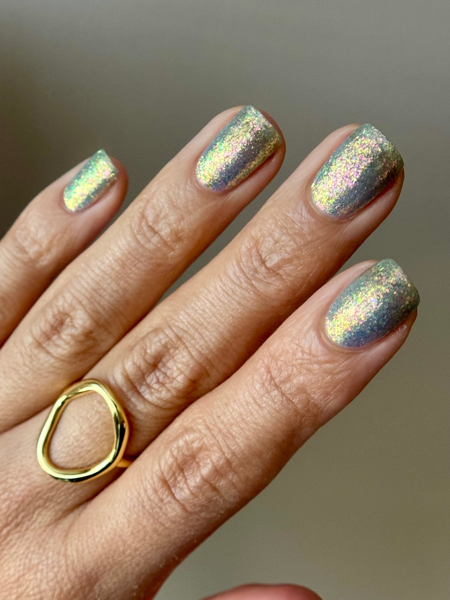 soft cornflower blue with a mix of gold and pink iridescent flakes
