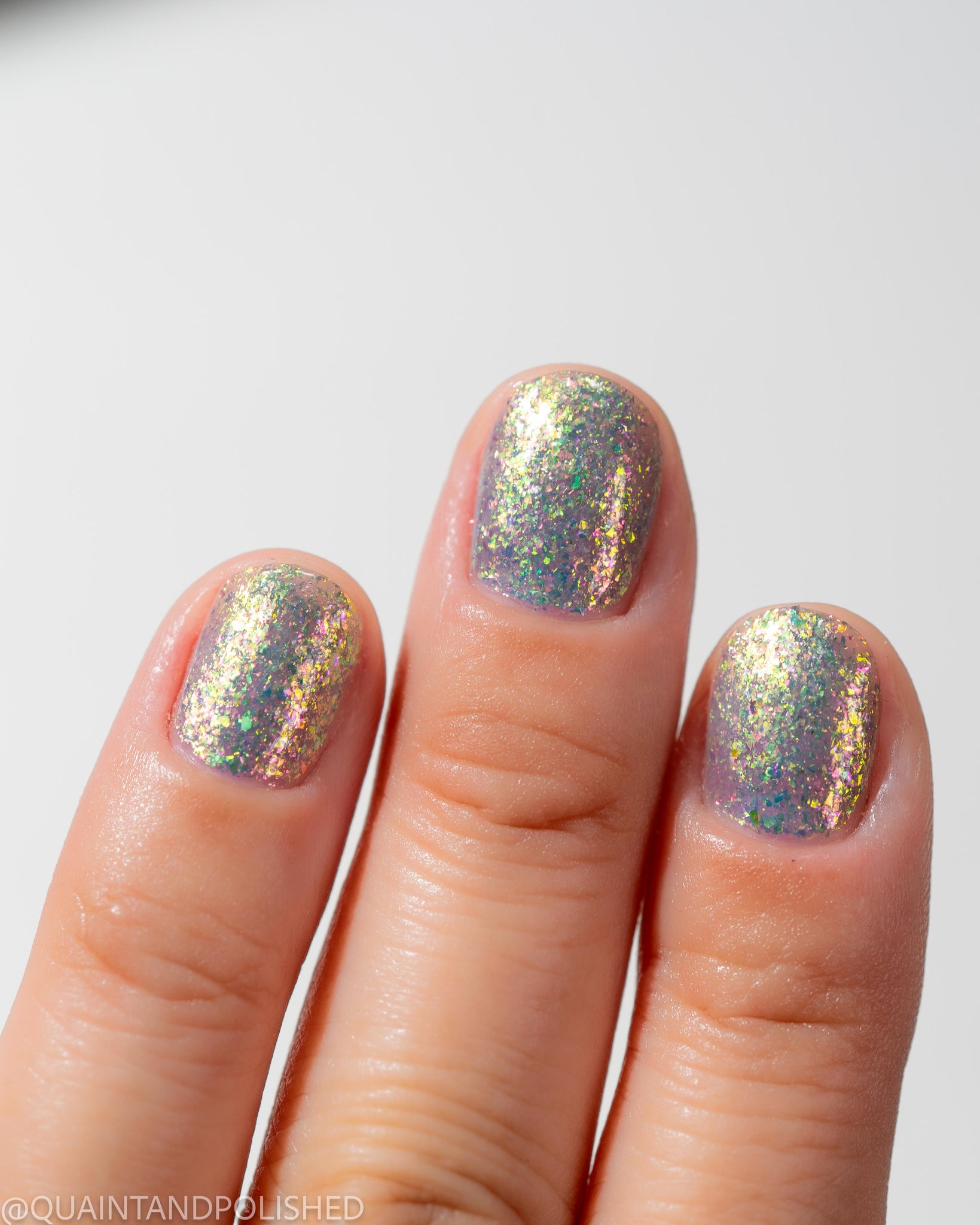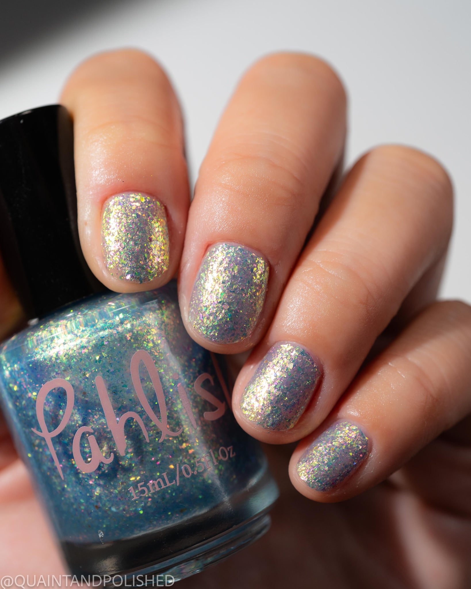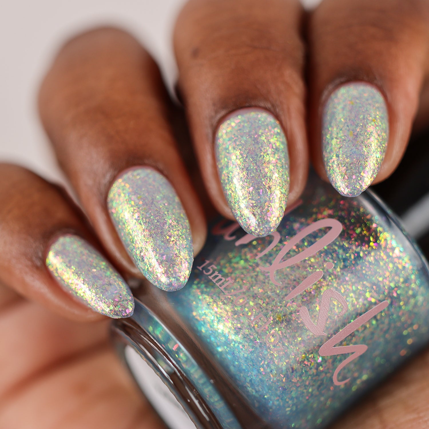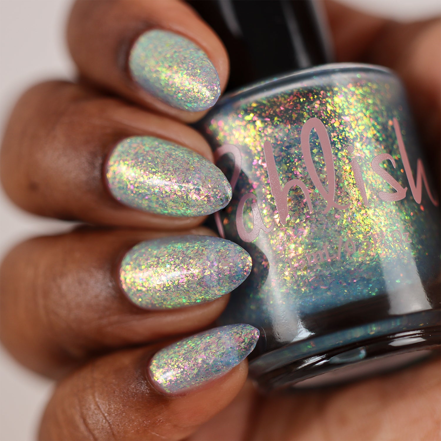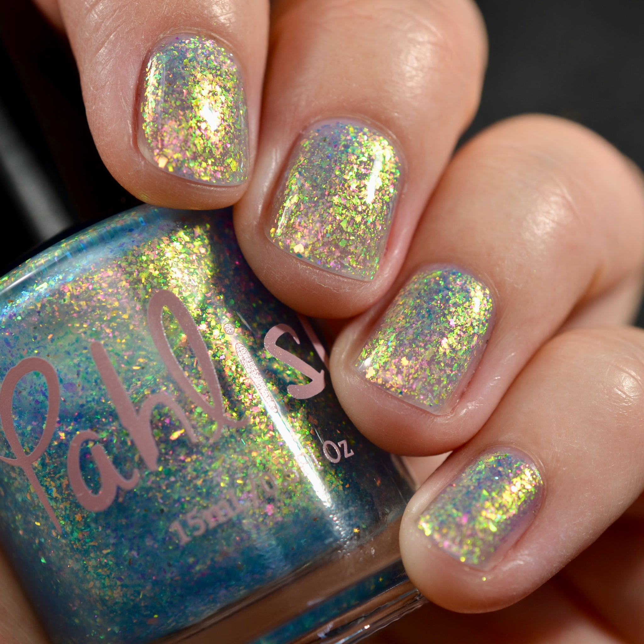 soft cornflower blue with a mix of gold and pink iridescent flakes