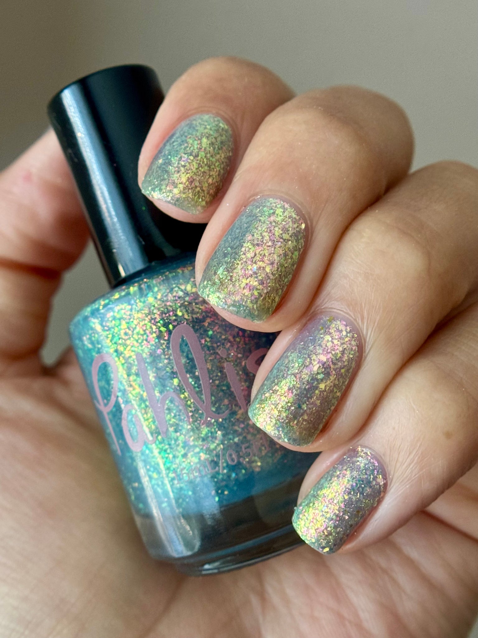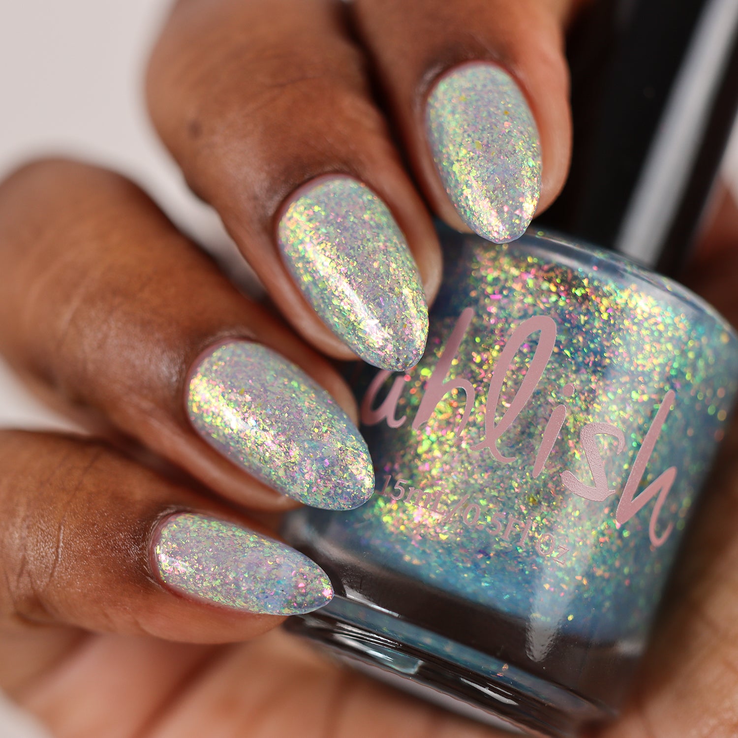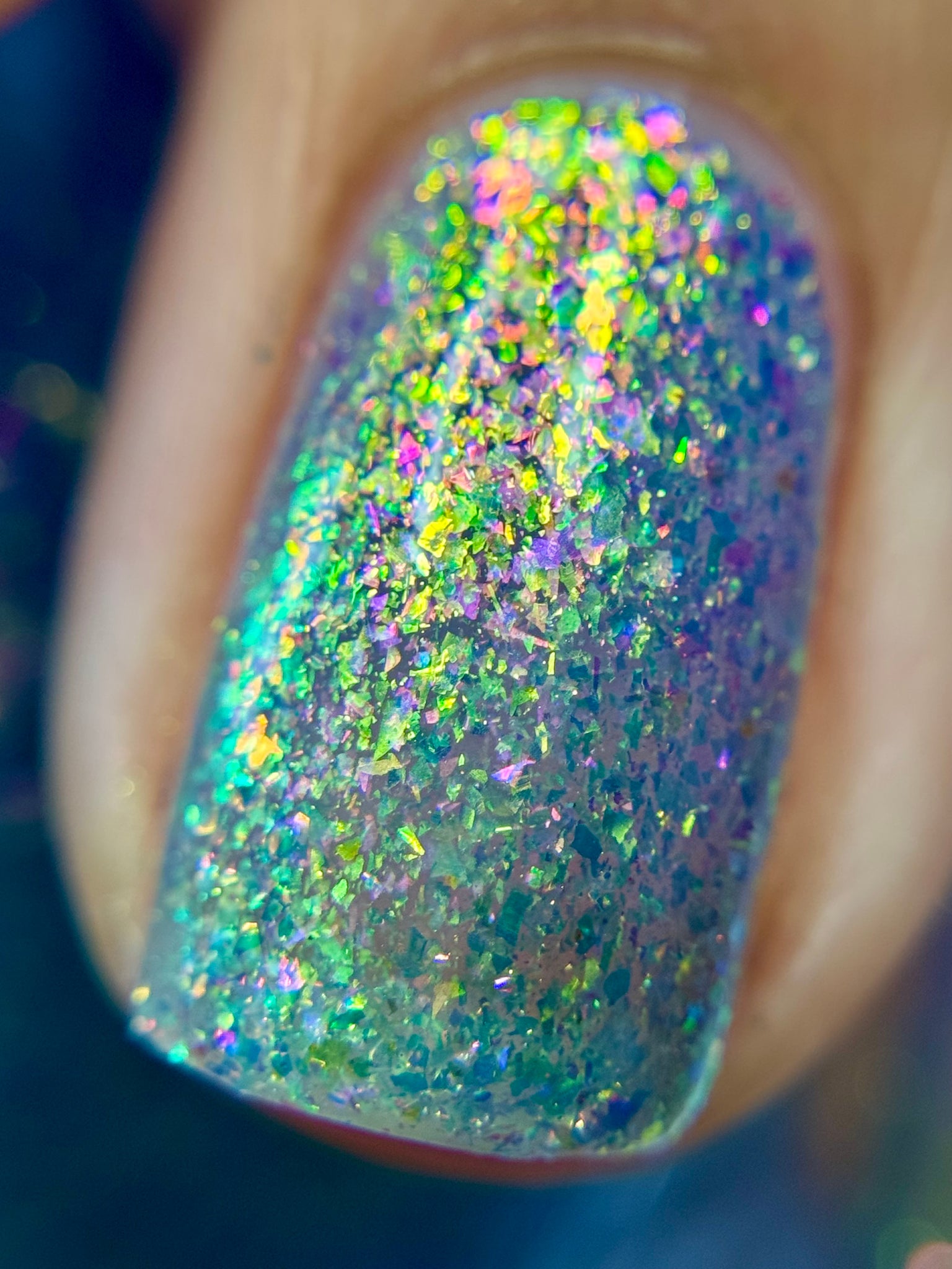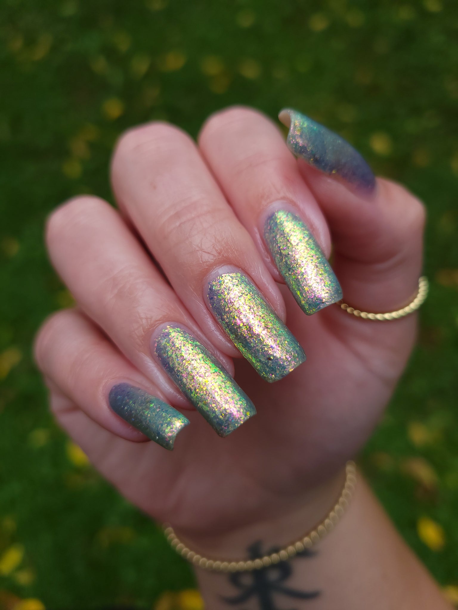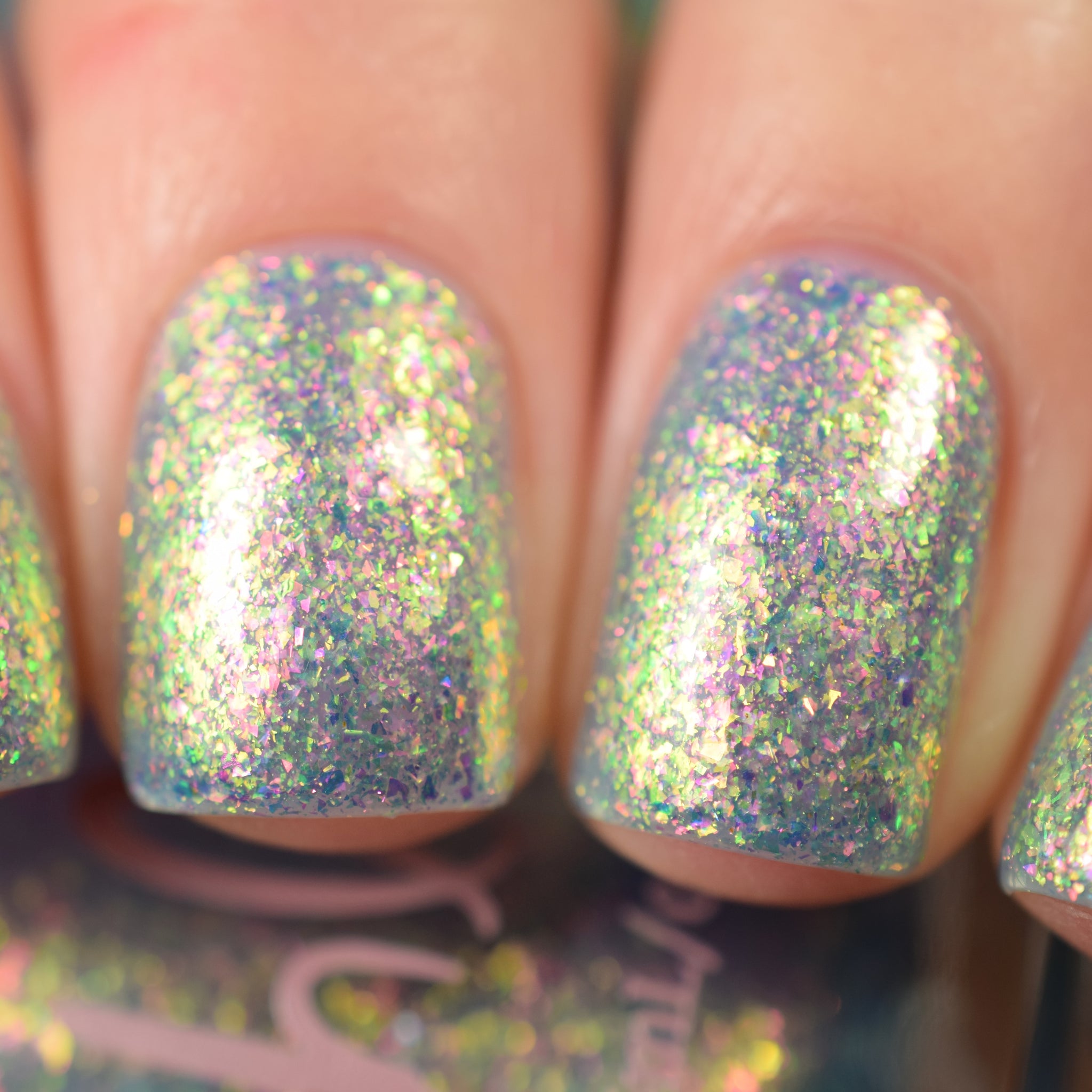 soft cornflower blue with a mix of gold and pink iridescent flakes