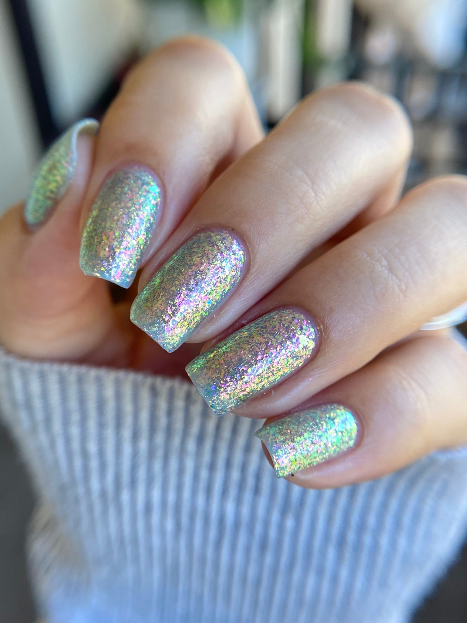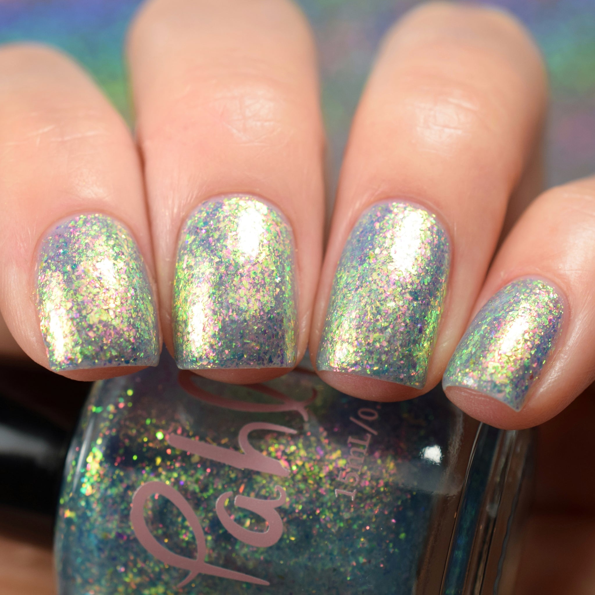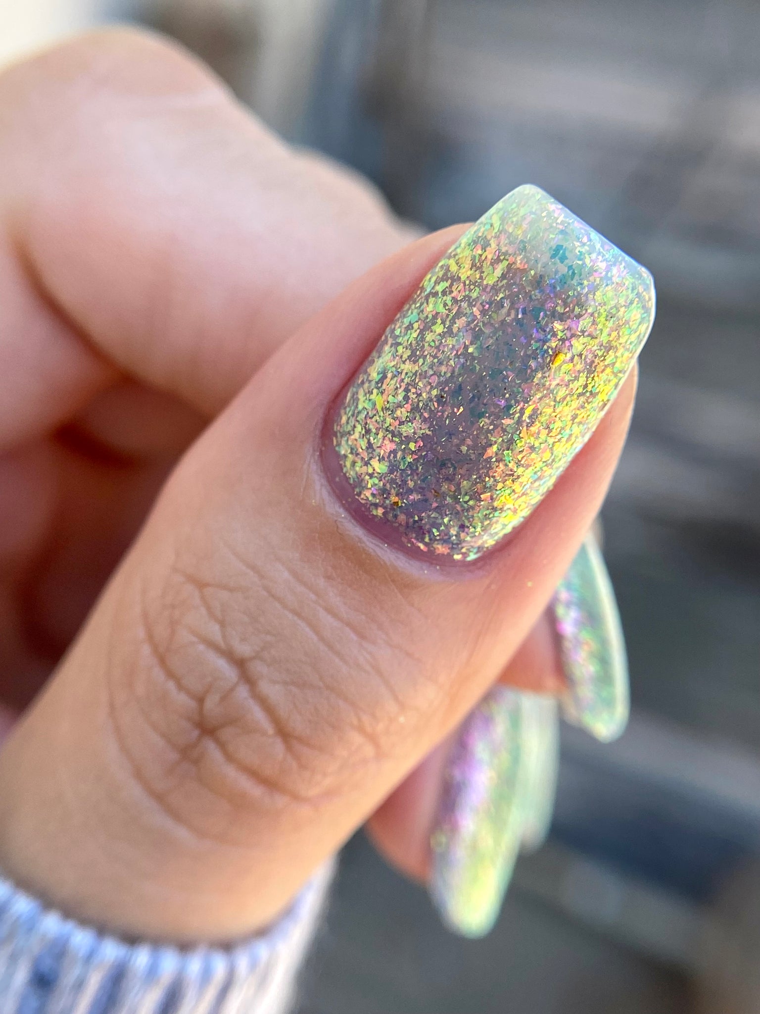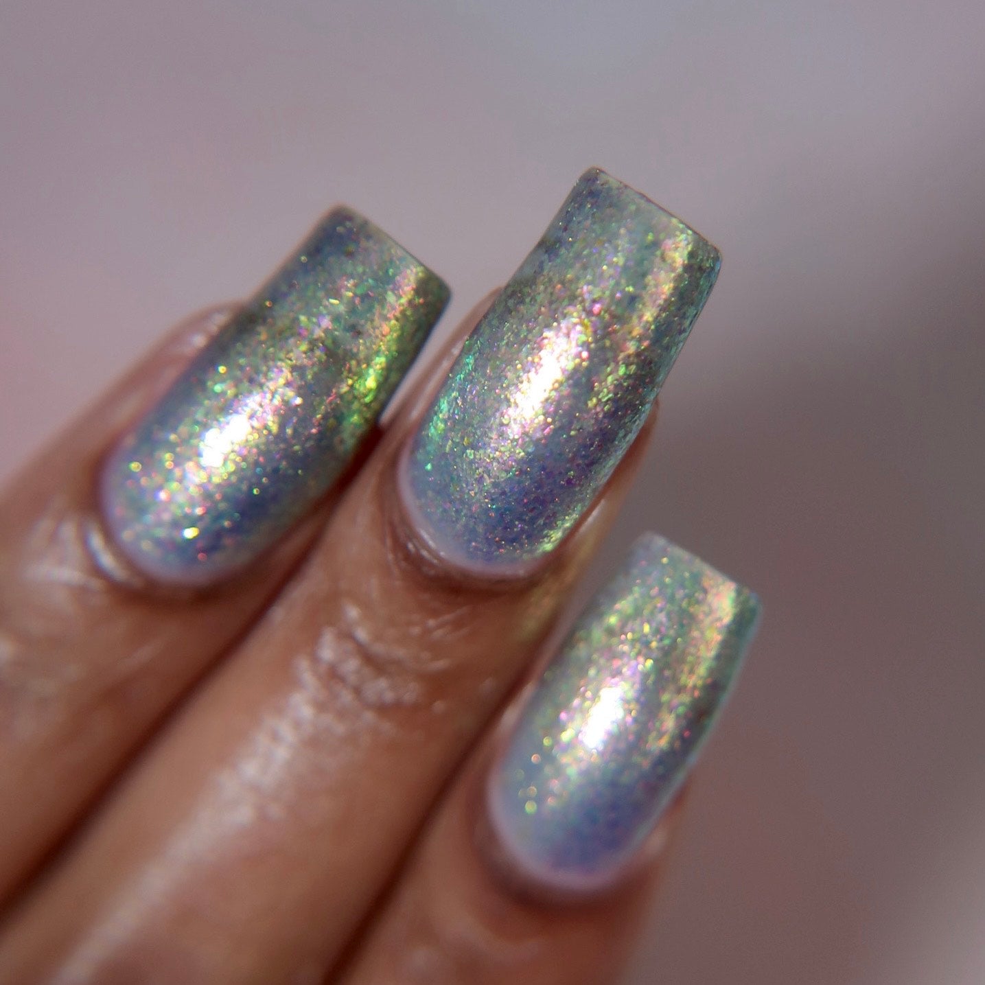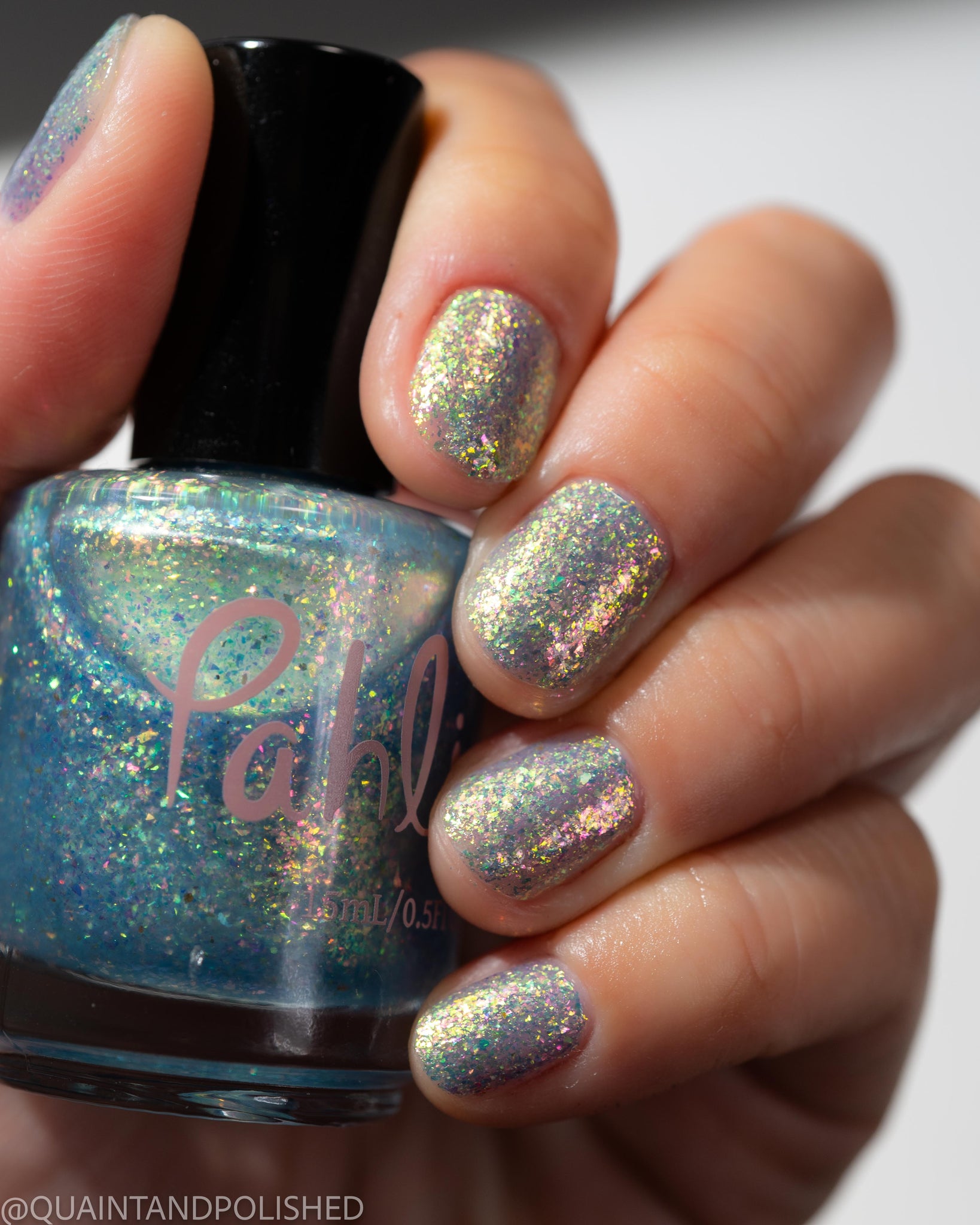 soft cornflower blue with a mix of gold and pink iridescent flakes