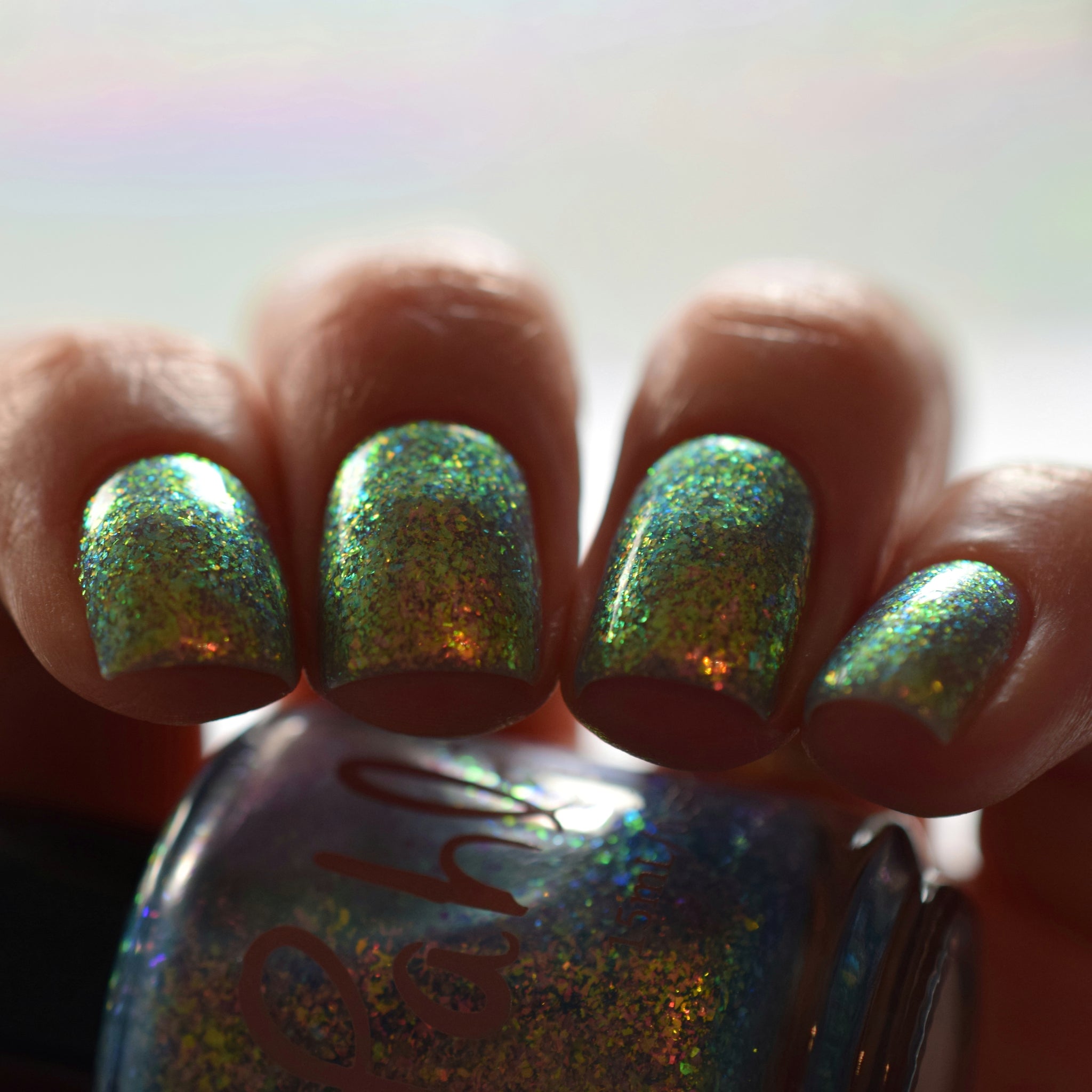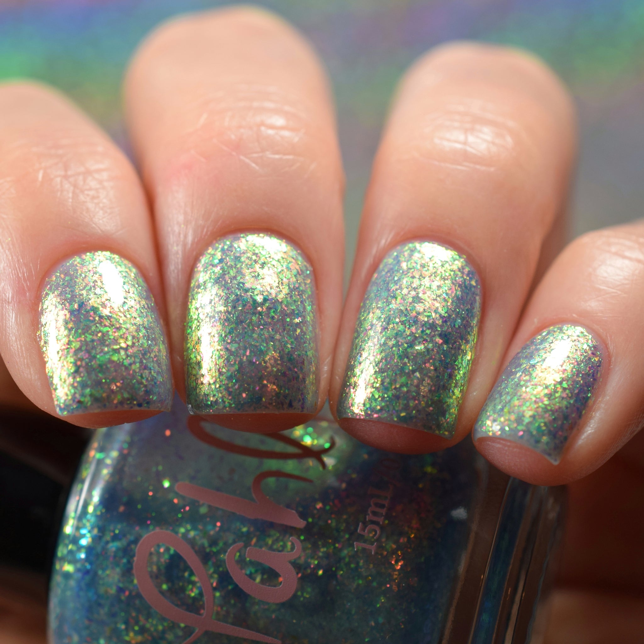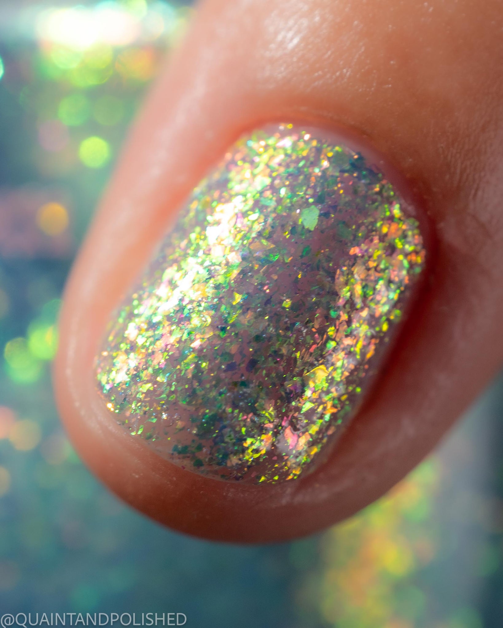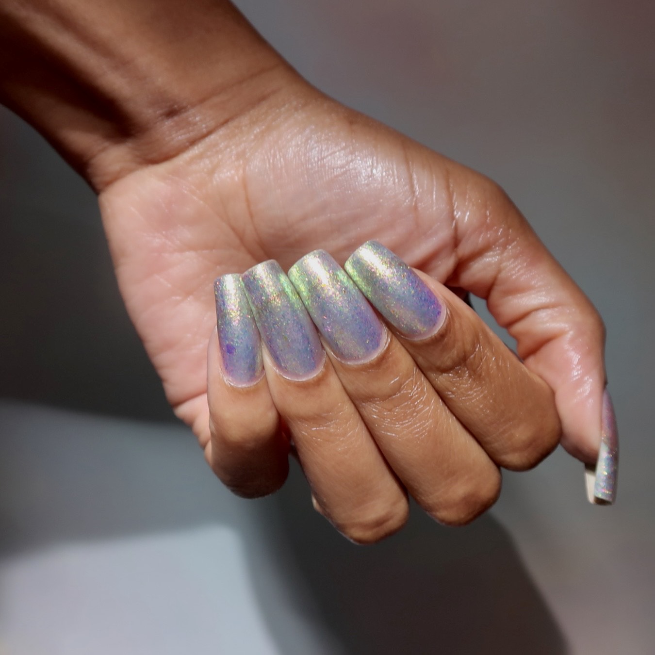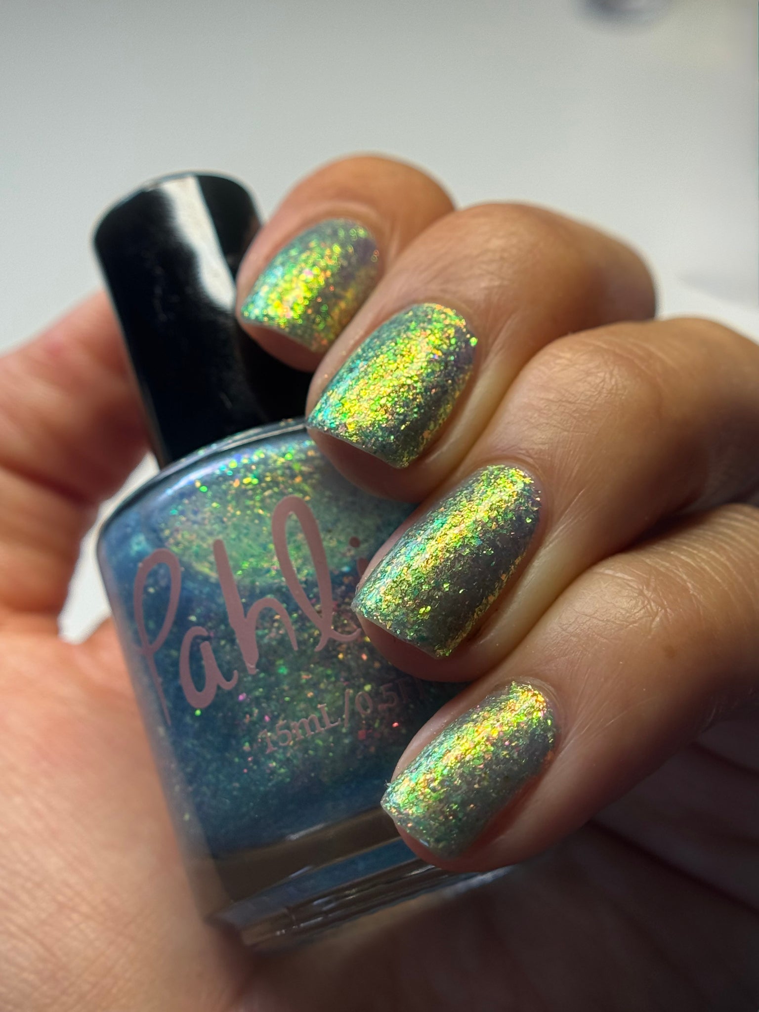 soft cornflower blue with a mix of gold and pink iridescent flakes