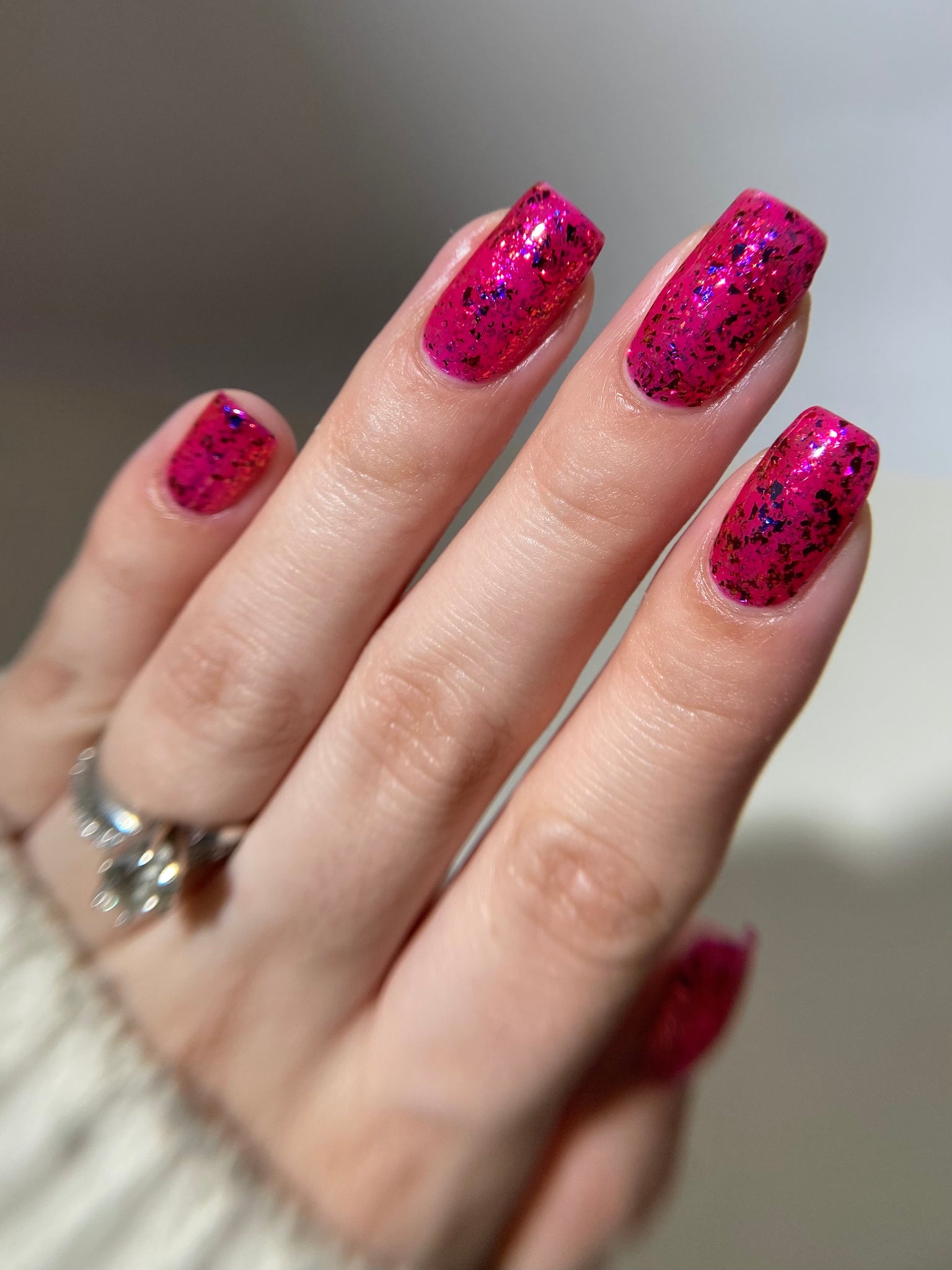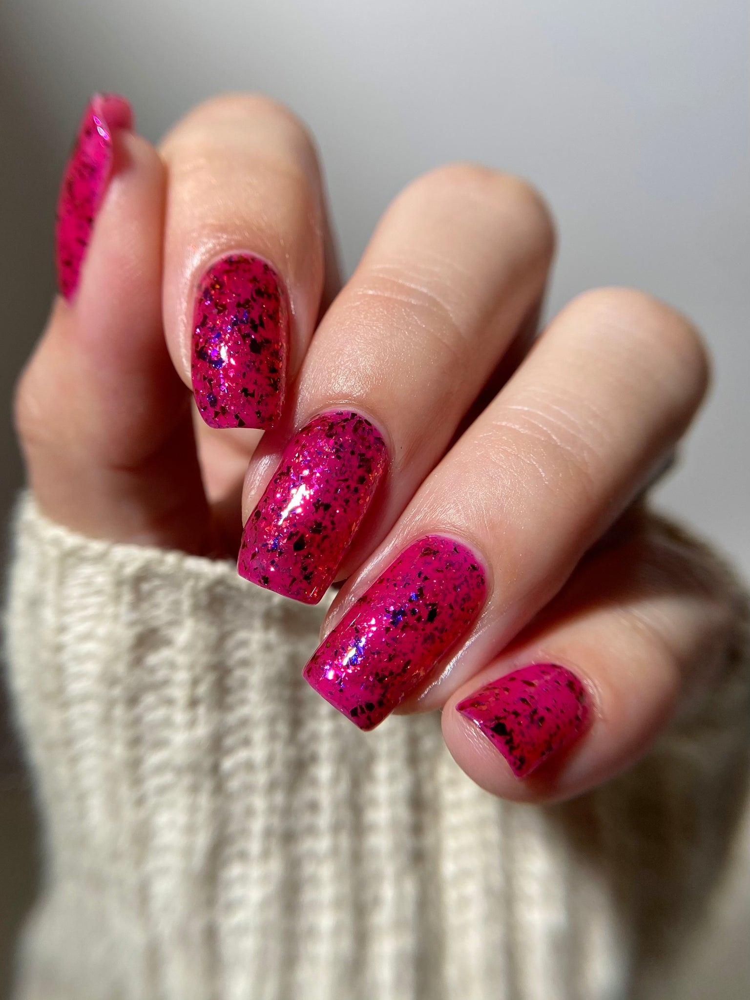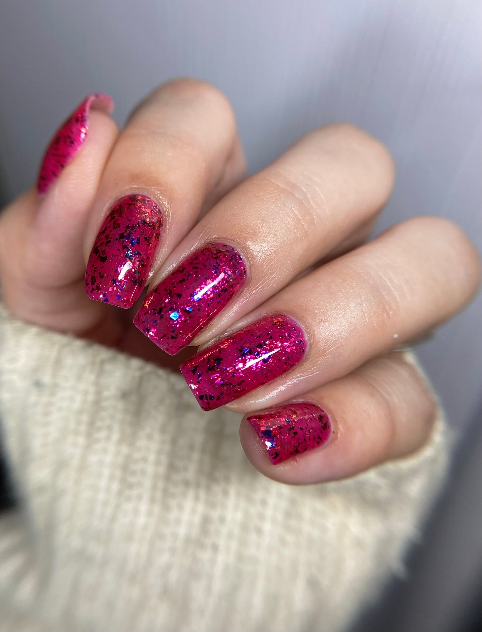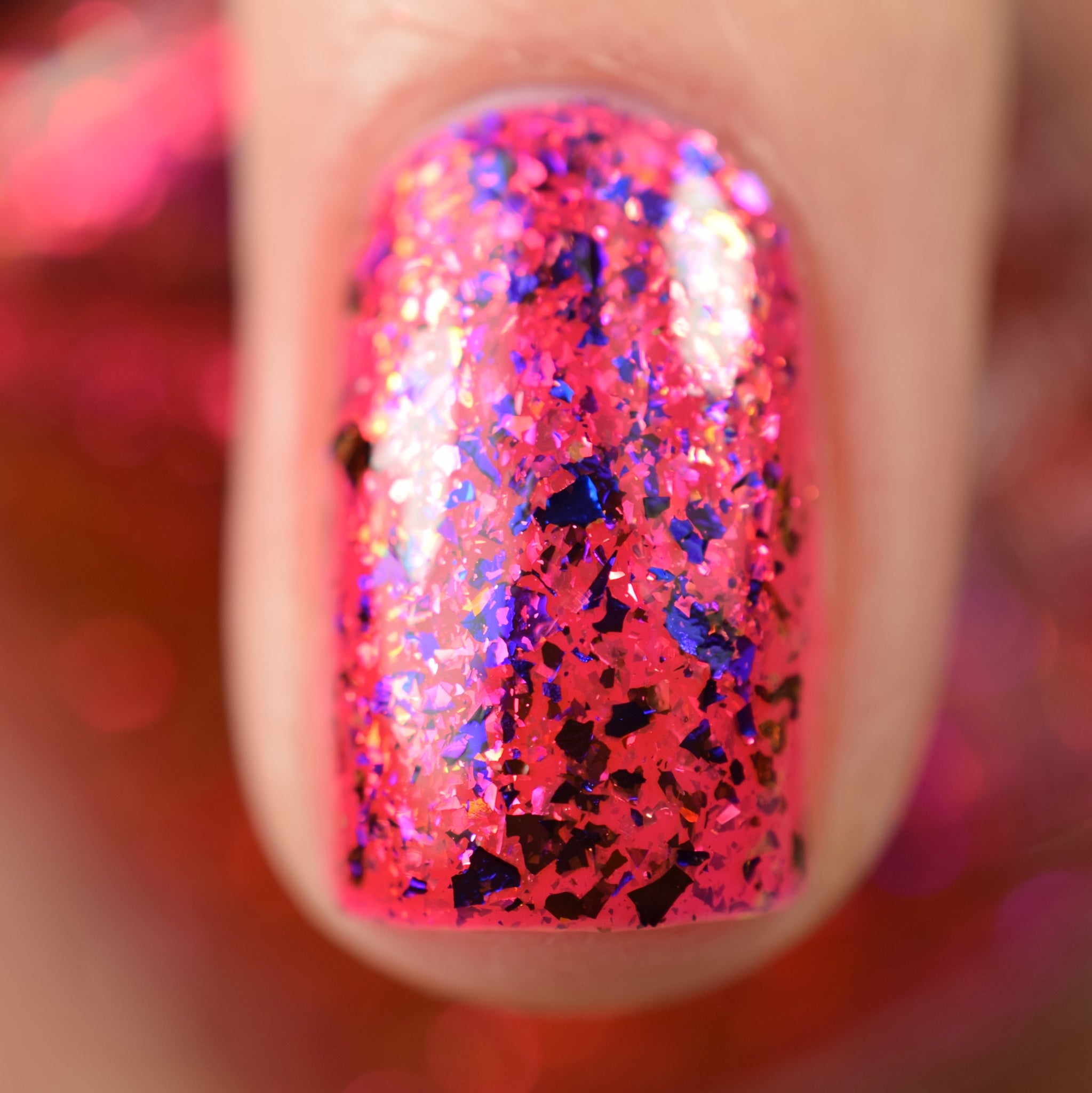 juicy raspberry pink packed with a mix of iridescent pink flakes and blue/pink metallic multichrome flakes