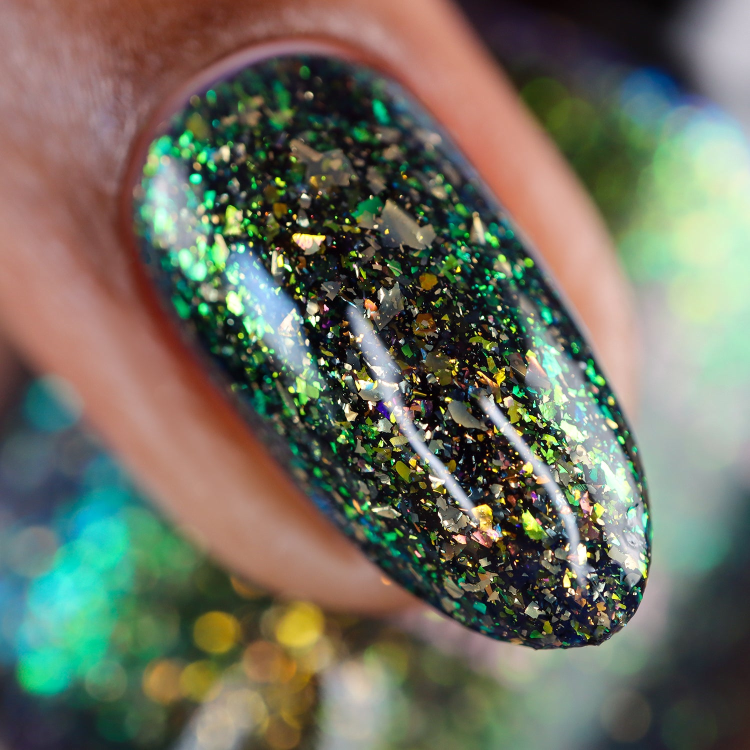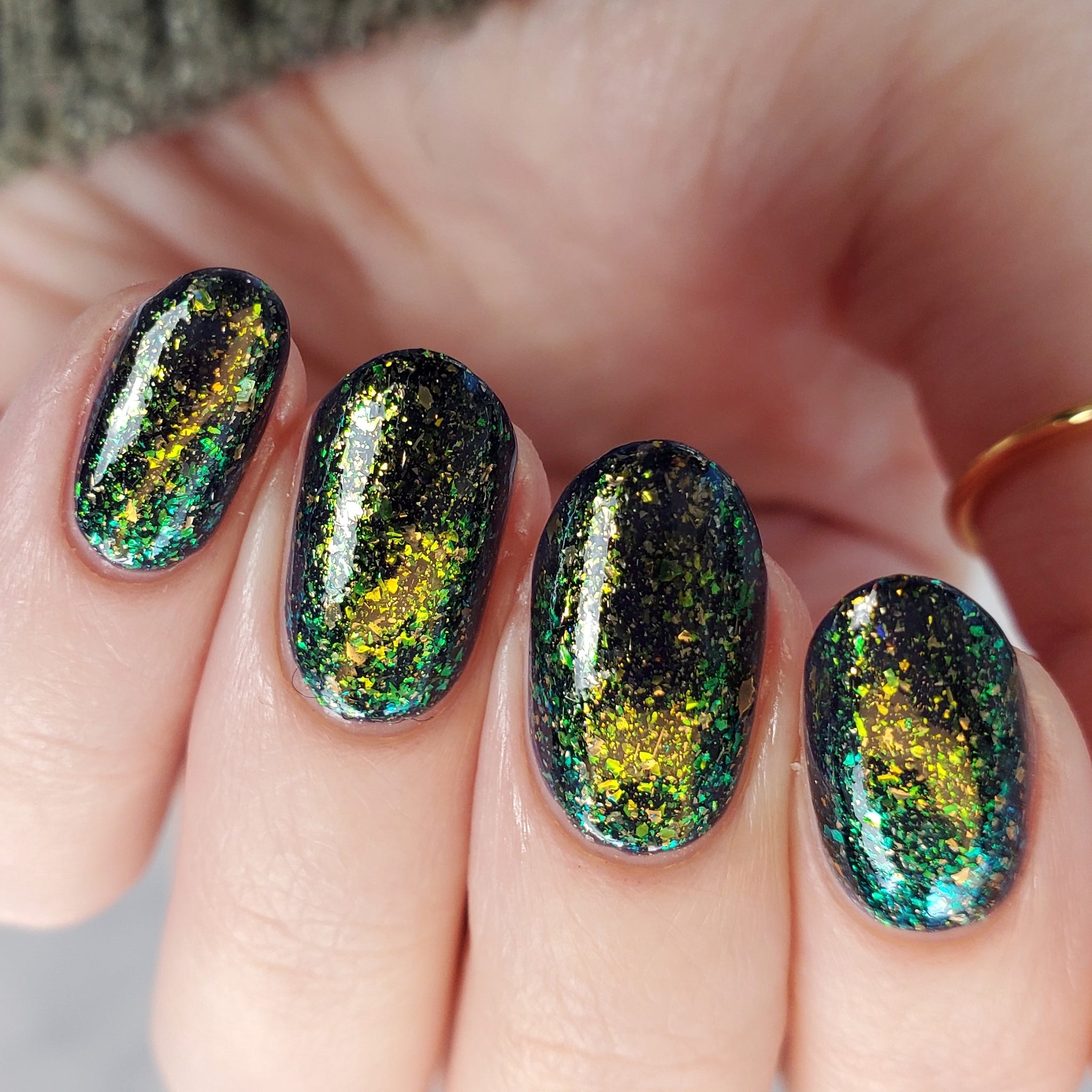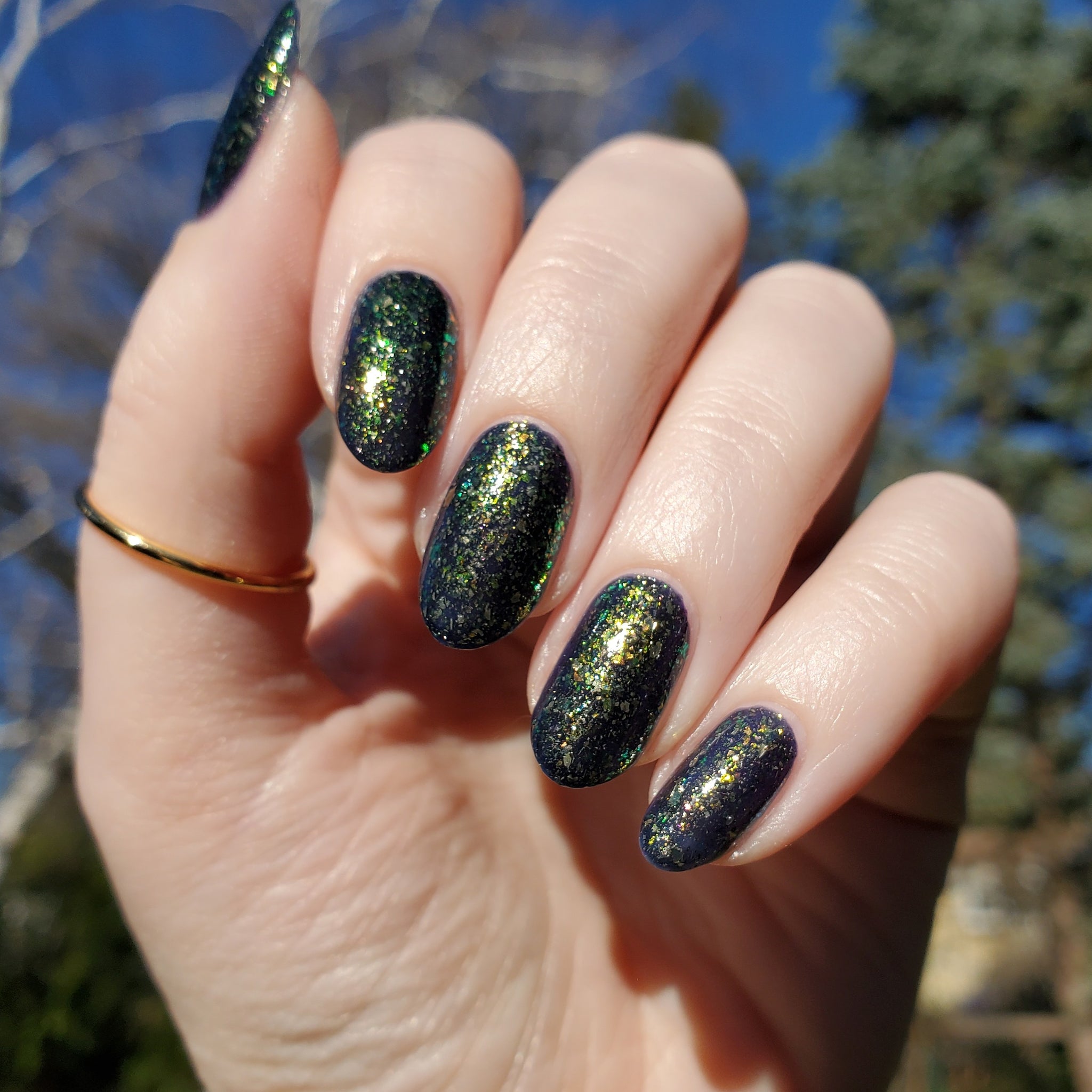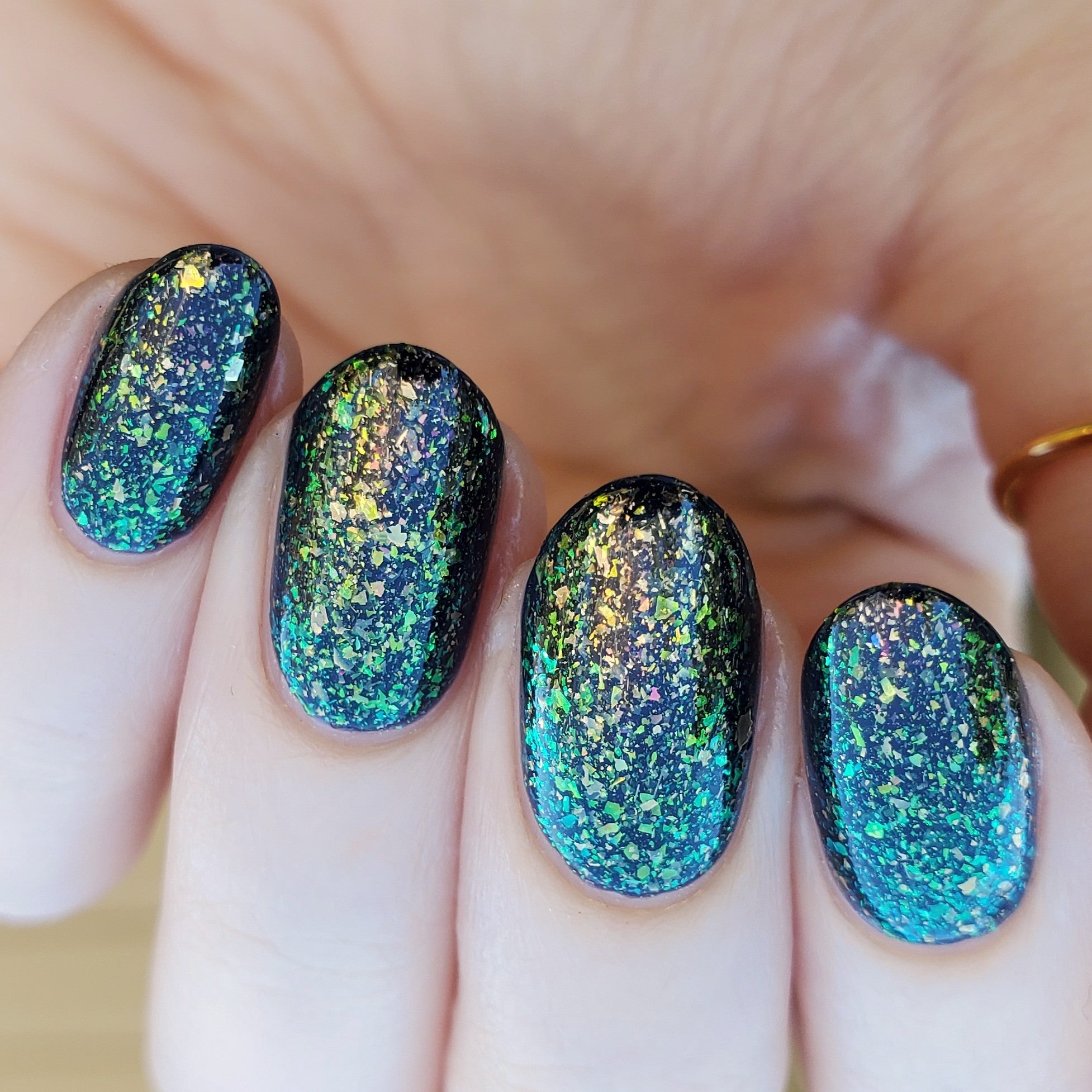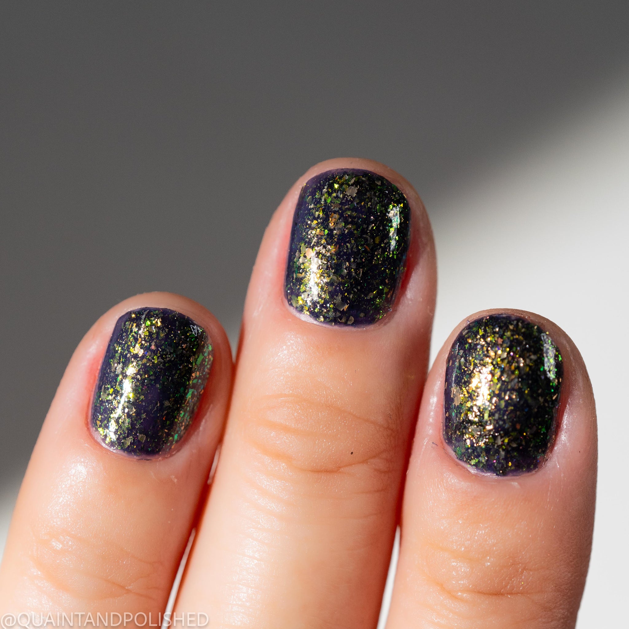 dramatic indigo blue base with a mix of metallic gold and iridescent gold/green flakes