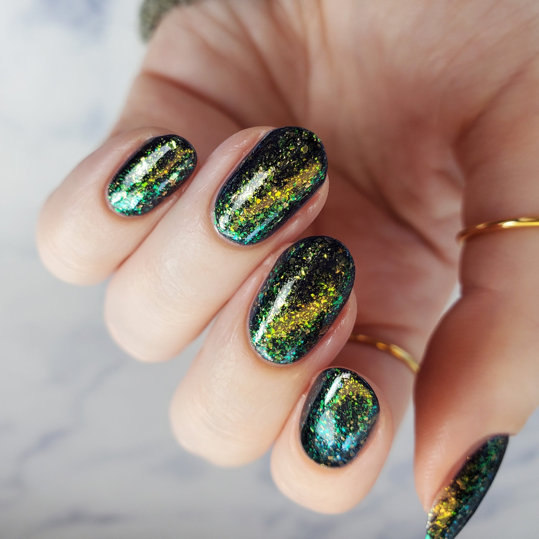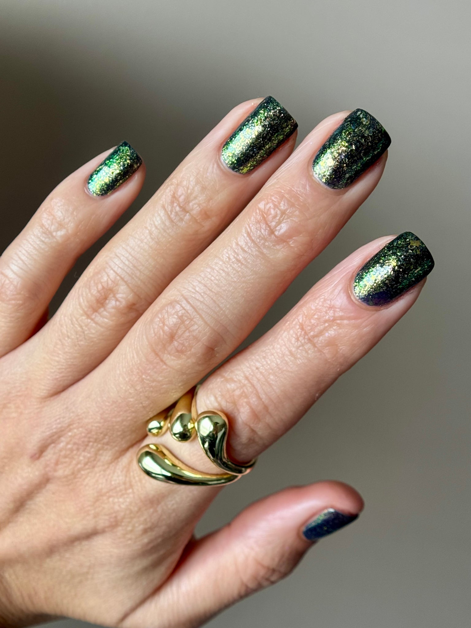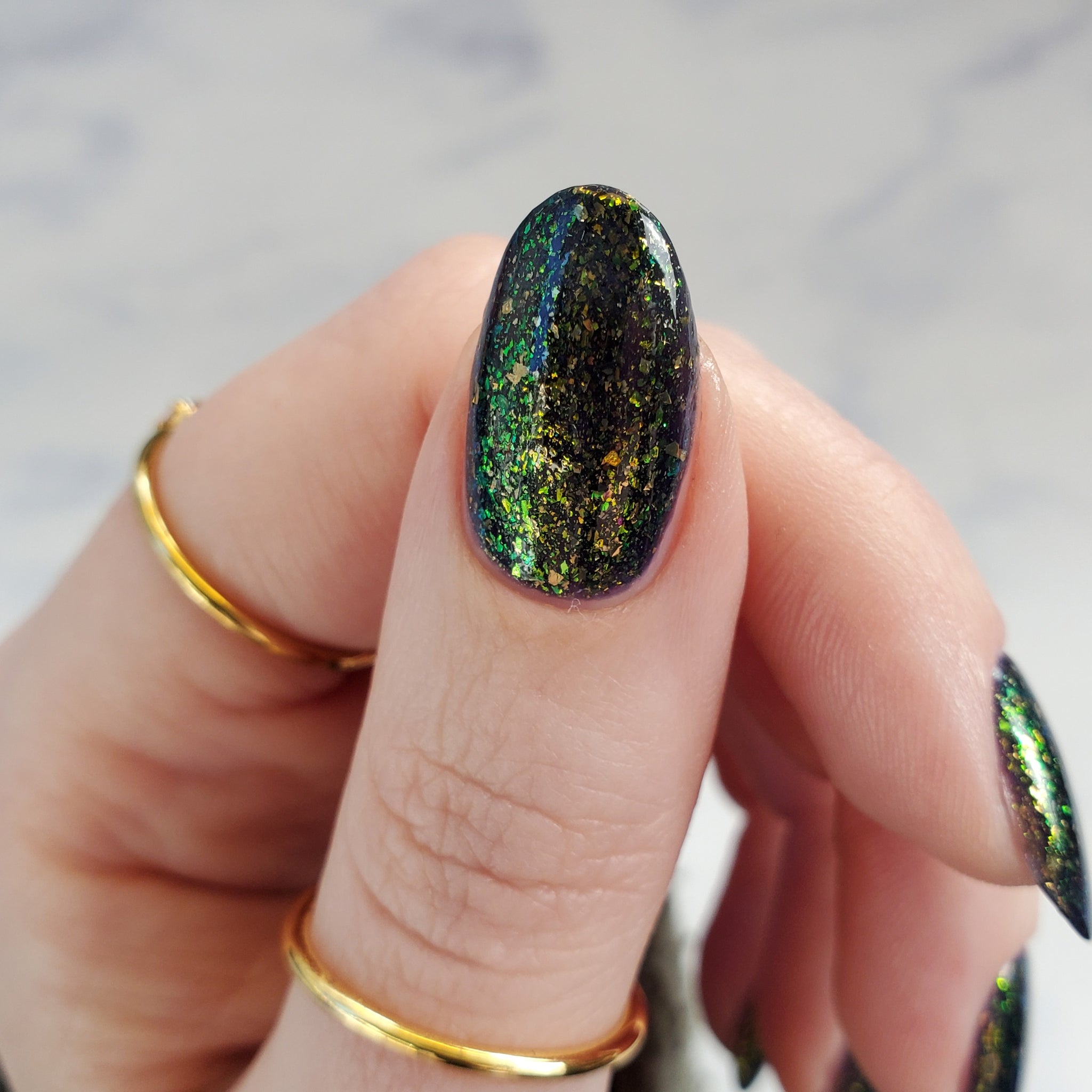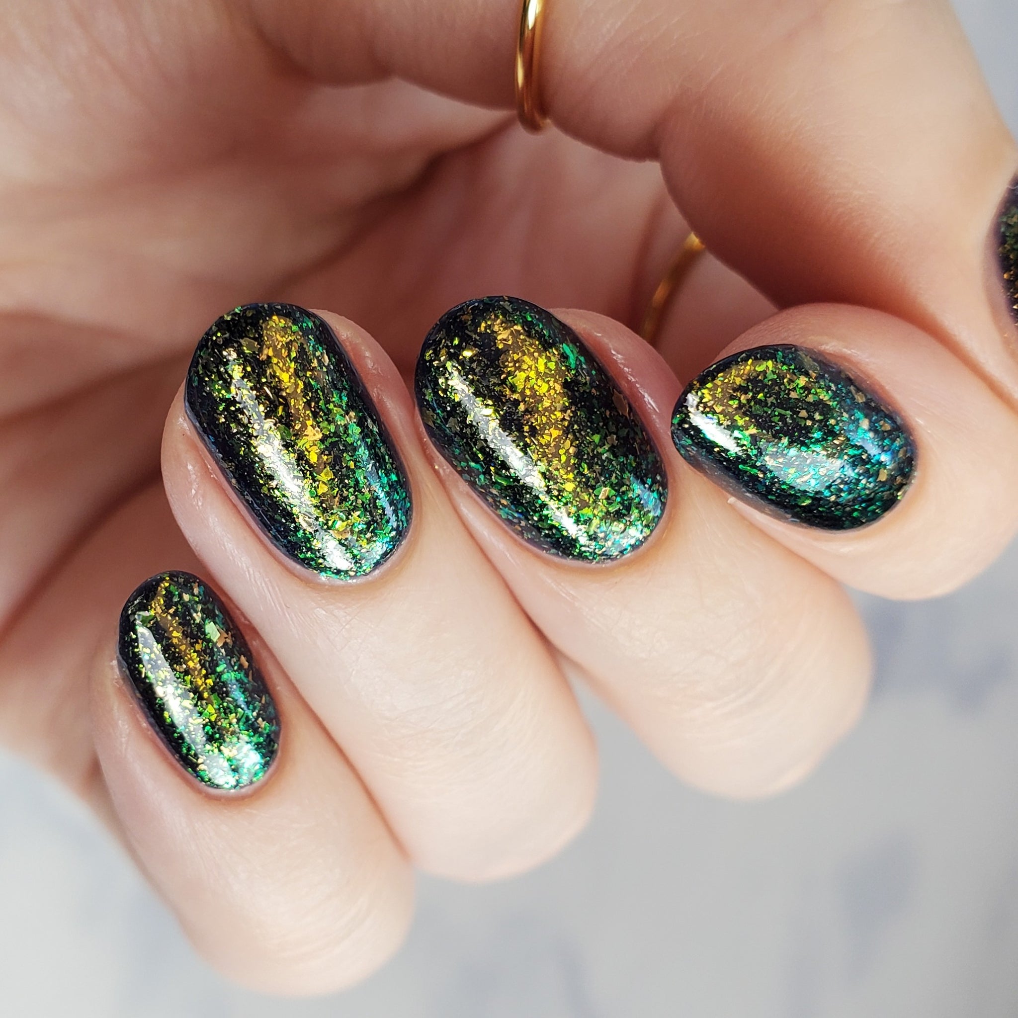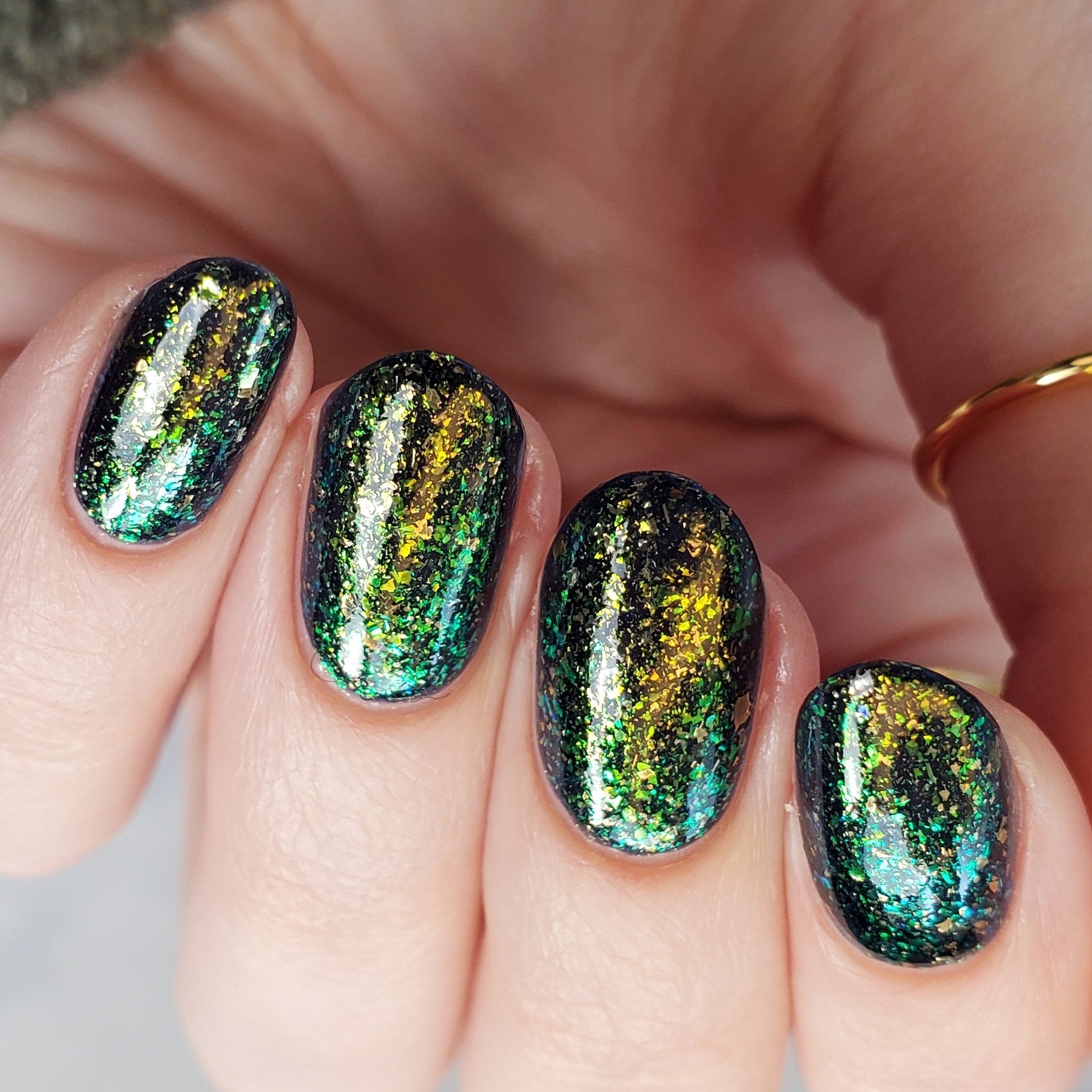 dramatic indigo blue base with a mix of metallic gold and iridescent gold/green flakes