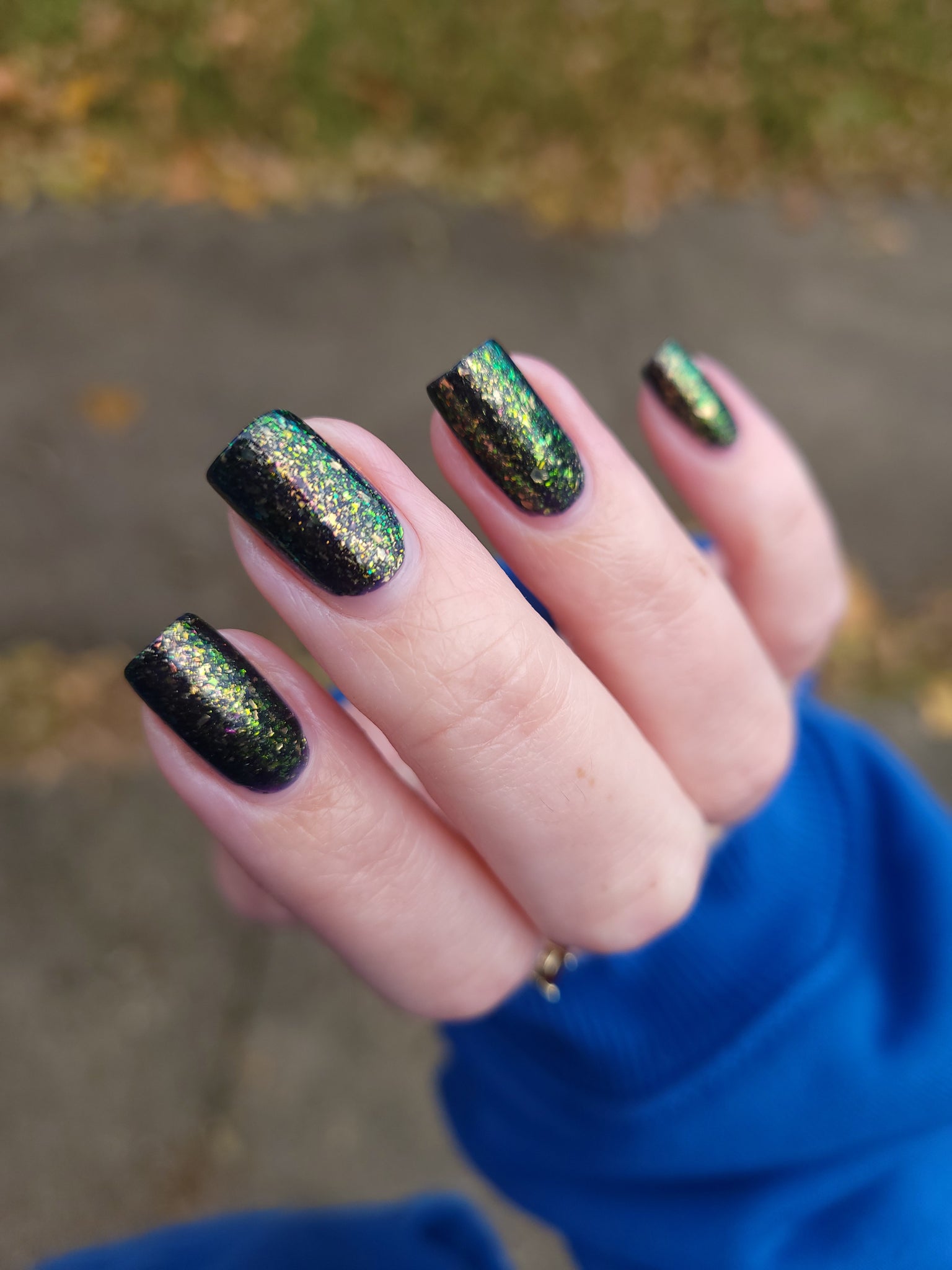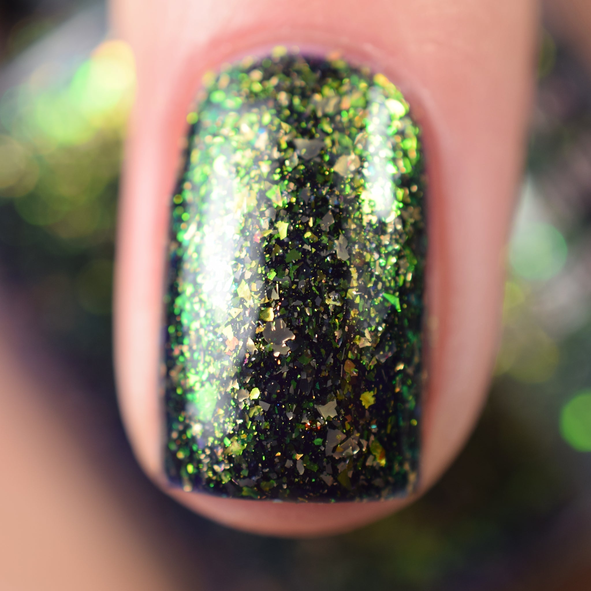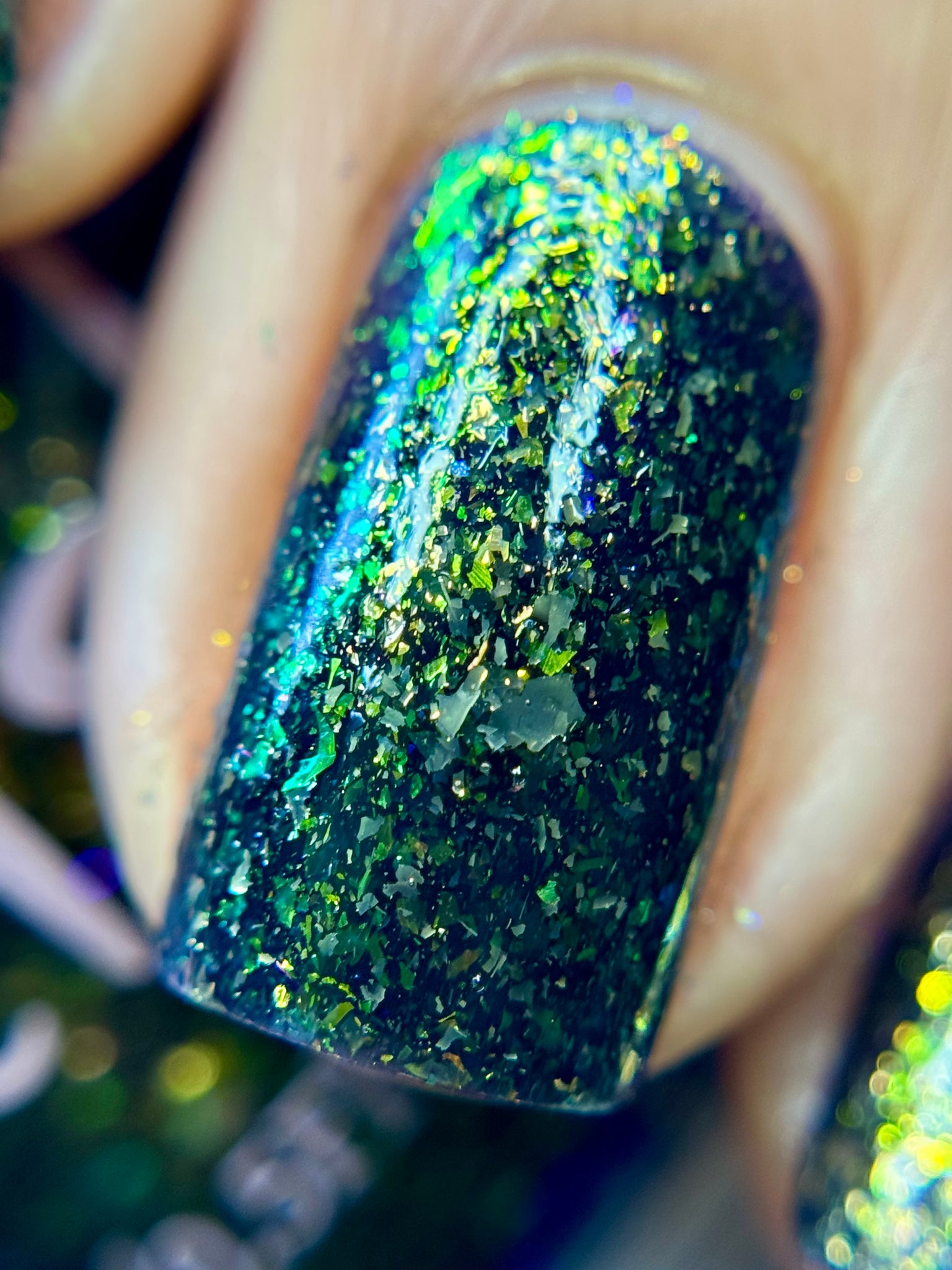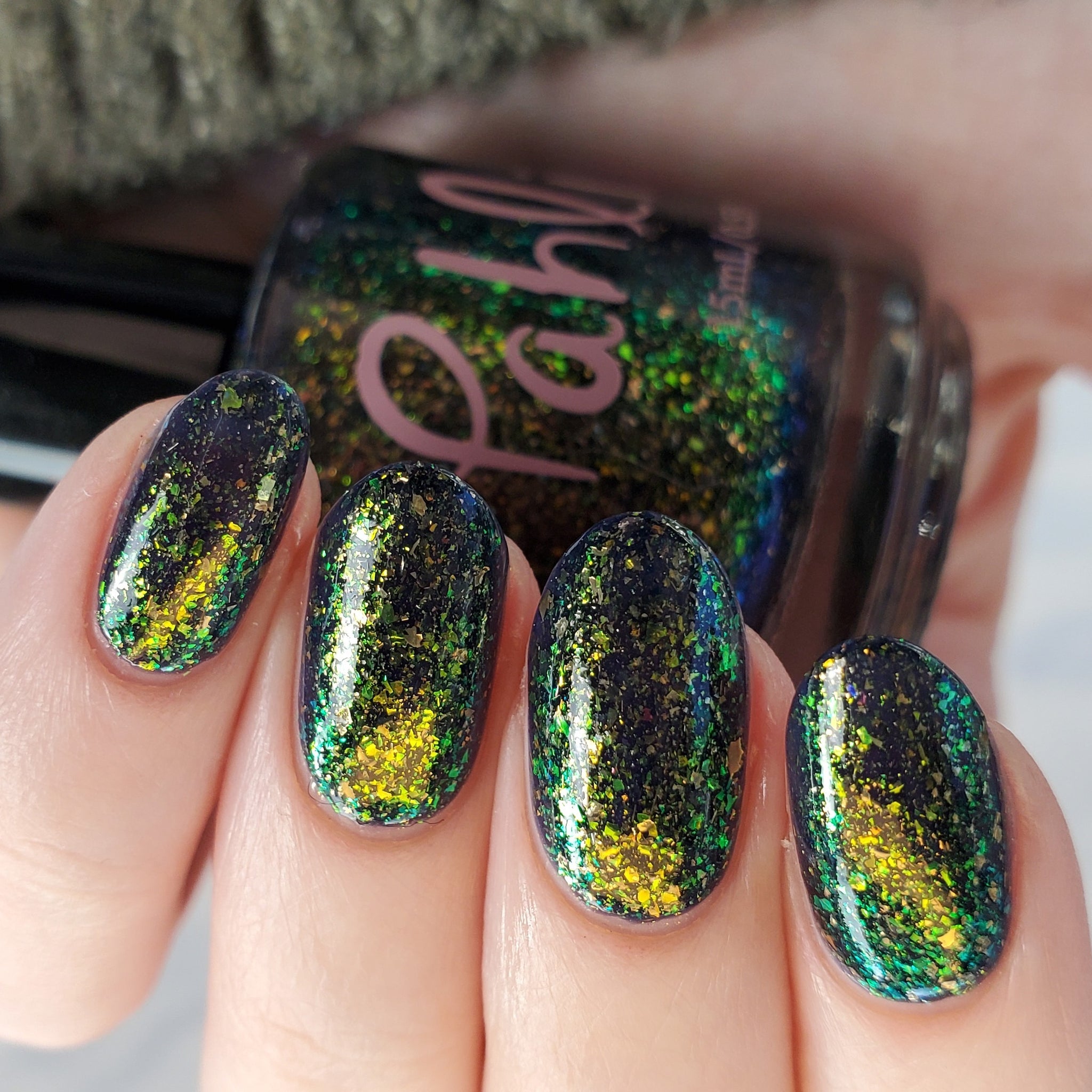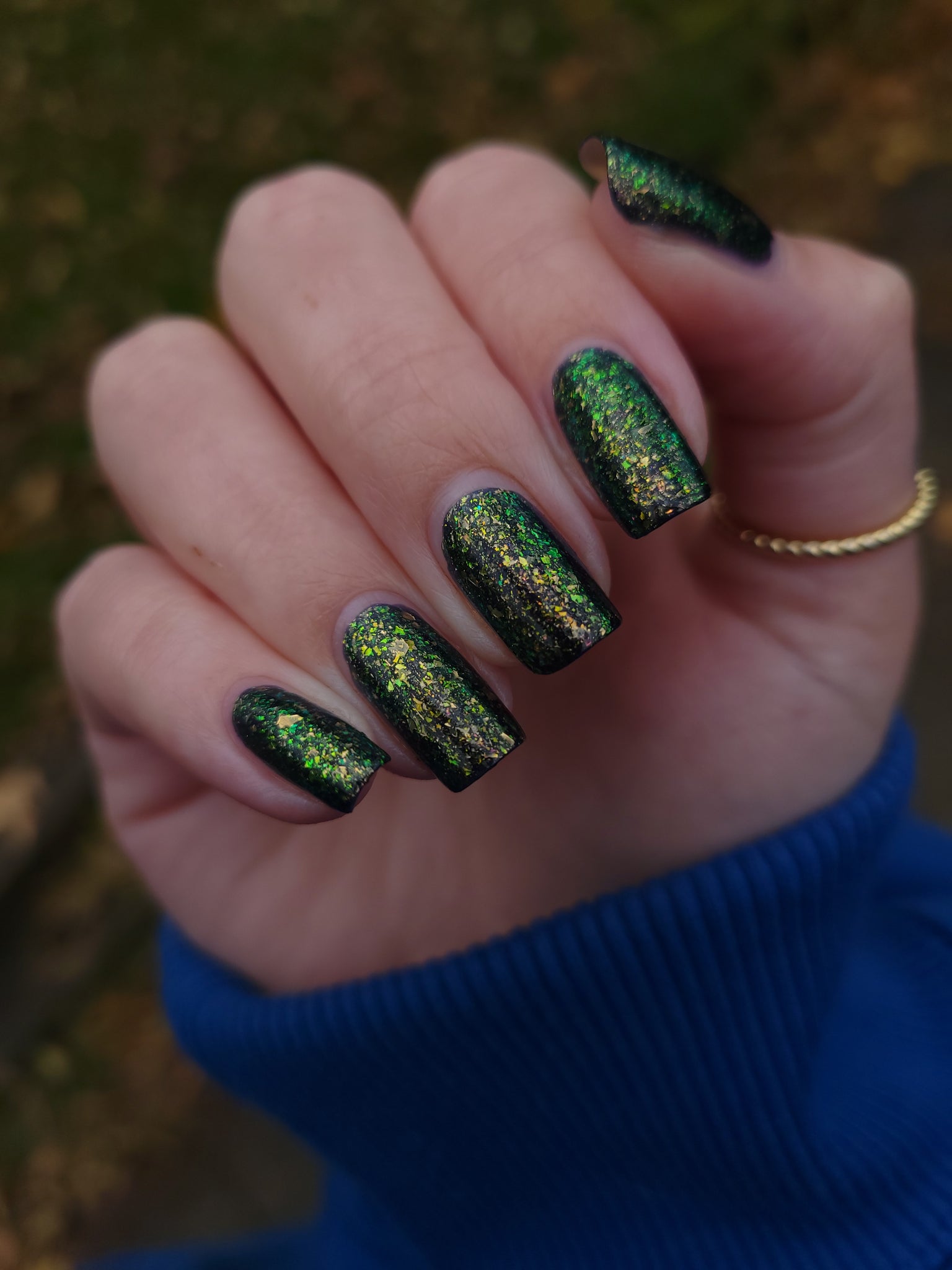 dramatic indigo blue base with a mix of metallic gold and iridescent gold/green flakes