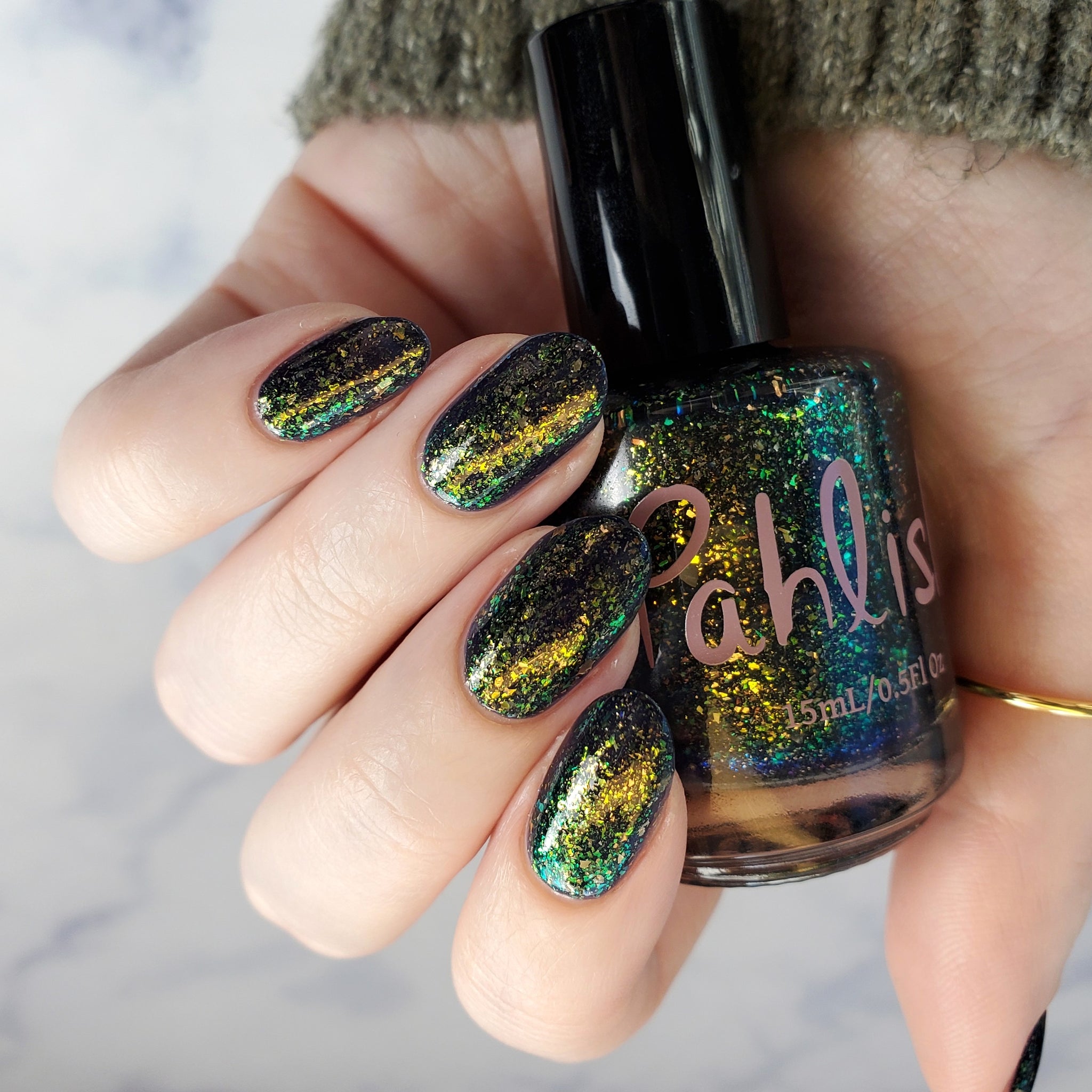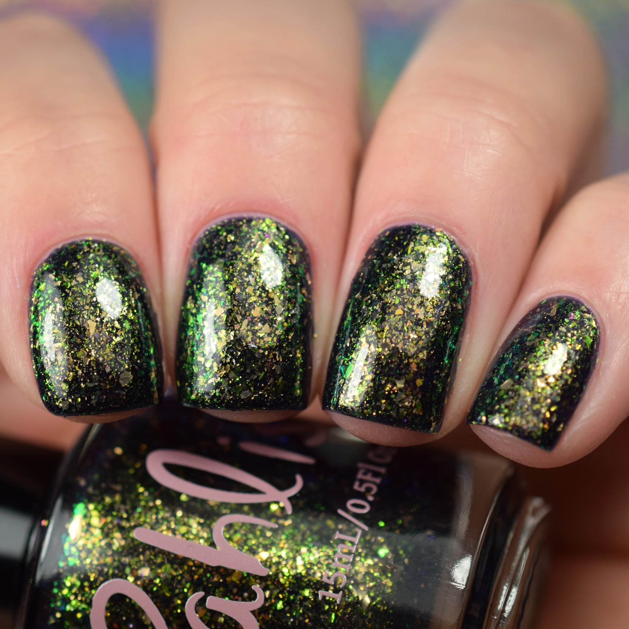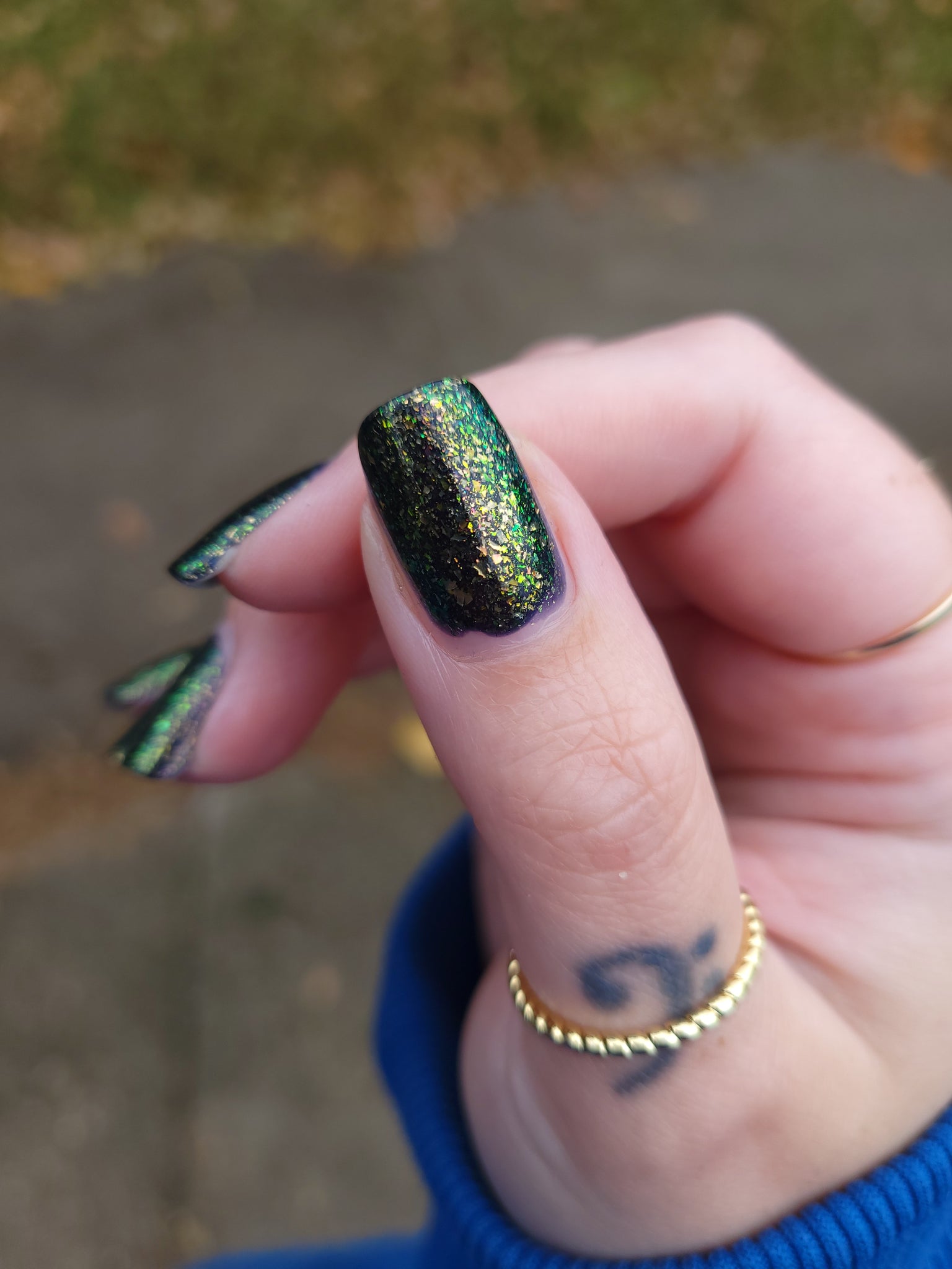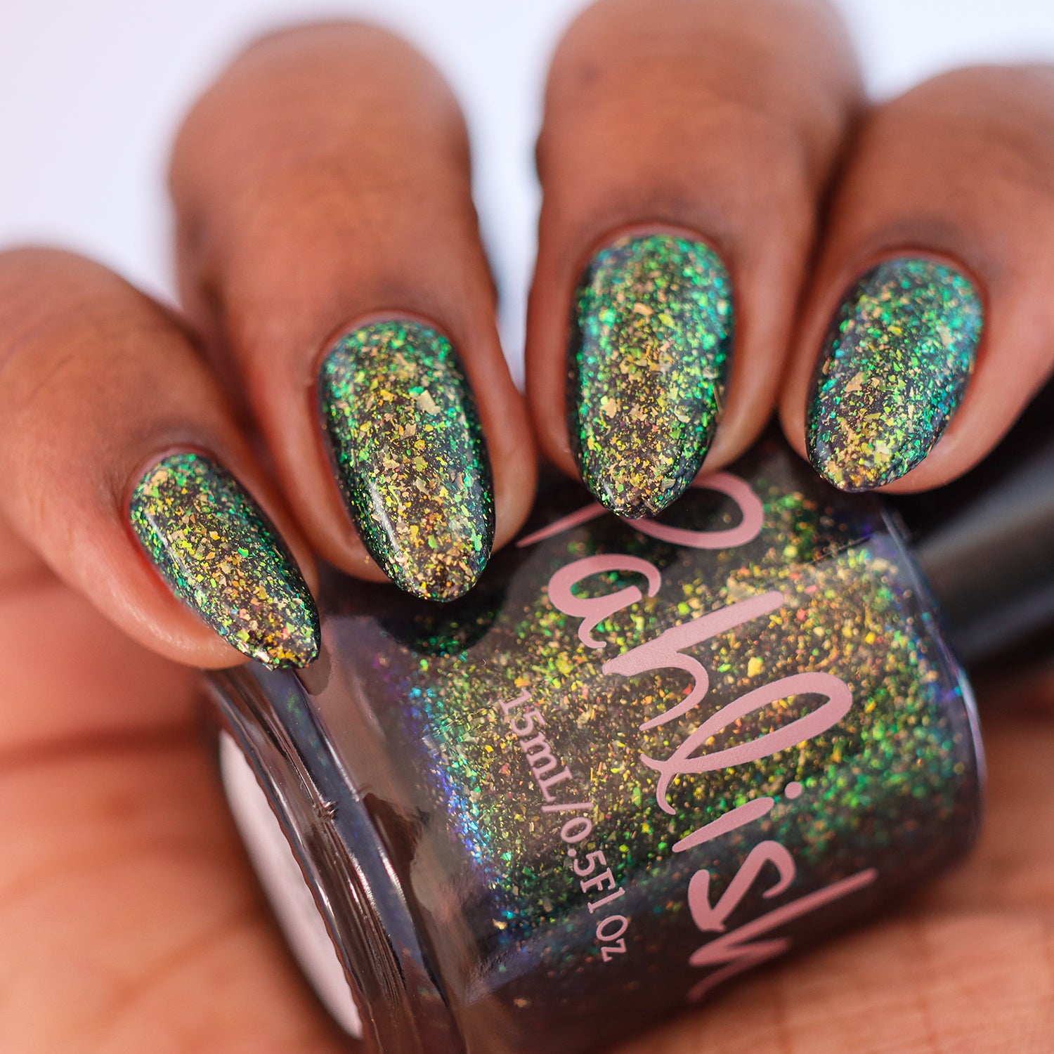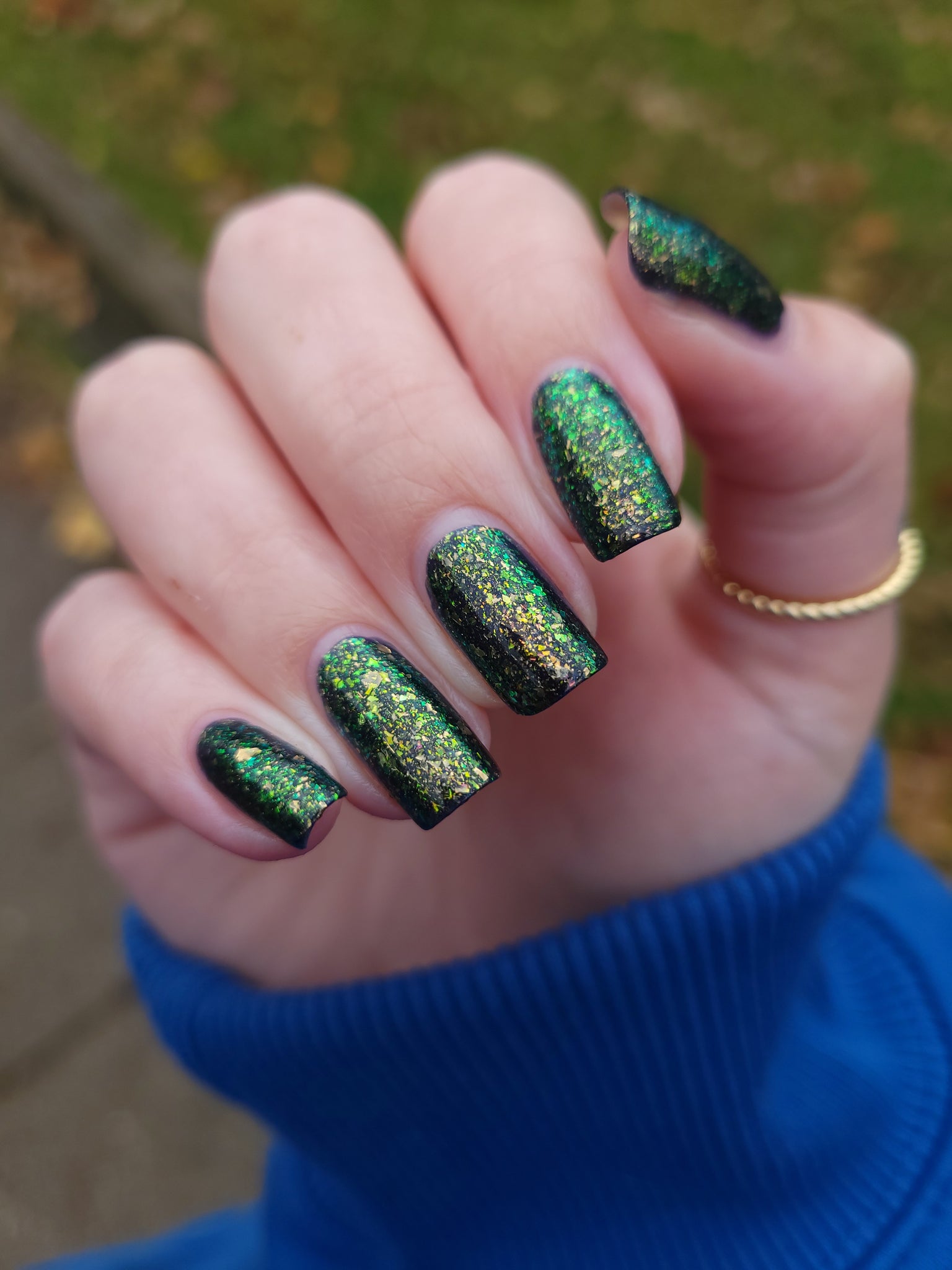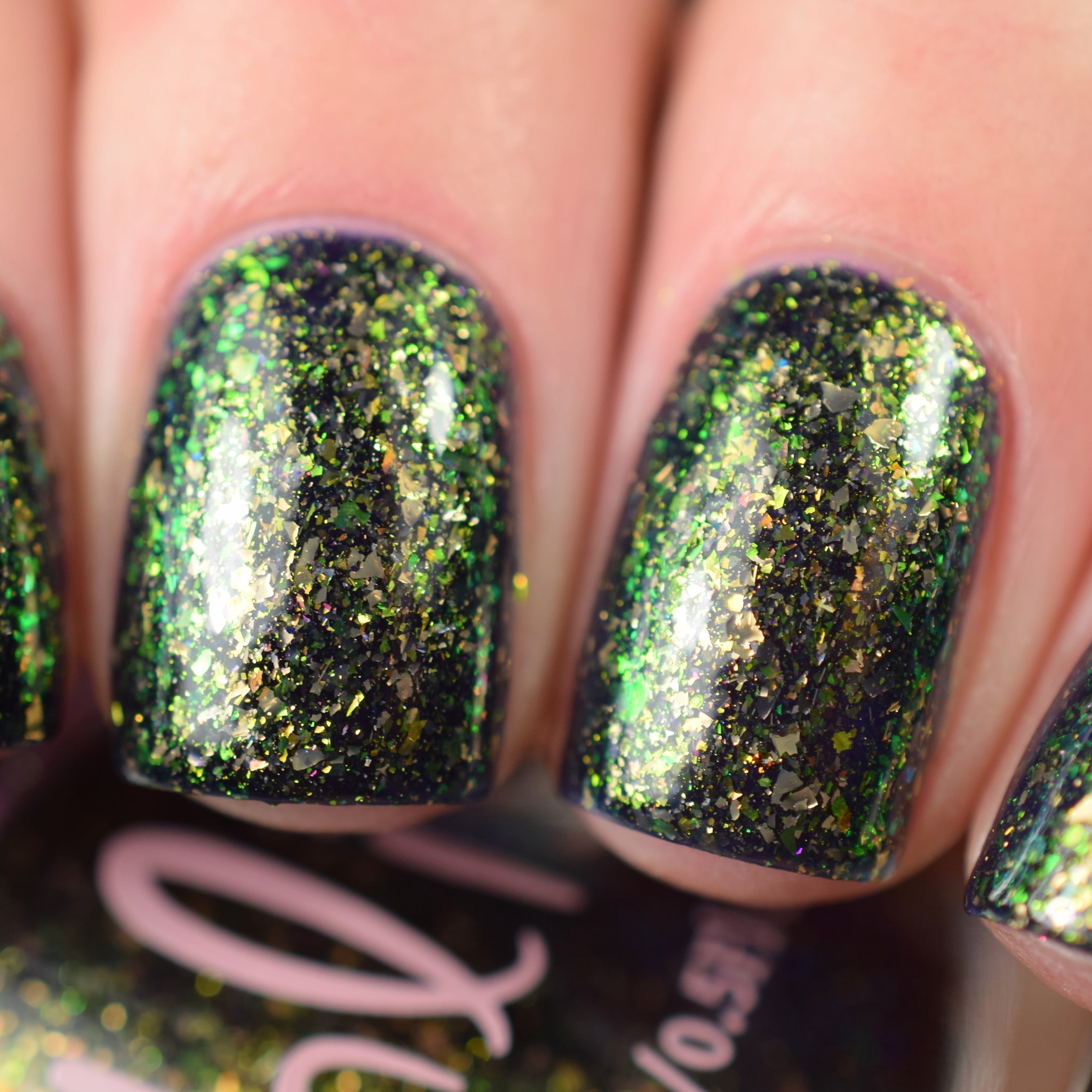 dramatic indigo blue base with a mix of metallic gold and iridescent gold/green flakes