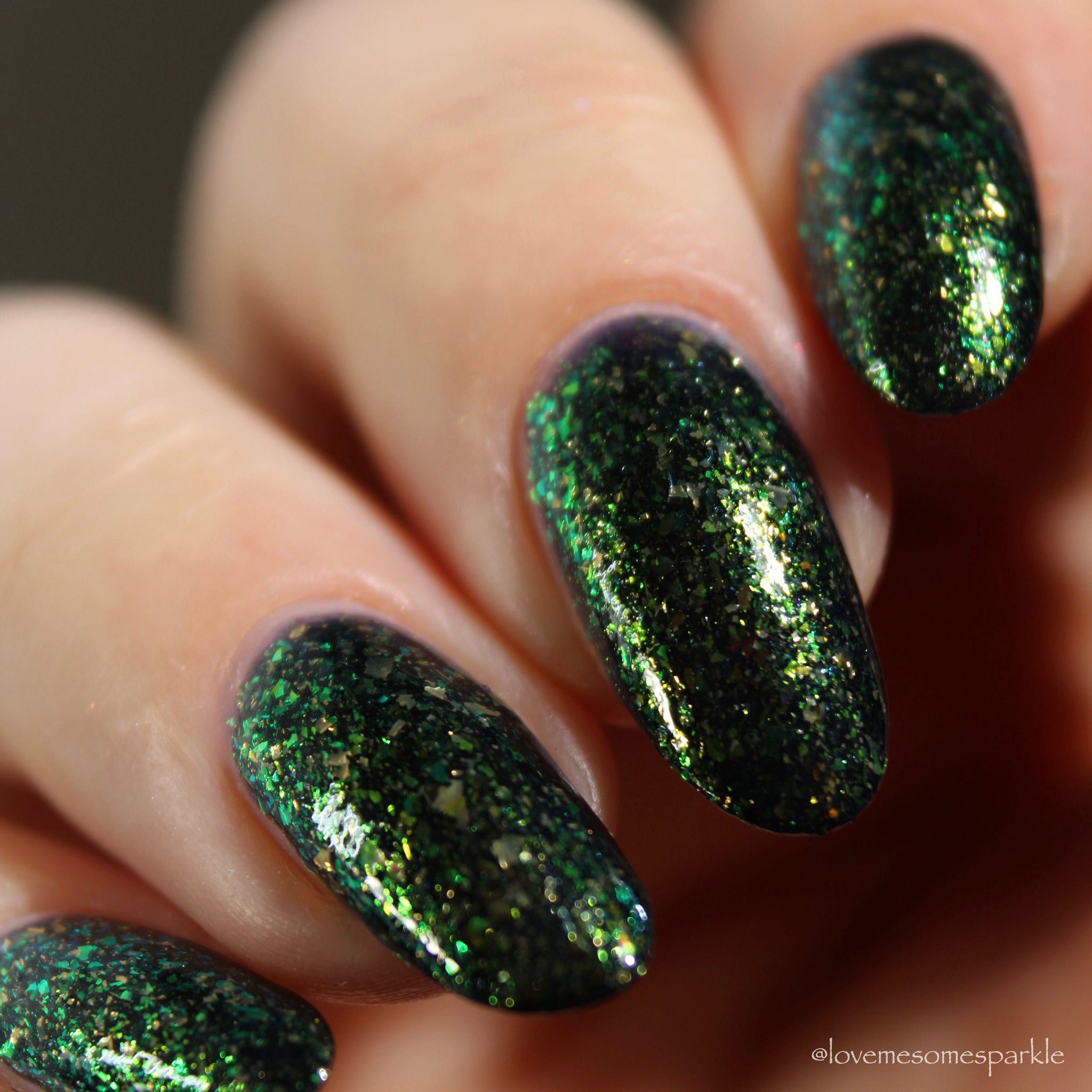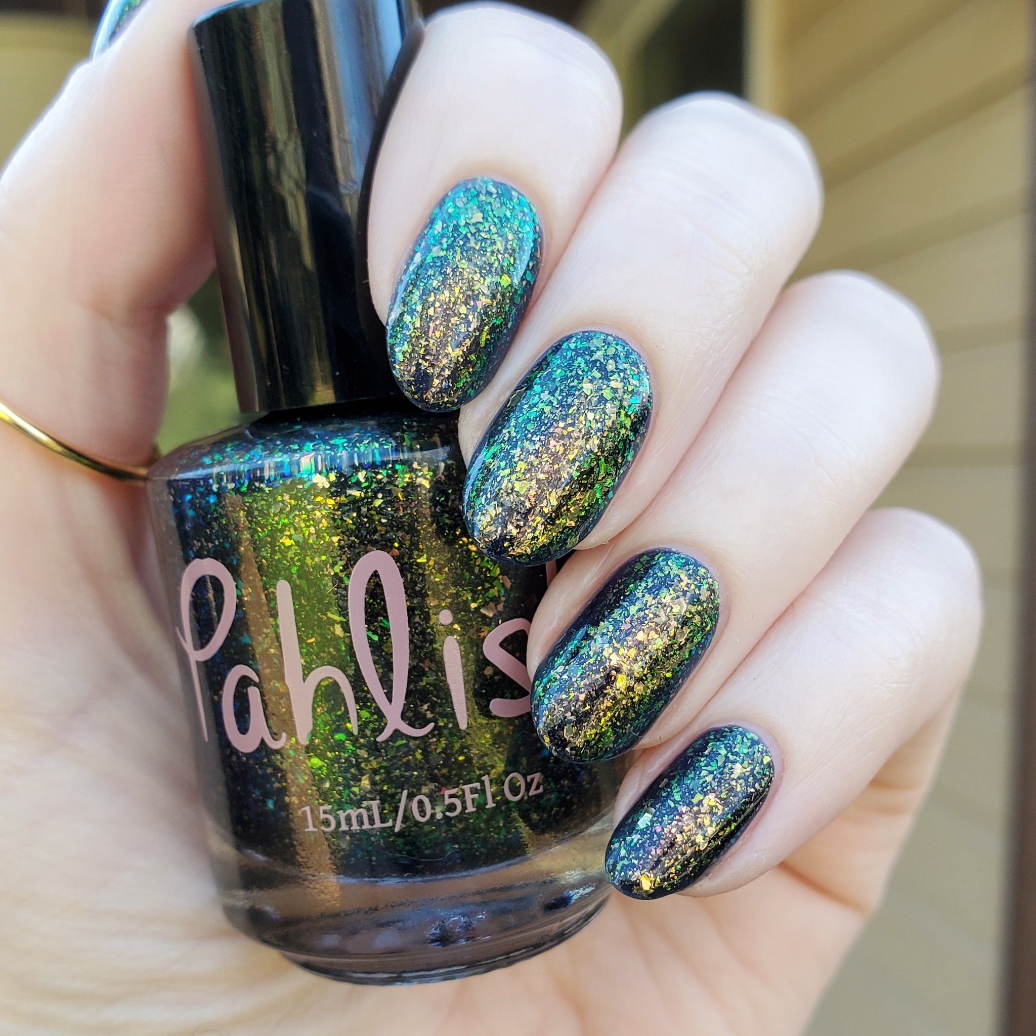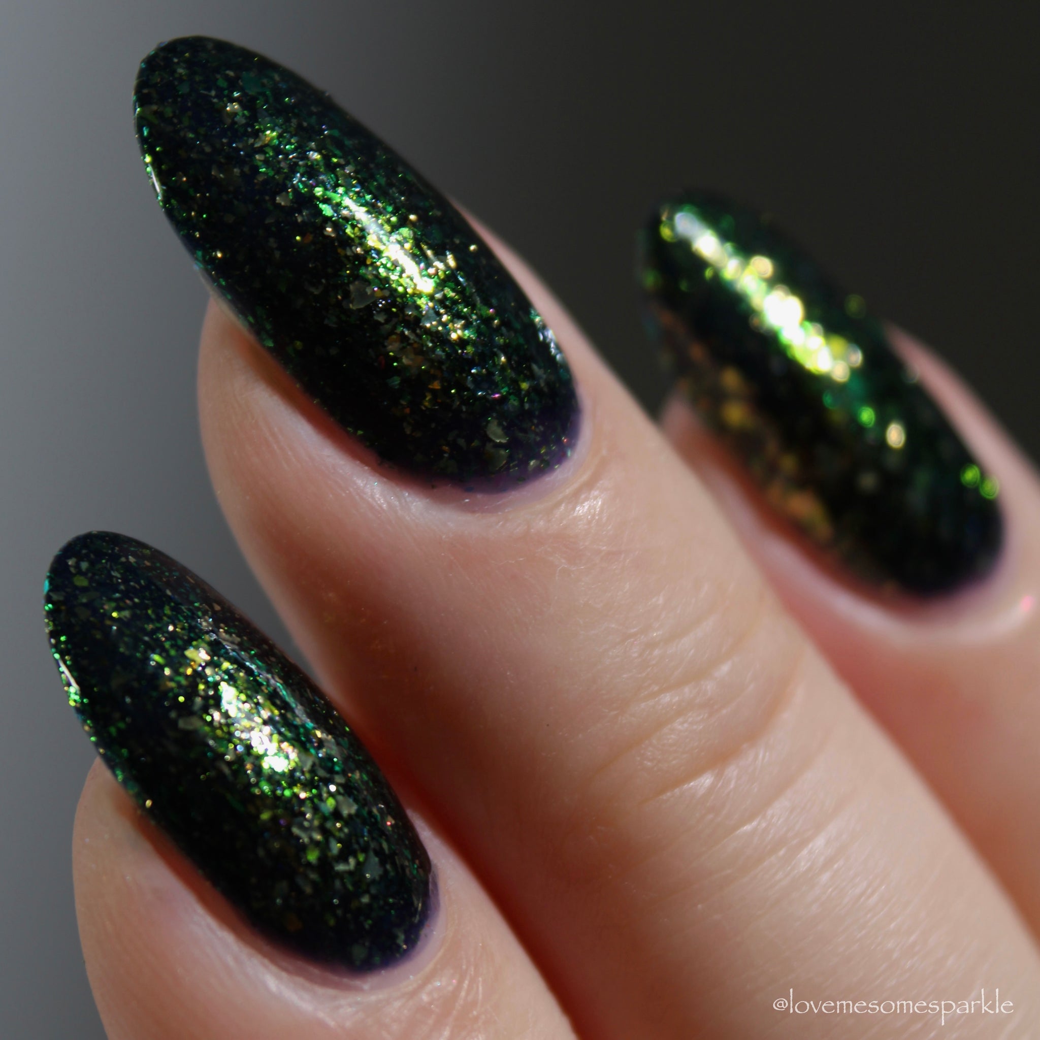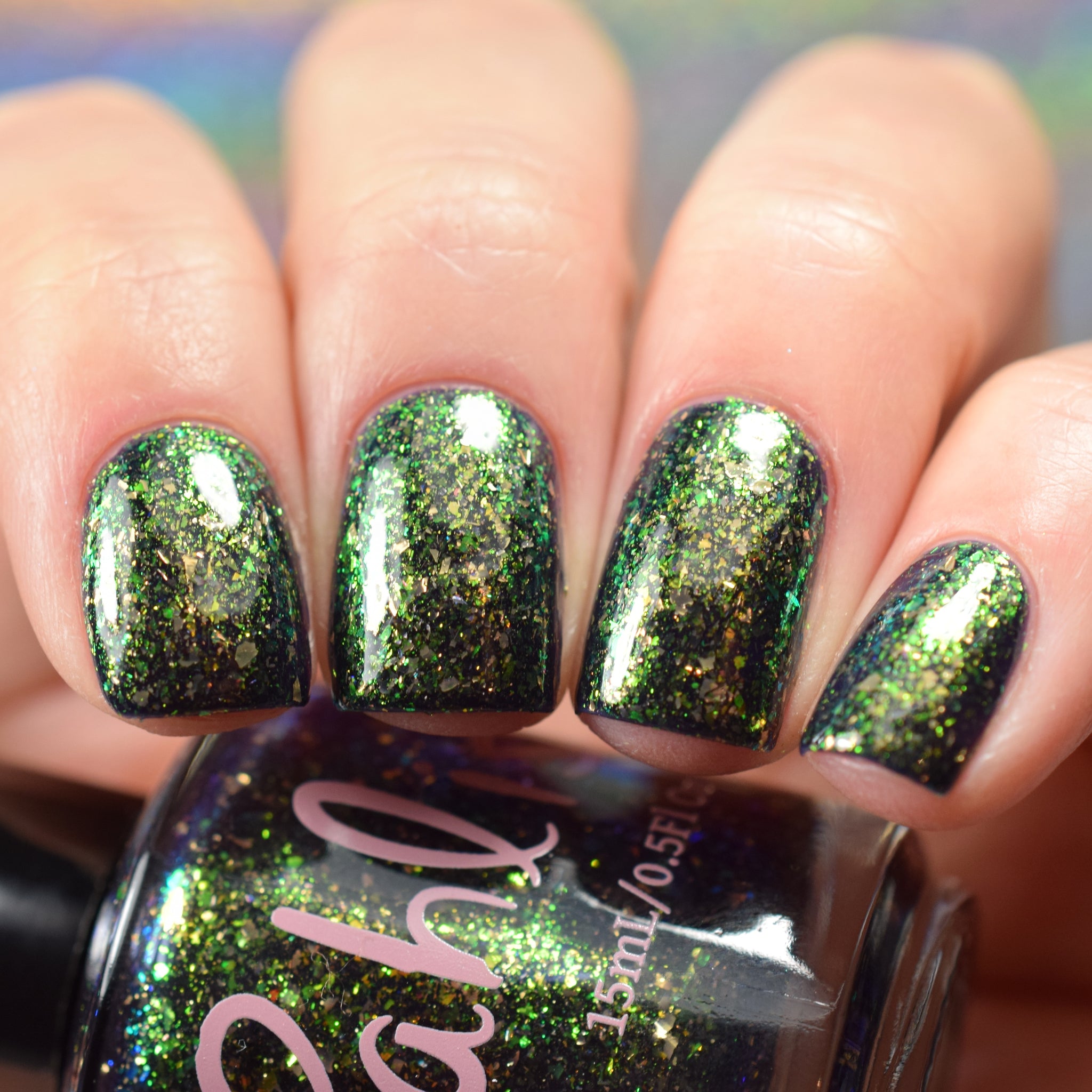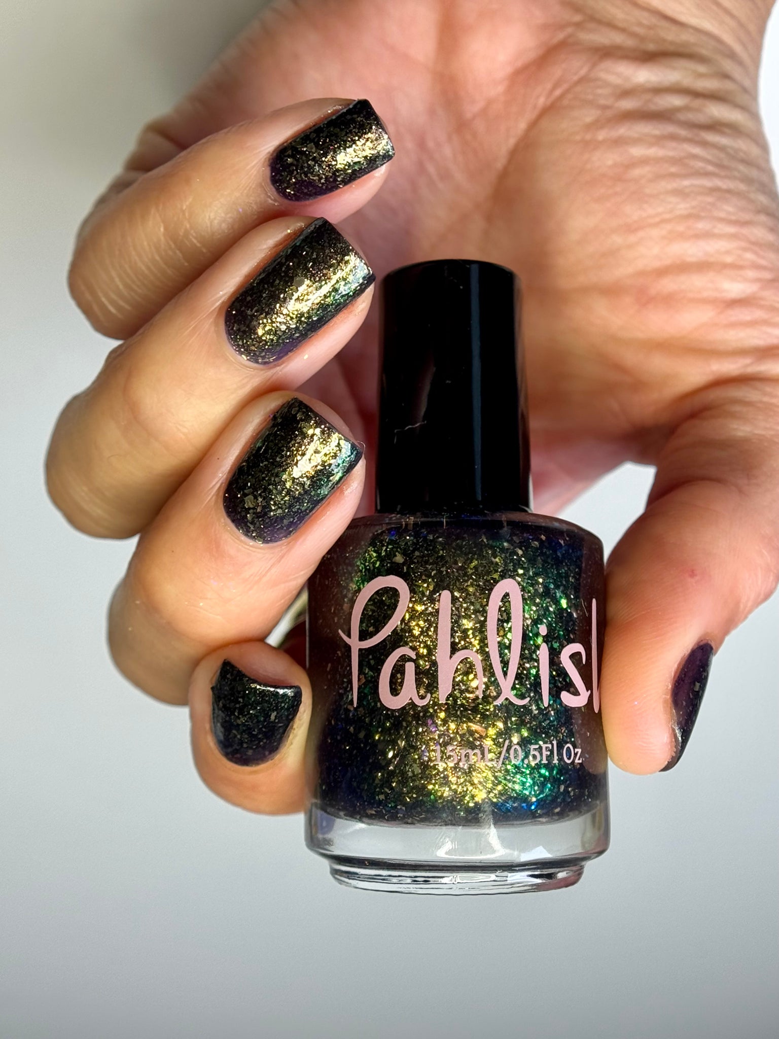 dramatic indigo blue base with a mix of metallic gold and iridescent gold/green flakes