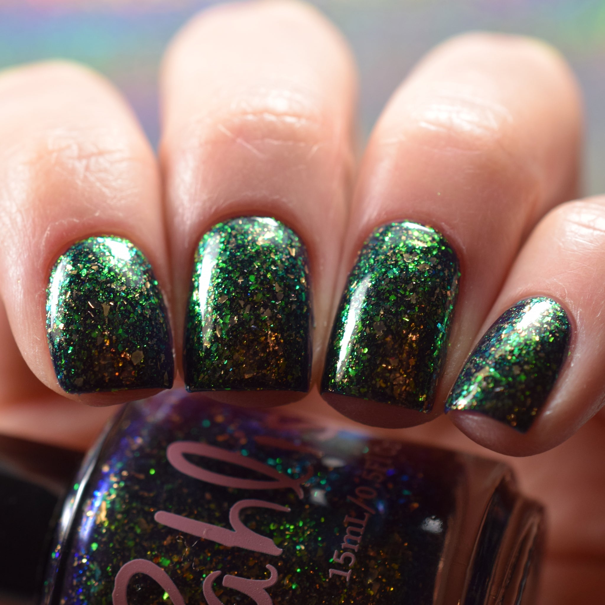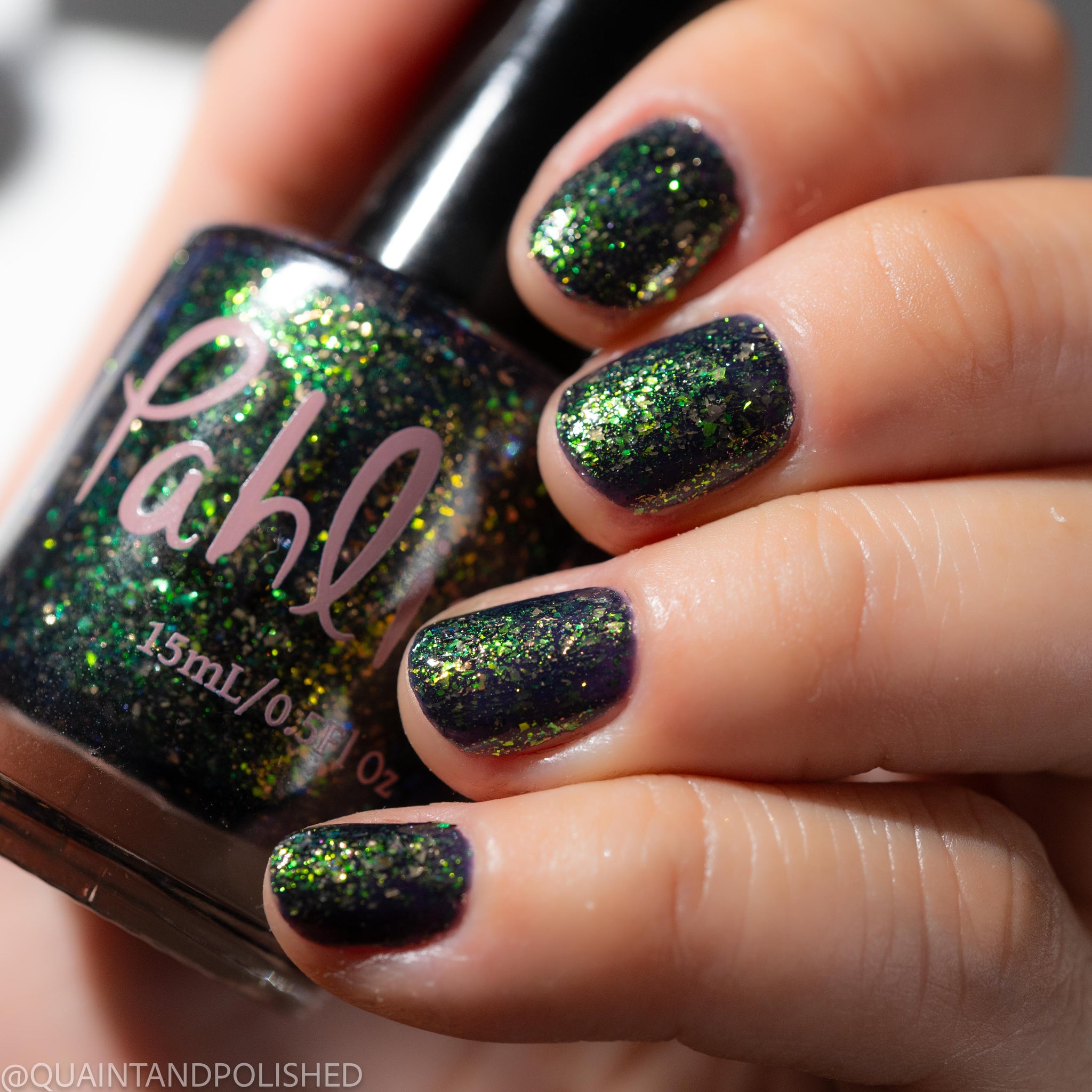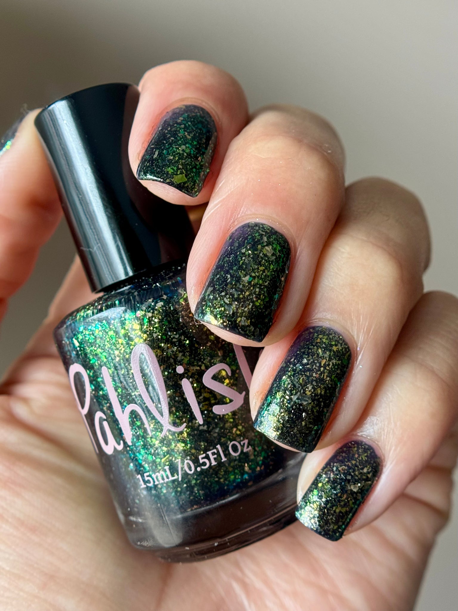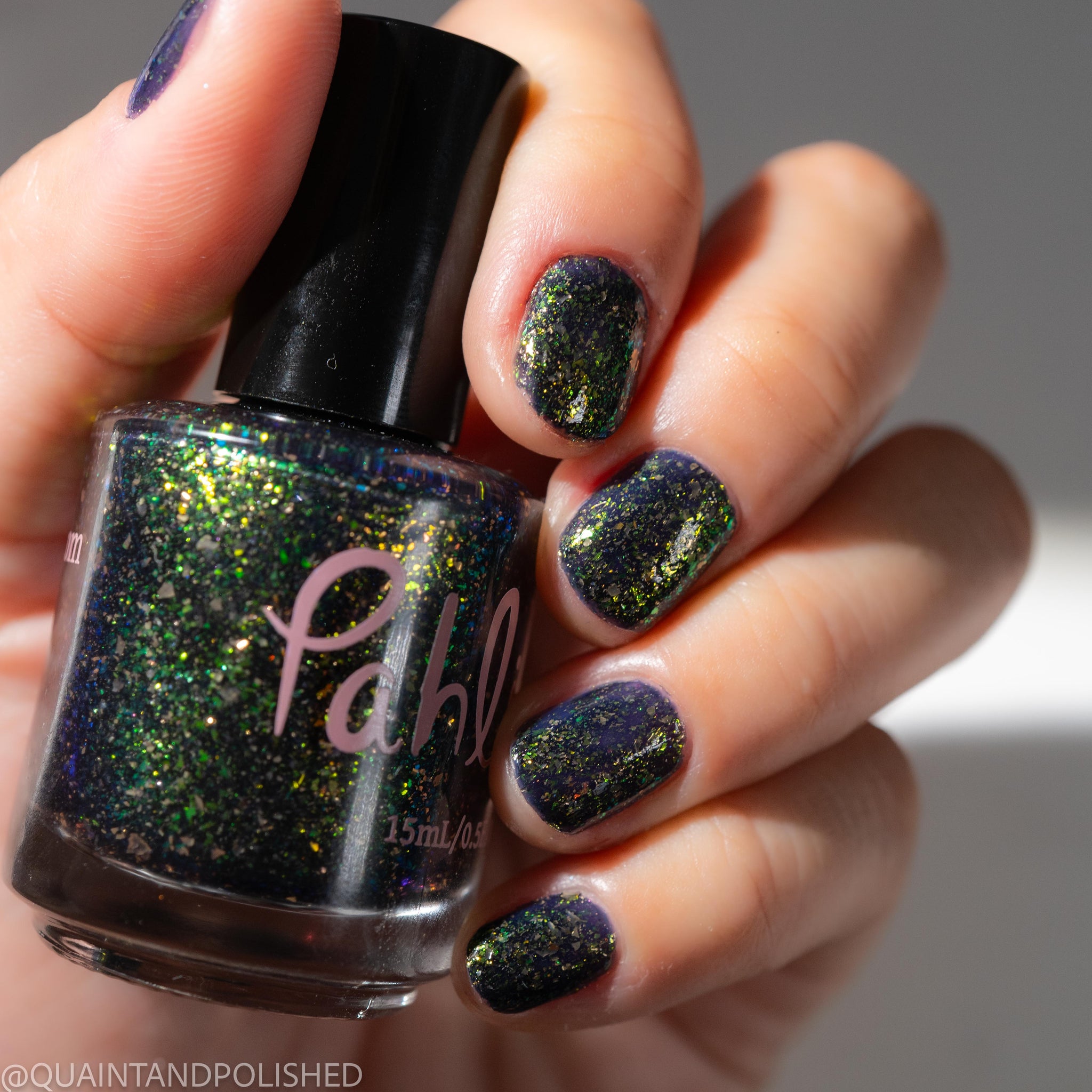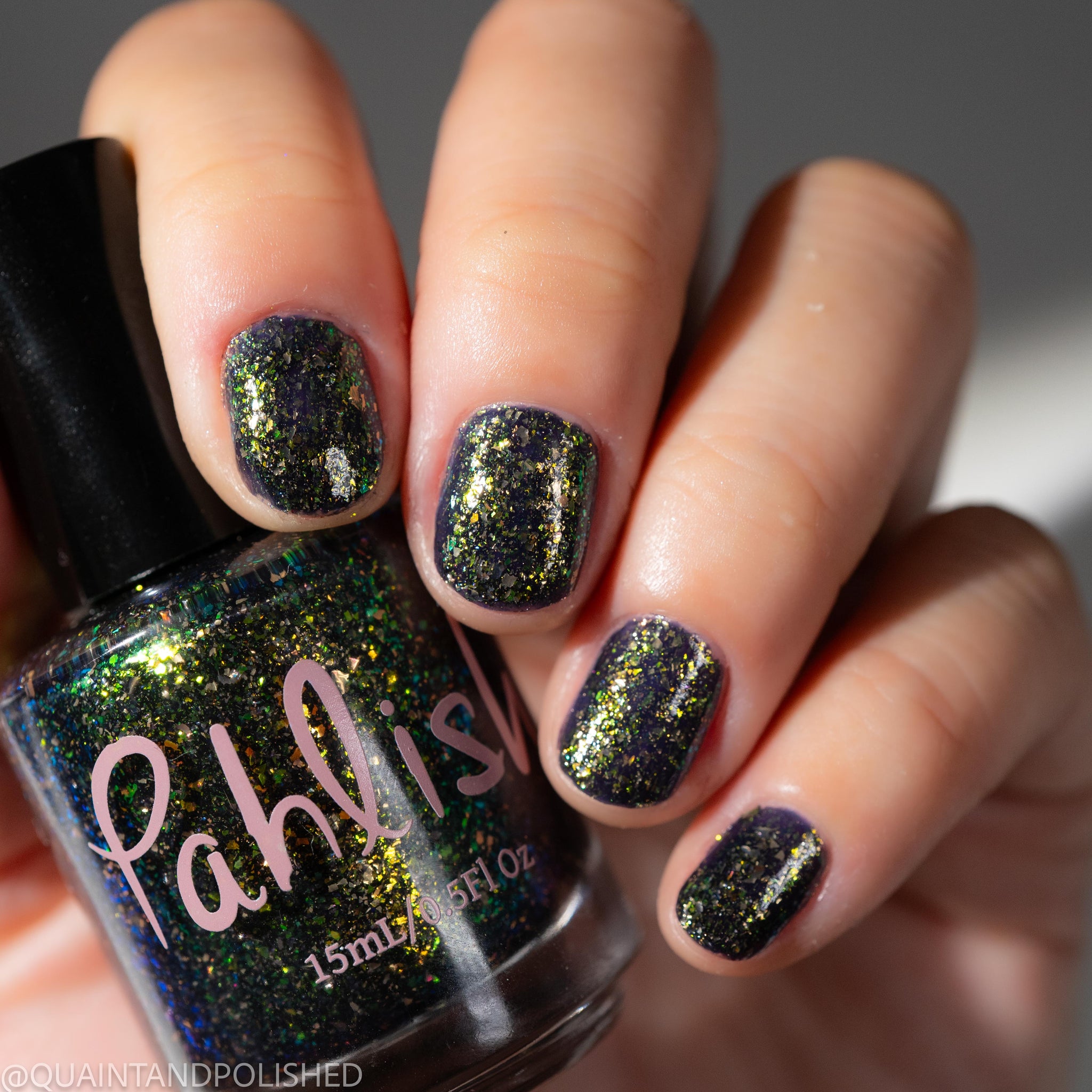 dramatic indigo blue base with a mix of metallic gold and iridescent gold/green flakes