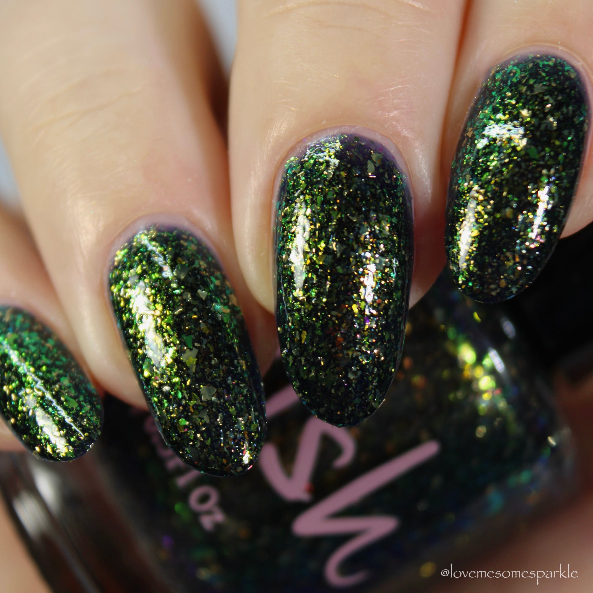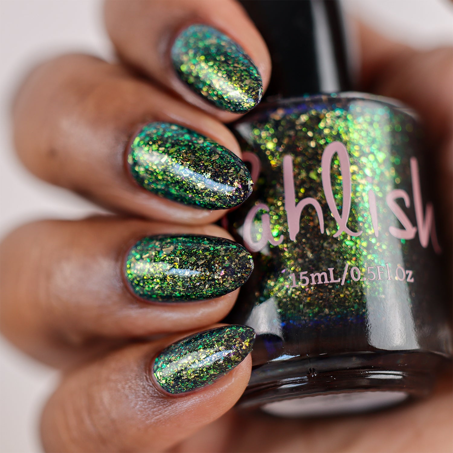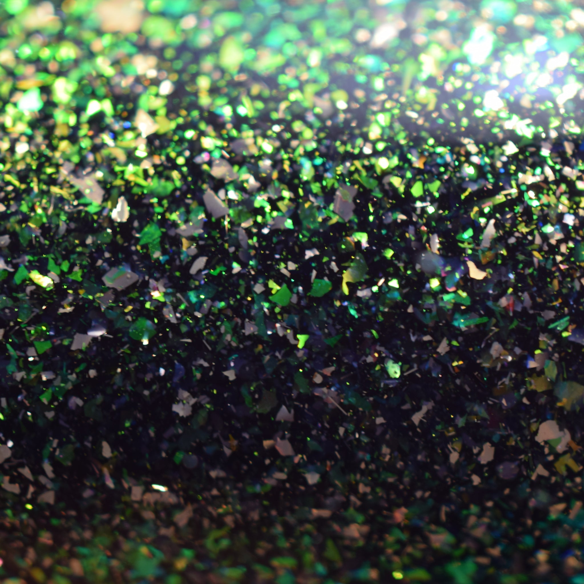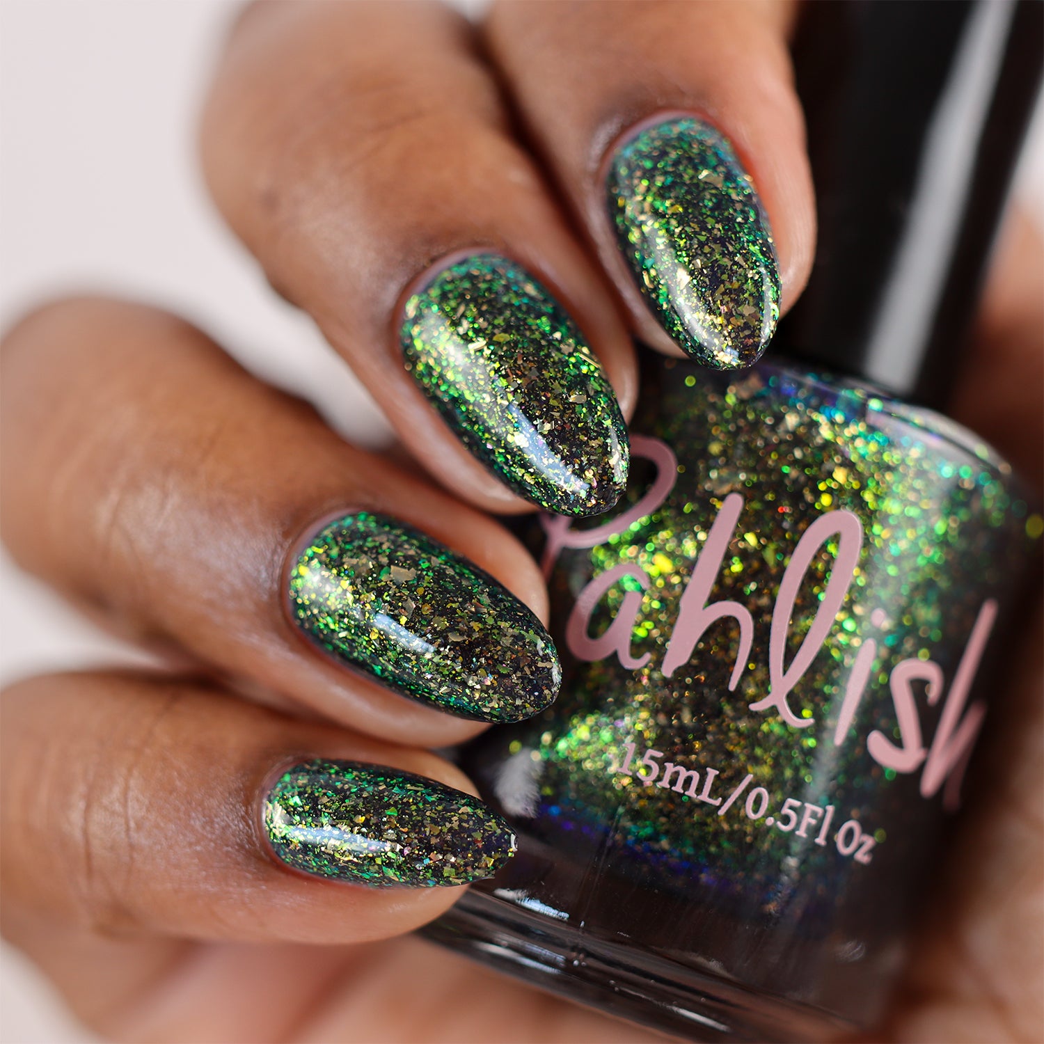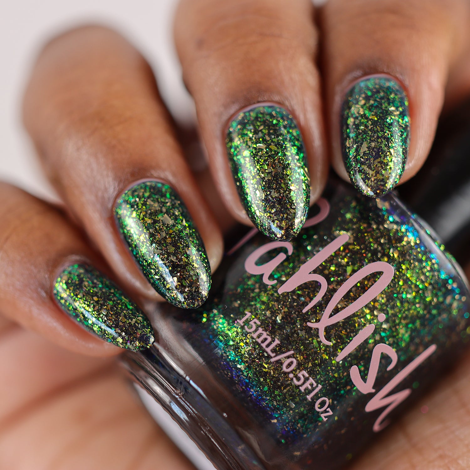 dramatic indigo blue base with a mix of metallic gold and iridescent gold/green flakes