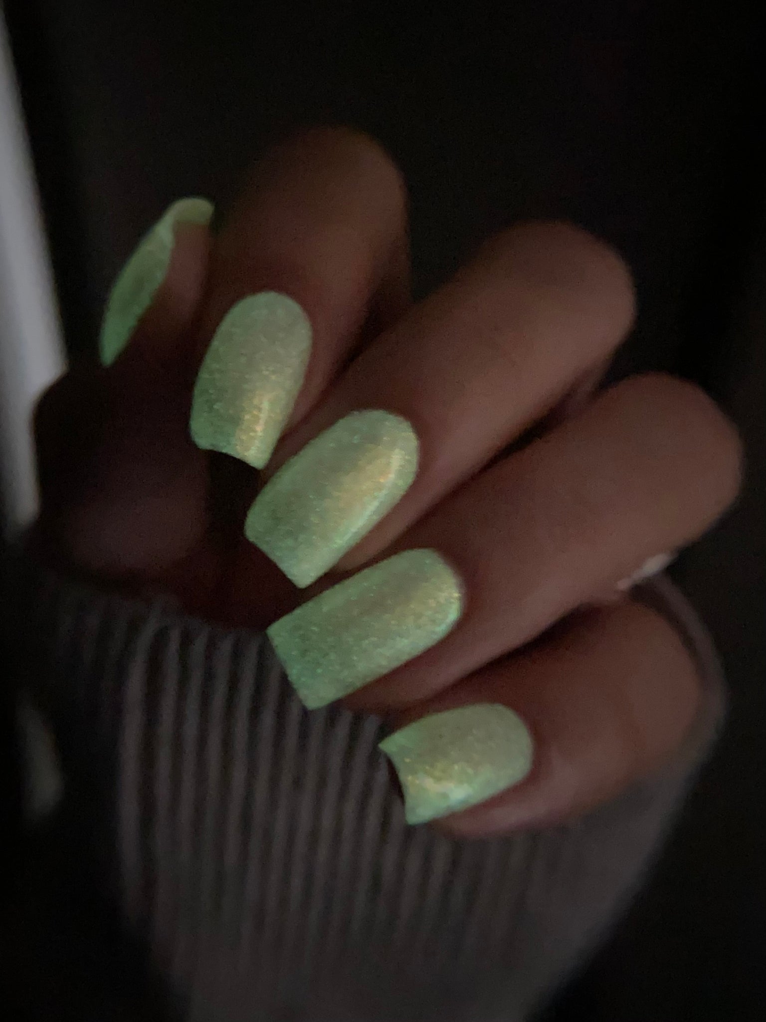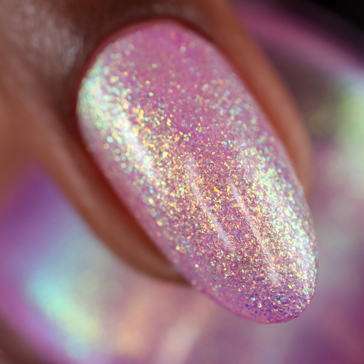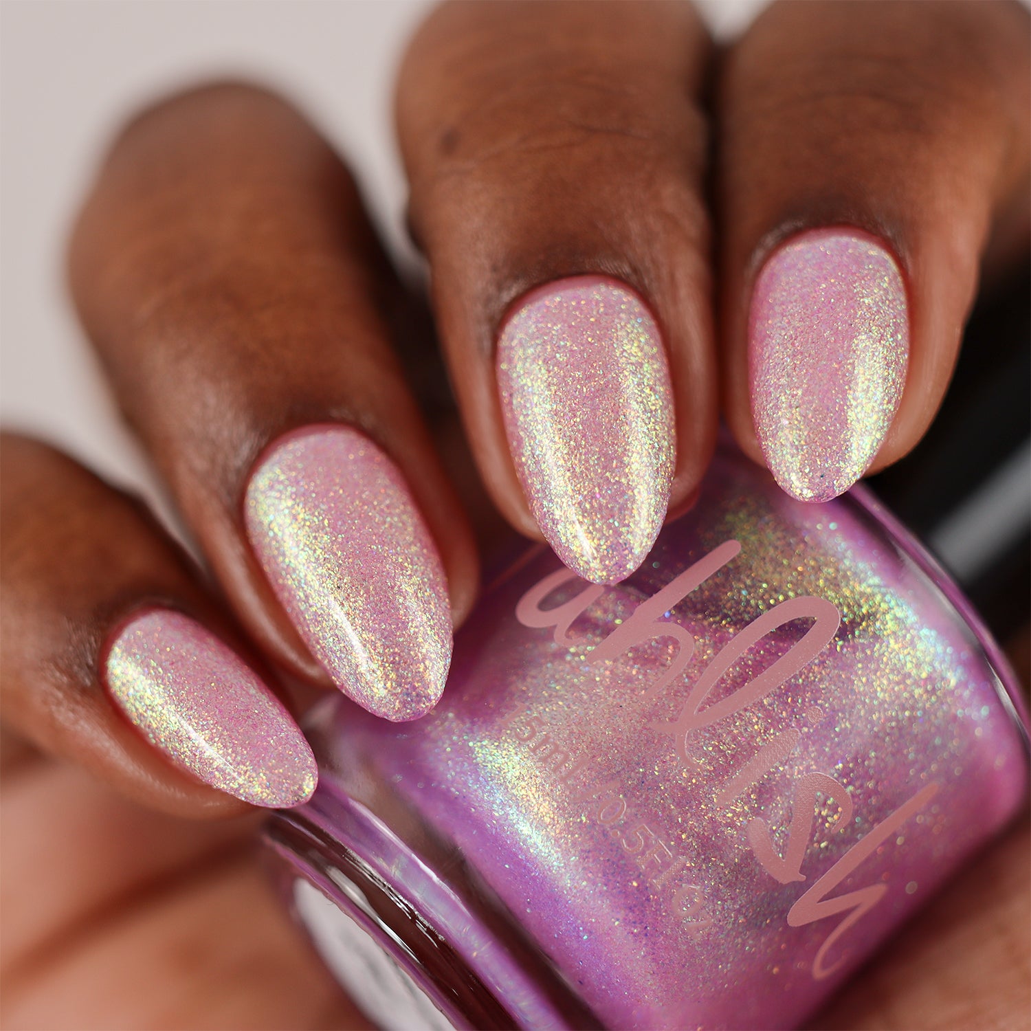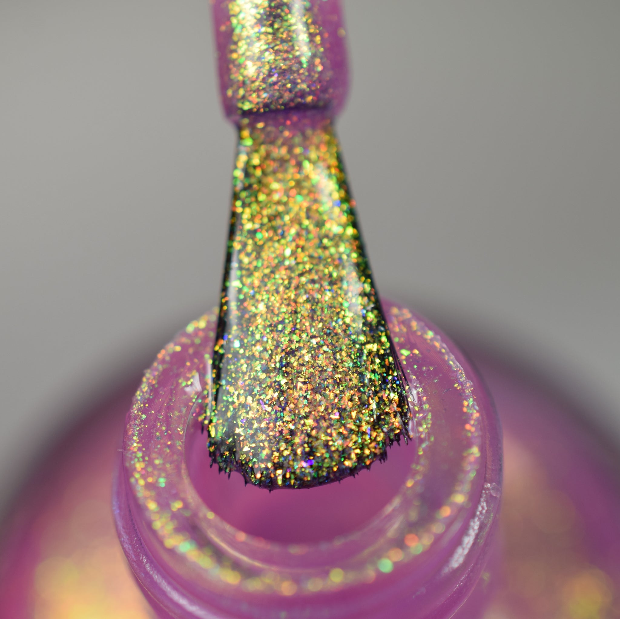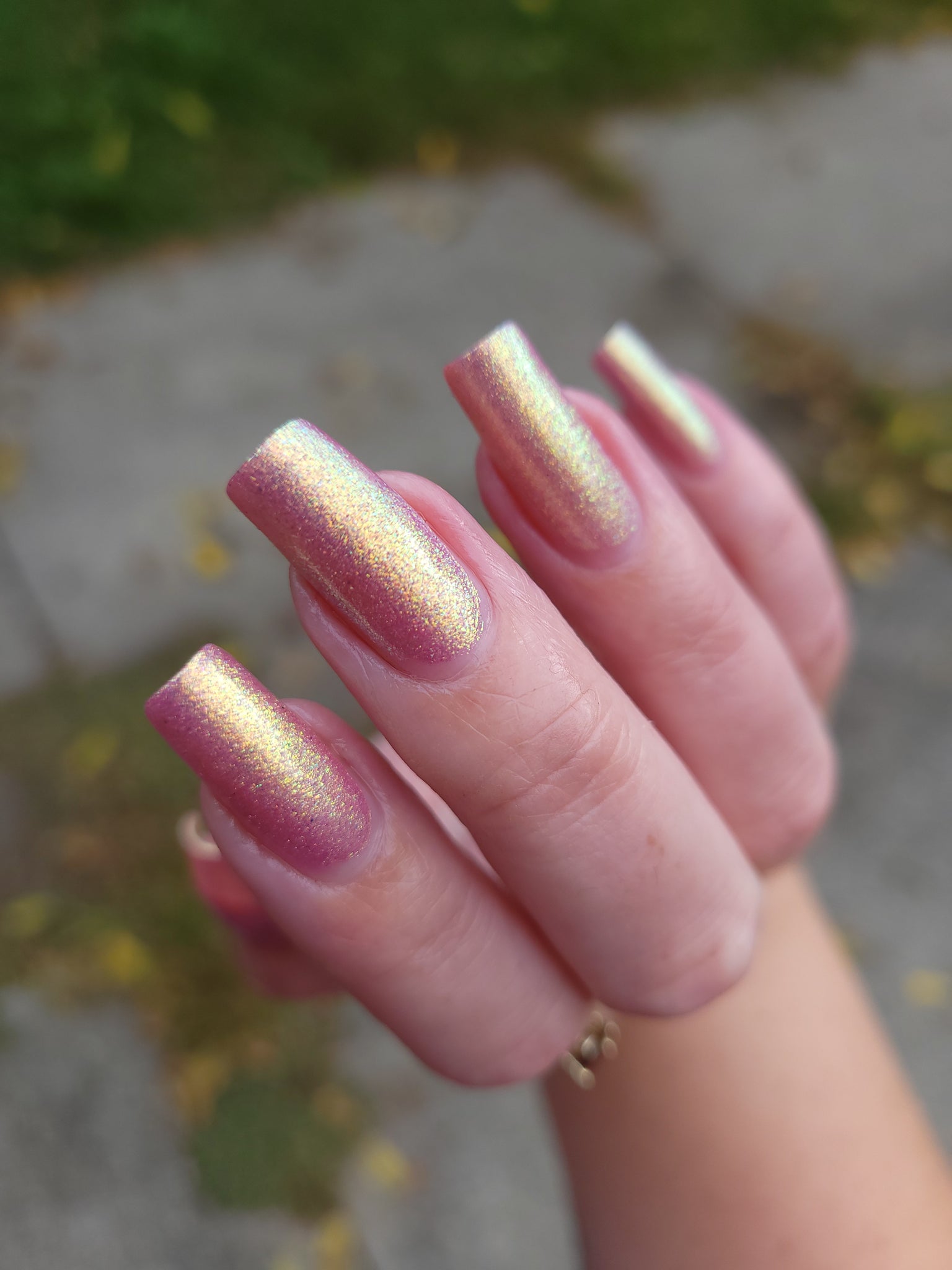 soft violet pink with golden/copper/green shifting iridescent shimmer and an eerie green glow in the dark finish