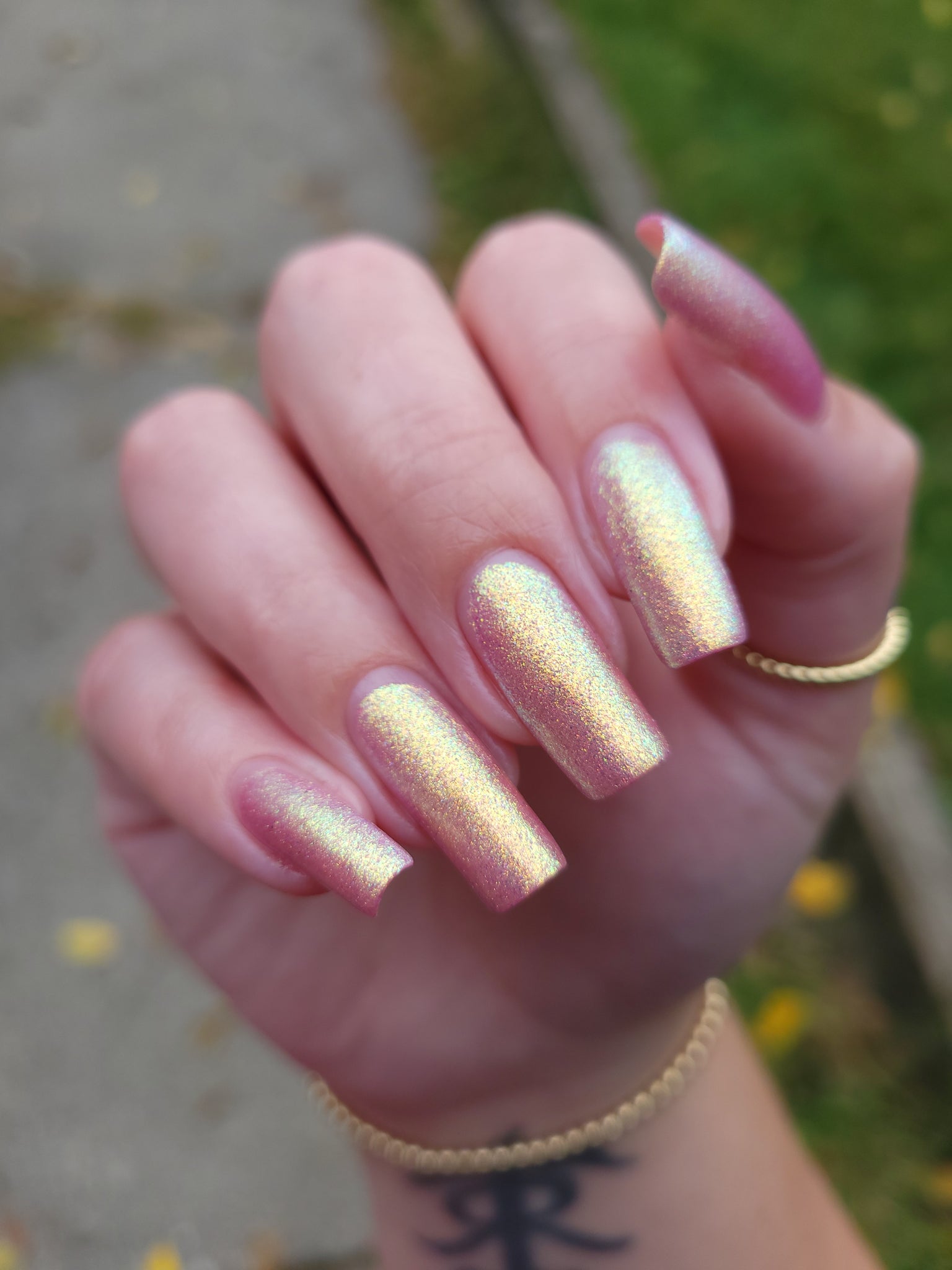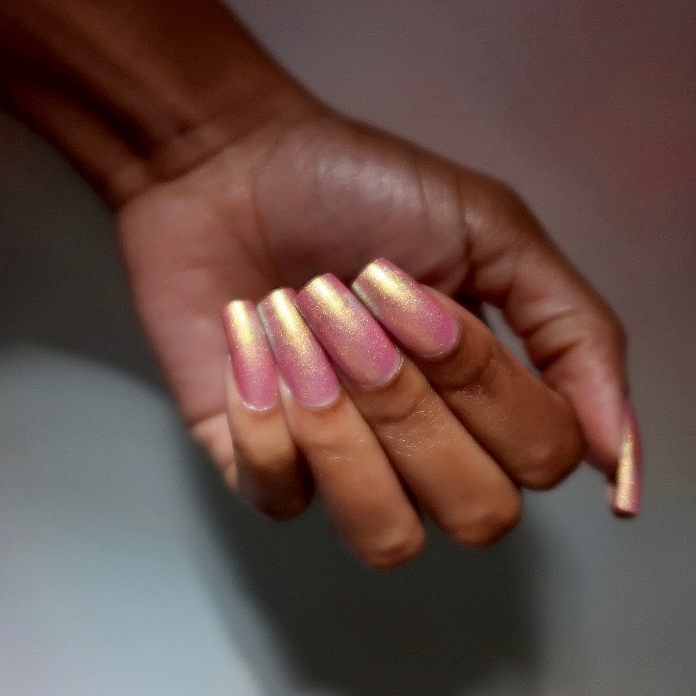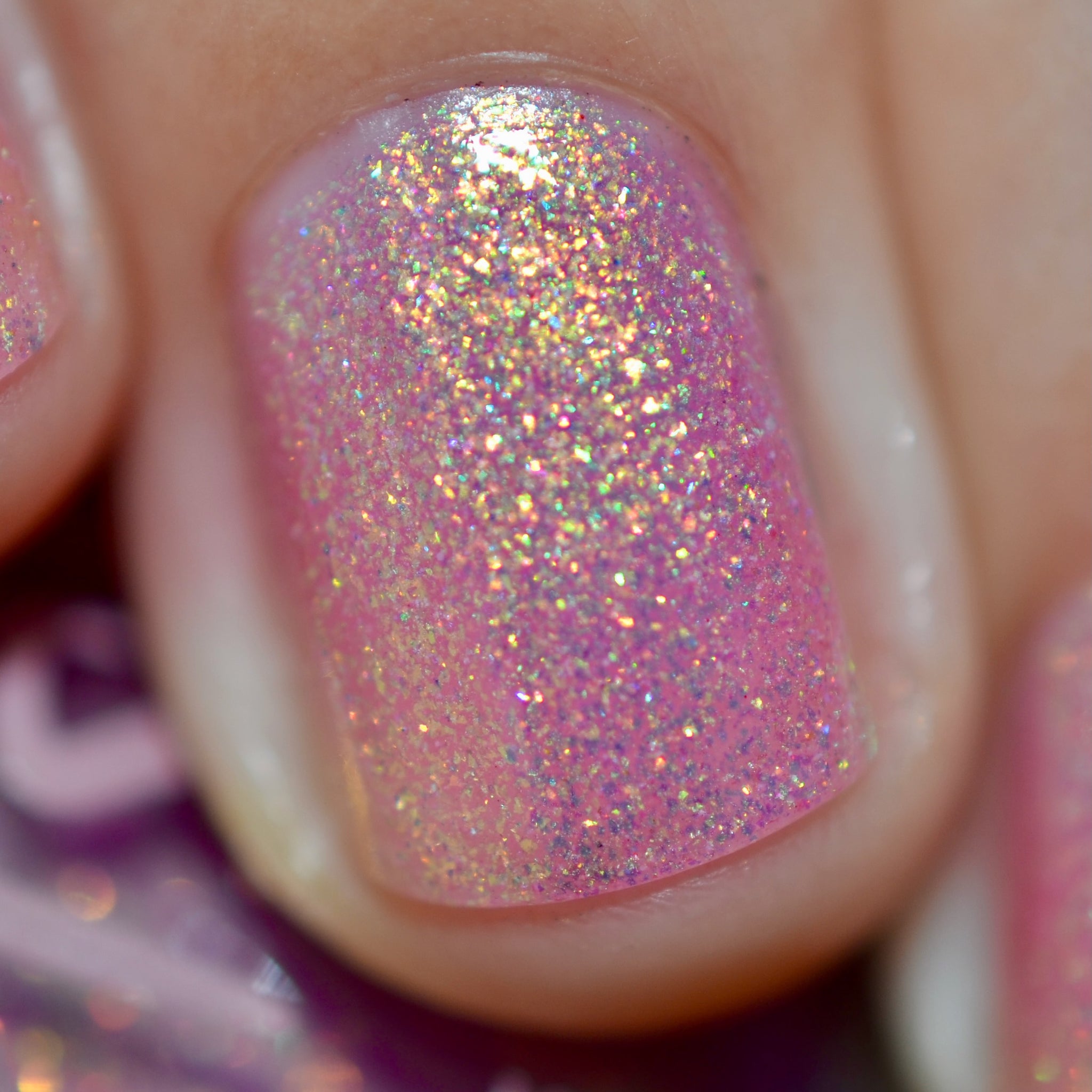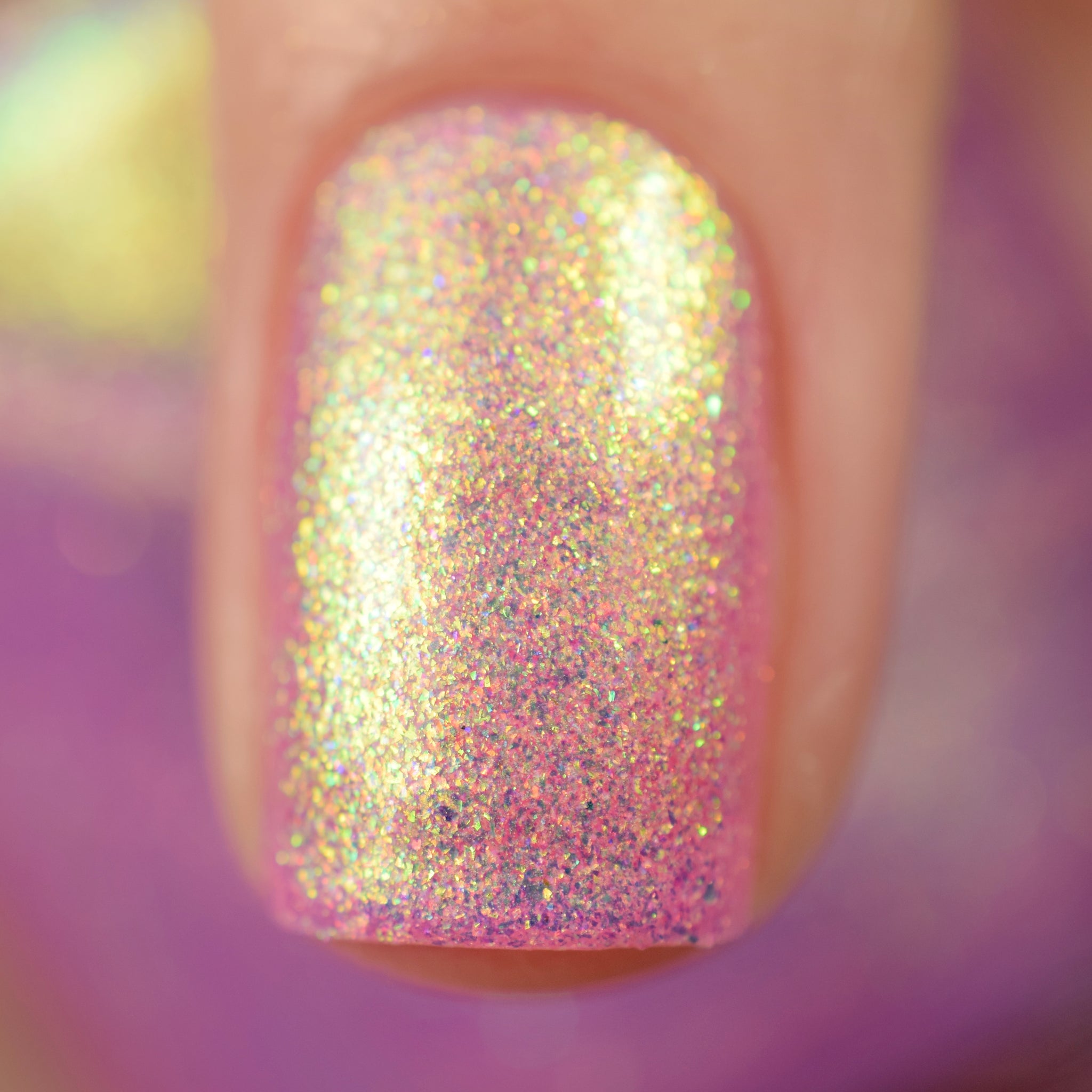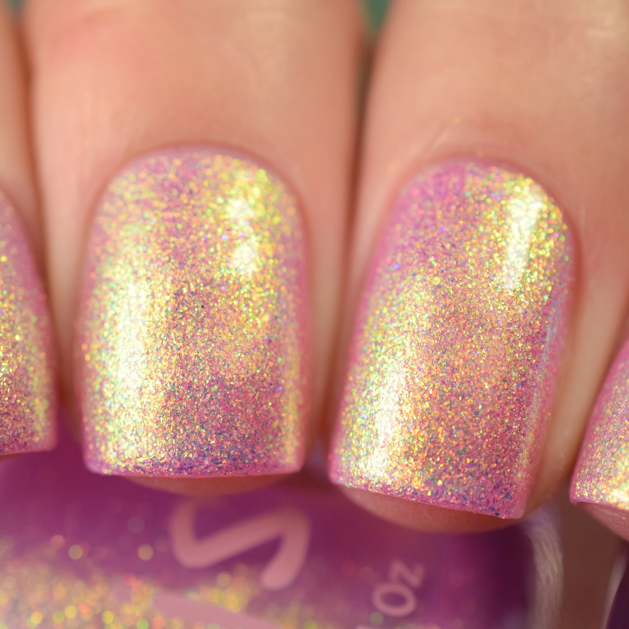 soft violet pink with golden/copper/green shifting iridescent shimmer and an eerie green glow in the dark finish