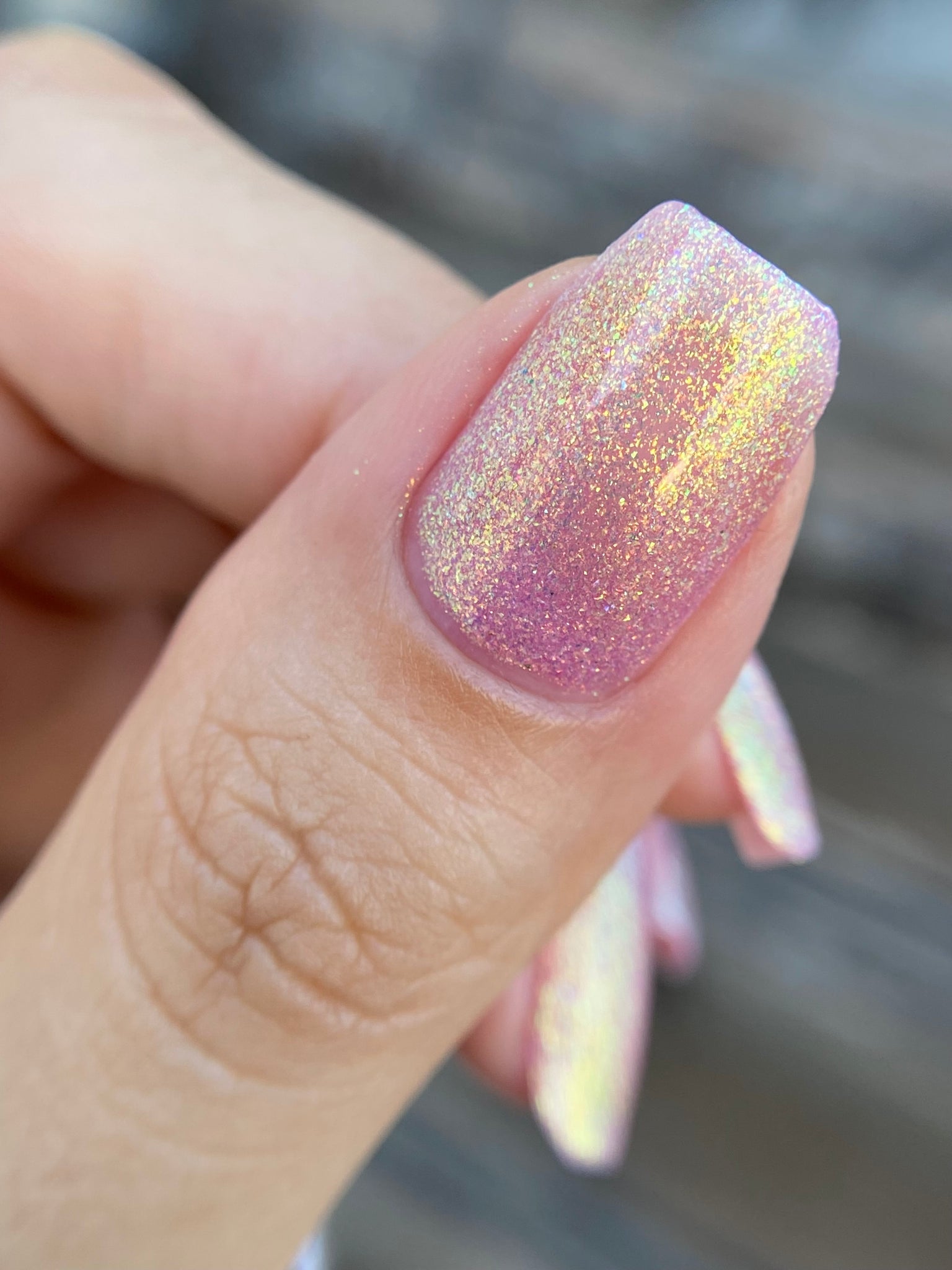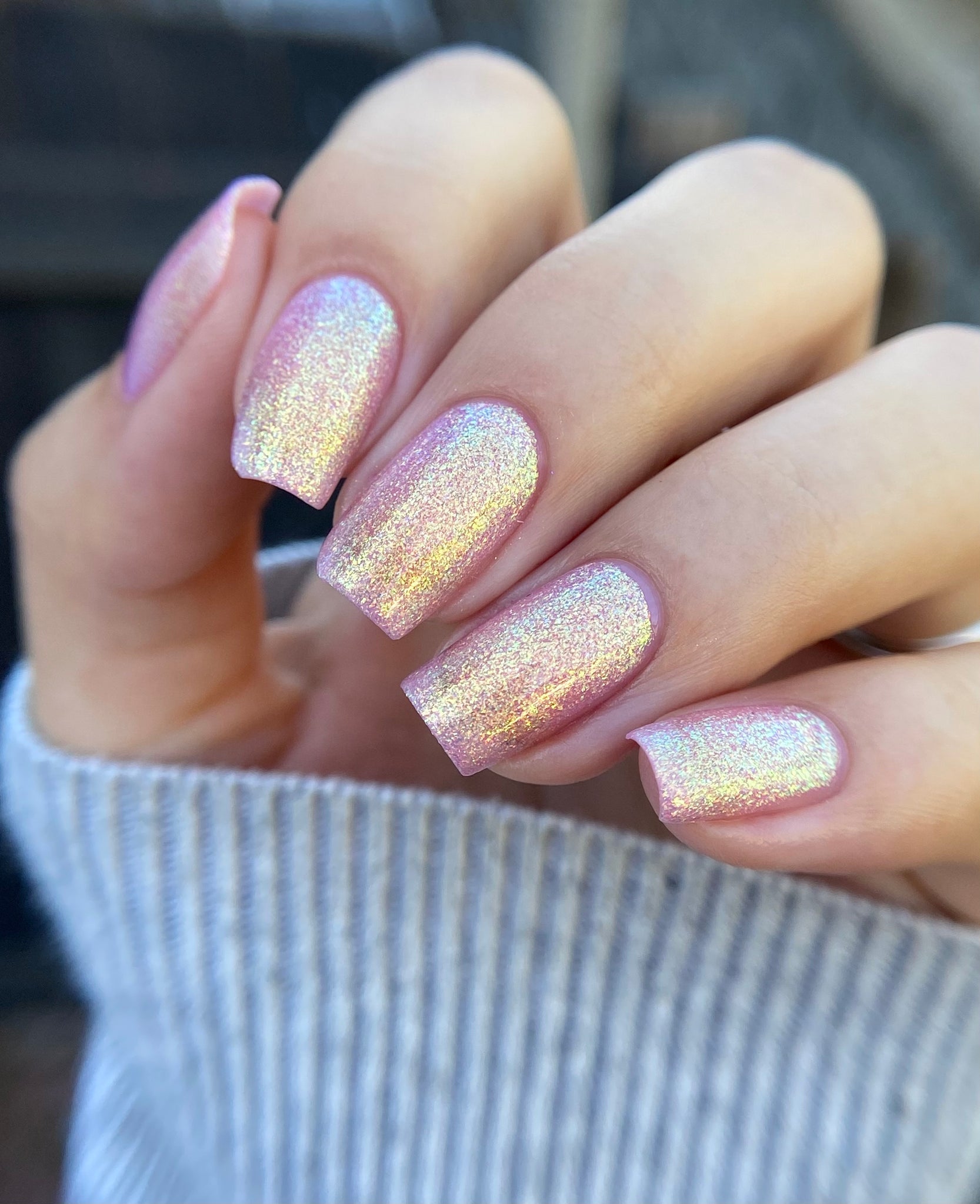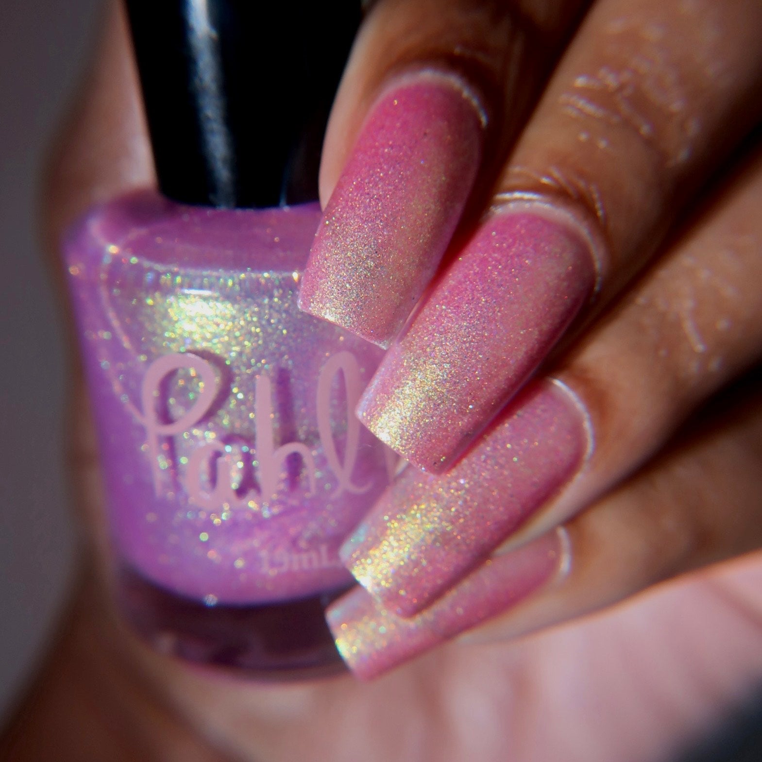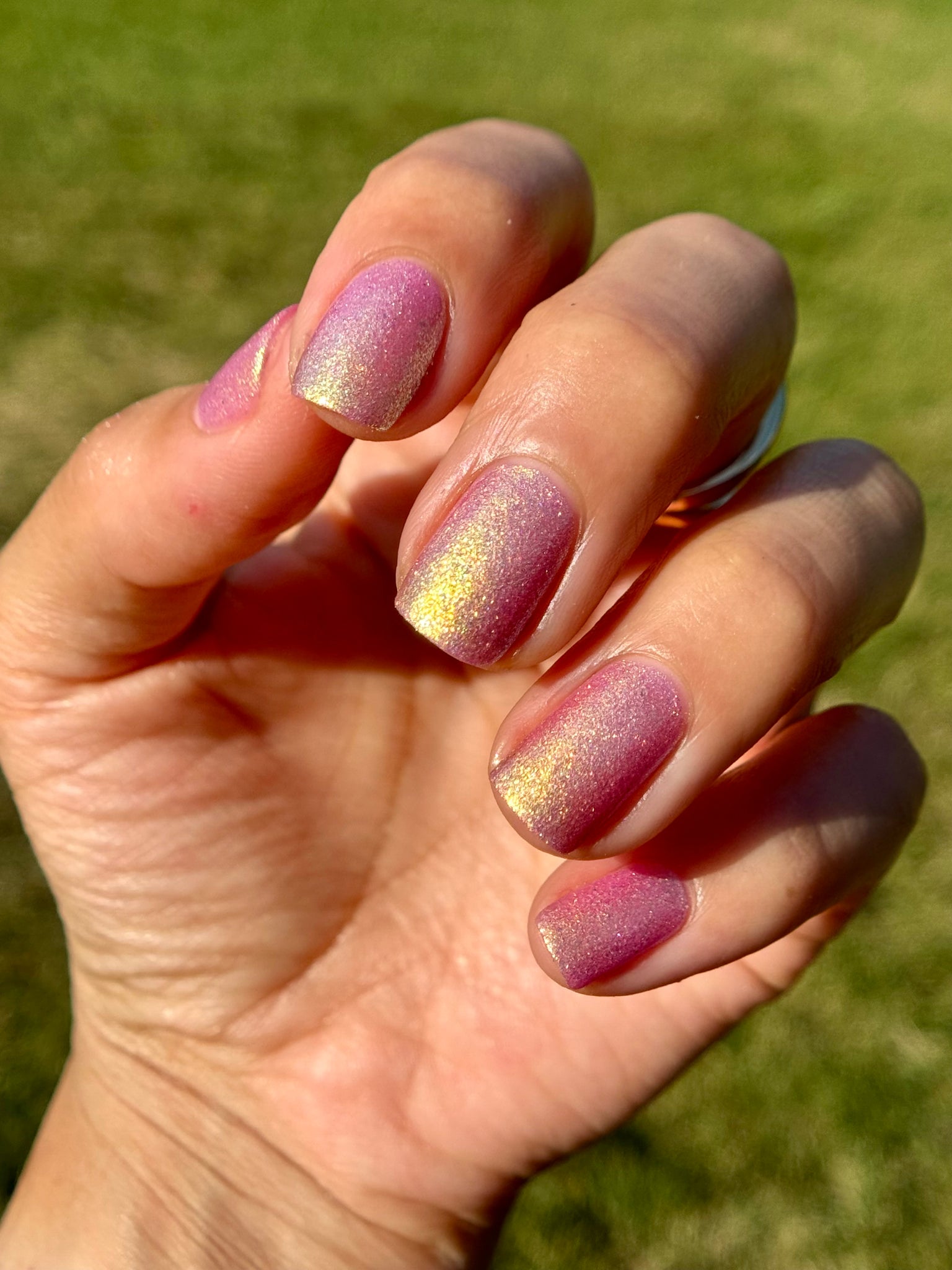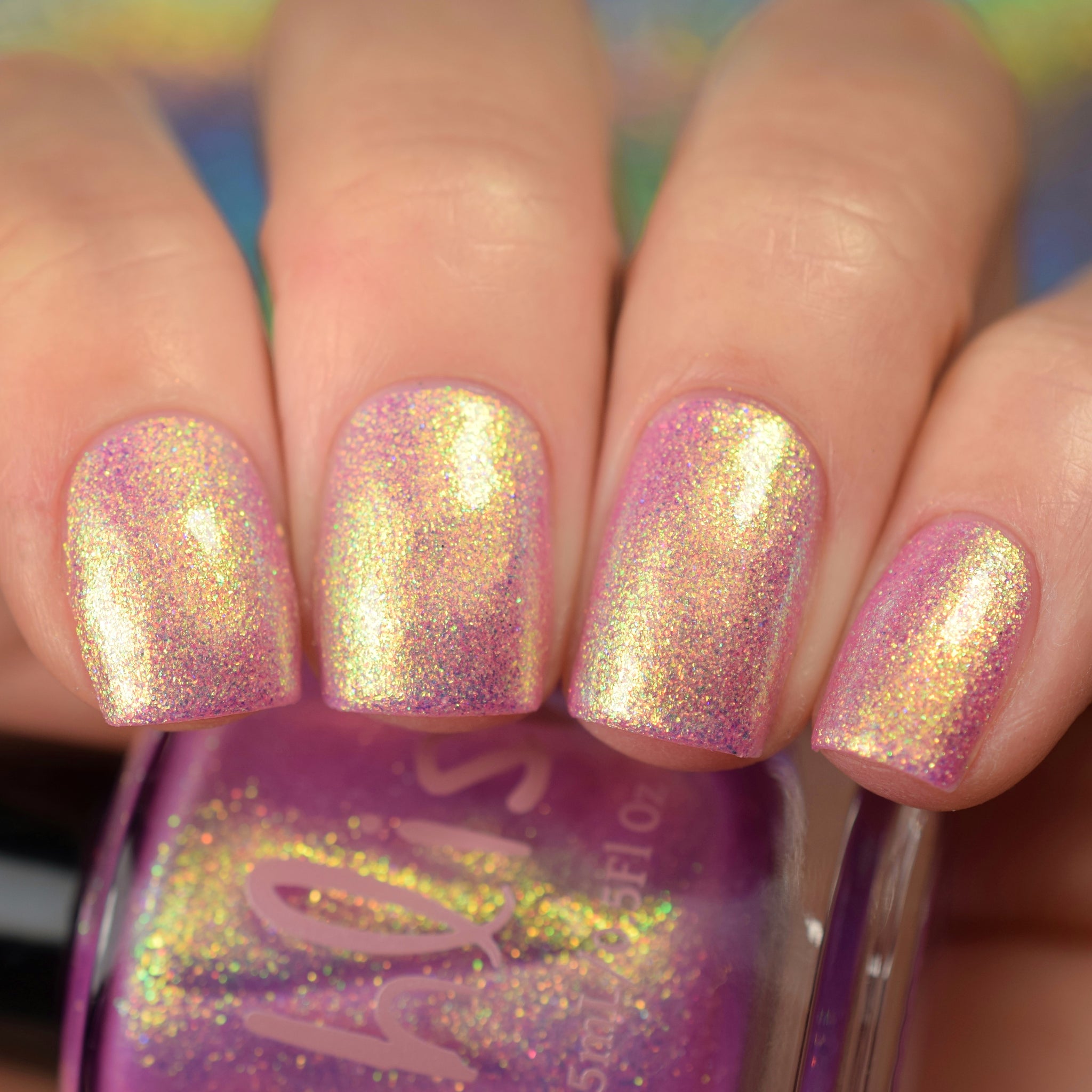 soft violet pink with golden/copper/green shifting iridescent shimmer and an eerie green glow in the dark finish
