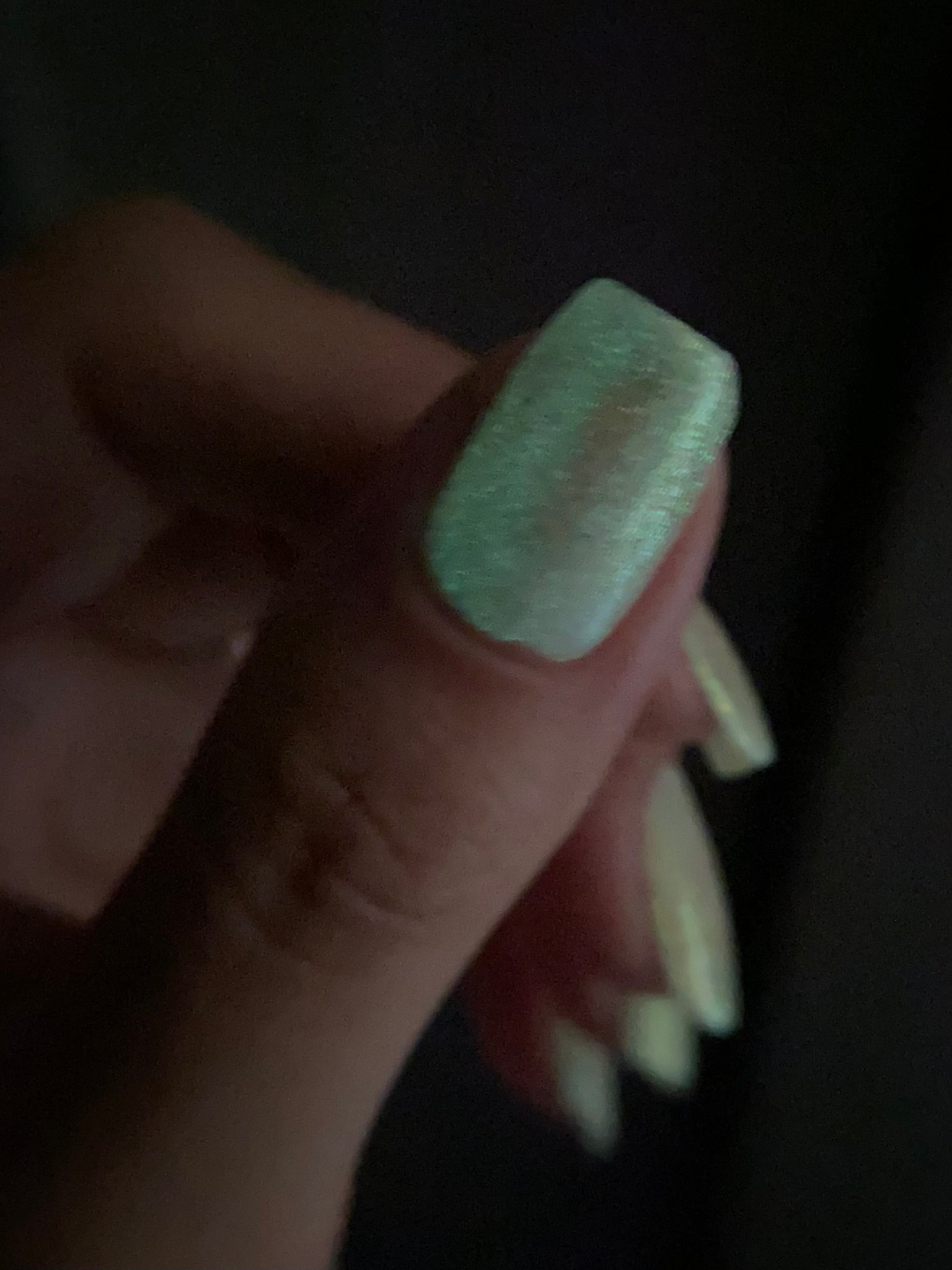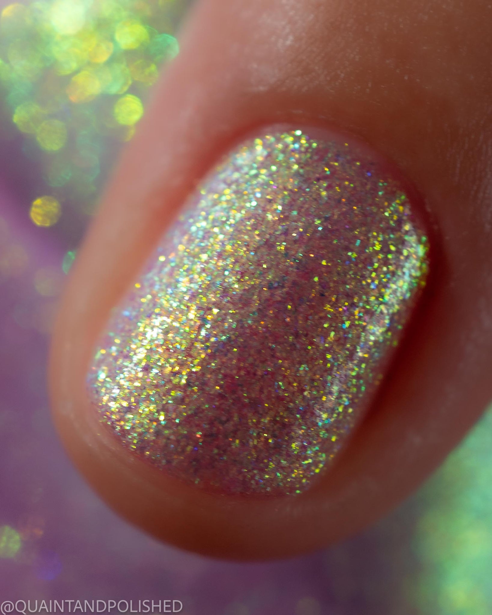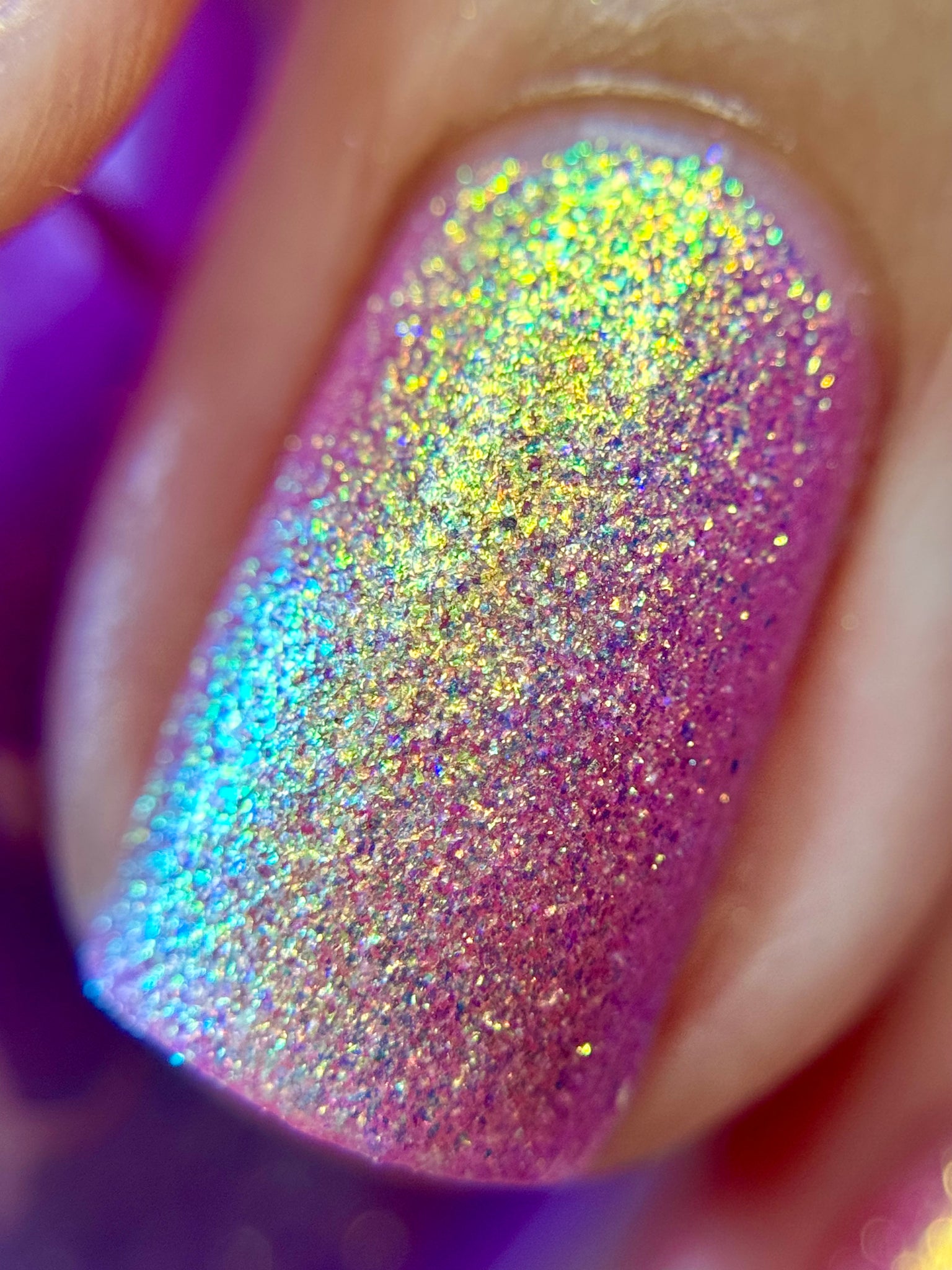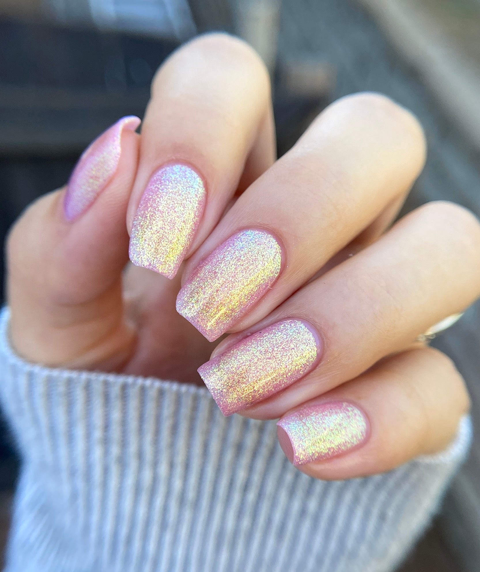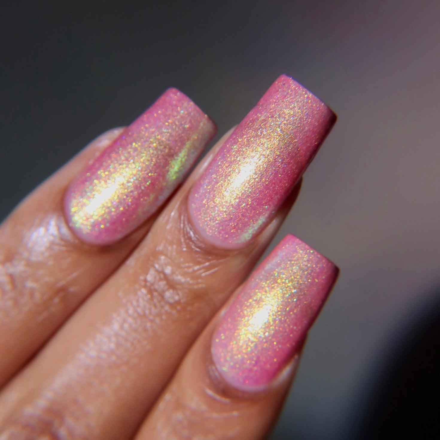 soft violet pink with golden/copper/green shifting iridescent shimmer and an eerie green glow in the dark finish