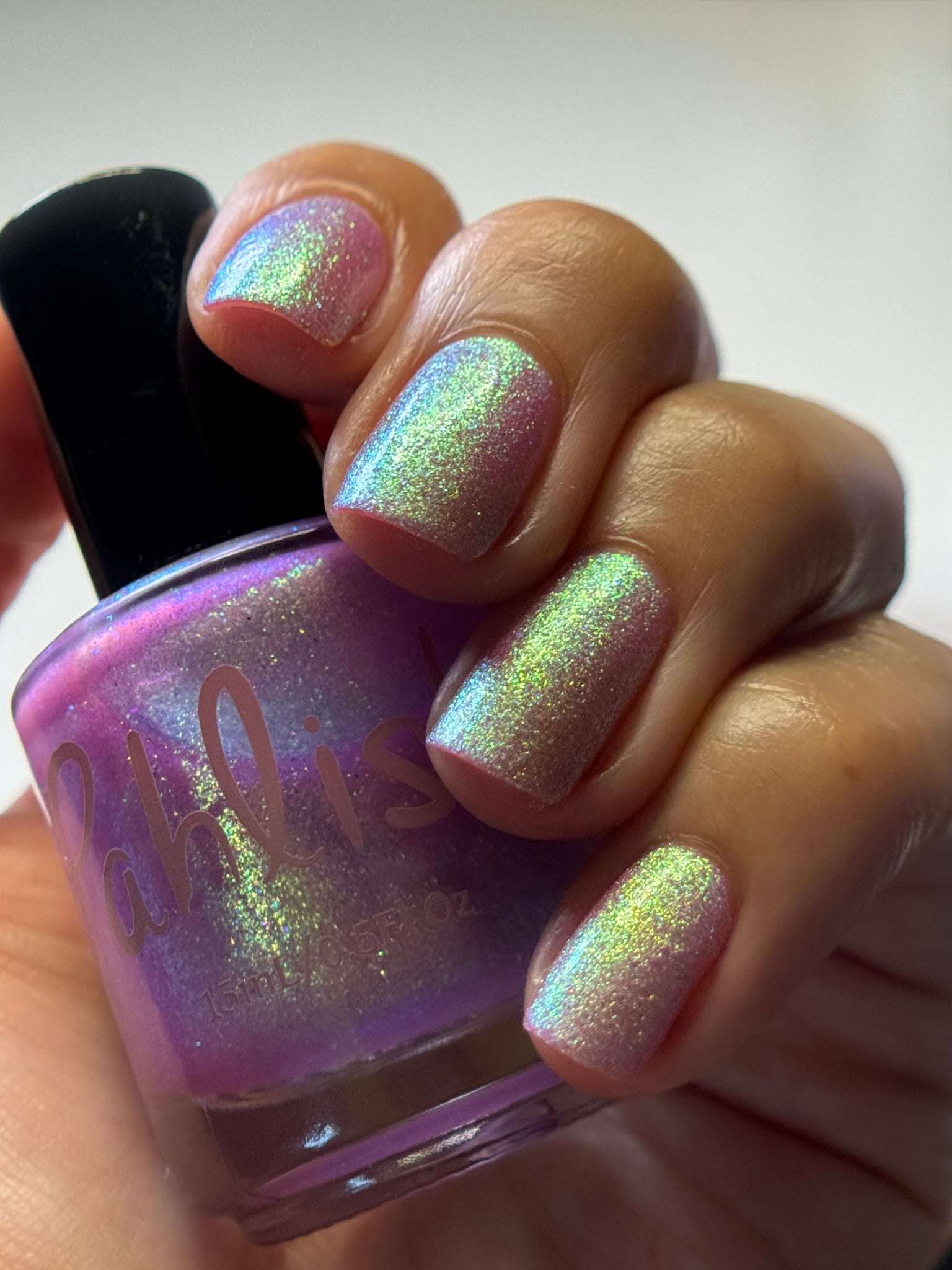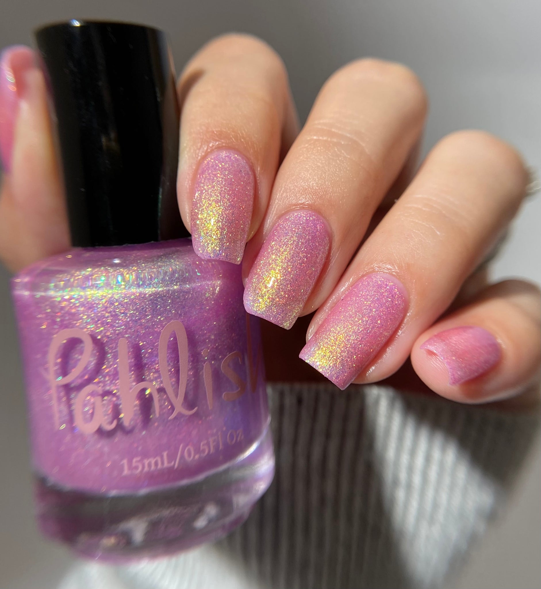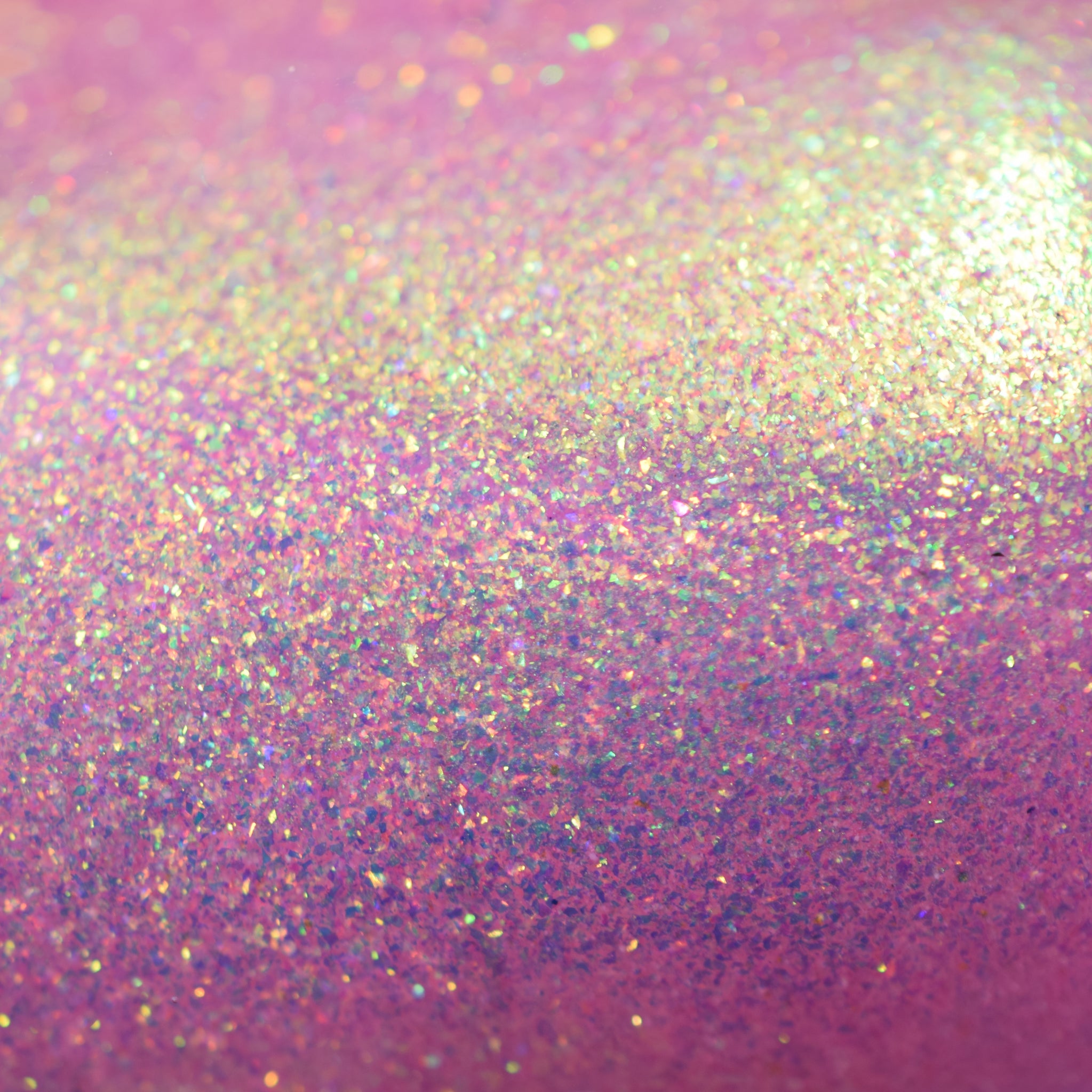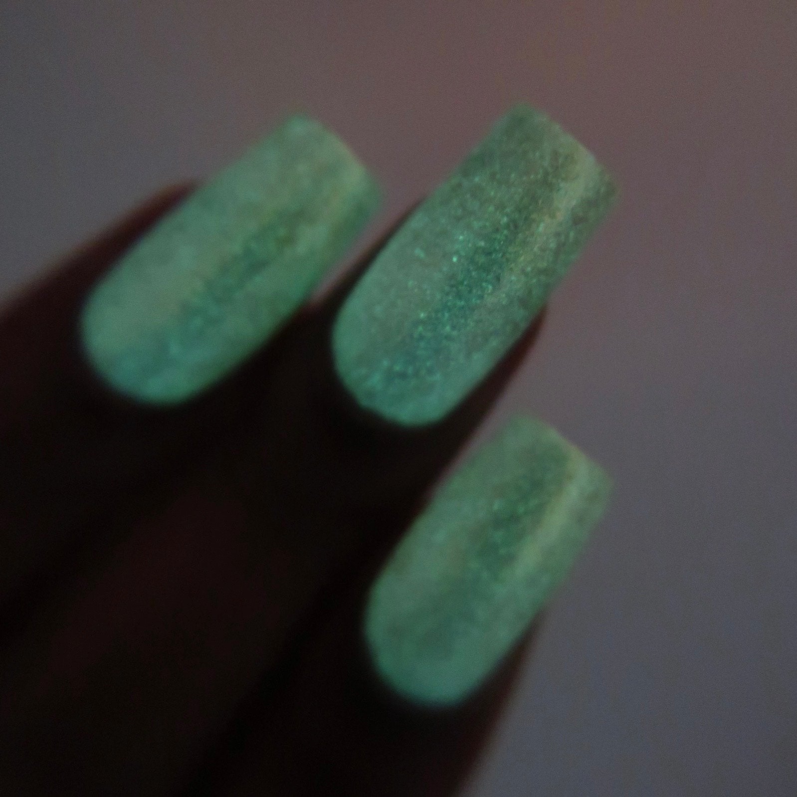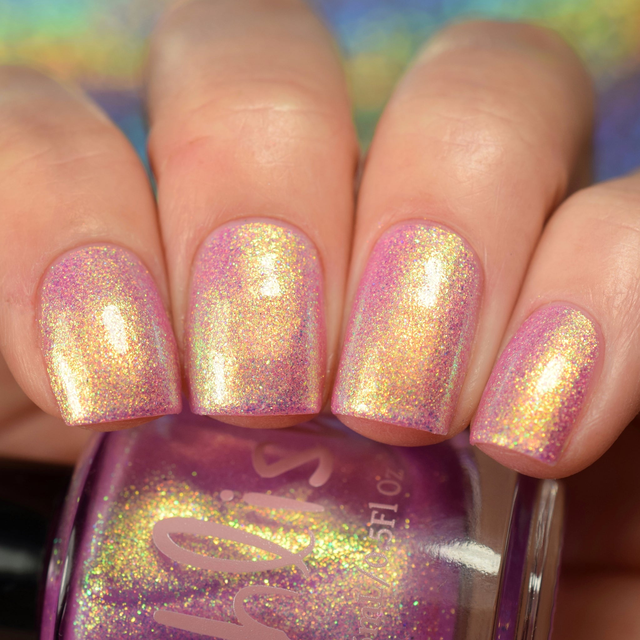 soft violet pink with golden/copper/green shifting iridescent shimmer and an eerie green glow in the dark finish