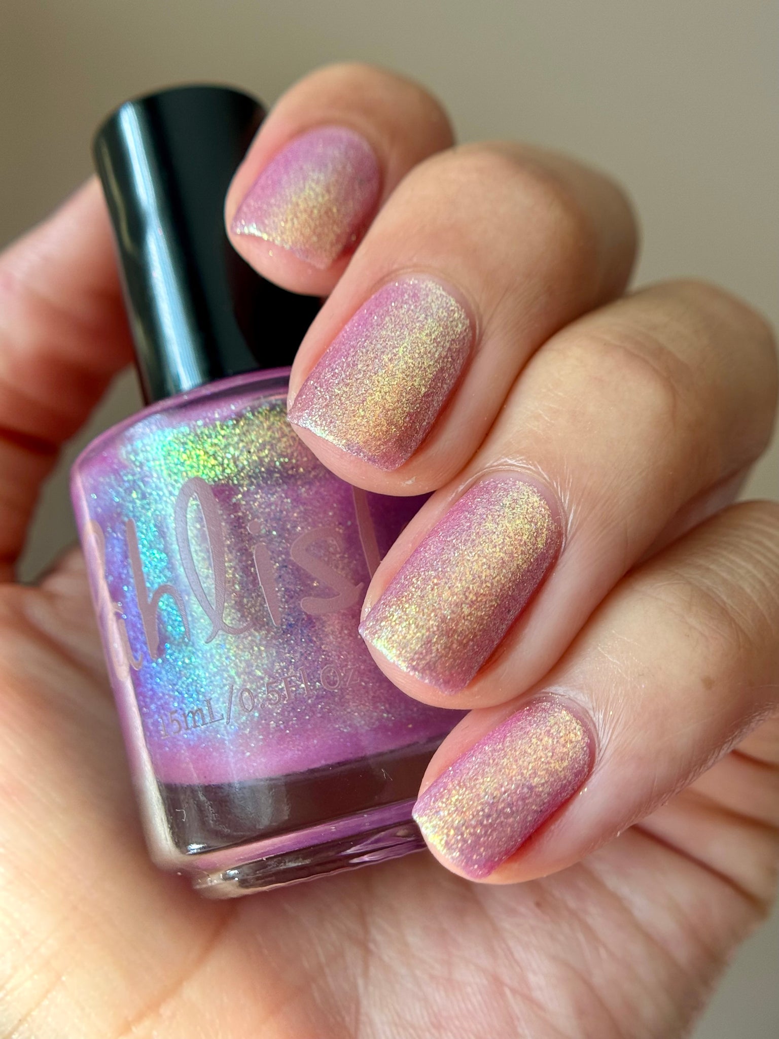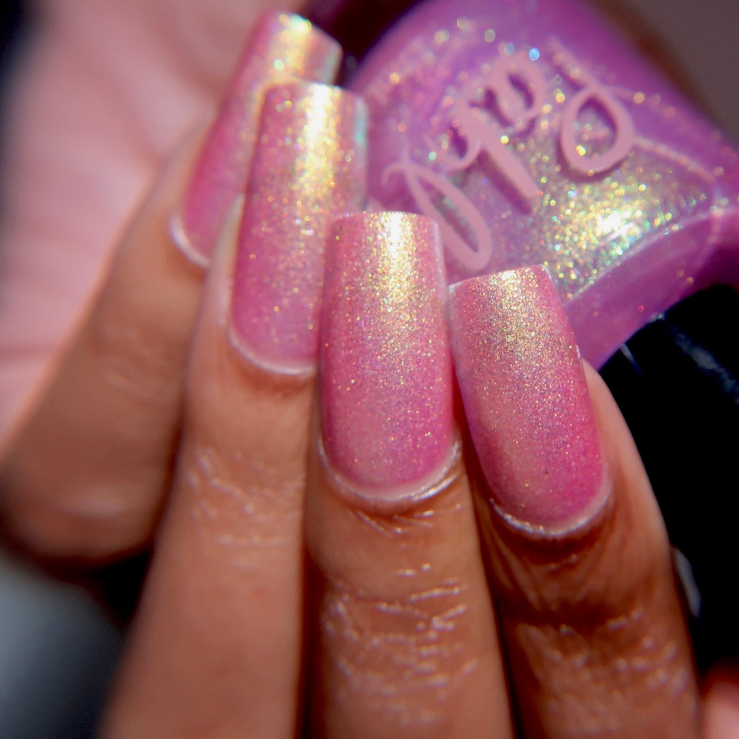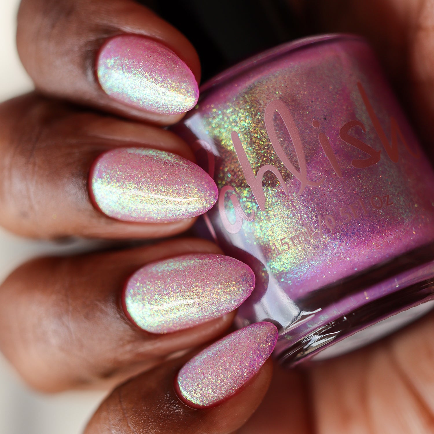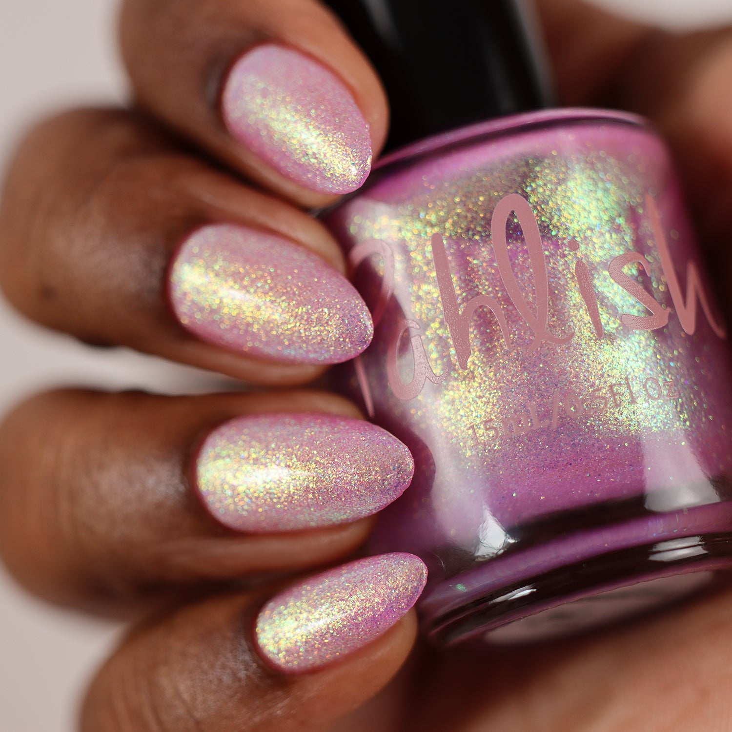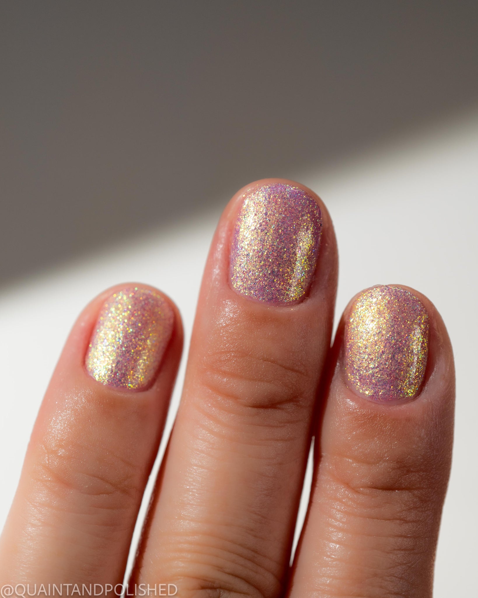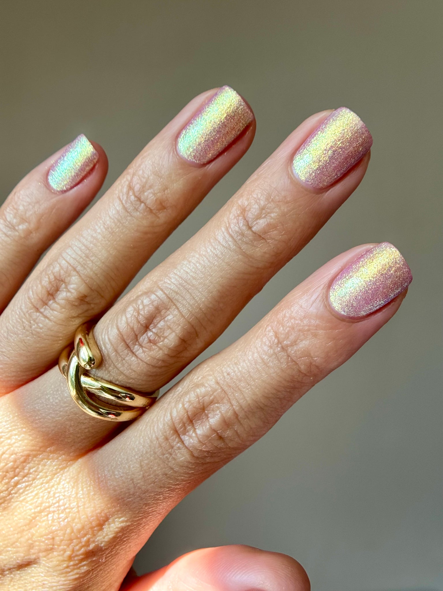 soft violet pink with golden/copper/green shifting iridescent shimmer and an eerie green glow in the dark finish