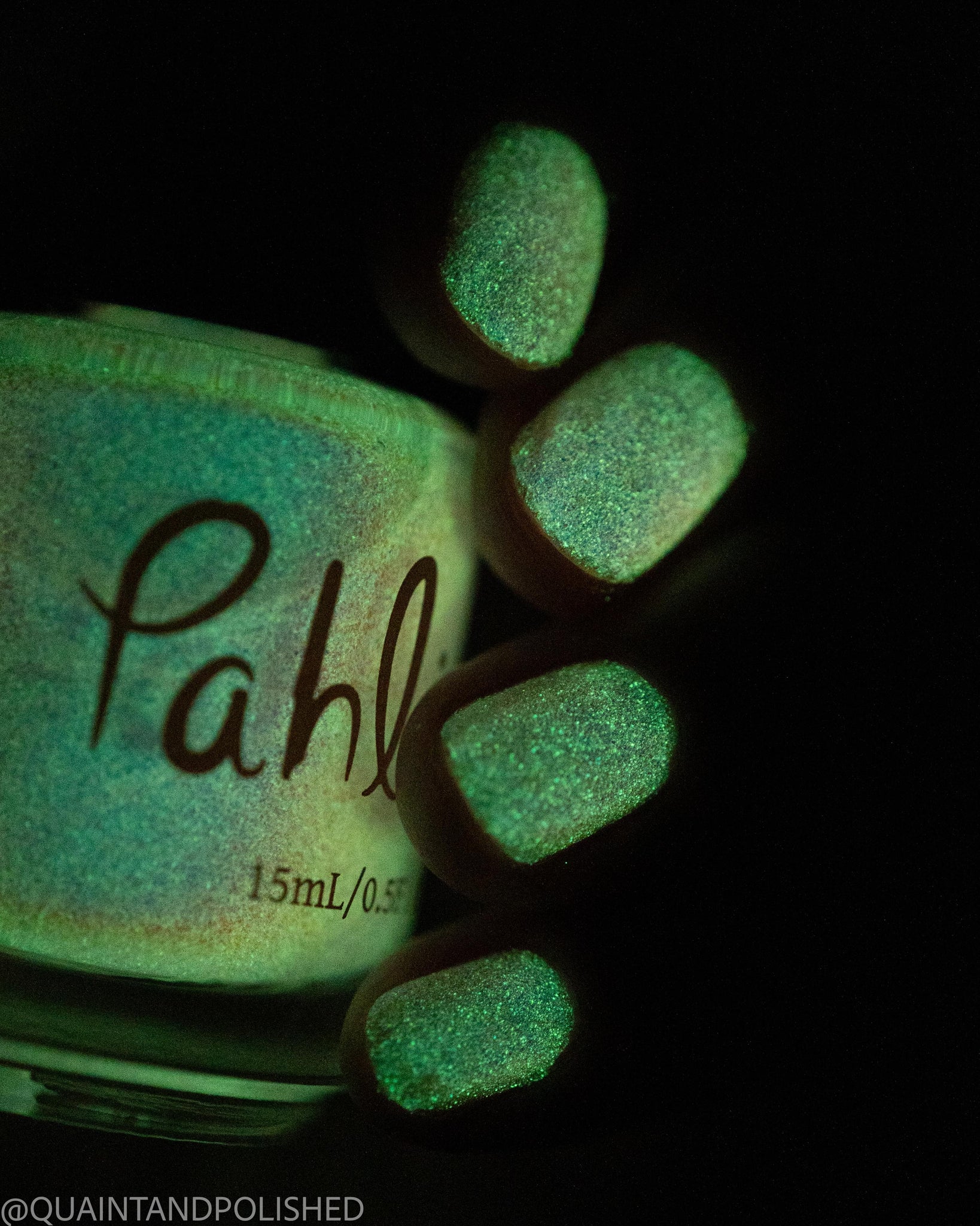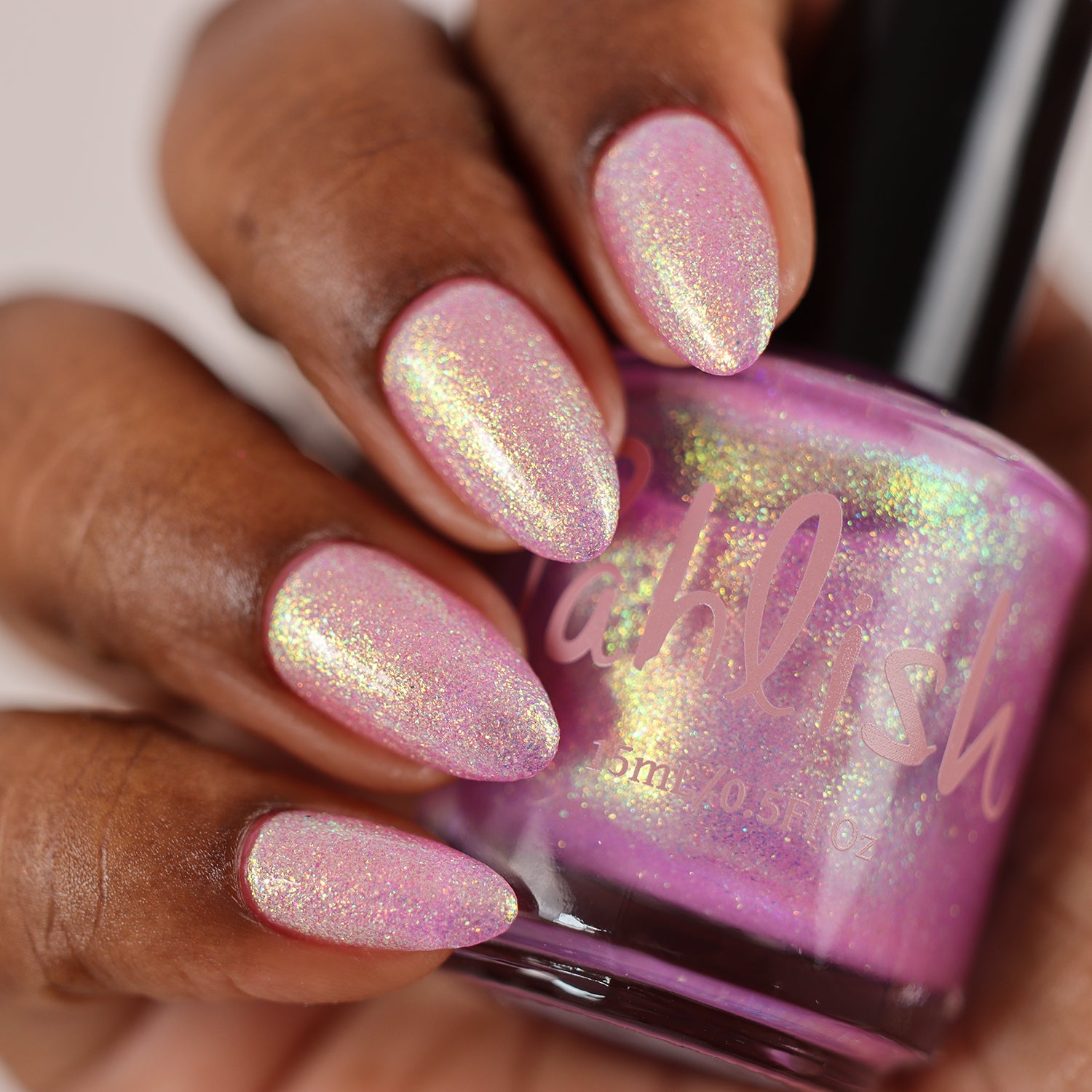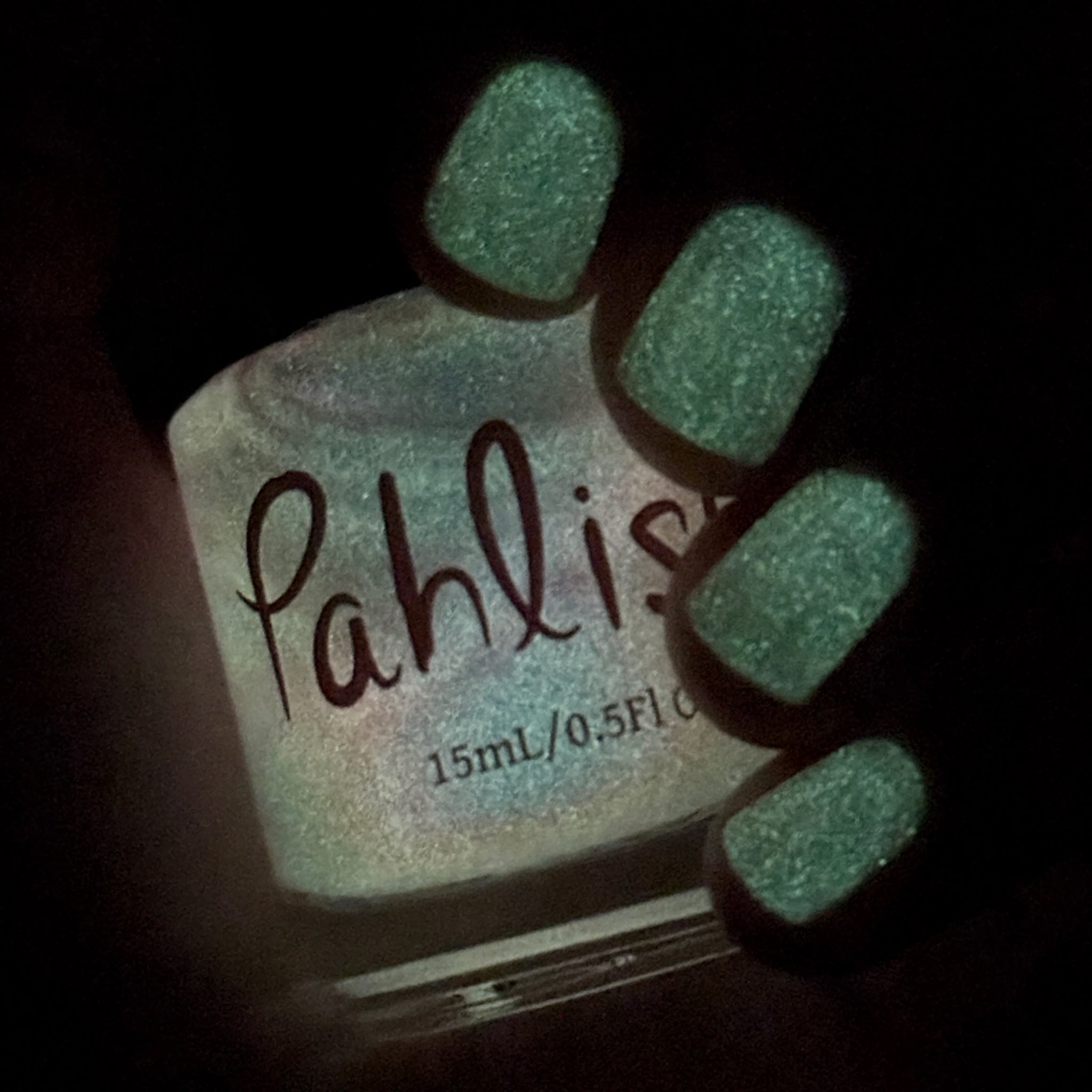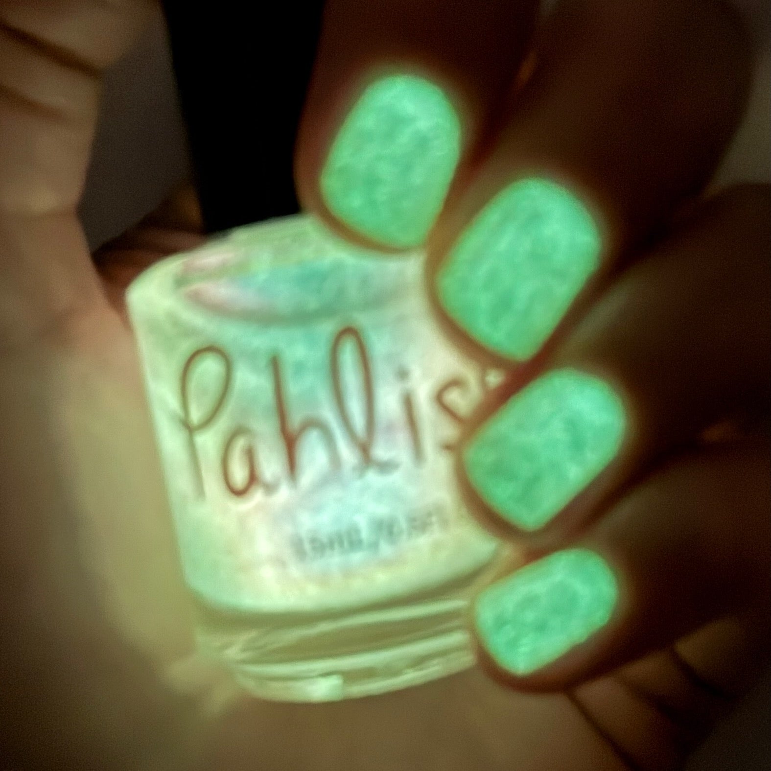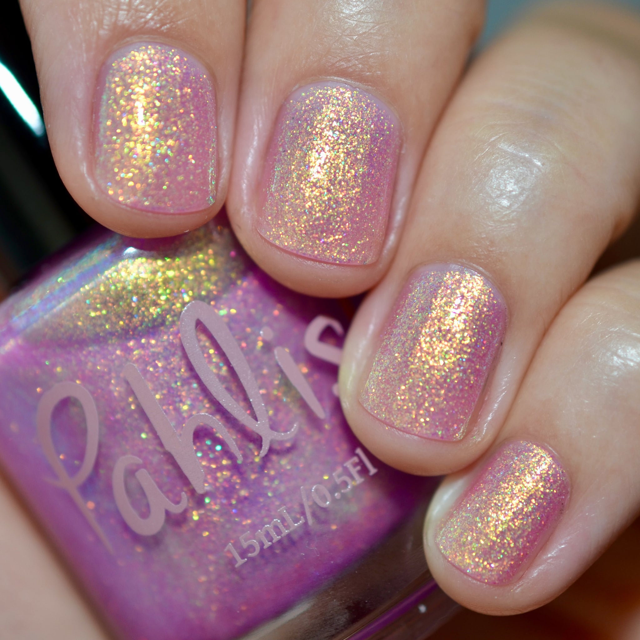 soft violet pink with golden/copper/green shifting iridescent shimmer and an eerie green glow in the dark finish