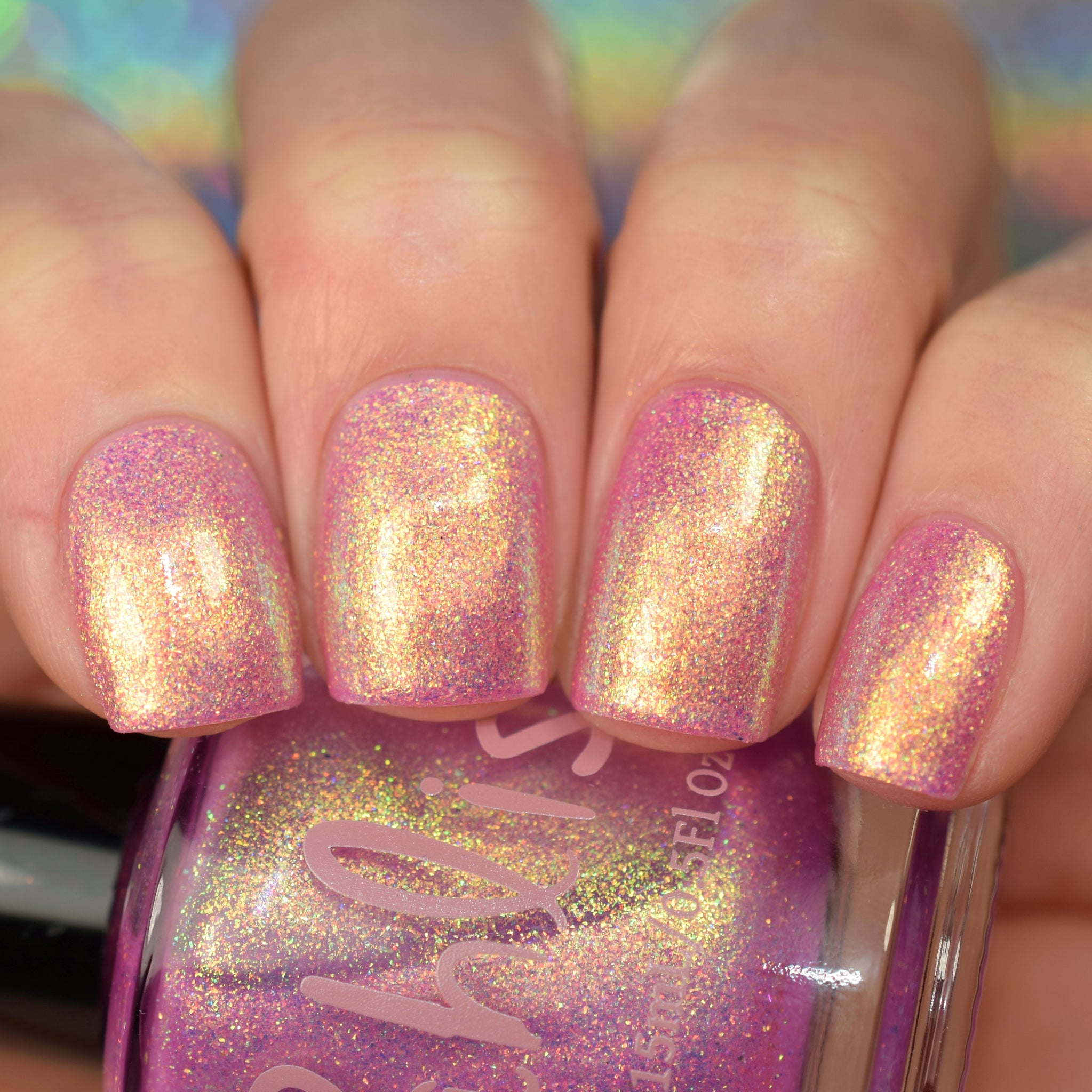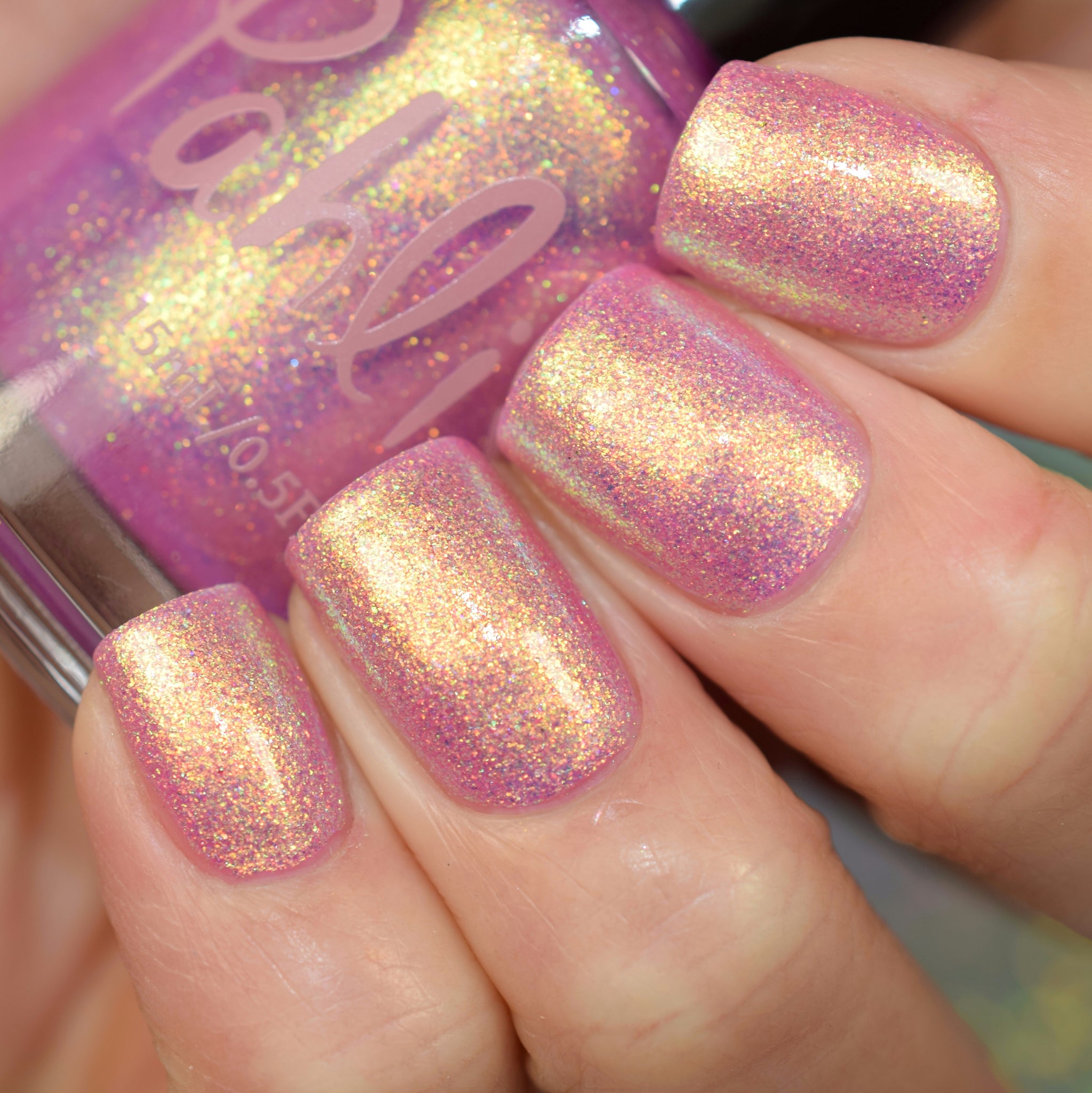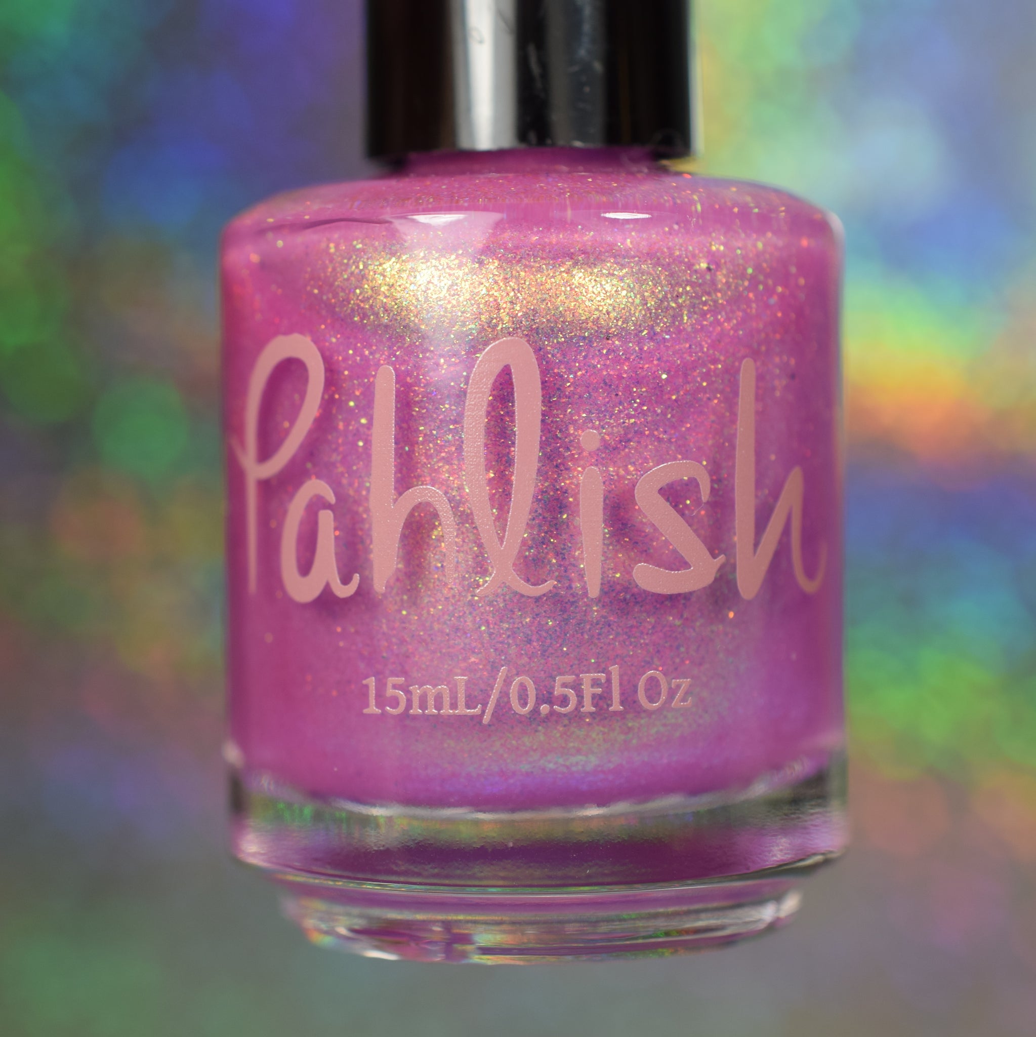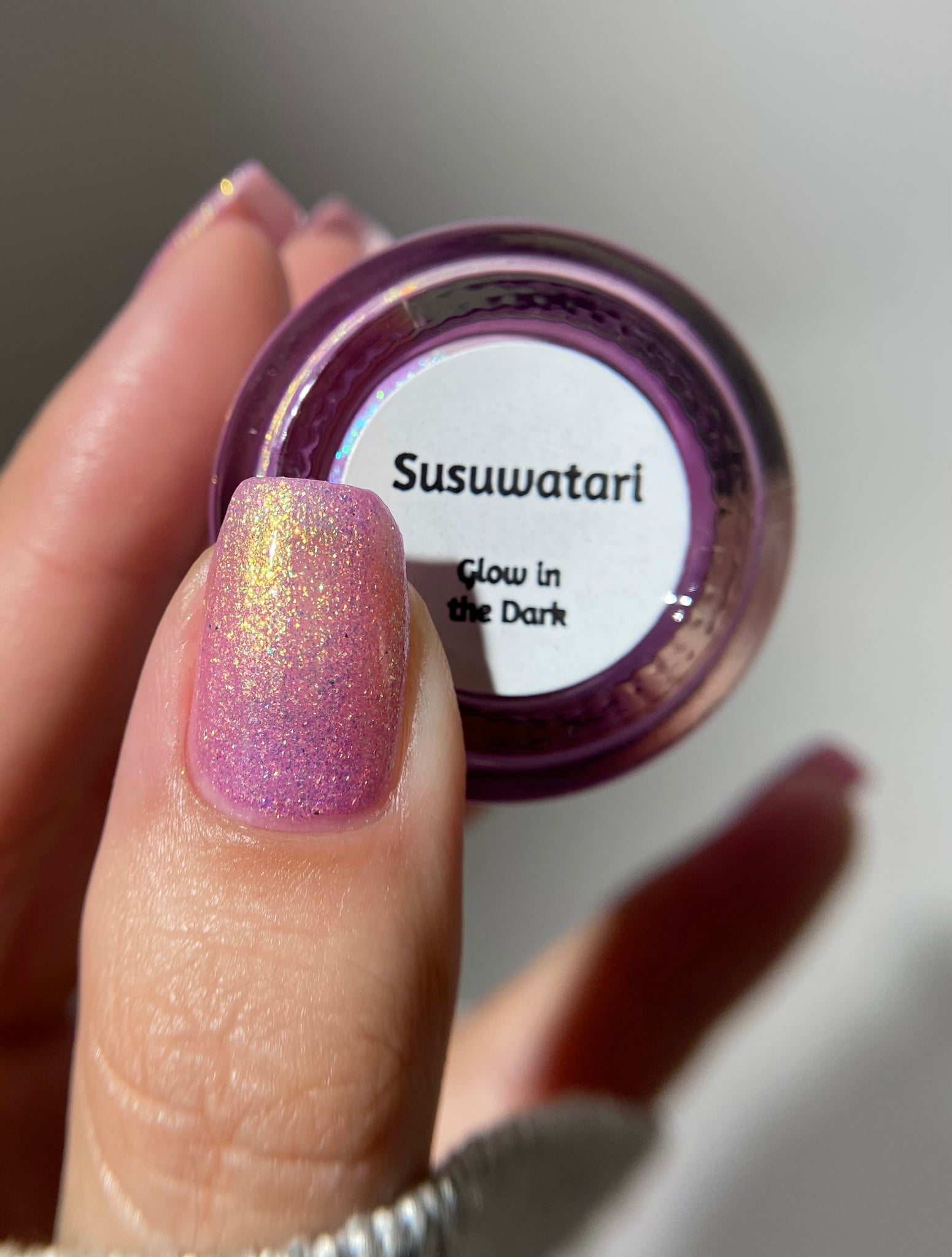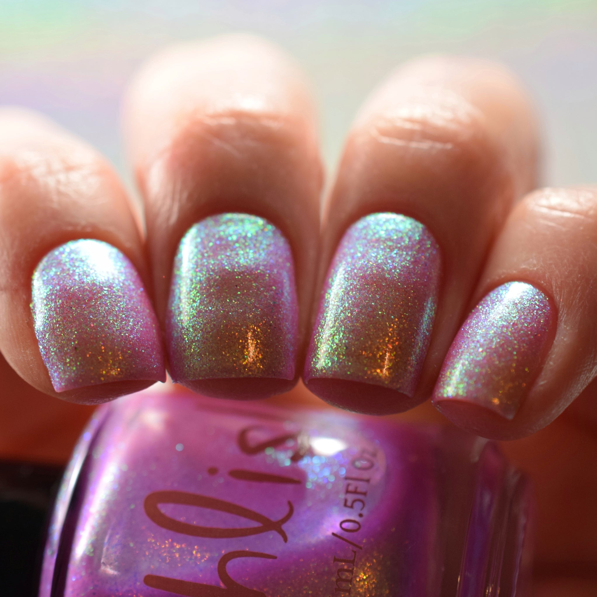 soft violet pink with golden/copper/green shifting iridescent shimmer and an eerie green glow in the dark finish