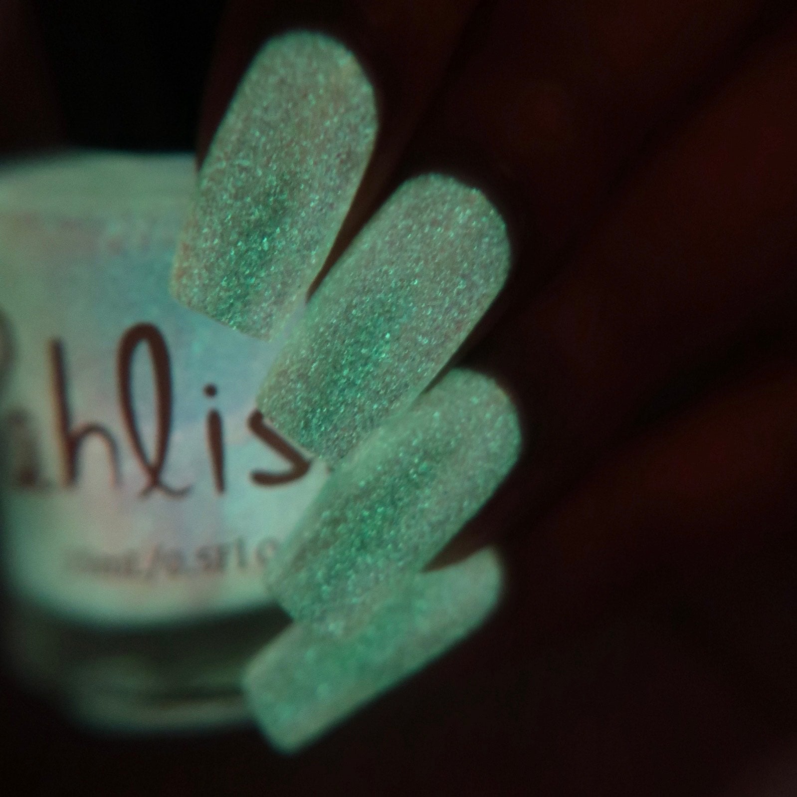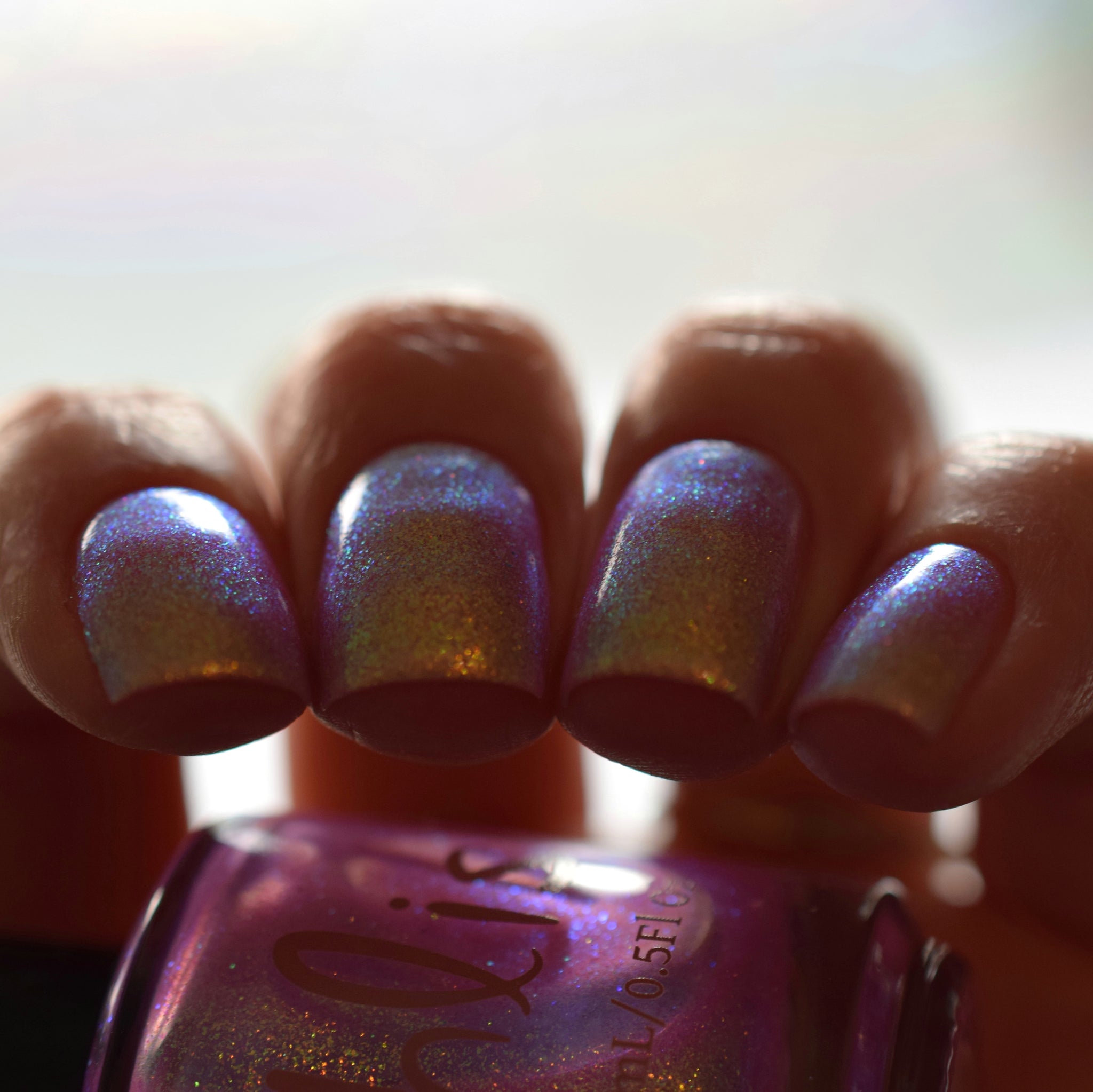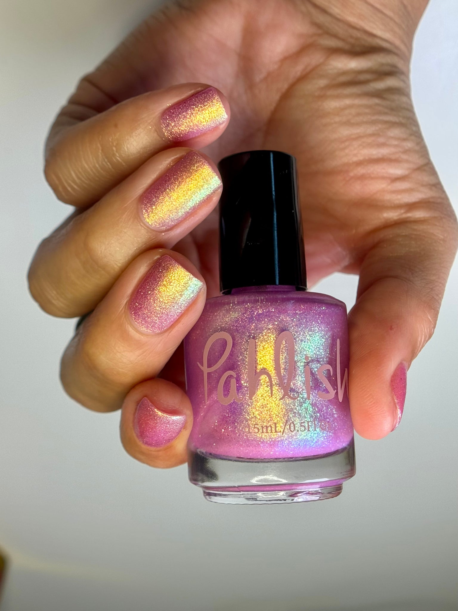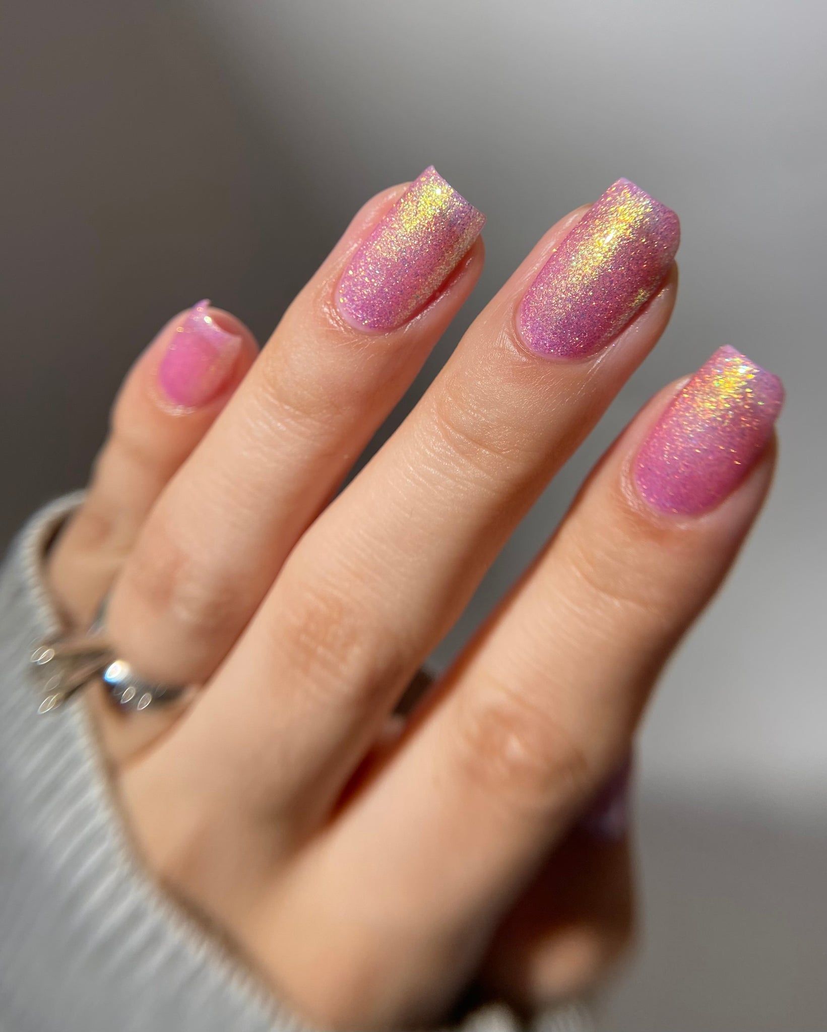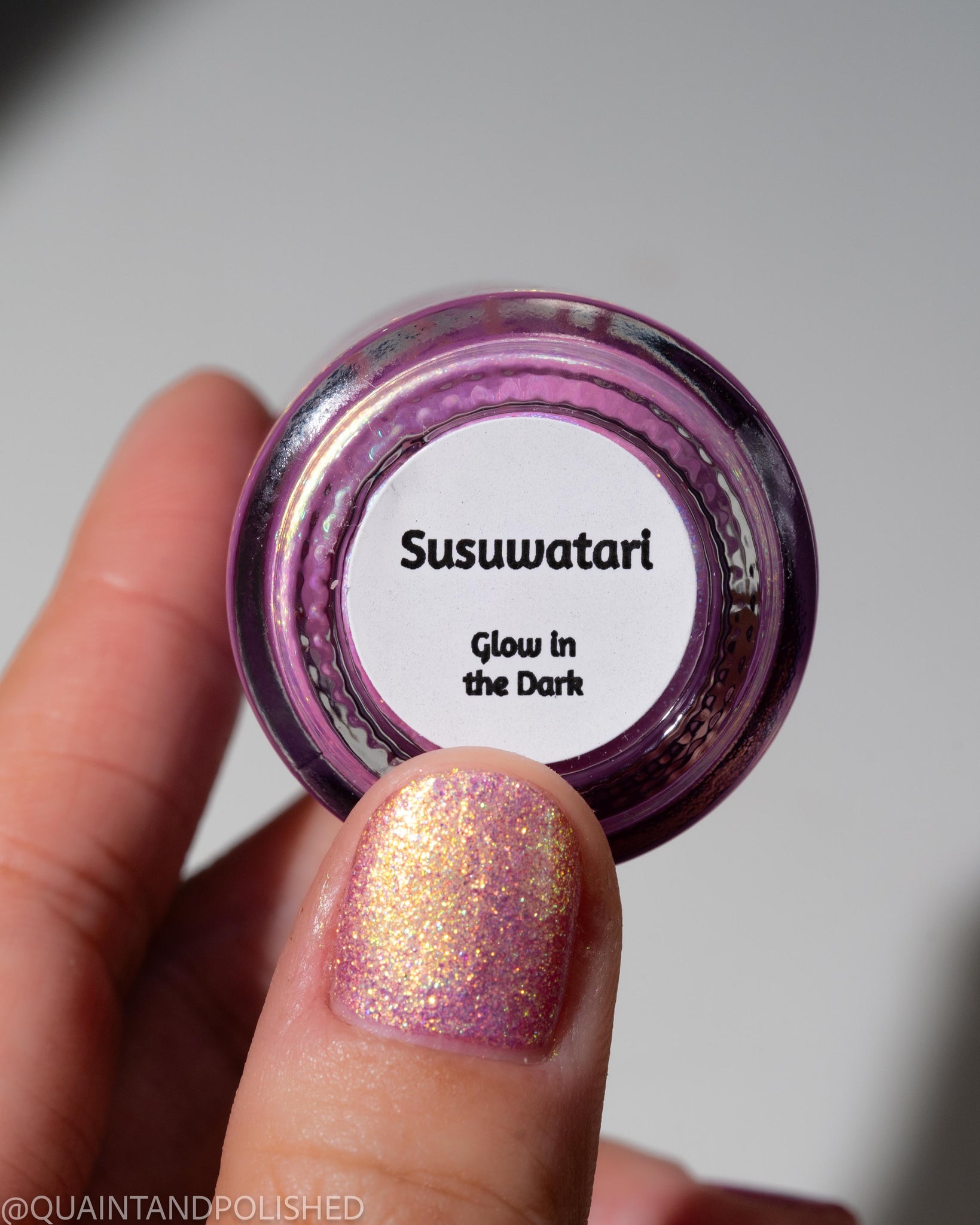 soft violet pink with golden/copper/green shifting iridescent shimmer and an eerie green glow in the dark finish