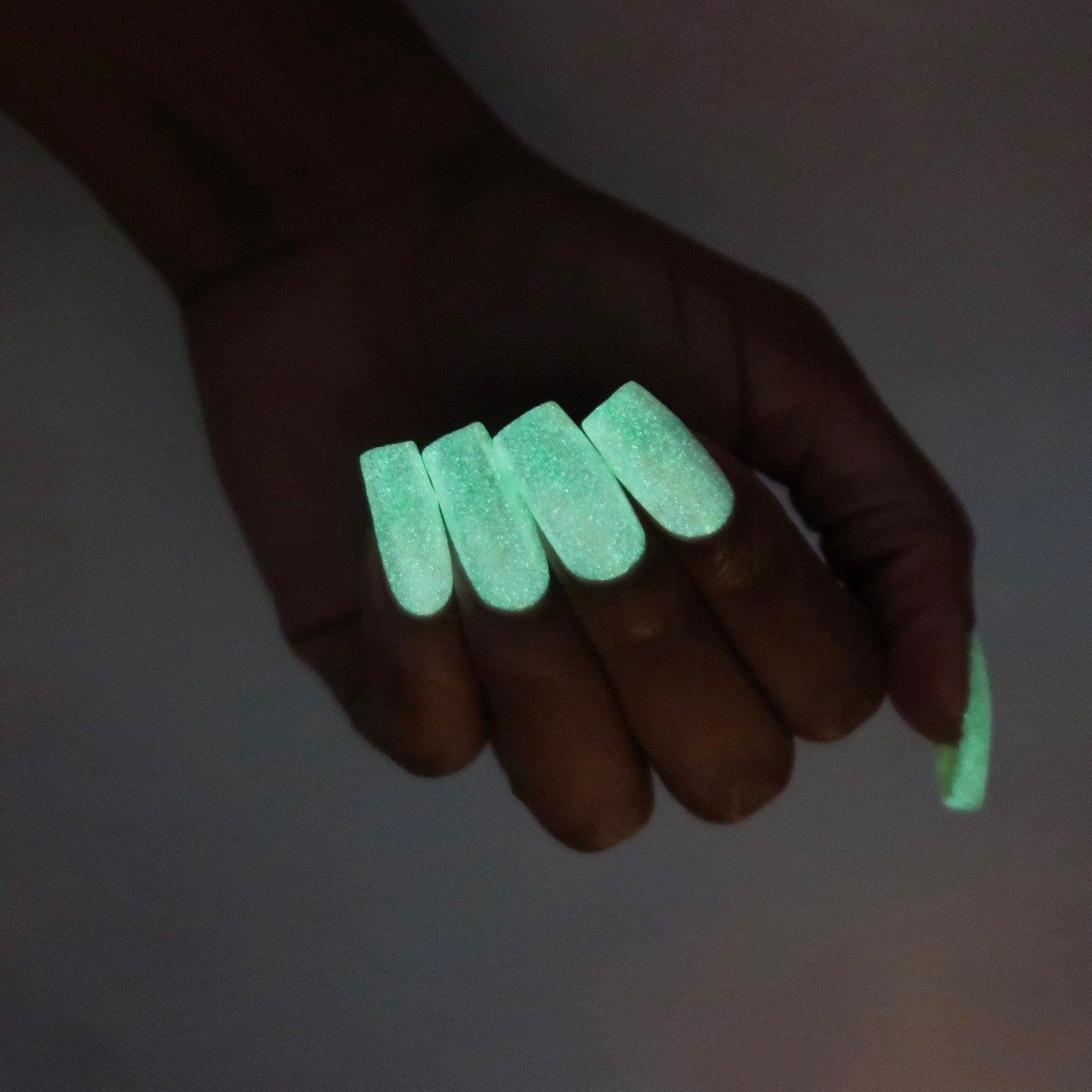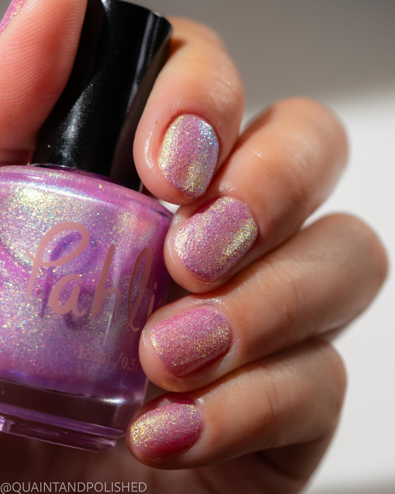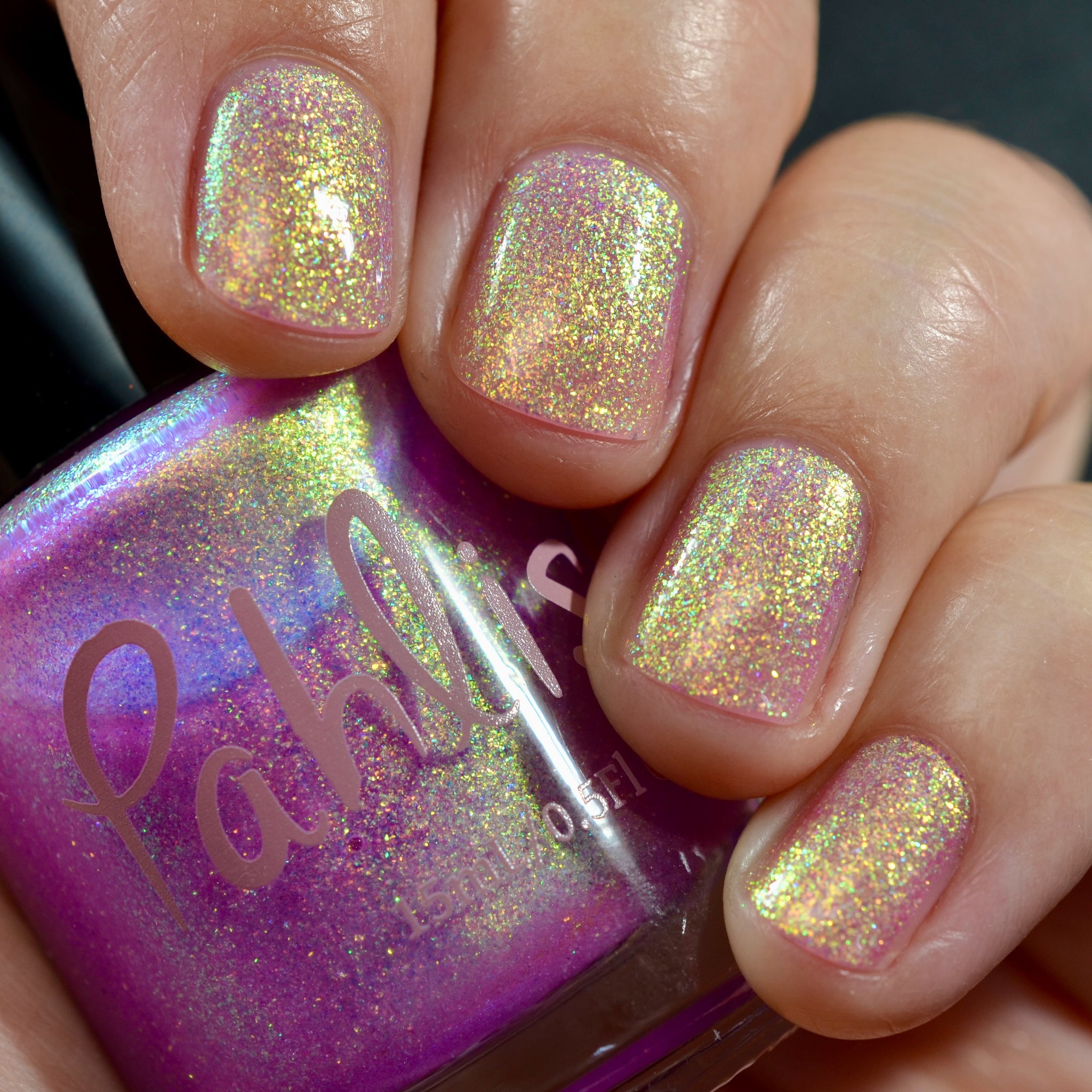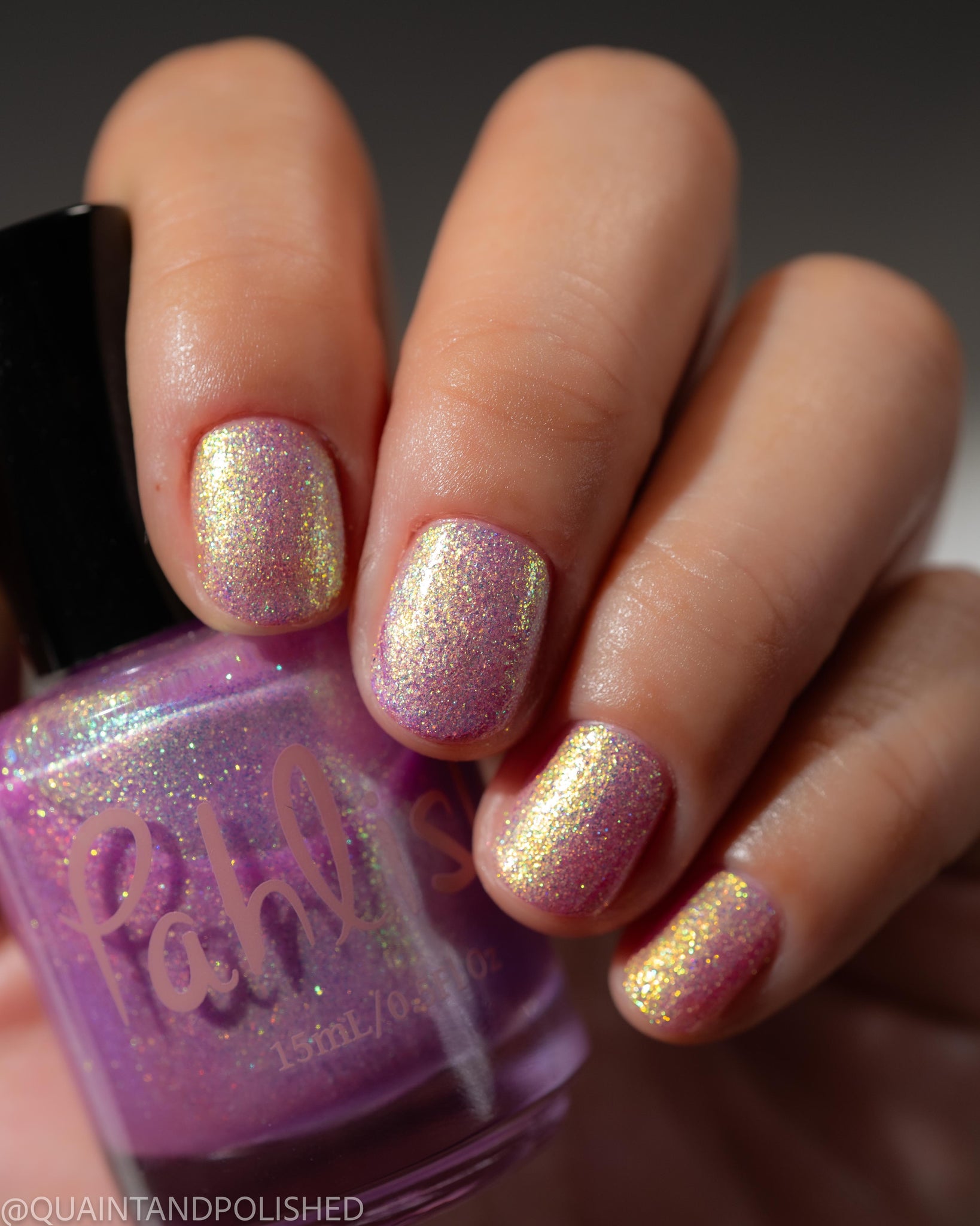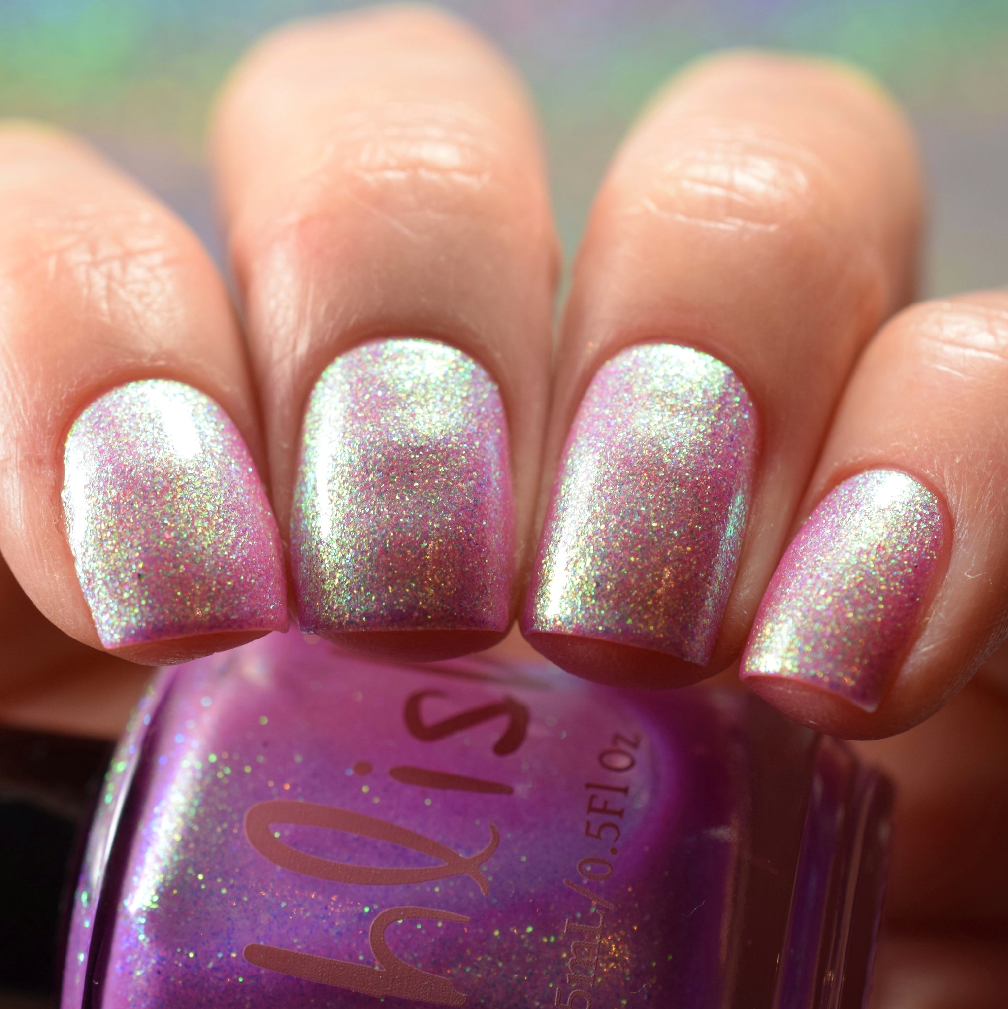 soft violet pink with golden/copper/green shifting iridescent shimmer and an eerie green glow in the dark finish