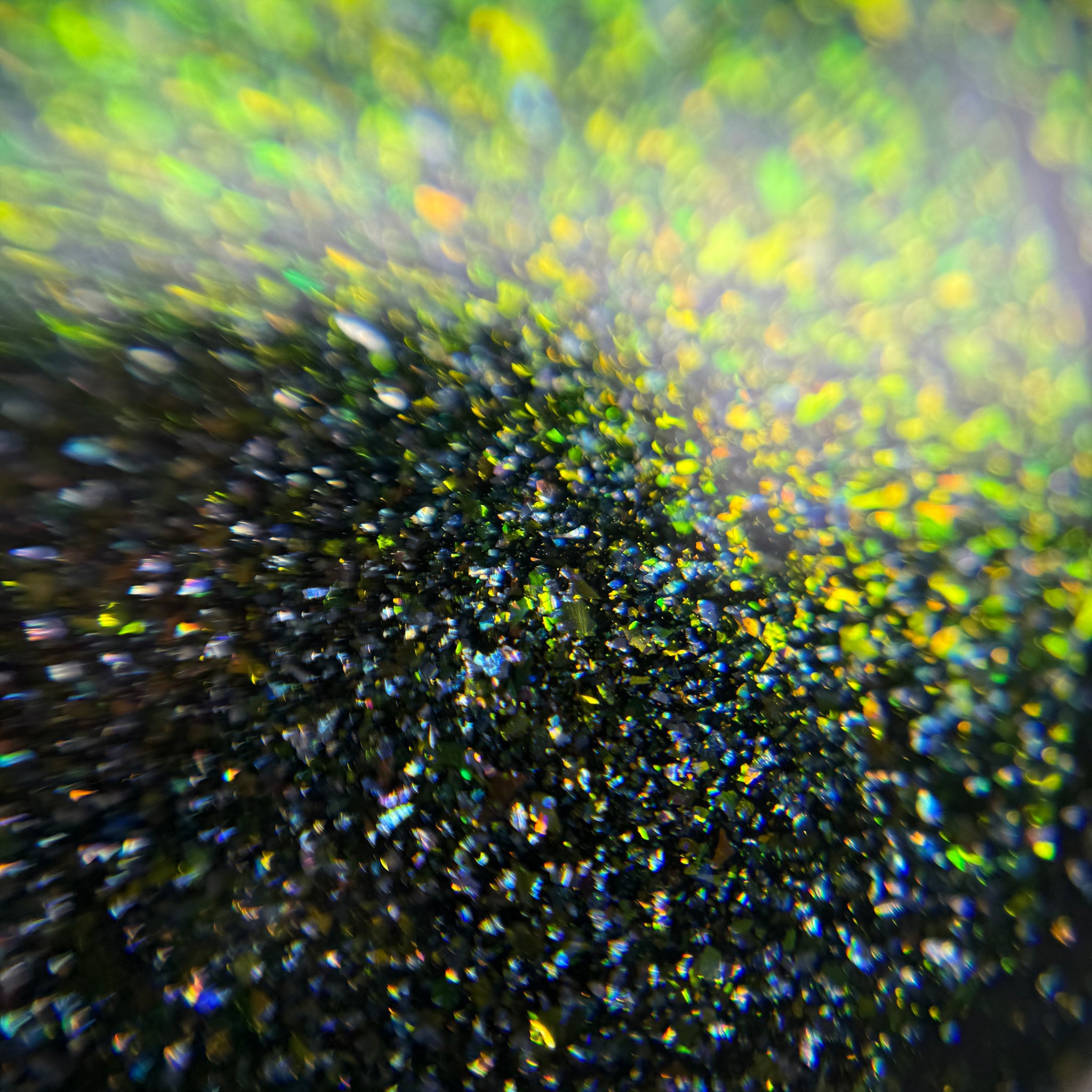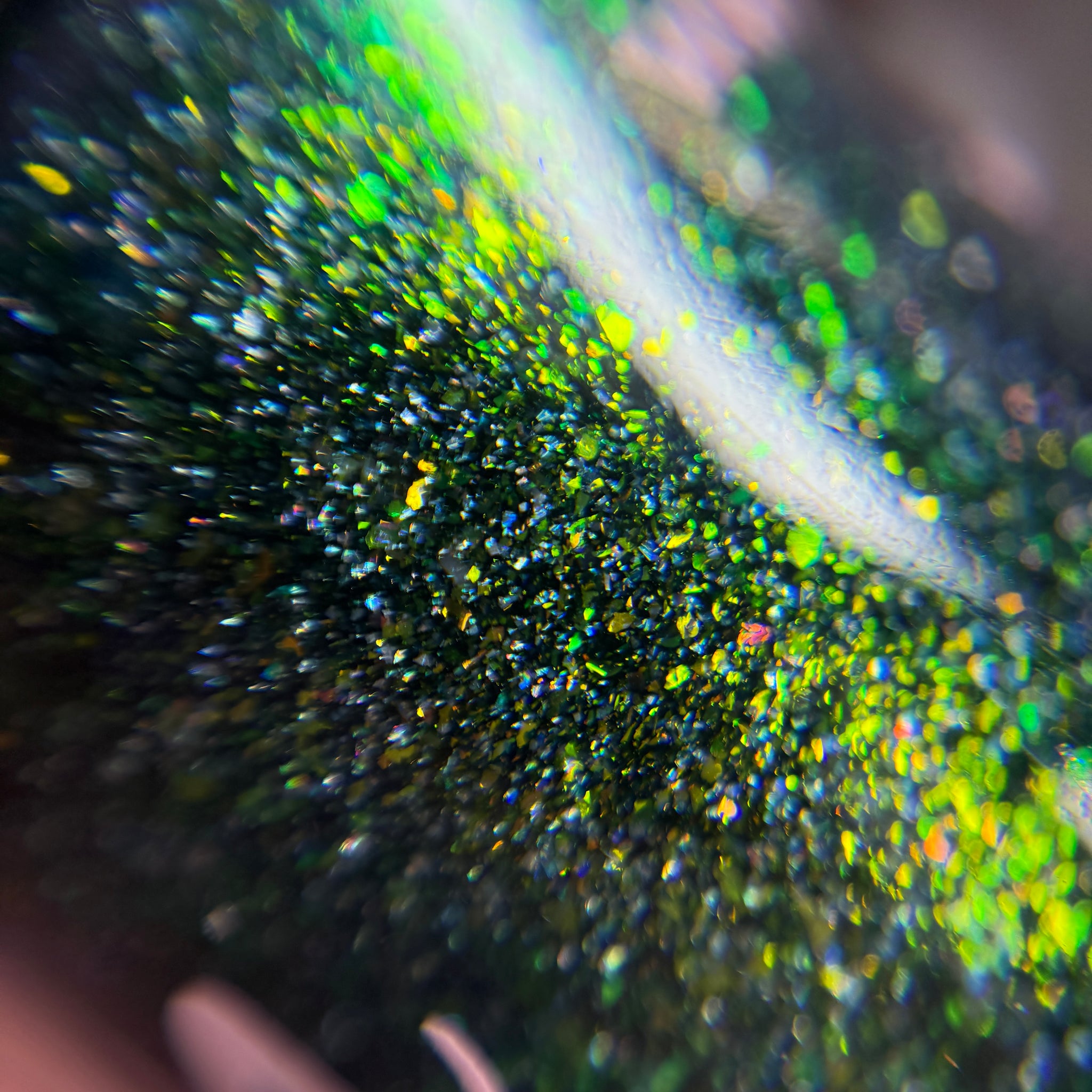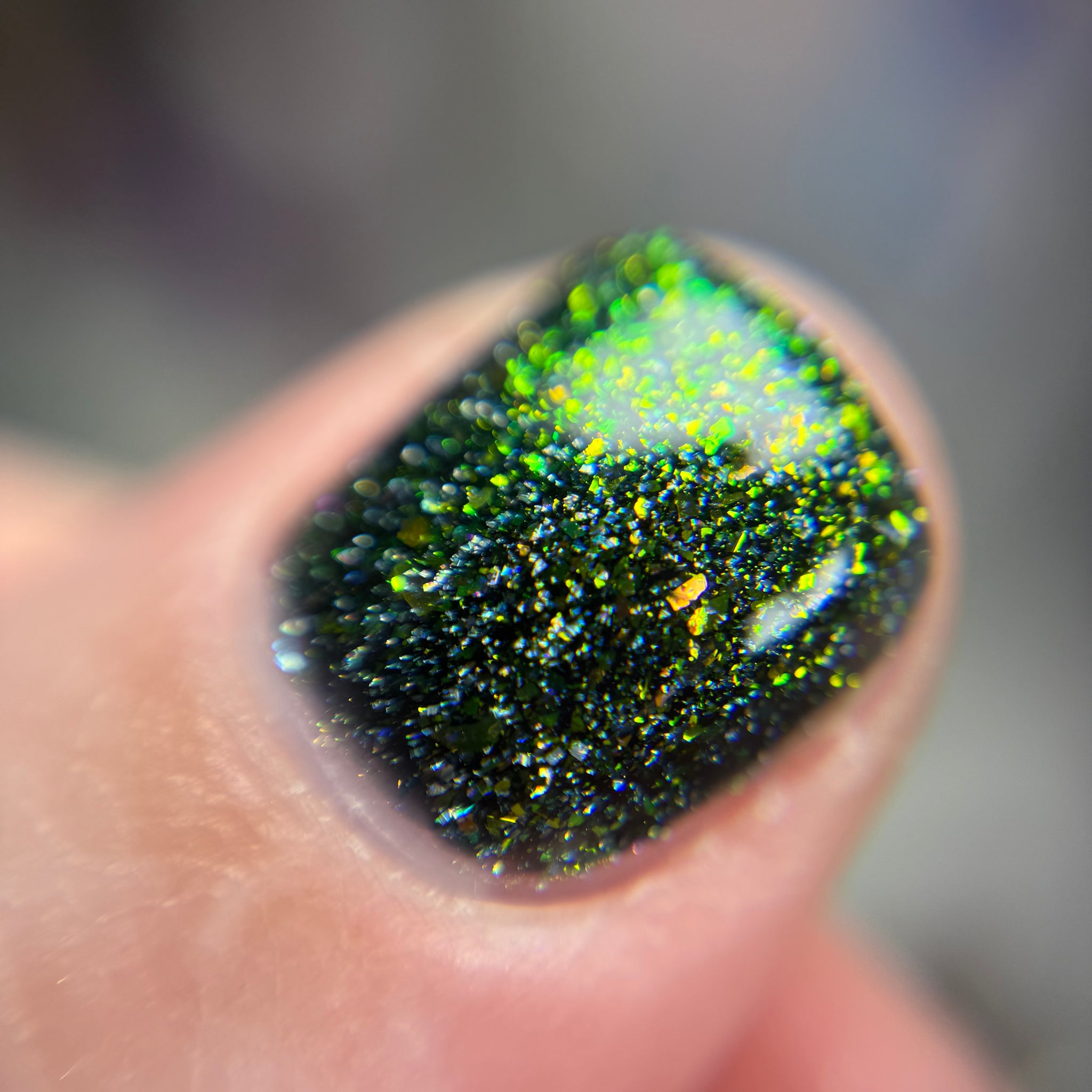 Rich spruce blue base packed with iridescent copper/green shifting flakes and holographic flakes