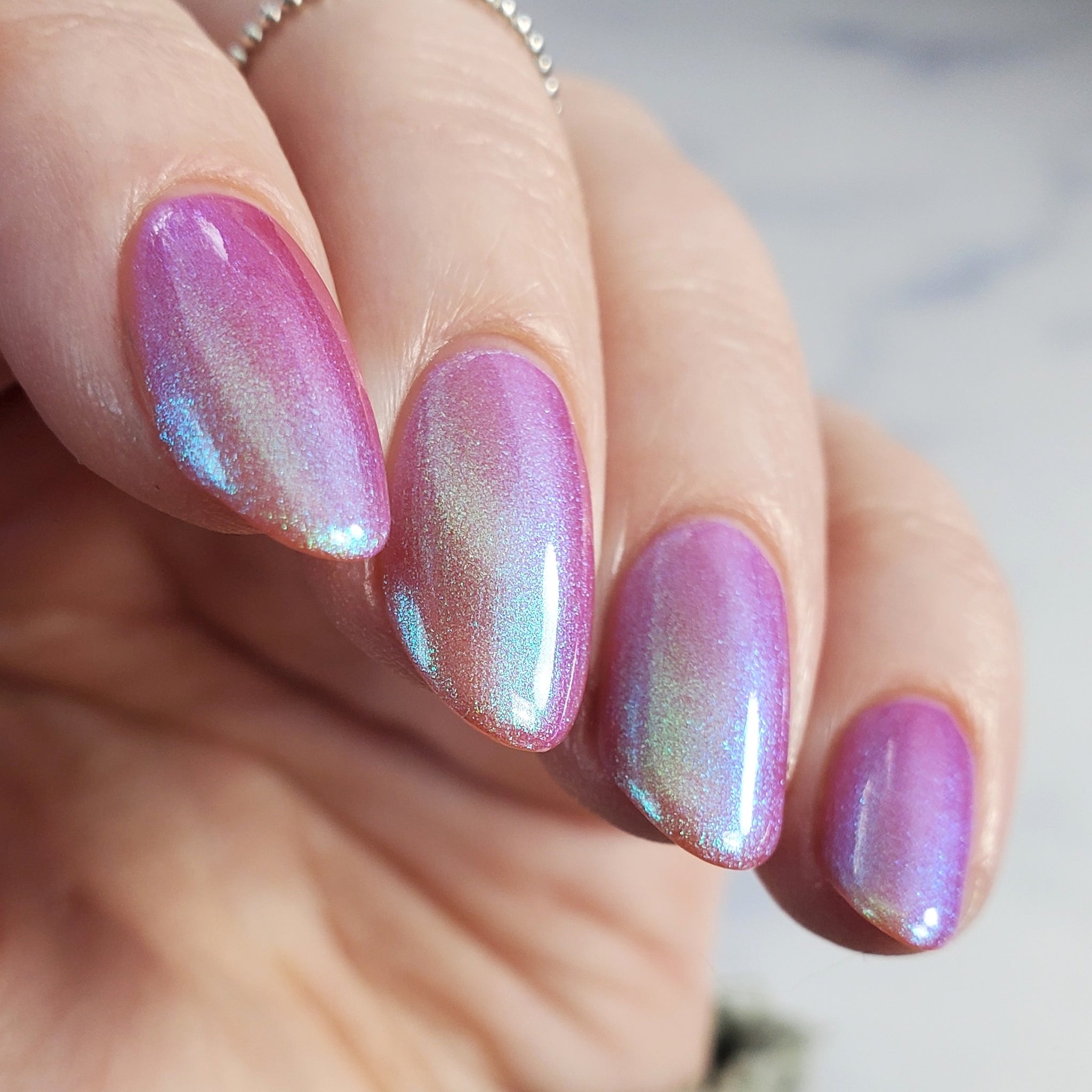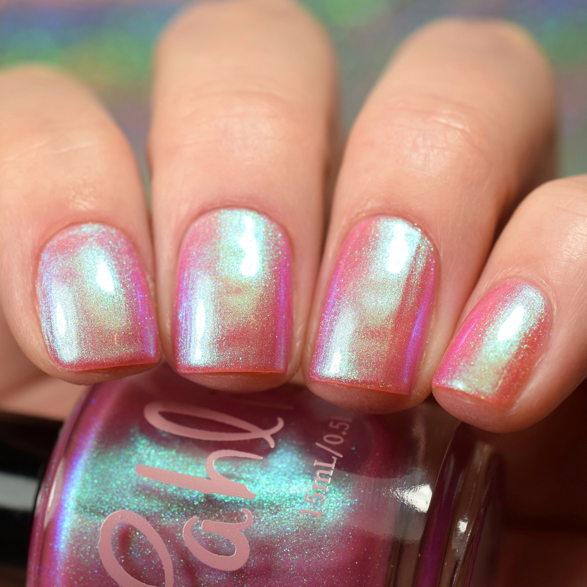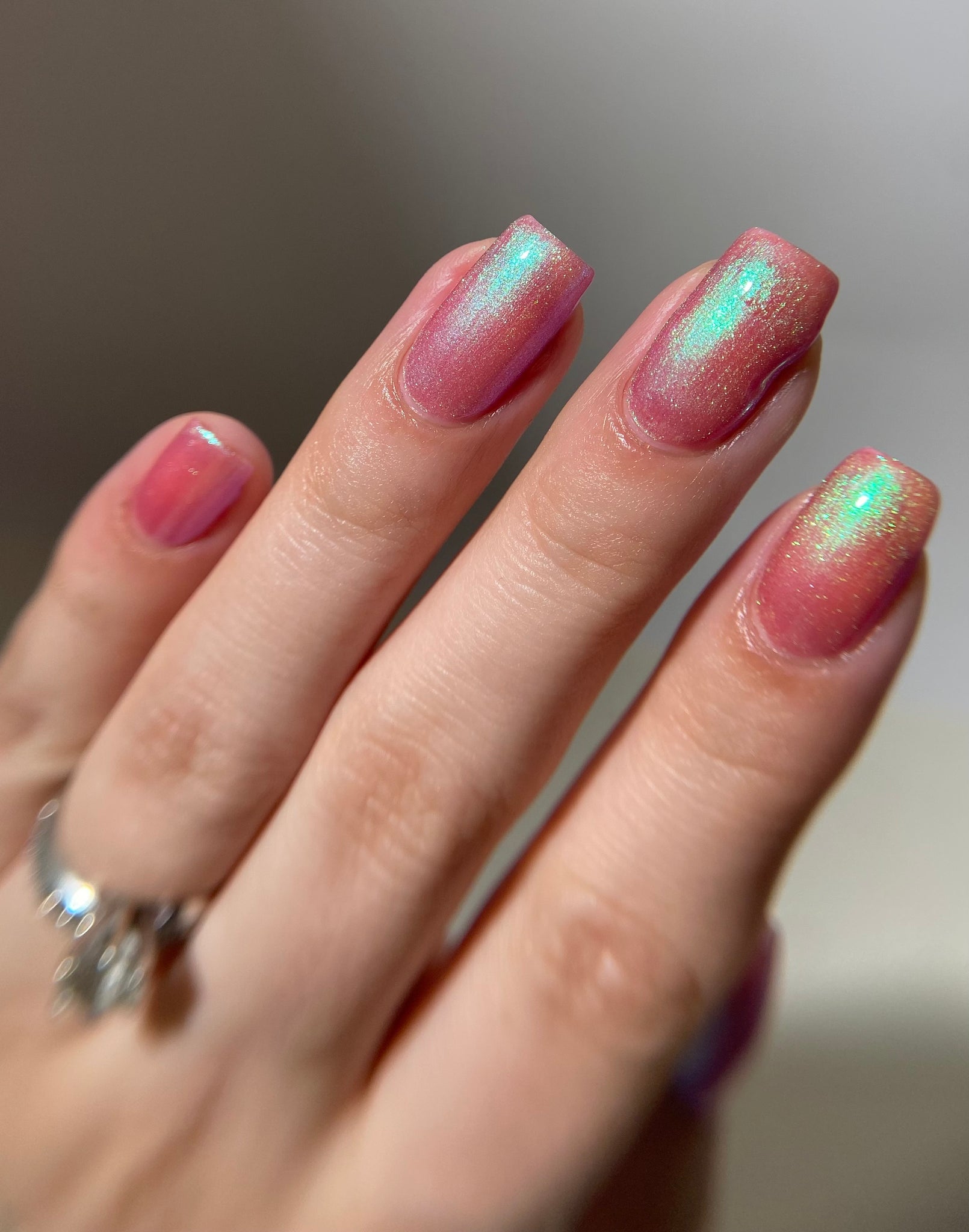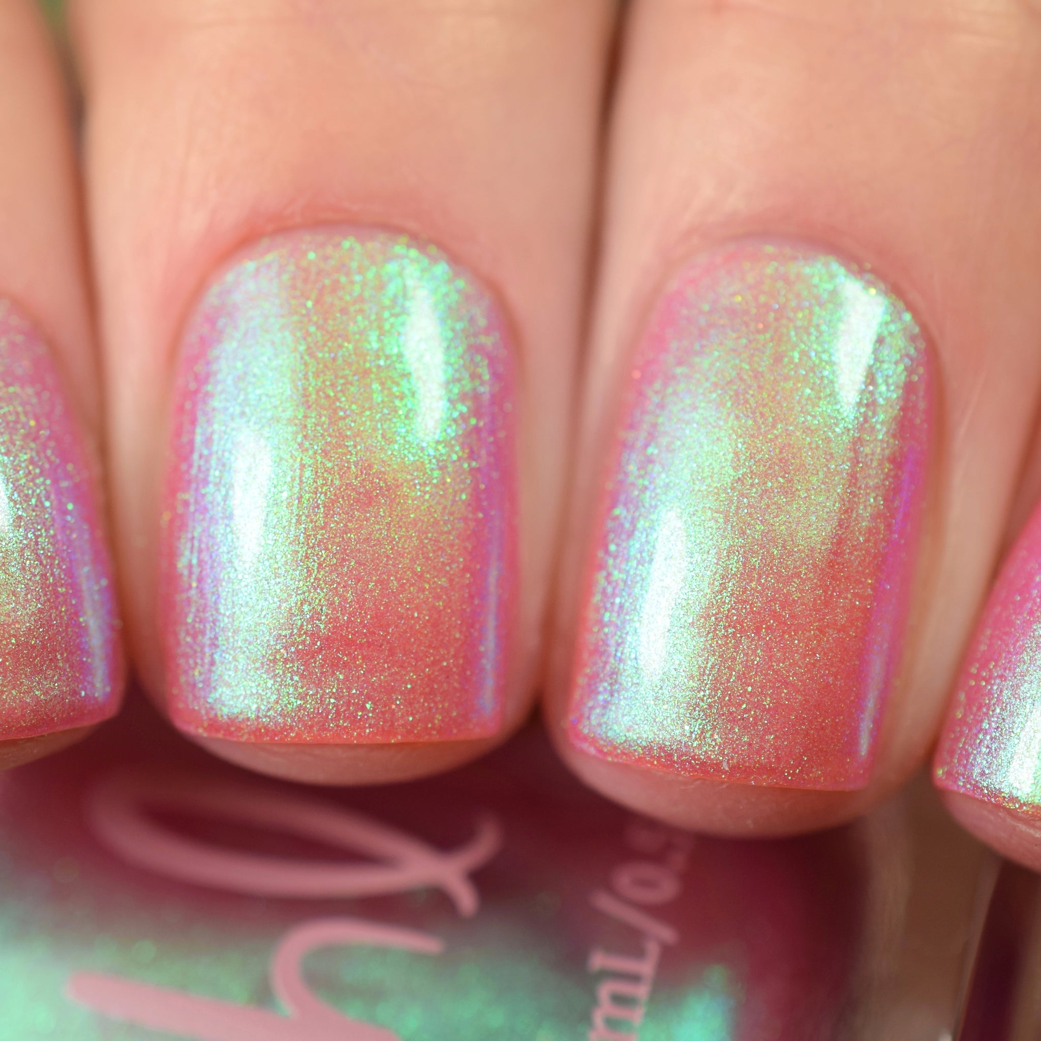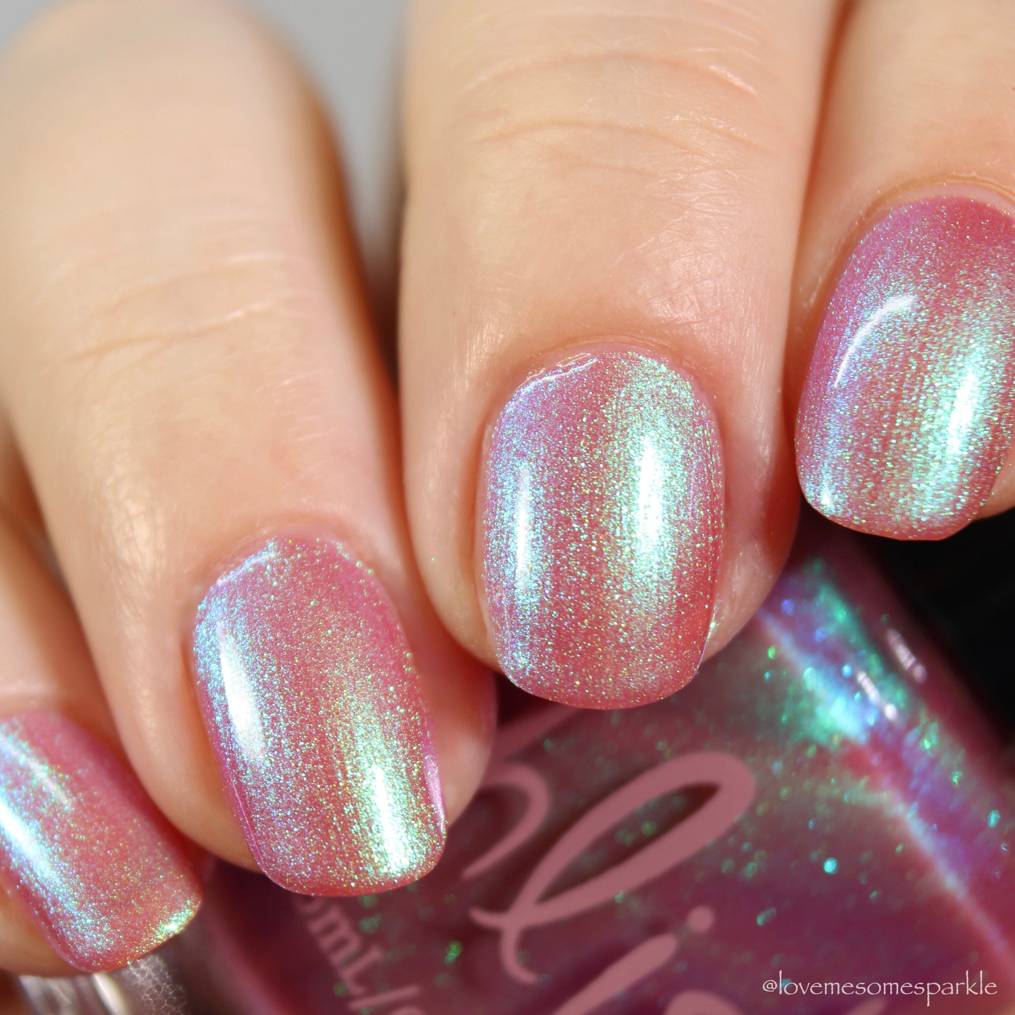 warm rosy pink packed with iridescent aqua/teal/blue shifting shimmer