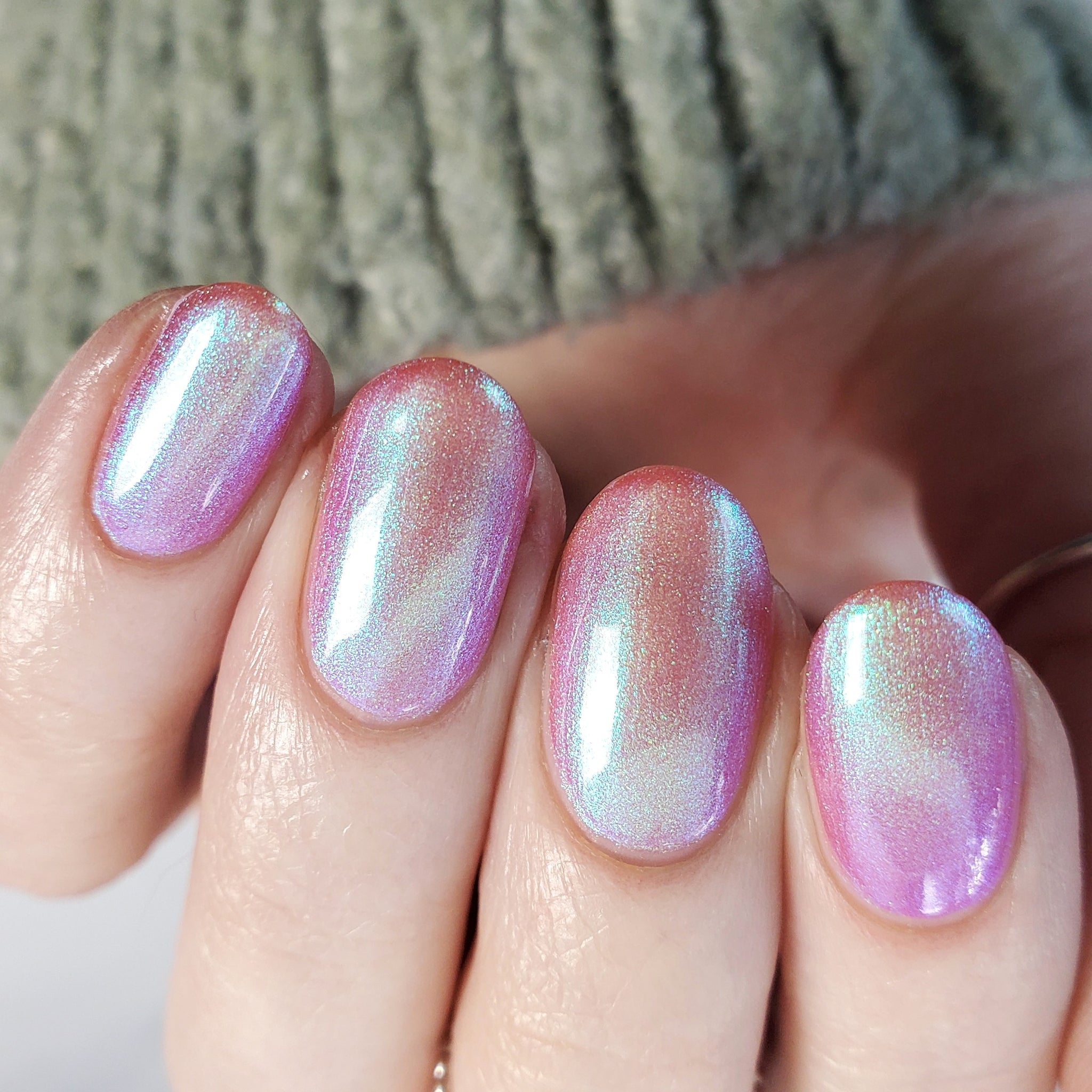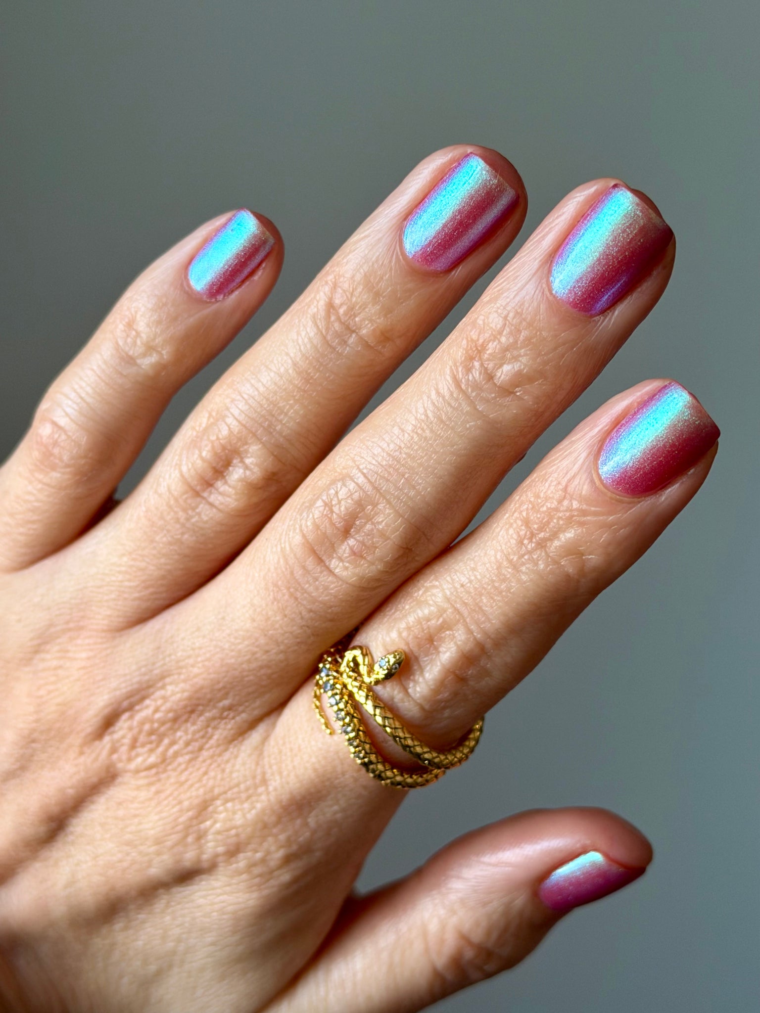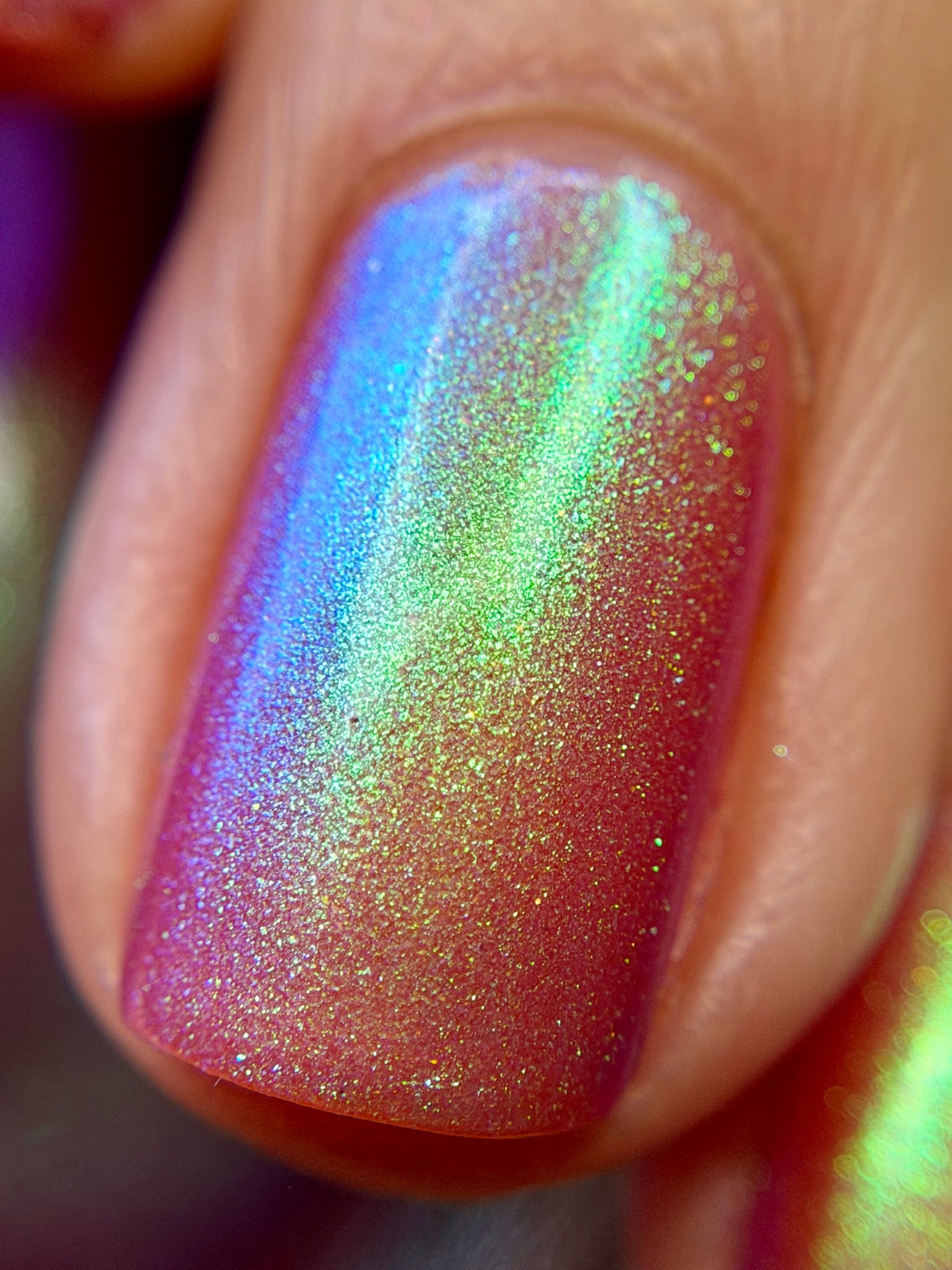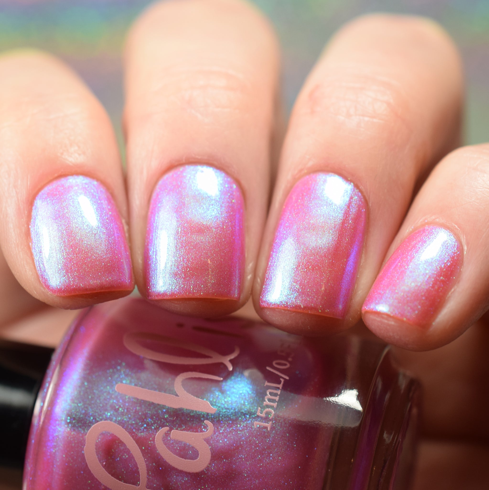 warm rosy pink packed with iridescent aqua/teal/blue shifting shimmer