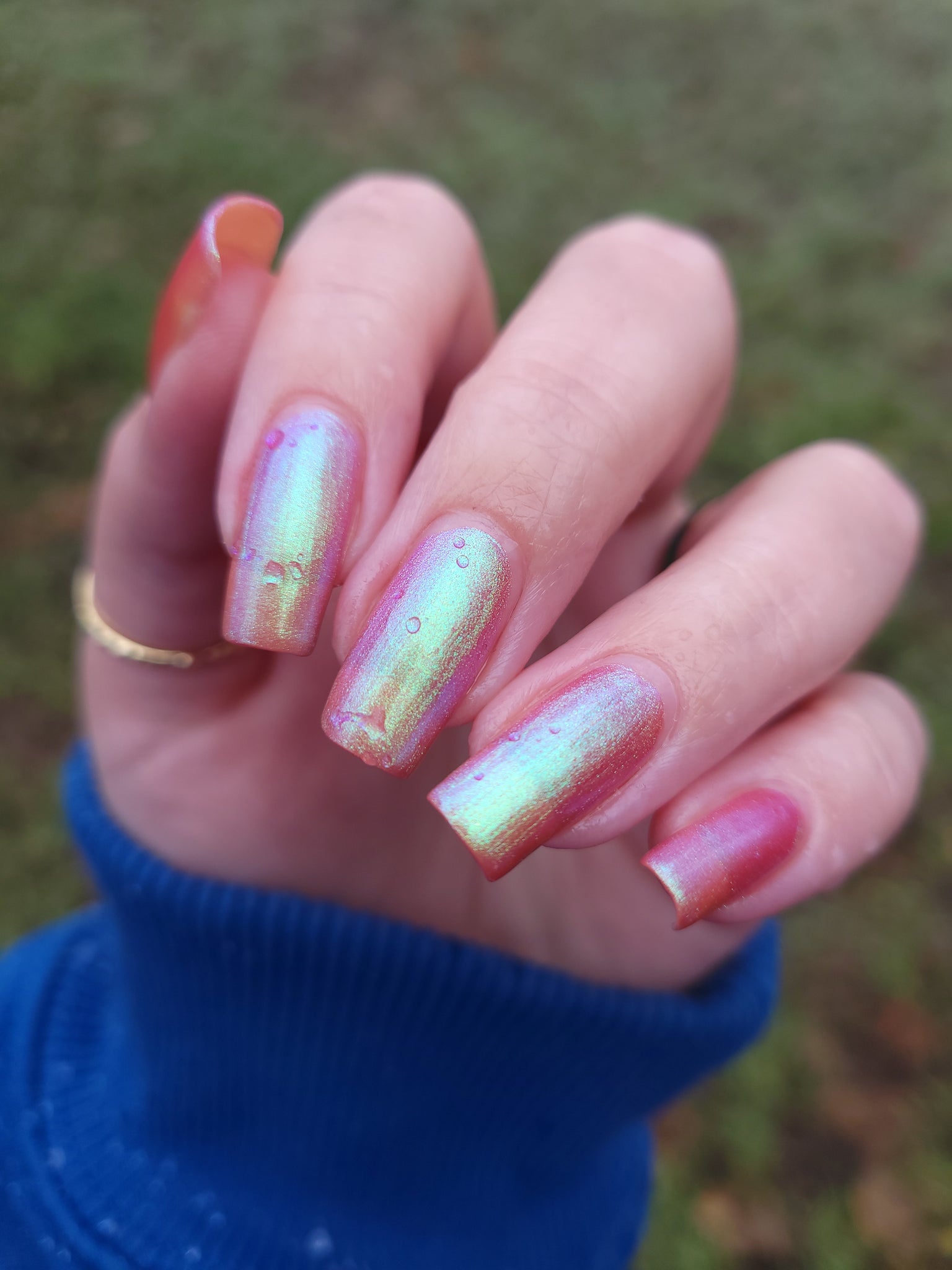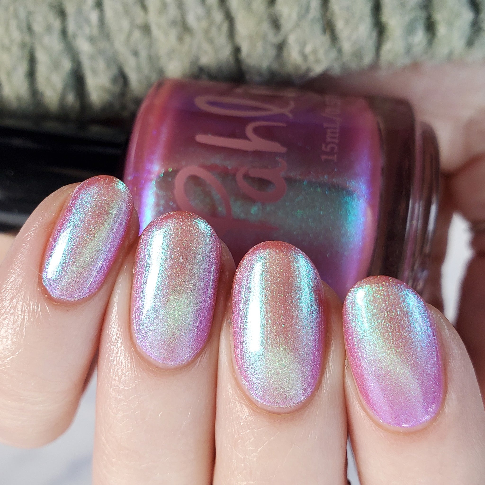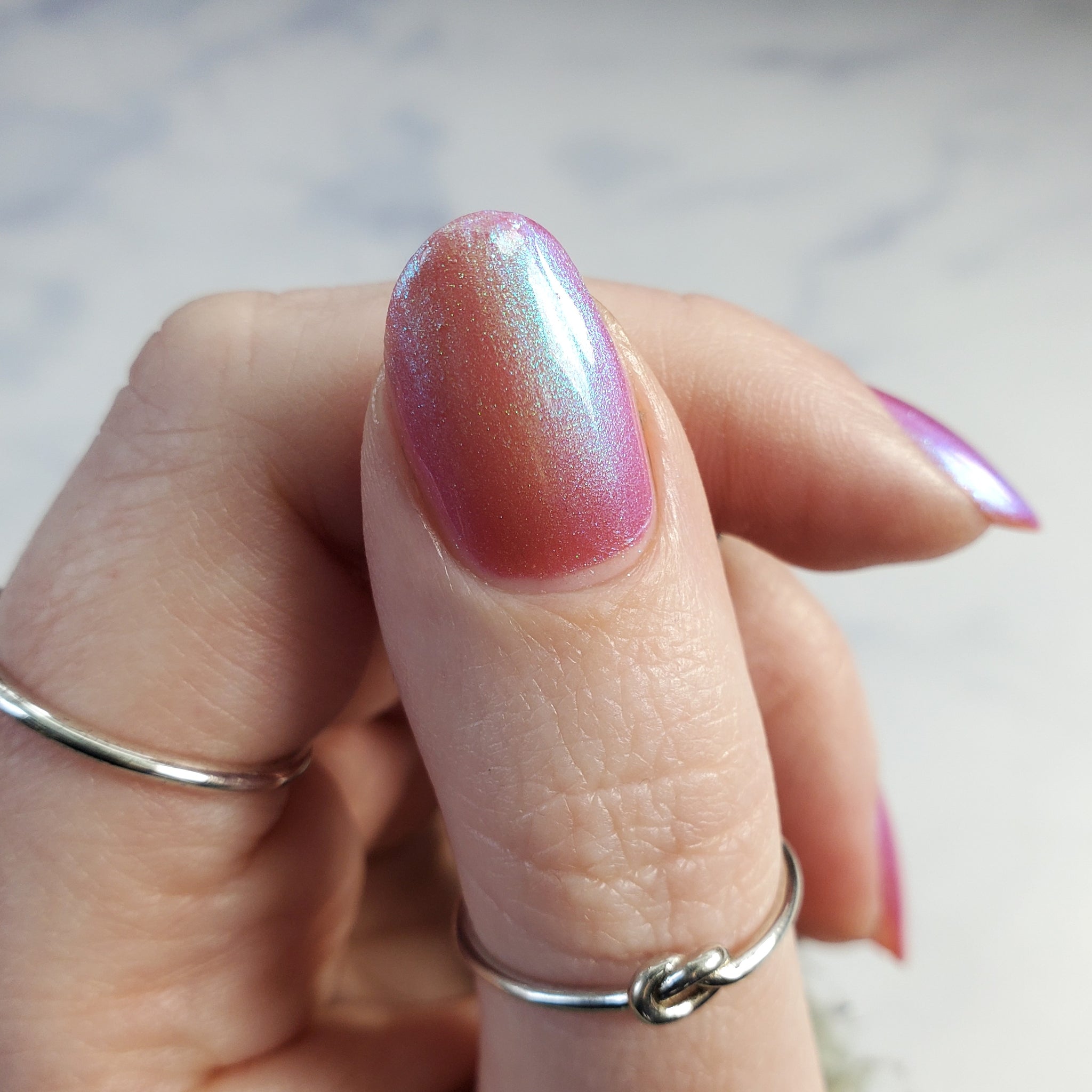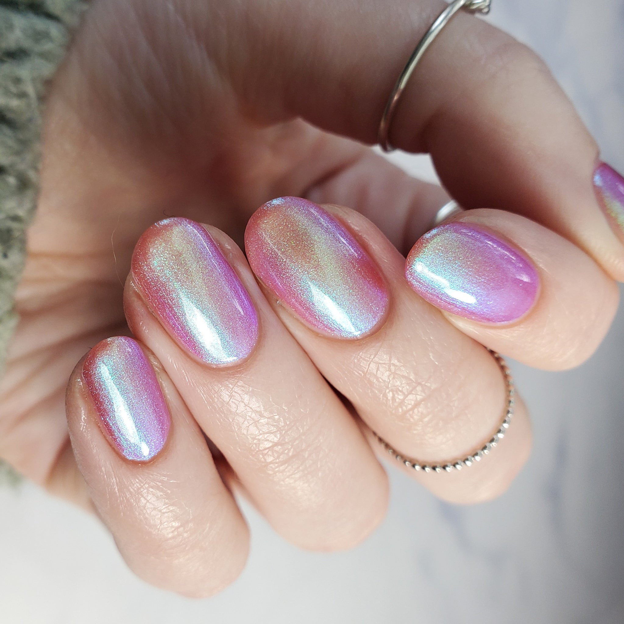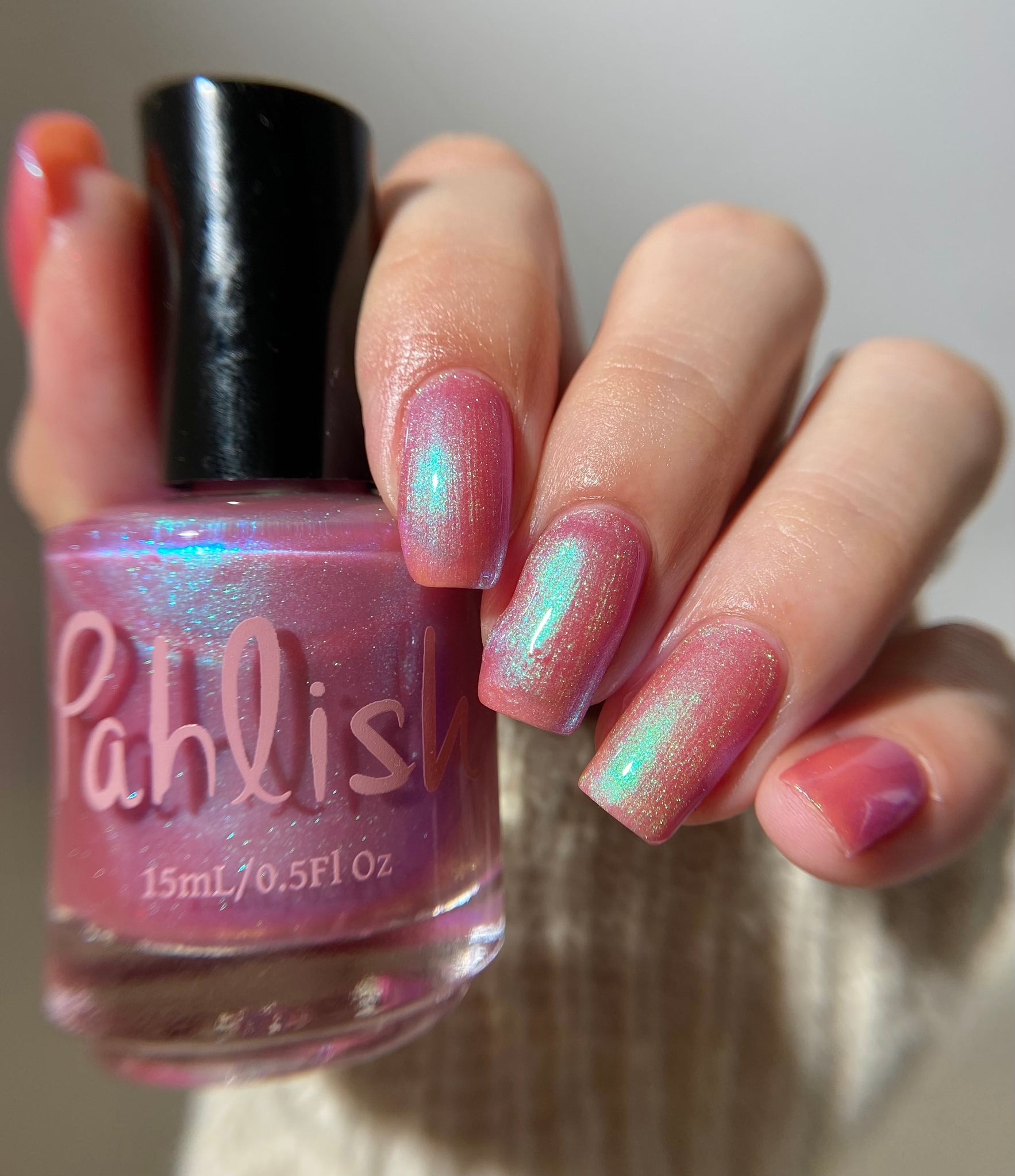warm rosy pink packed with iridescent aqua/teal/blue shifting shimmer