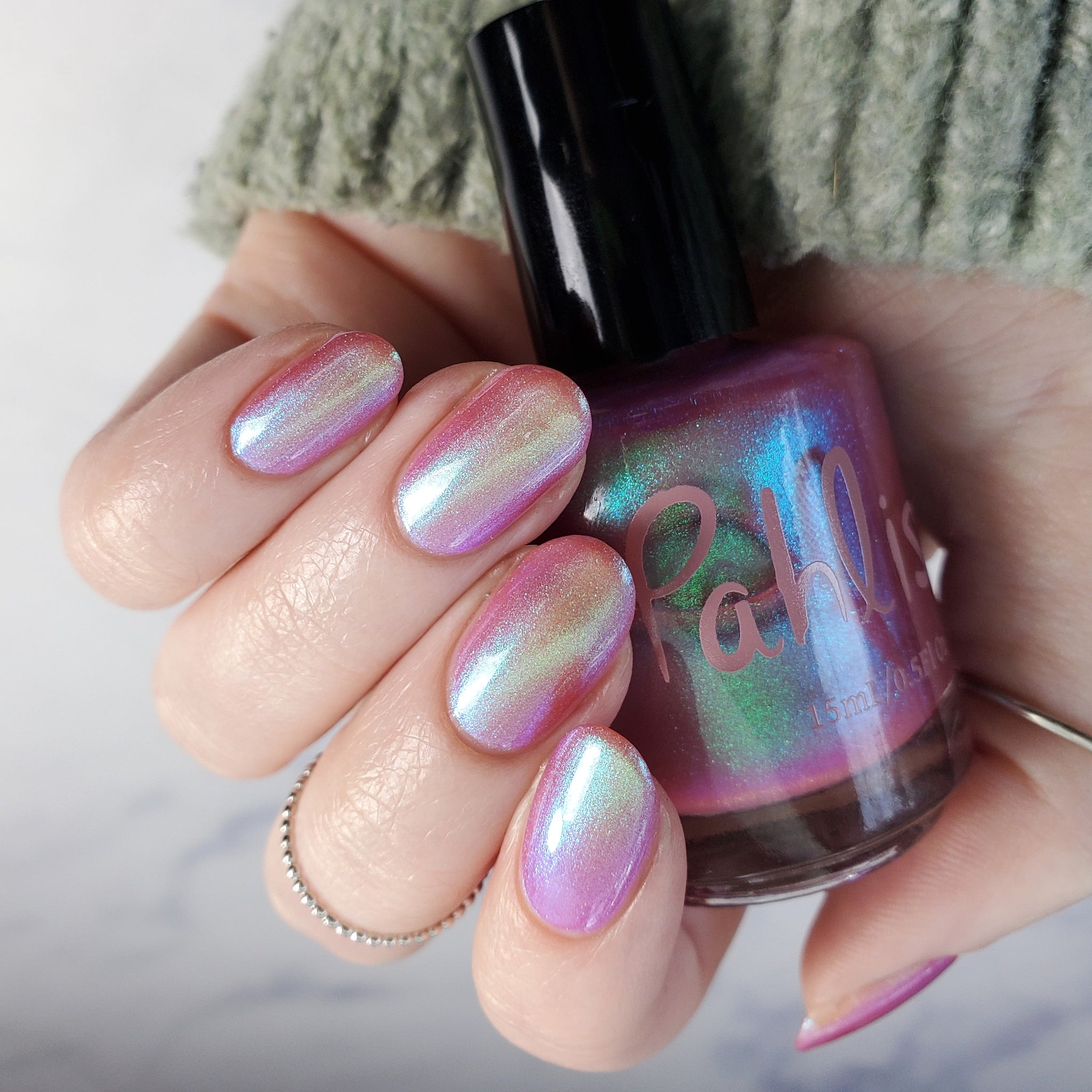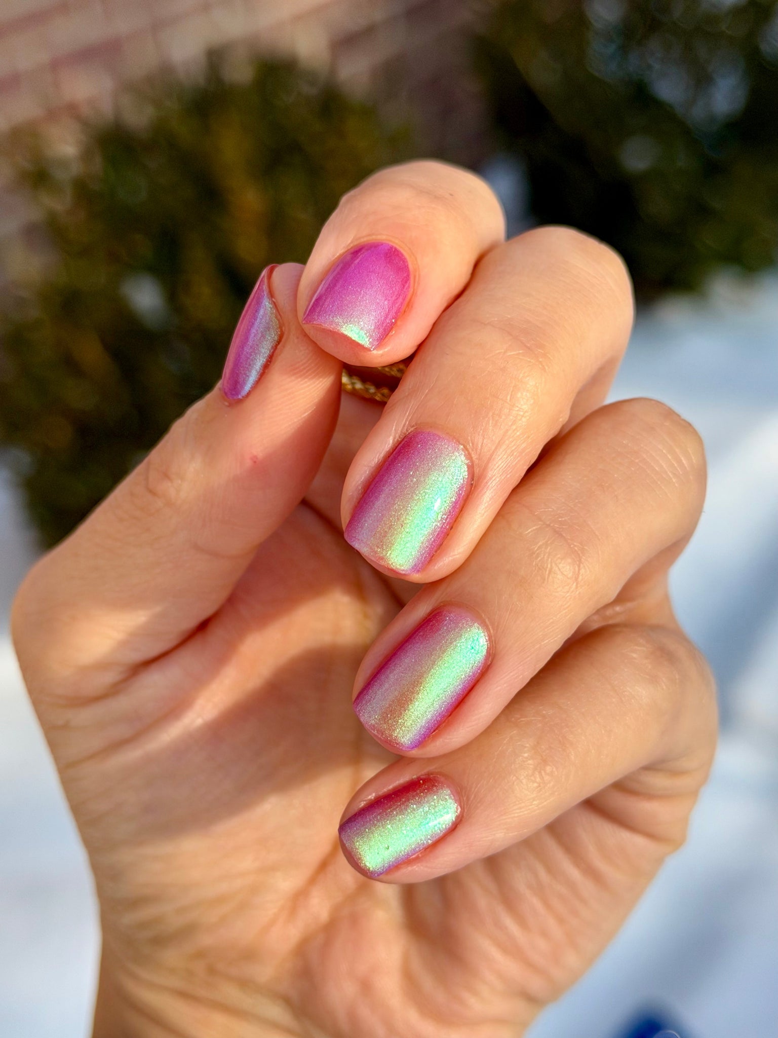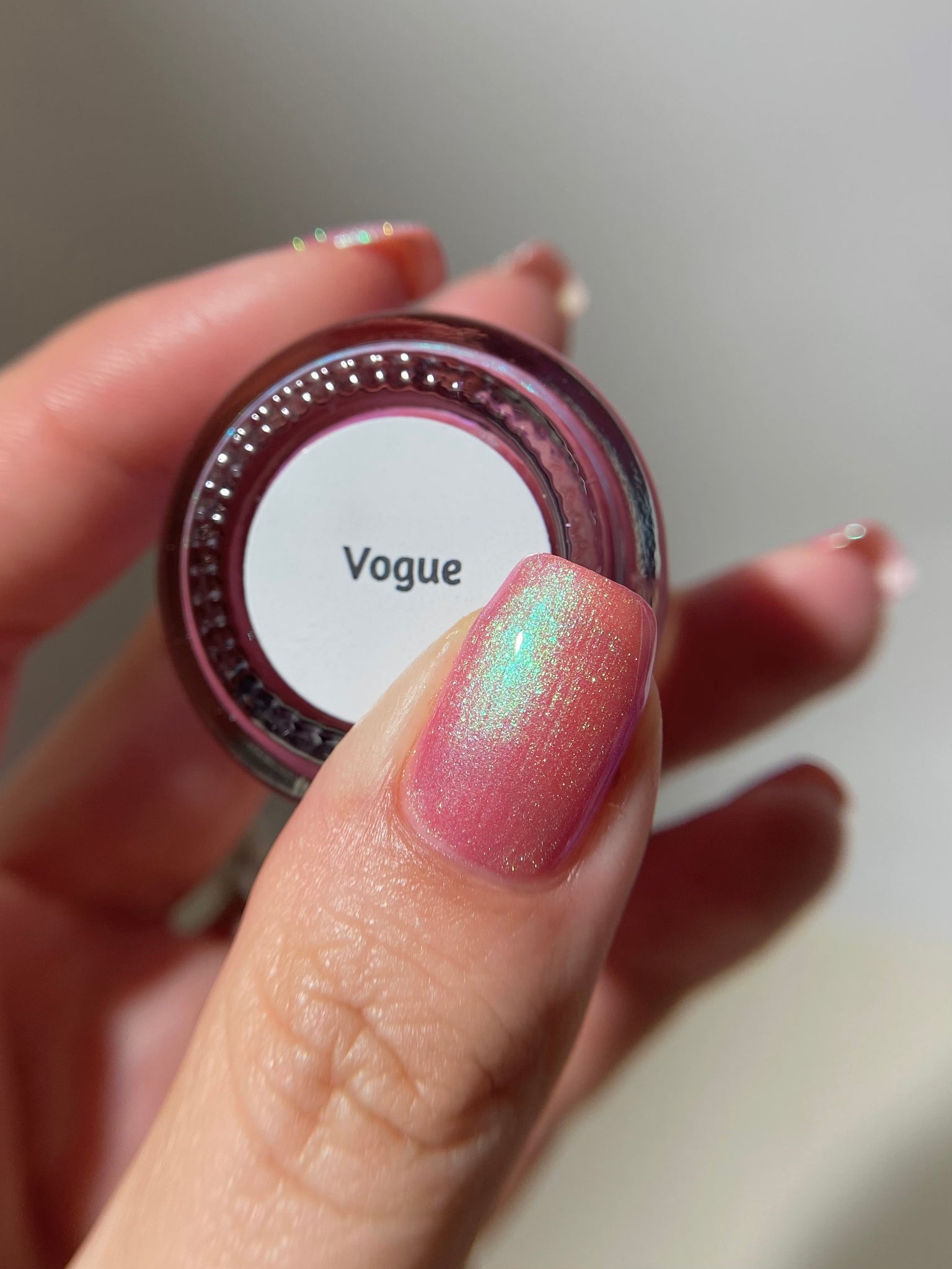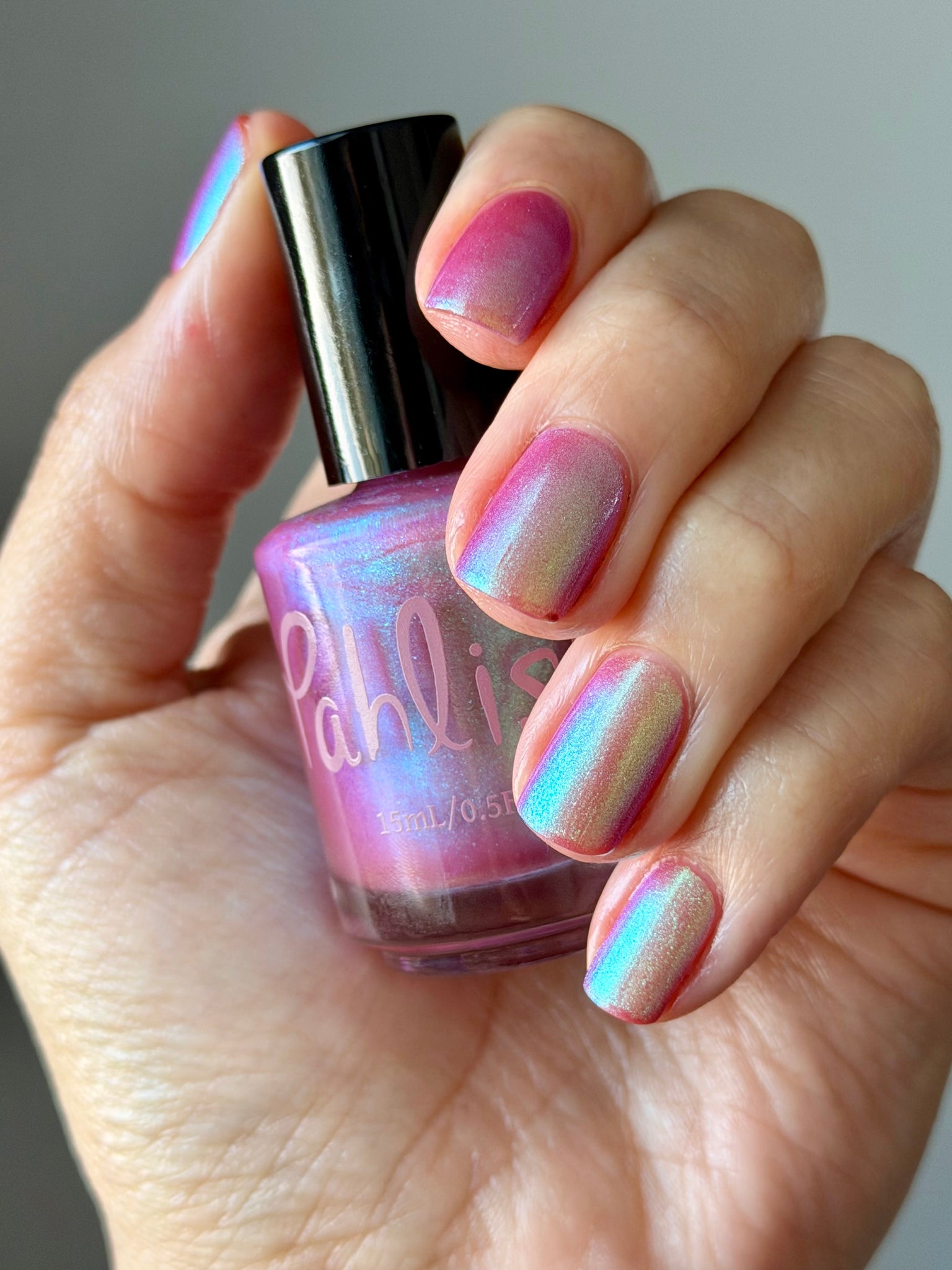 warm rosy pink packed with iridescent aqua/teal/blue shifting shimmer