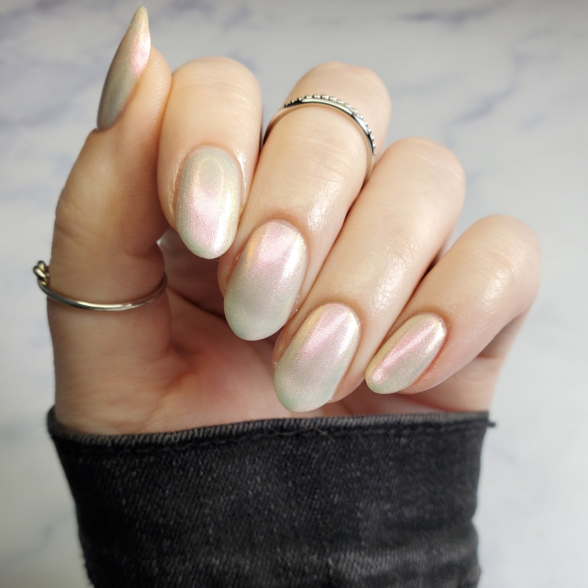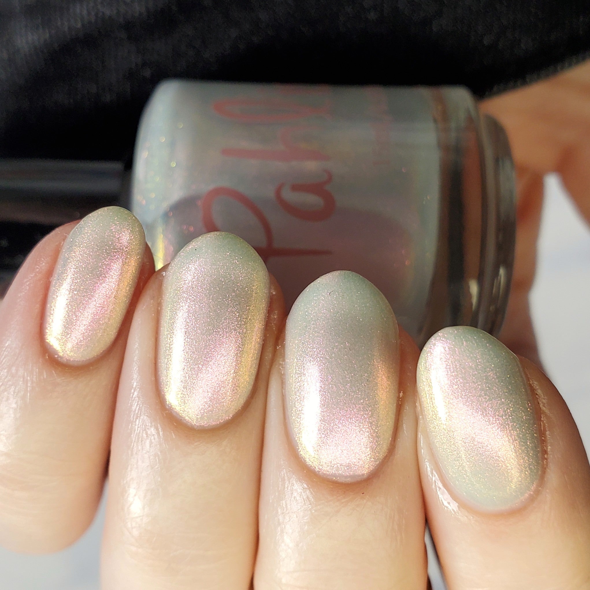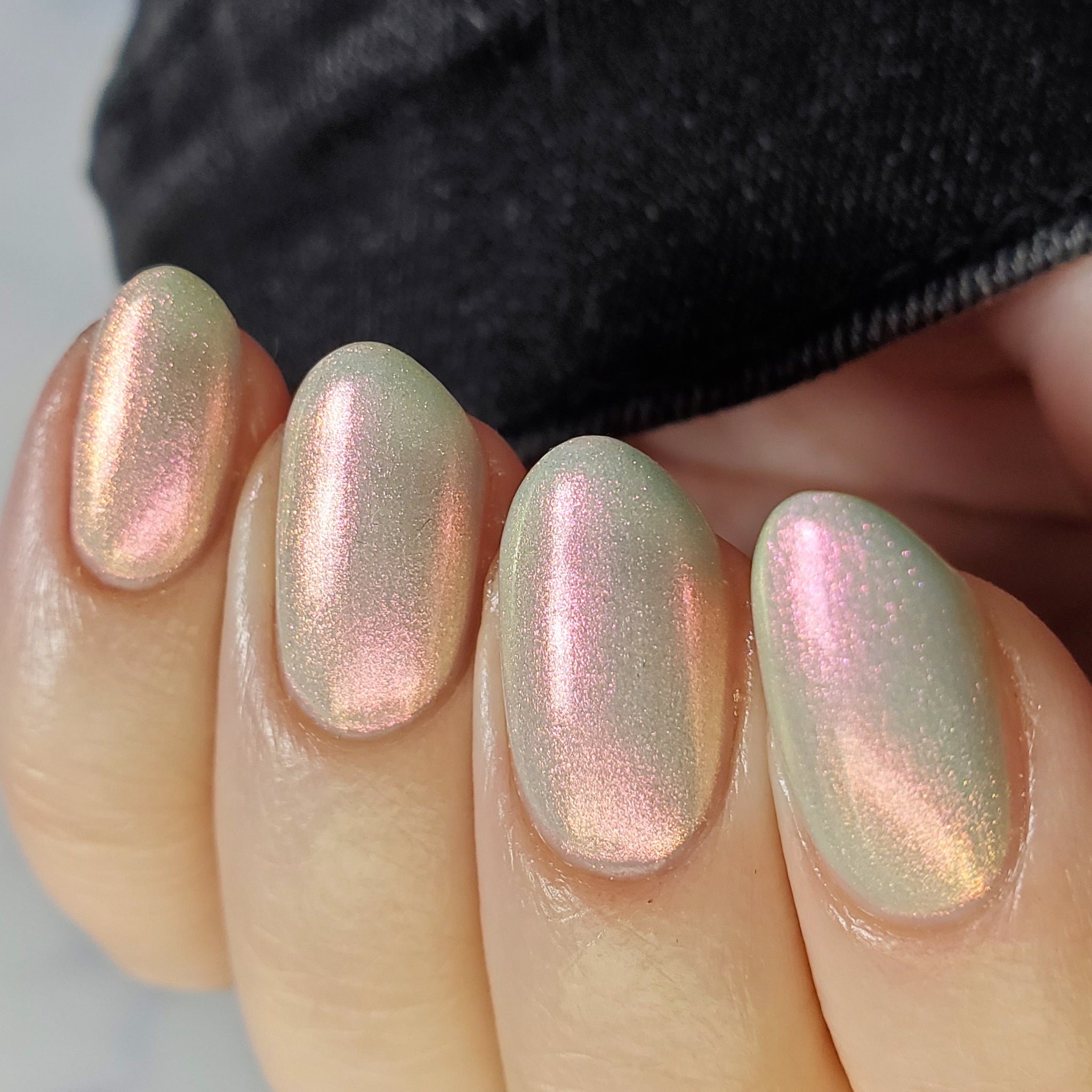 sheer blue/grey with glowing pink/copper/green shifting shimmer