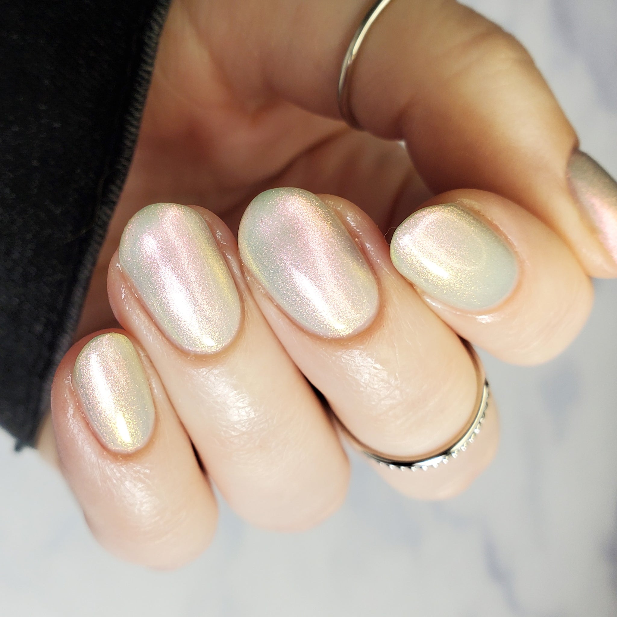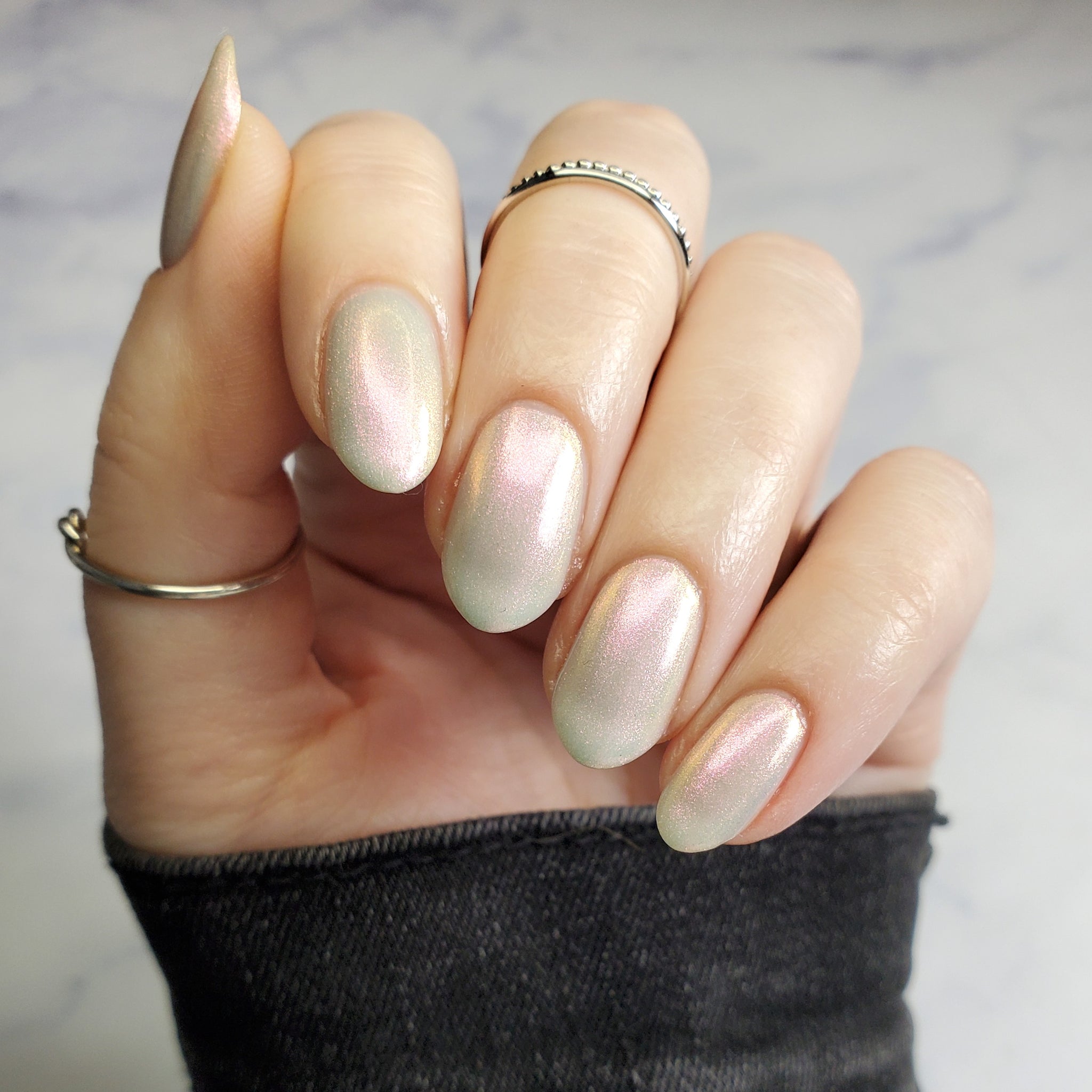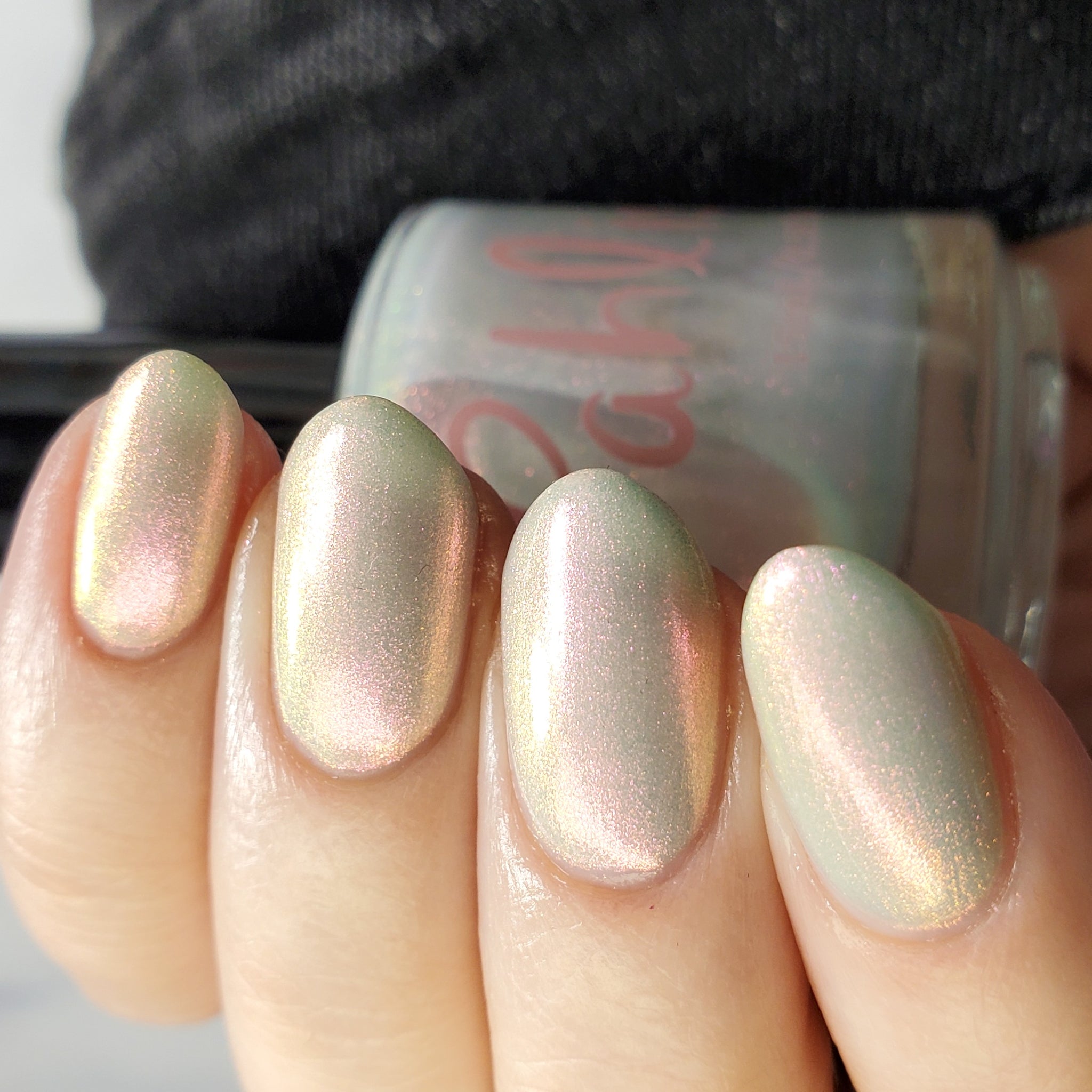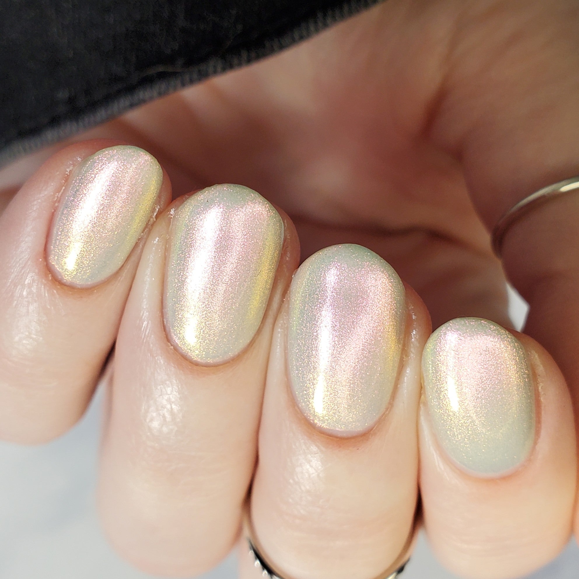sheer blue/grey with glowing pink/copper/green shifting shimmer