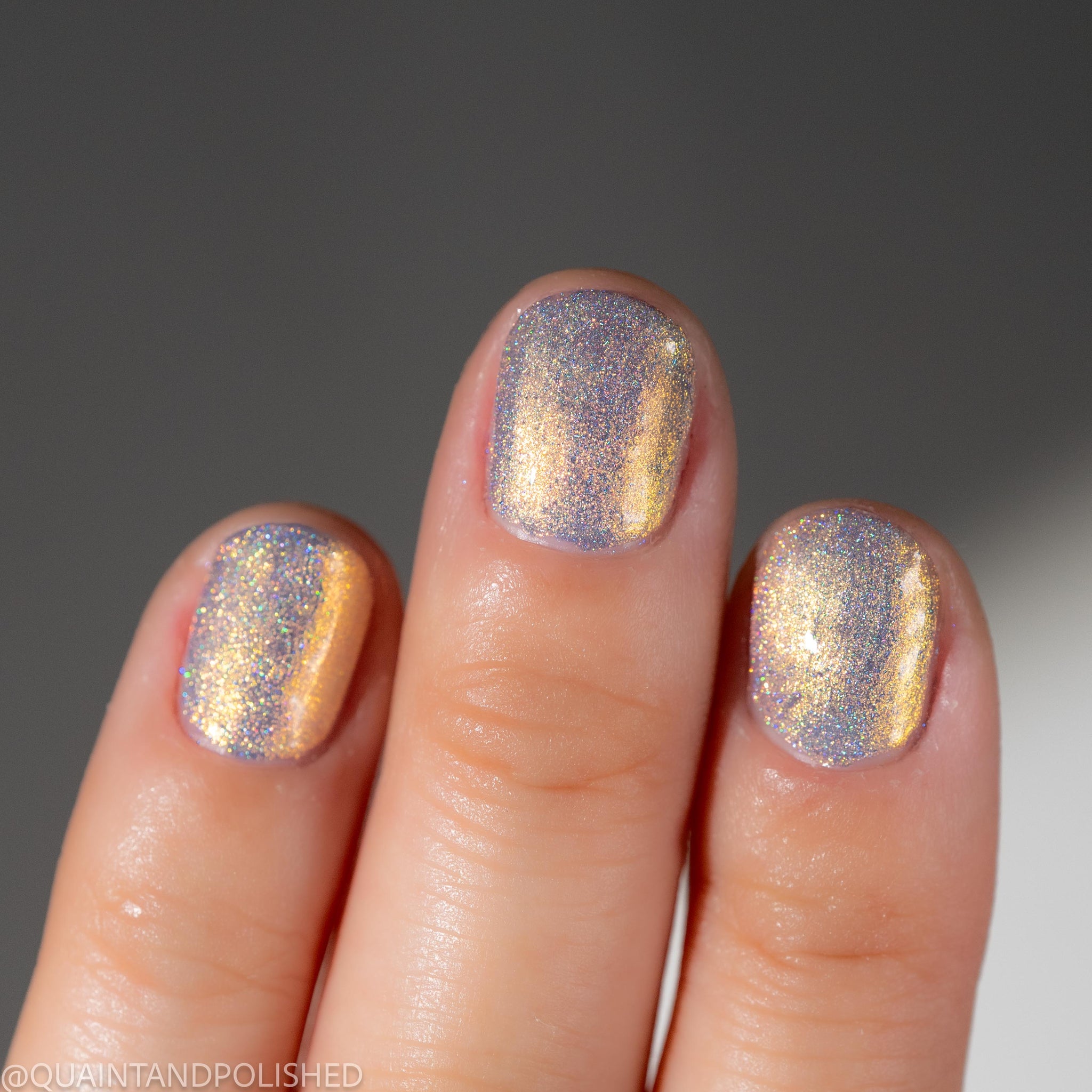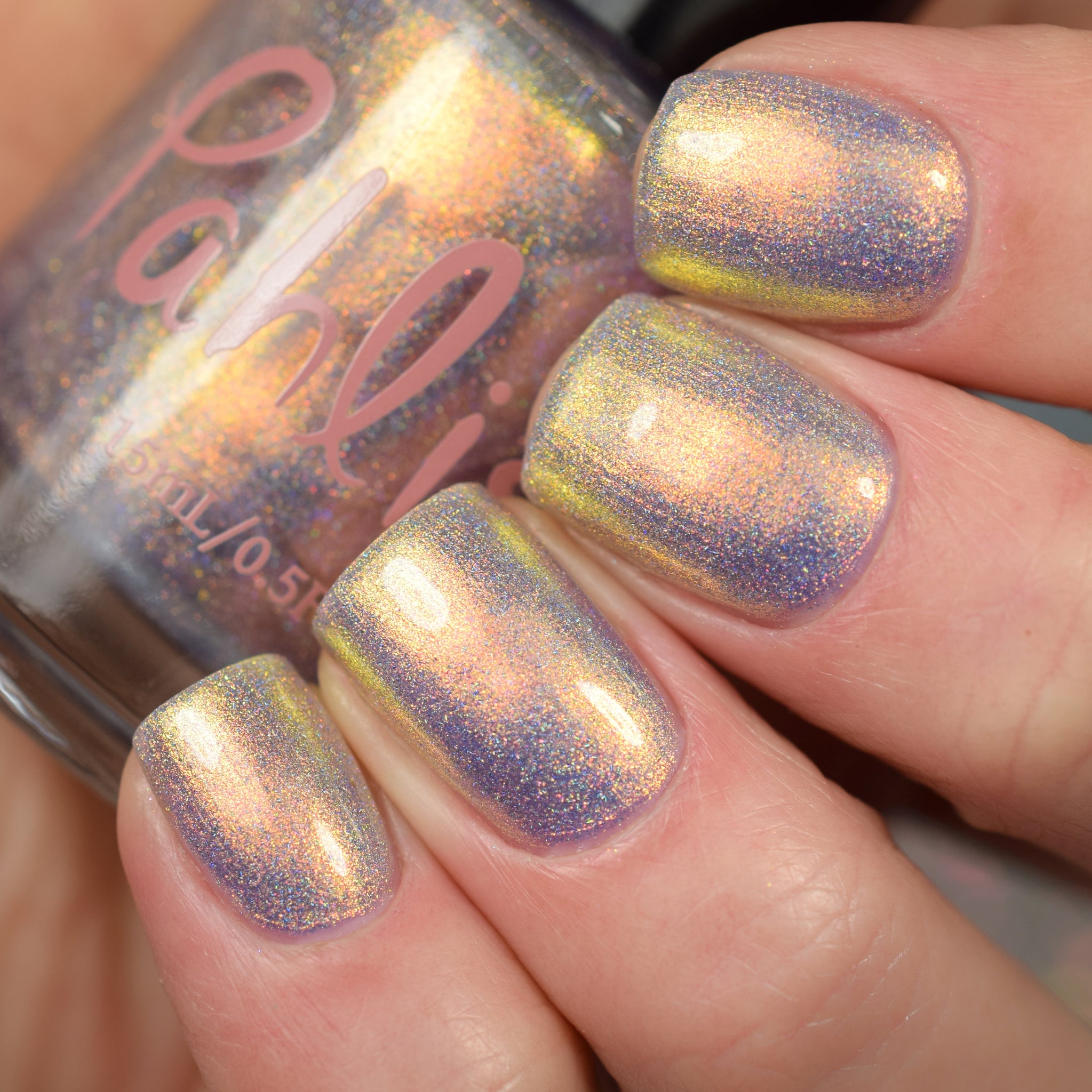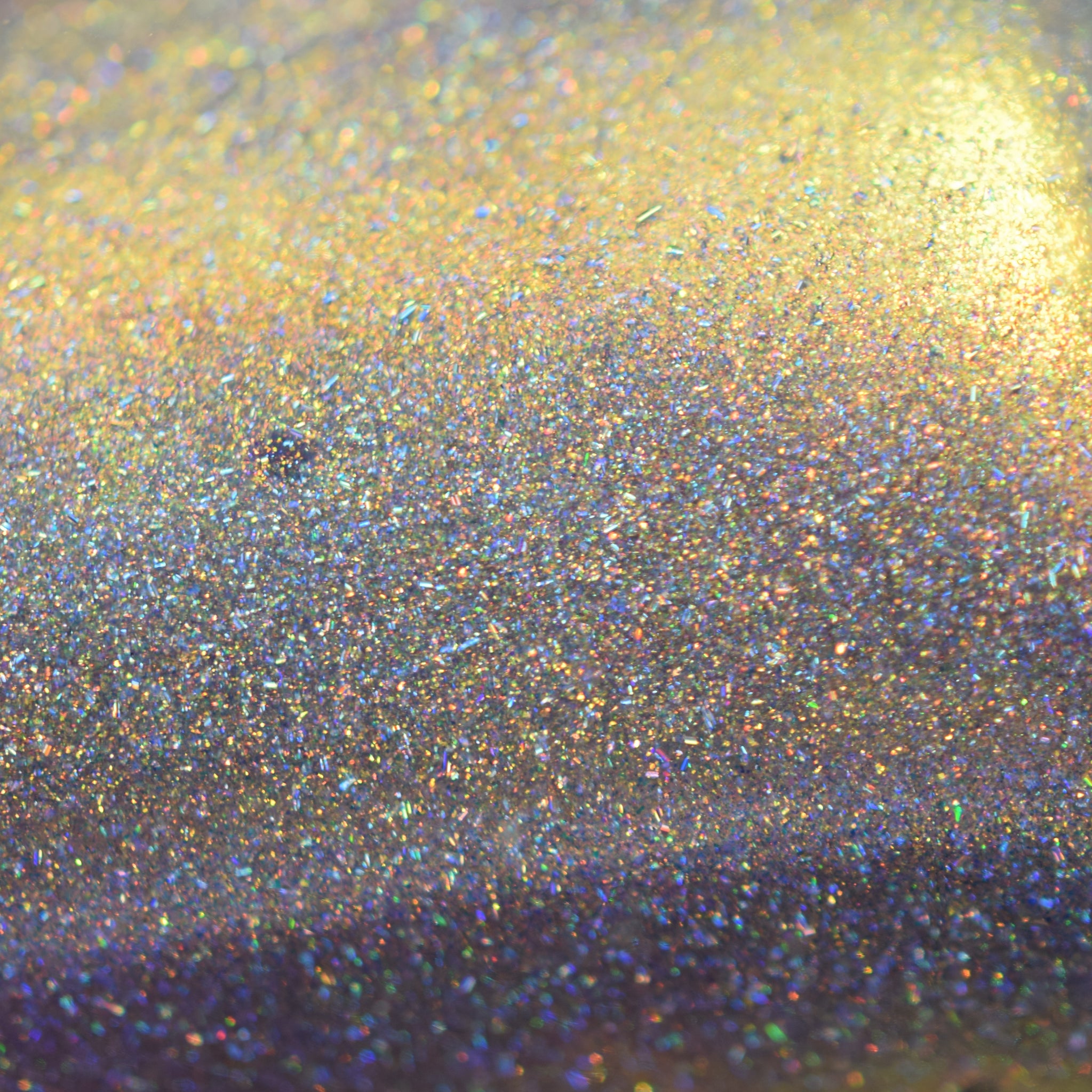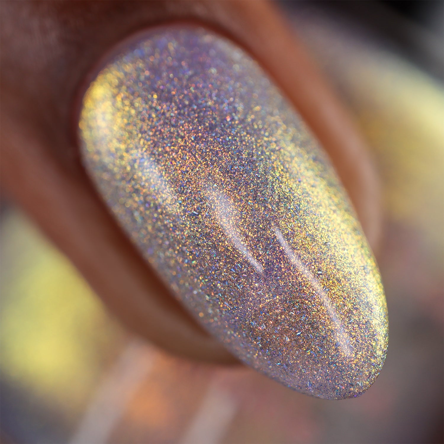 soft lavender base with a mix of iridescent orange/copper shimmer and scattered holographic pigment