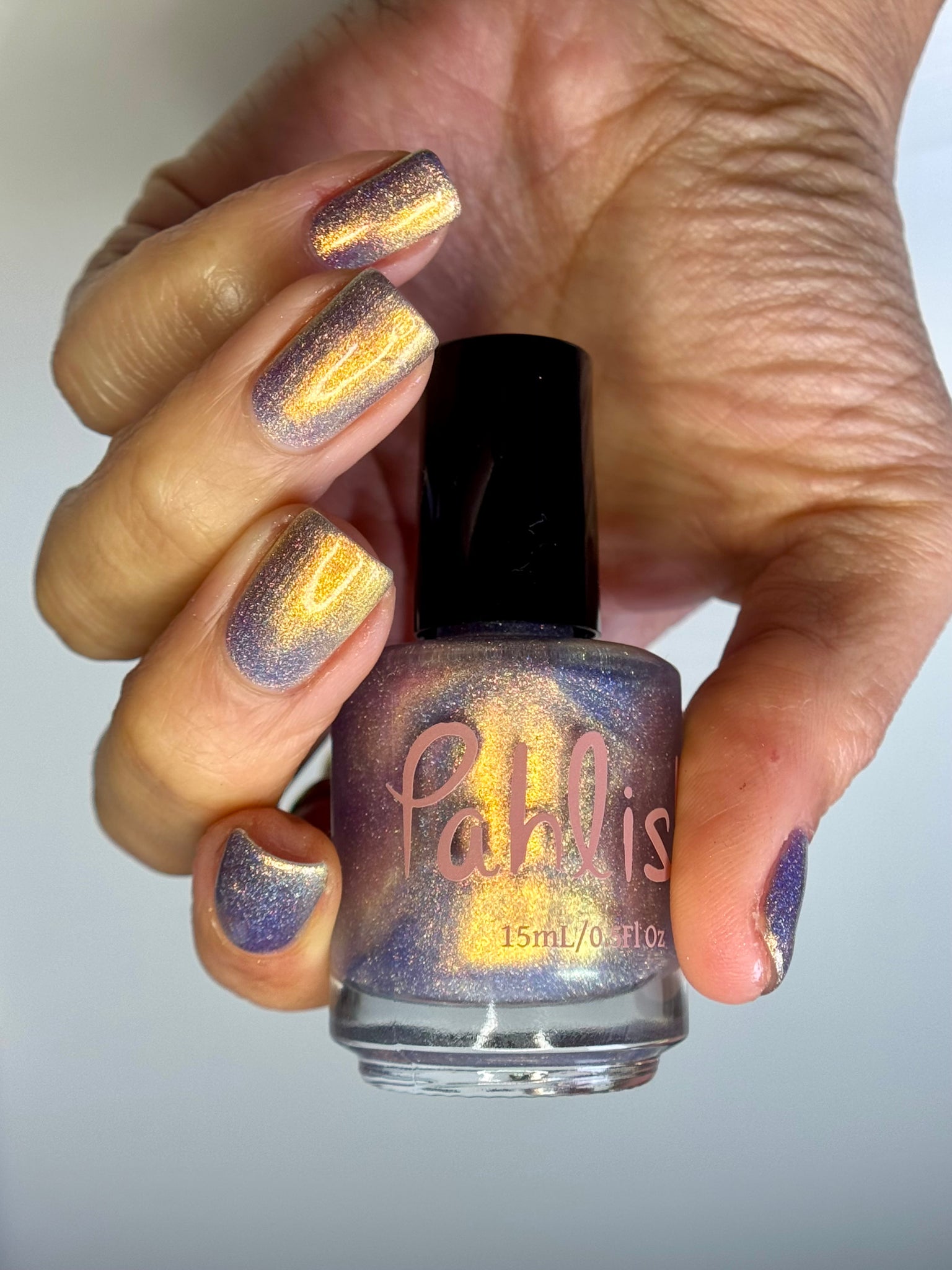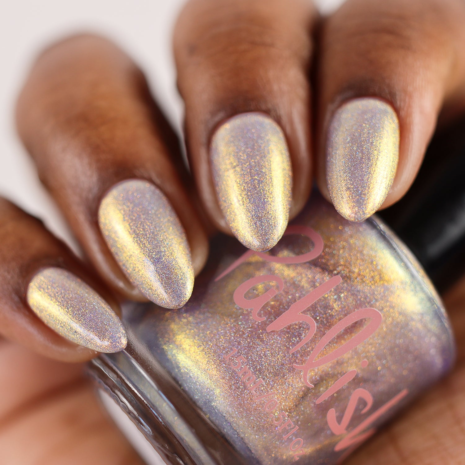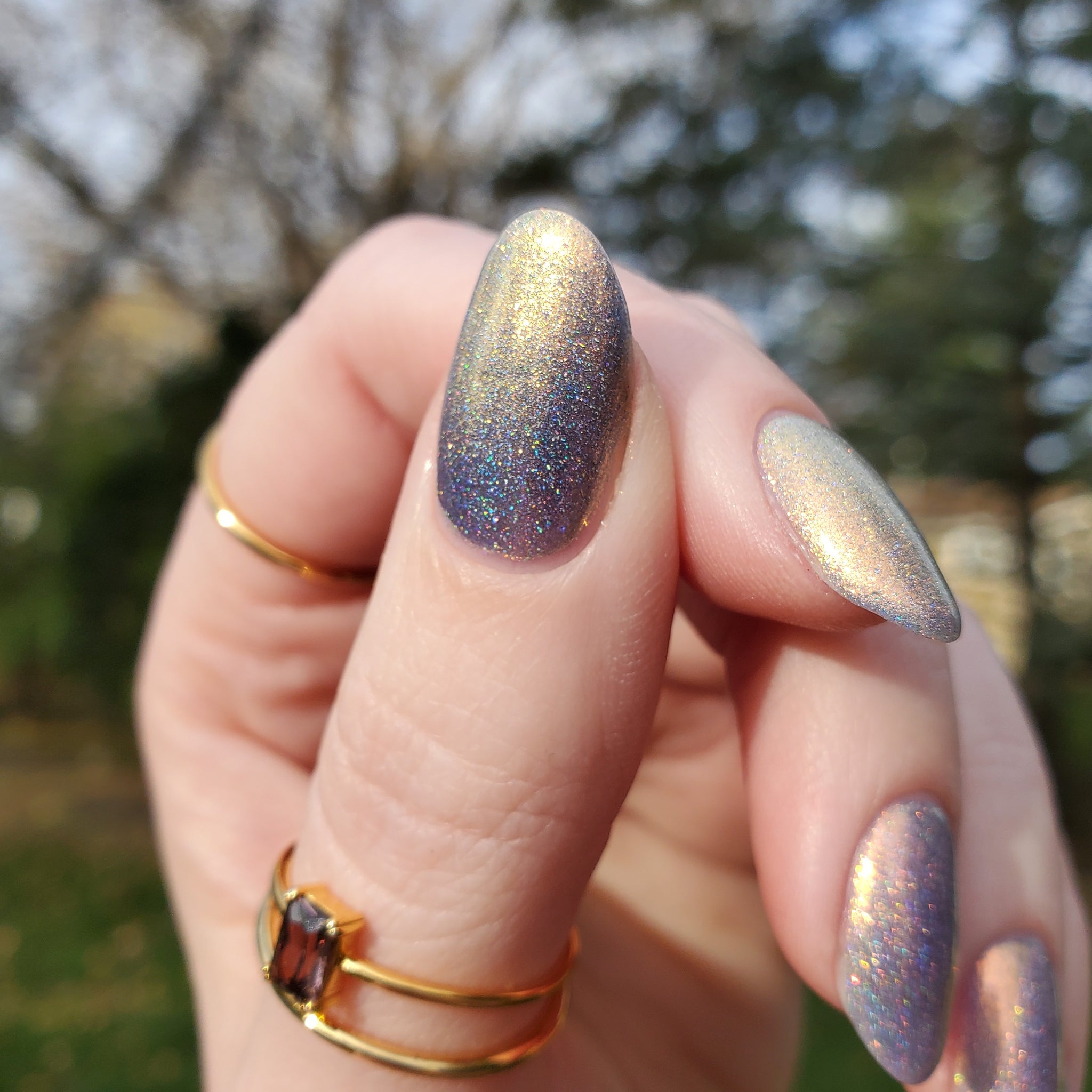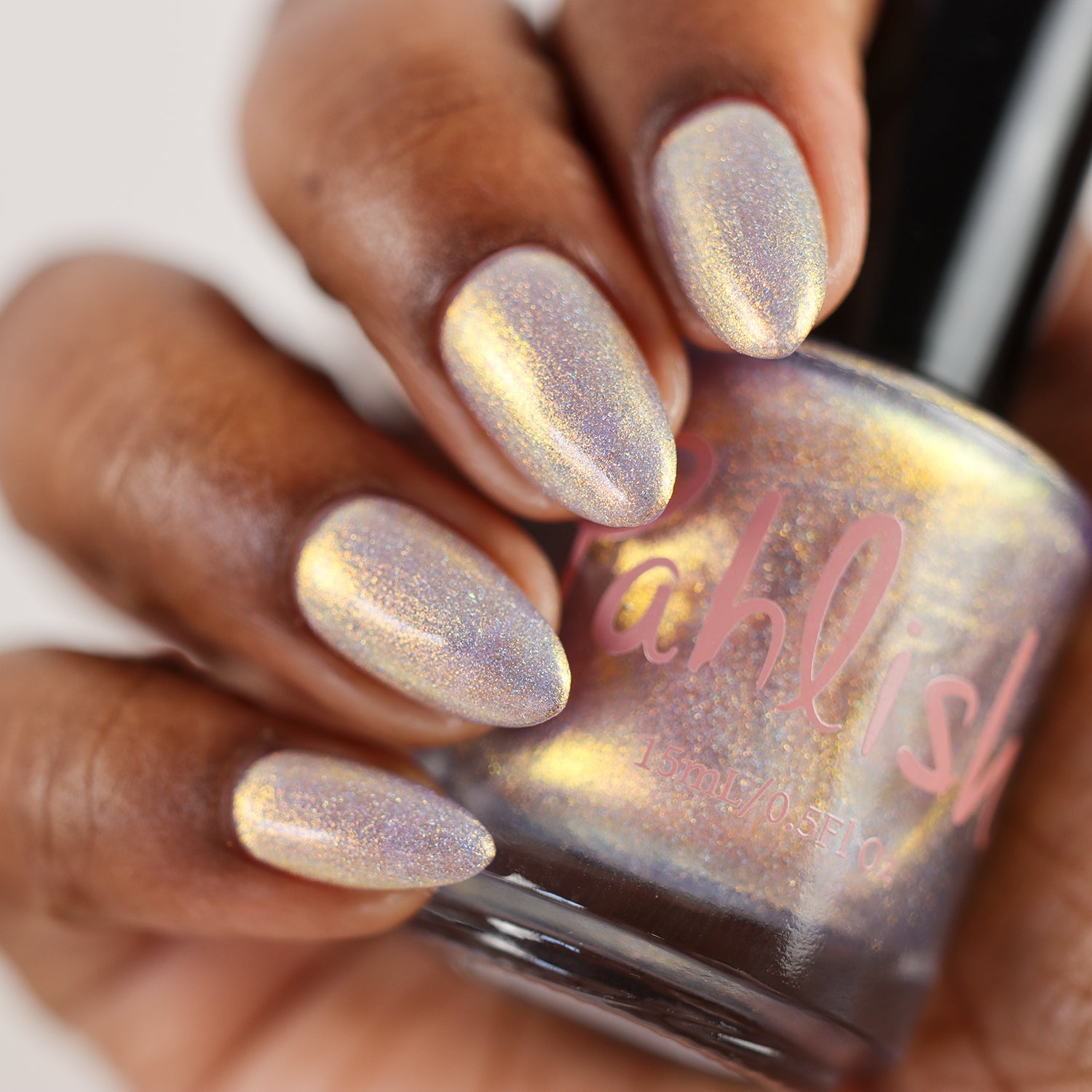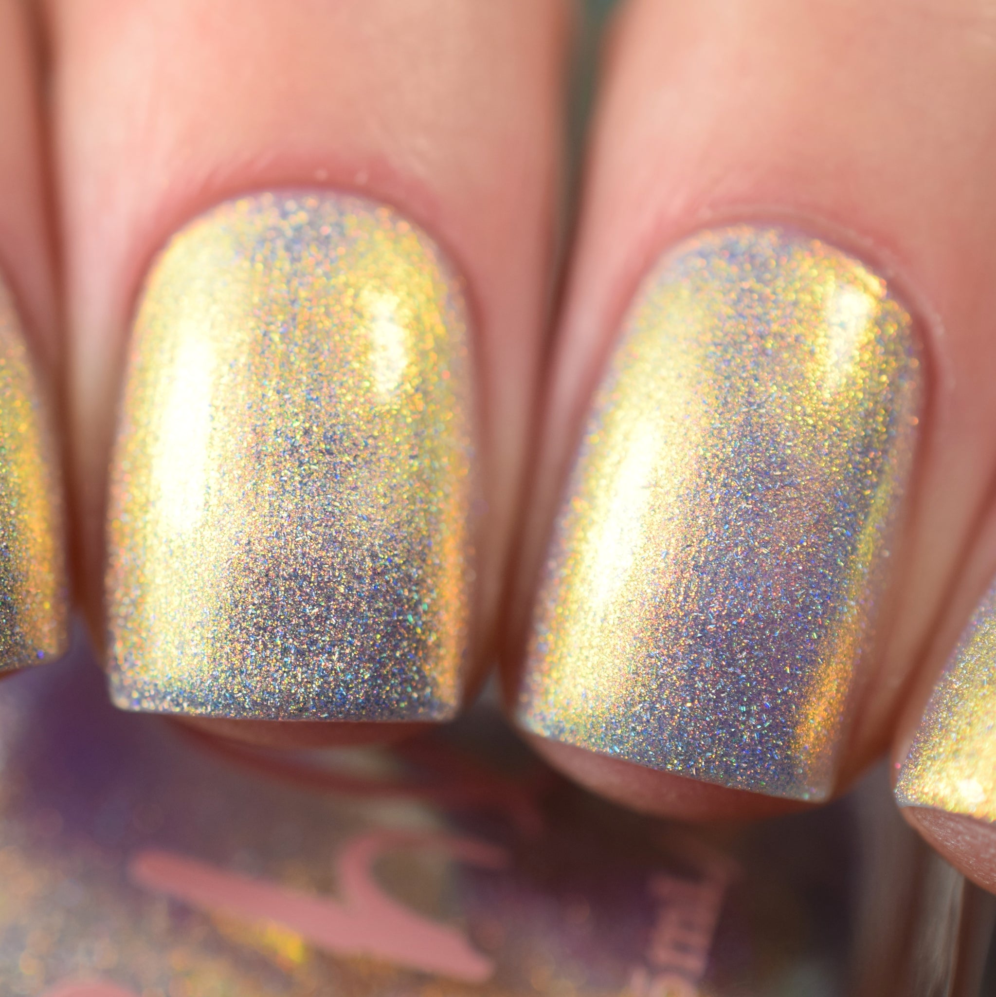 soft lavender base with a mix of iridescent orange/copper shimmer and scattered holographic pigment