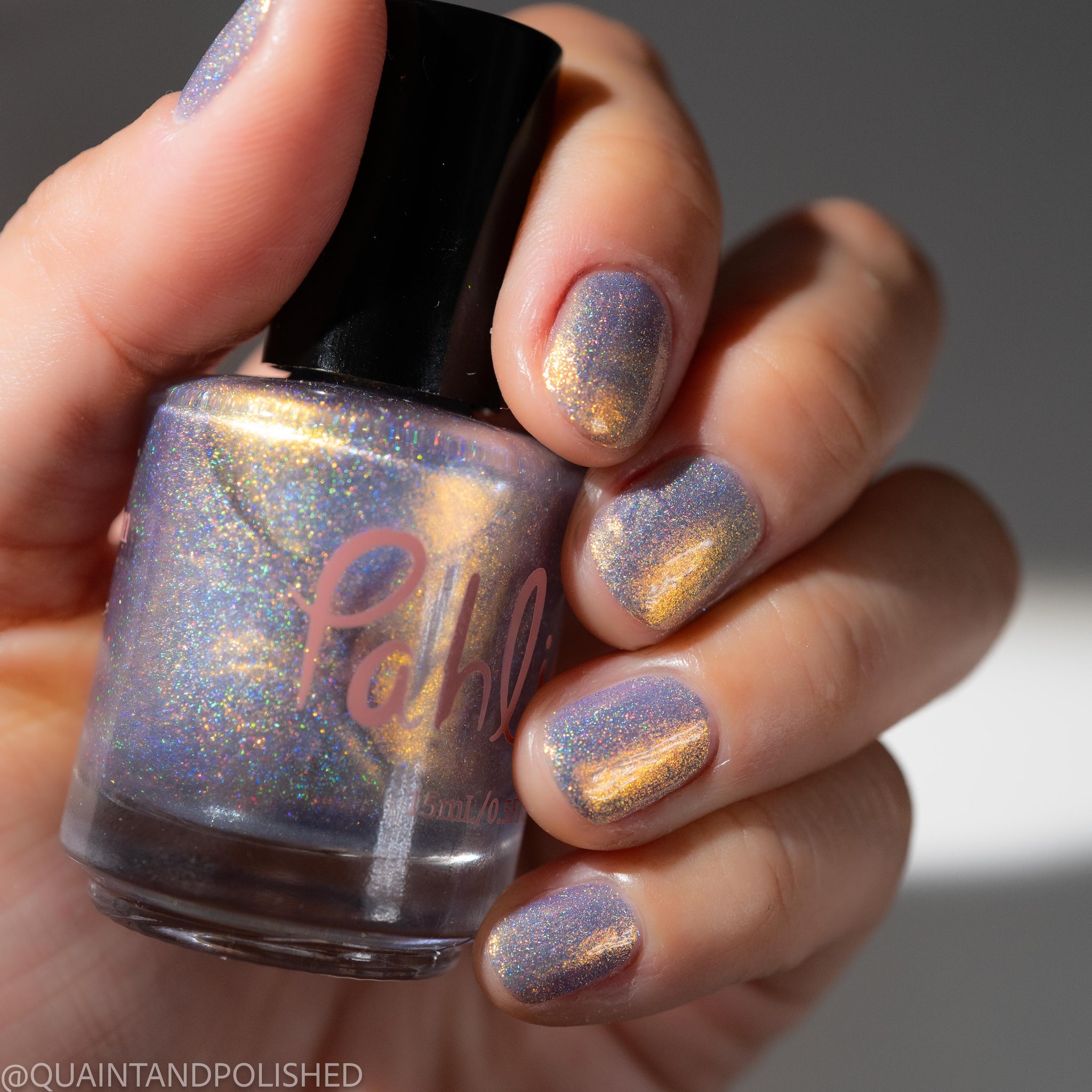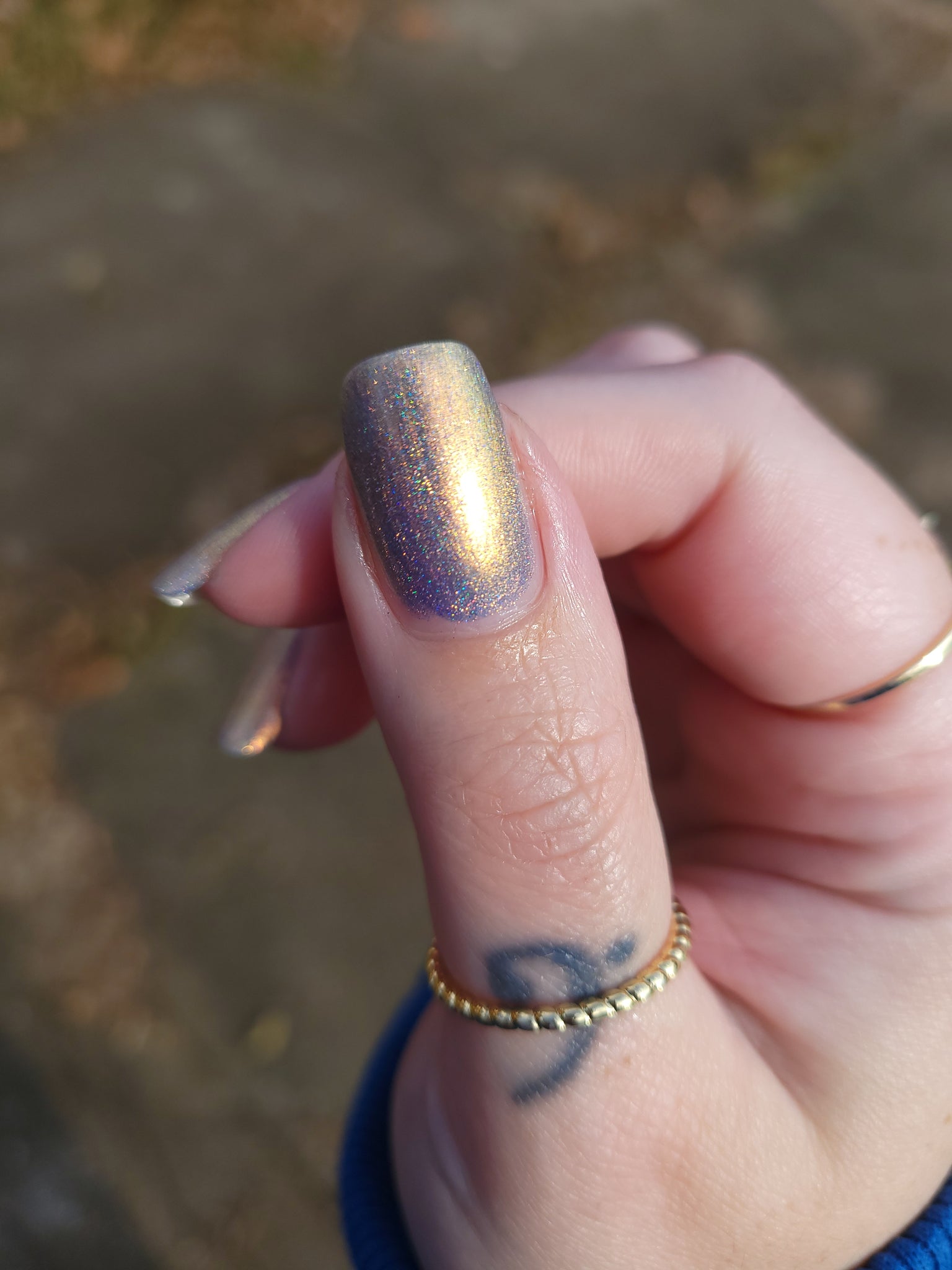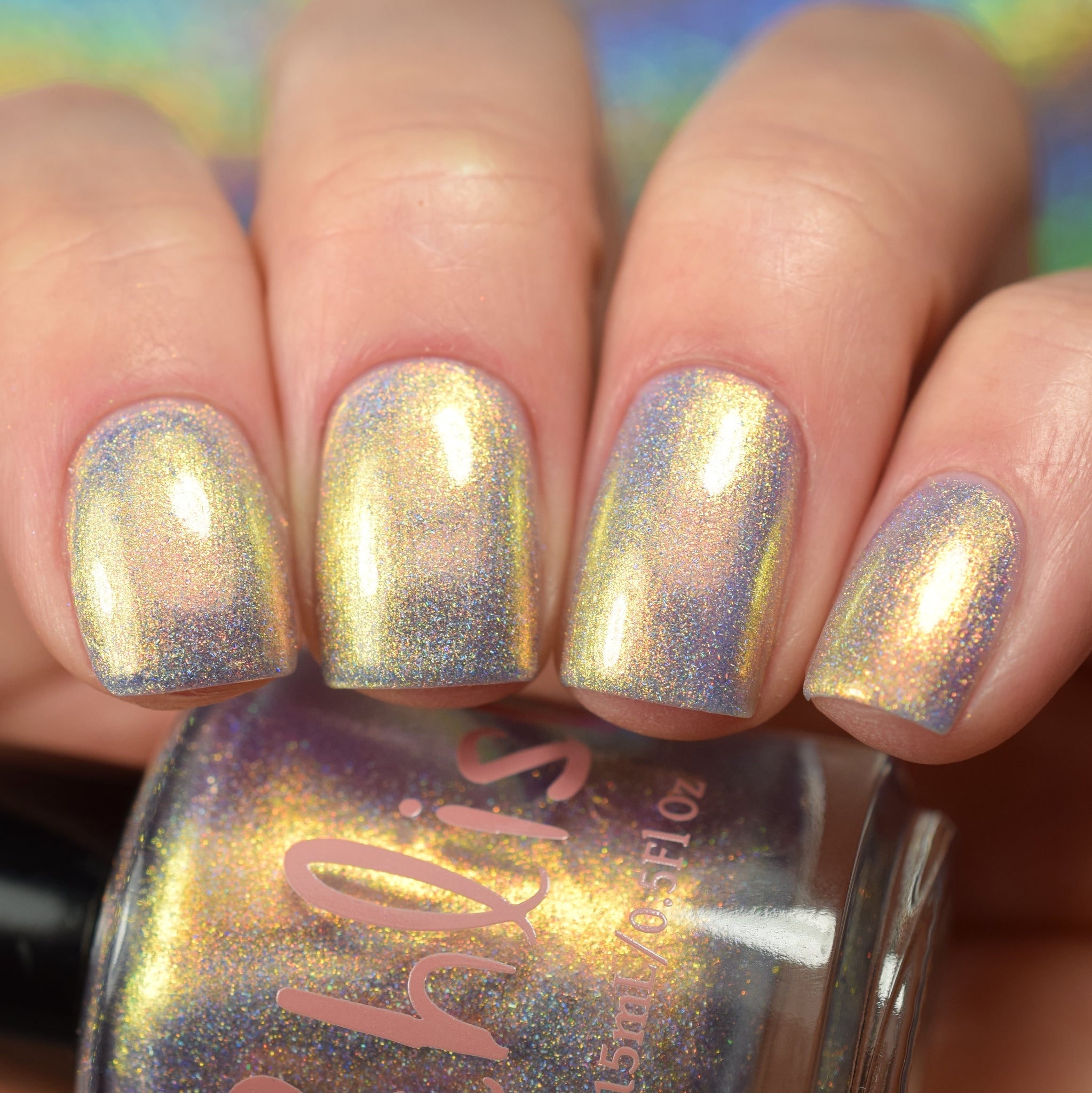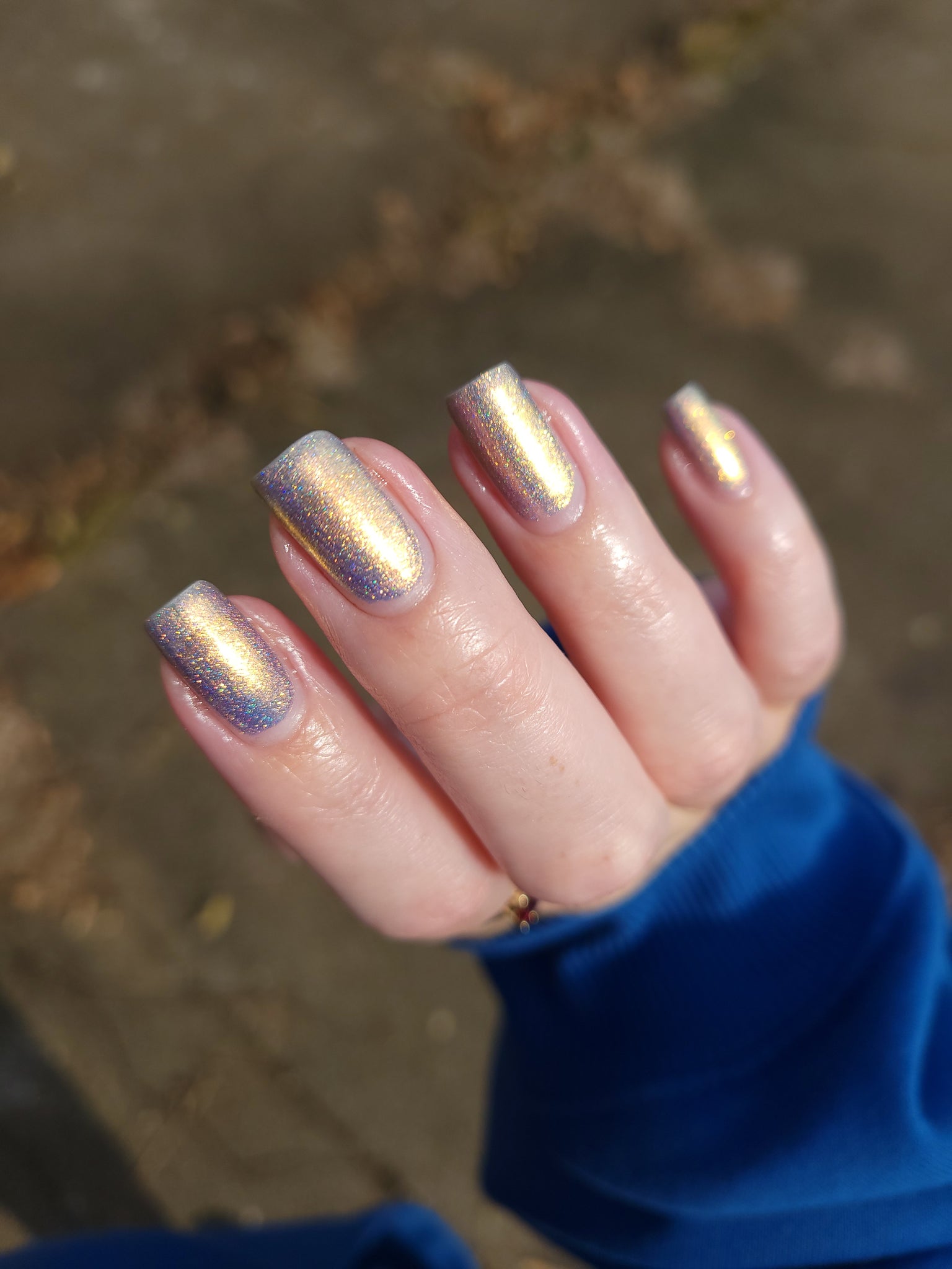 soft lavender base with a mix of iridescent orange/copper shimmer and scattered holographic pigment