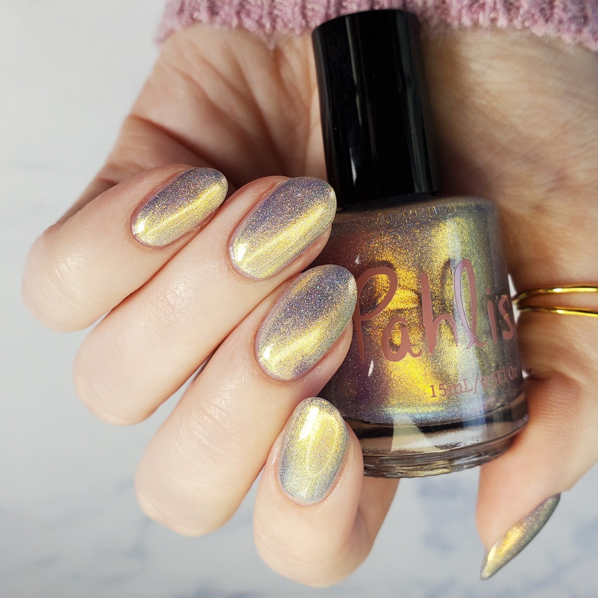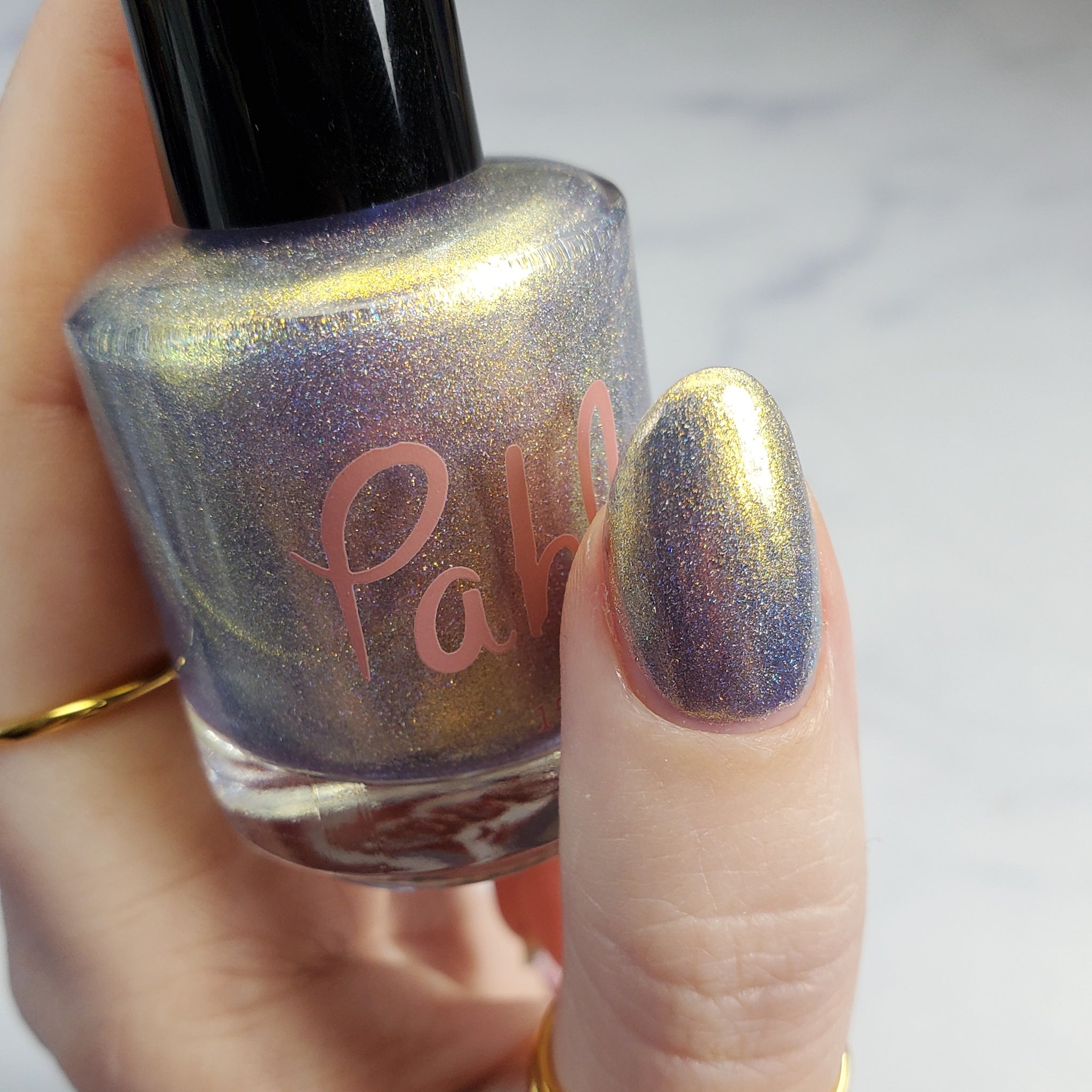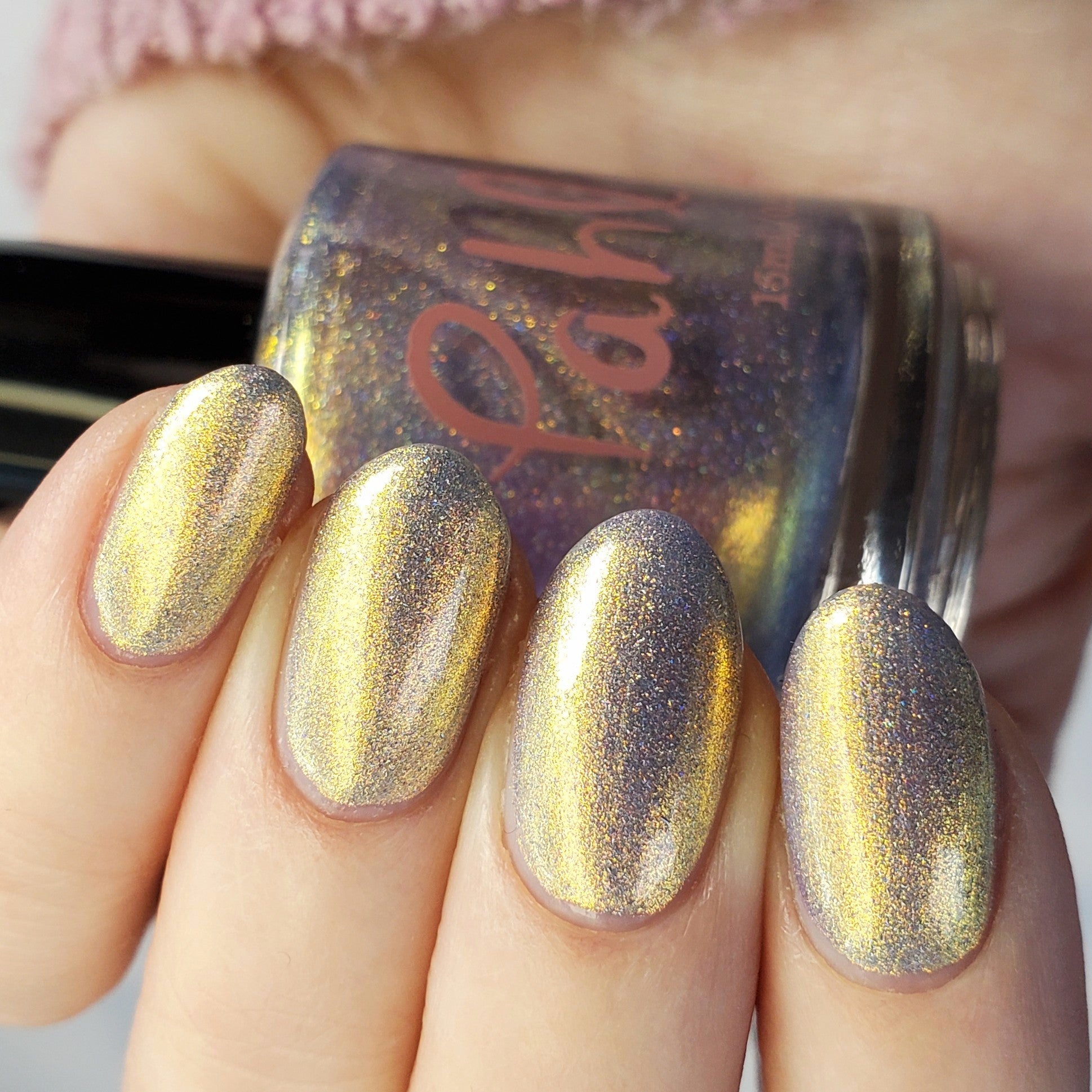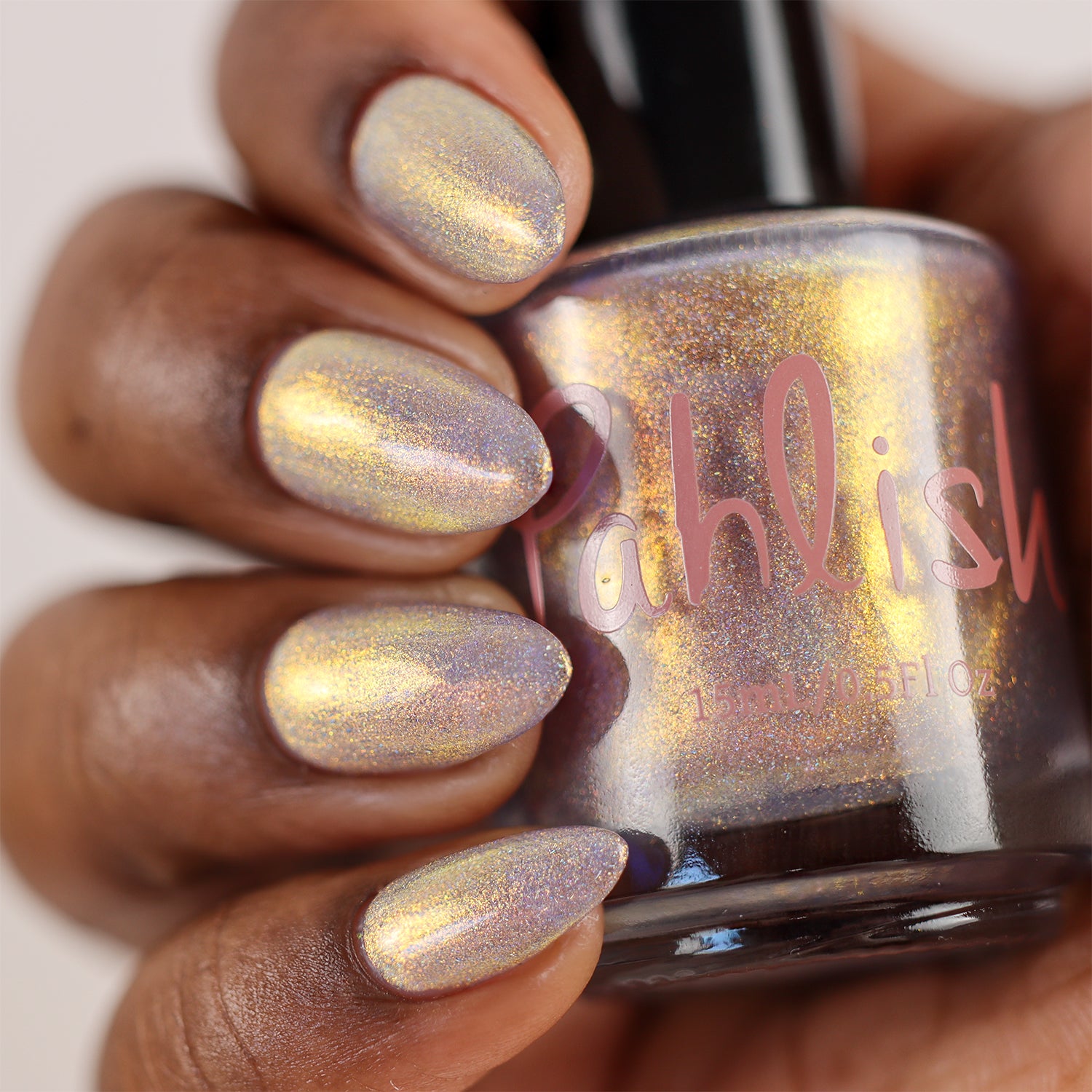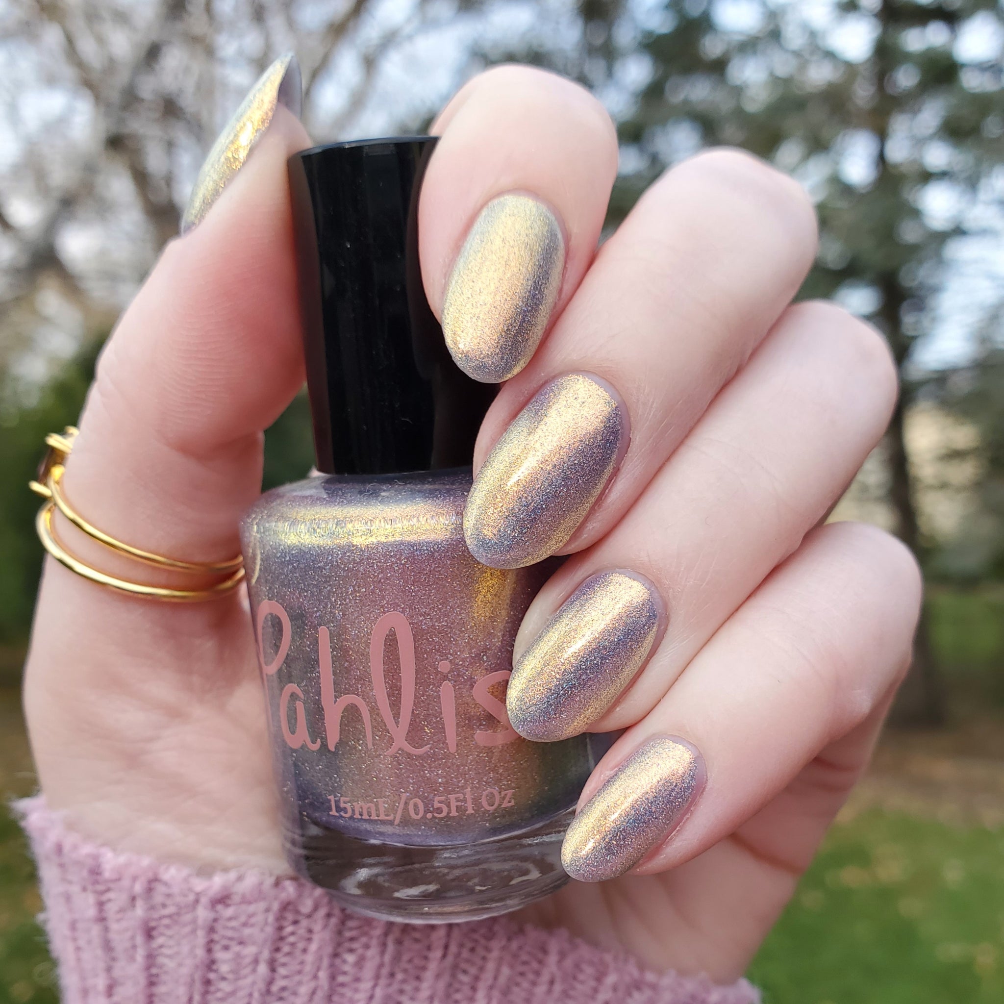 soft lavender base with a mix of iridescent orange/copper shimmer and scattered holographic pigment