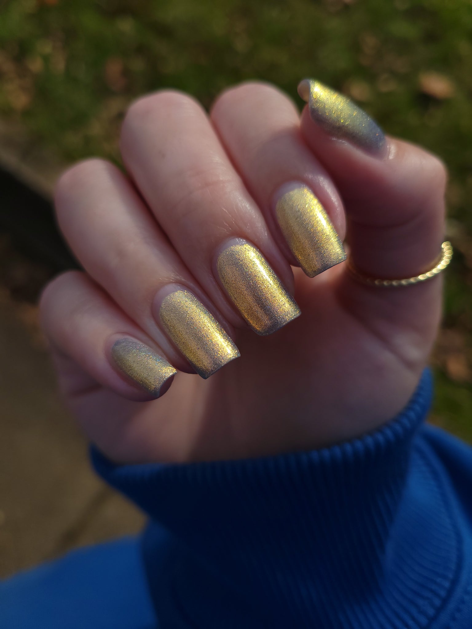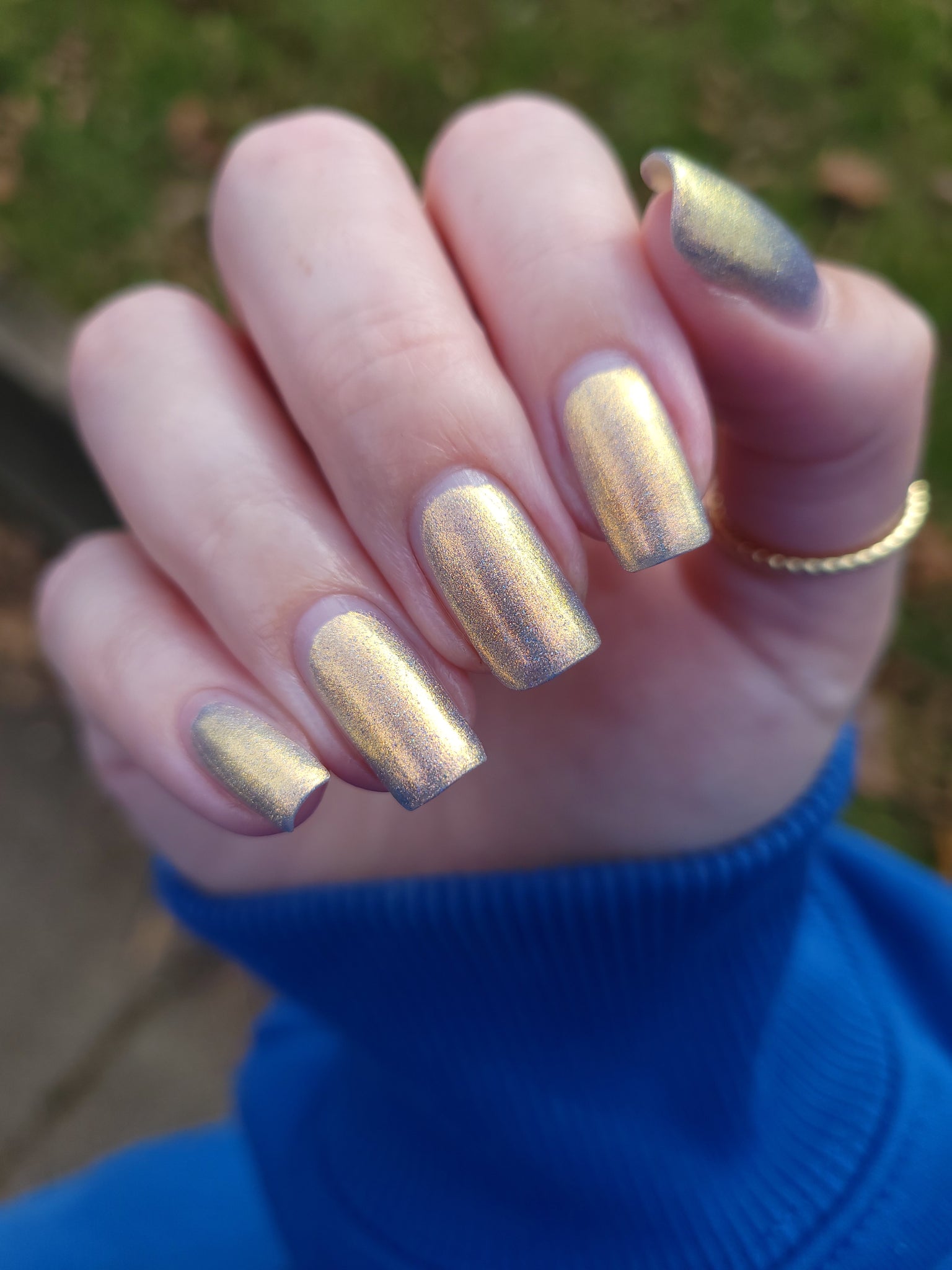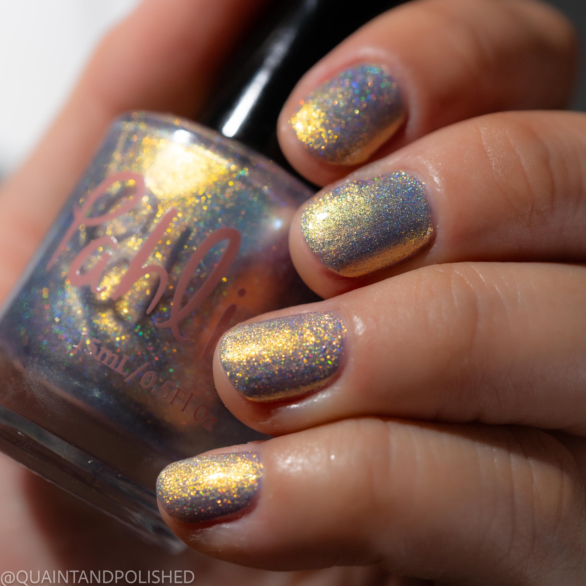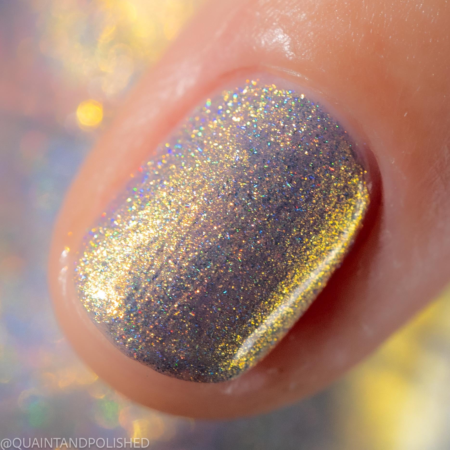 soft lavender base with a mix of iridescent orange/copper shimmer and scattered holographic pigment